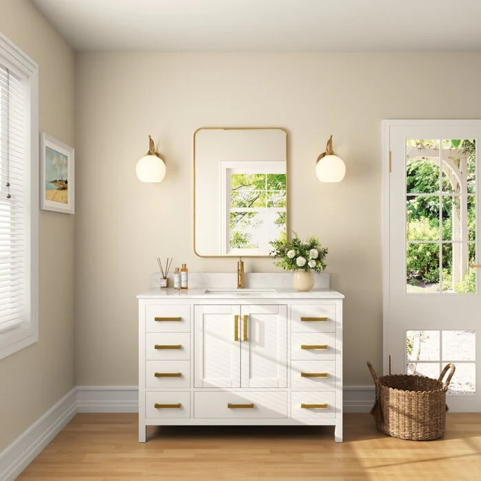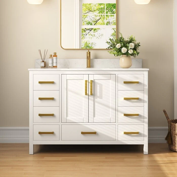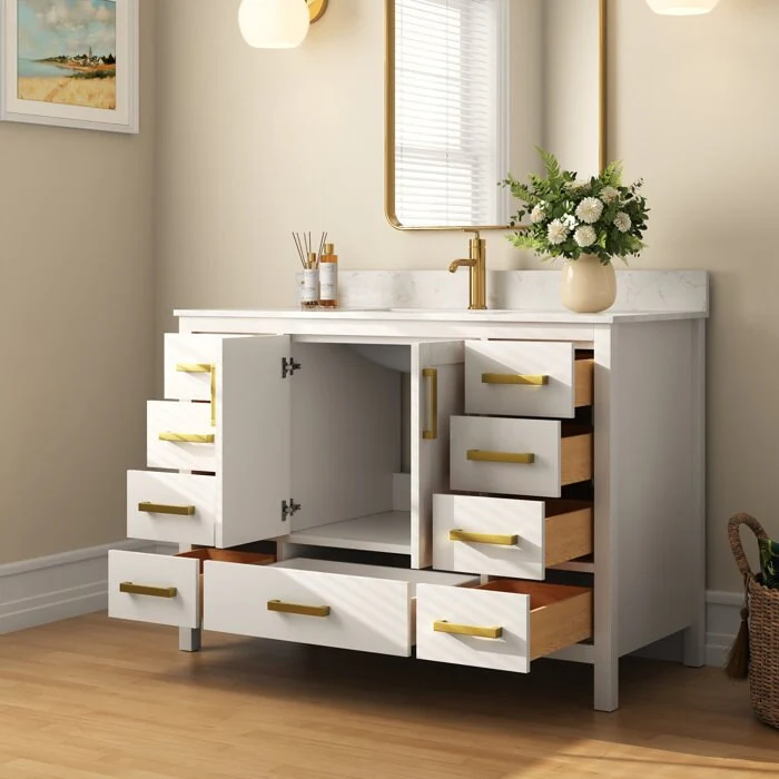 - Soft-close mechanism: Our bathroom vanity drawers and cabinet doors feature soft-closing mechanisms that ensure a silent closure every time to prevent slamming. Damping rails and hinges are made of sturdy, durable hardware to ensure long-term reliability for everyday use.