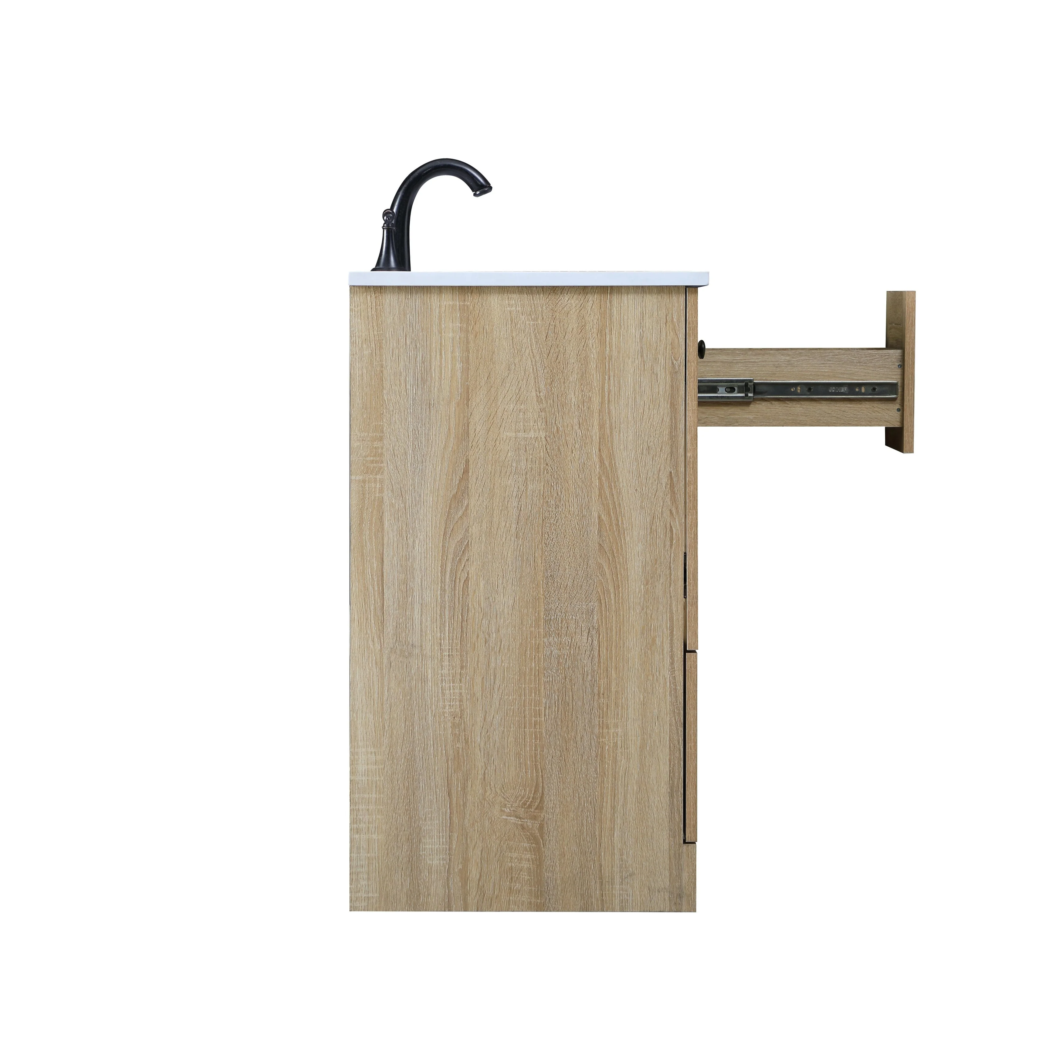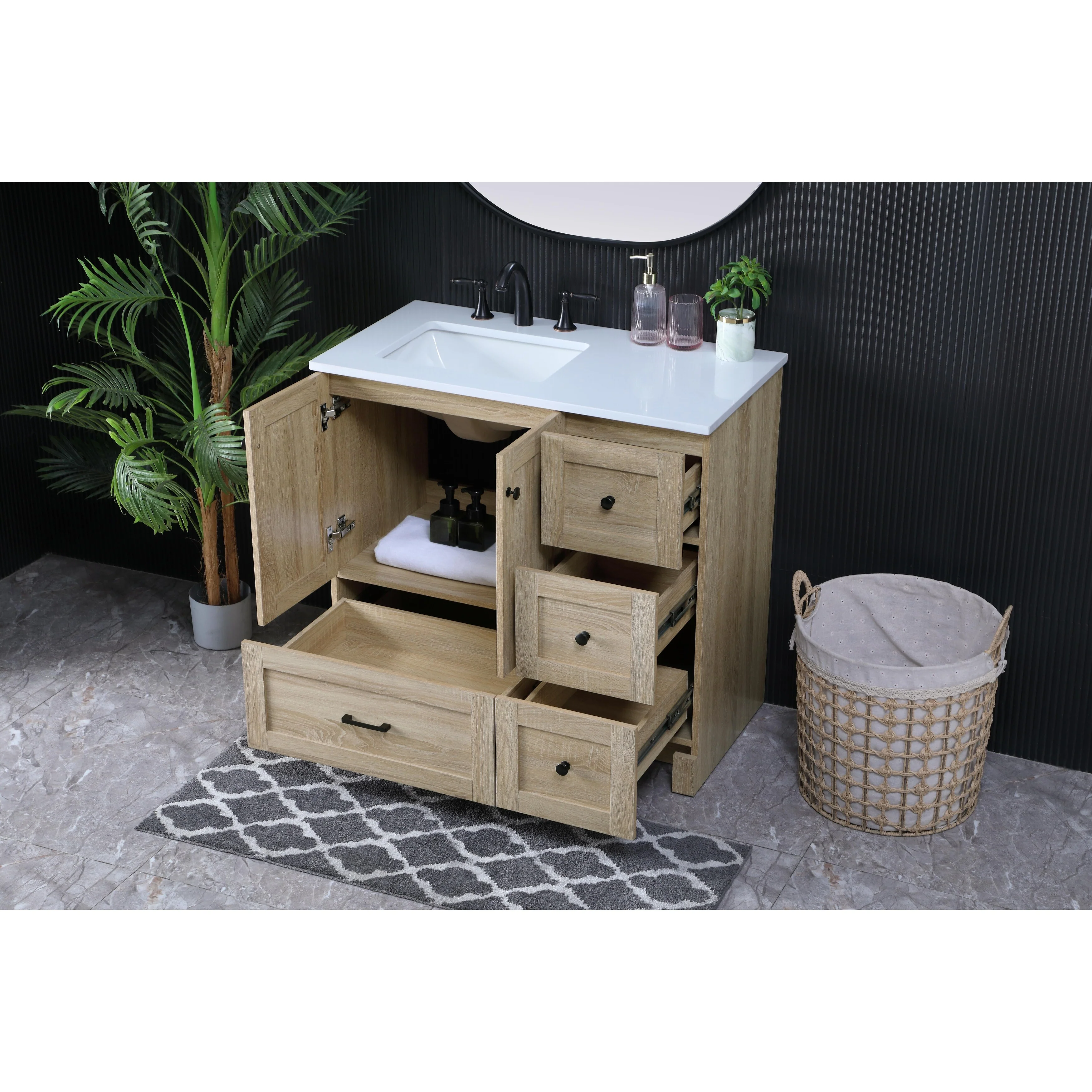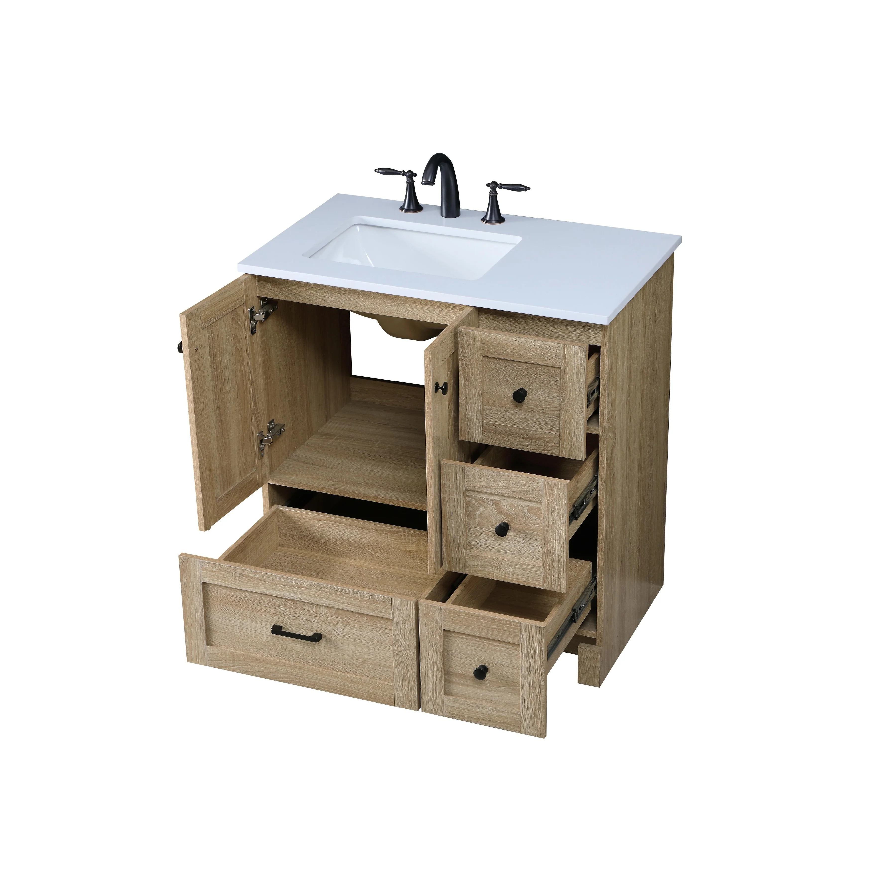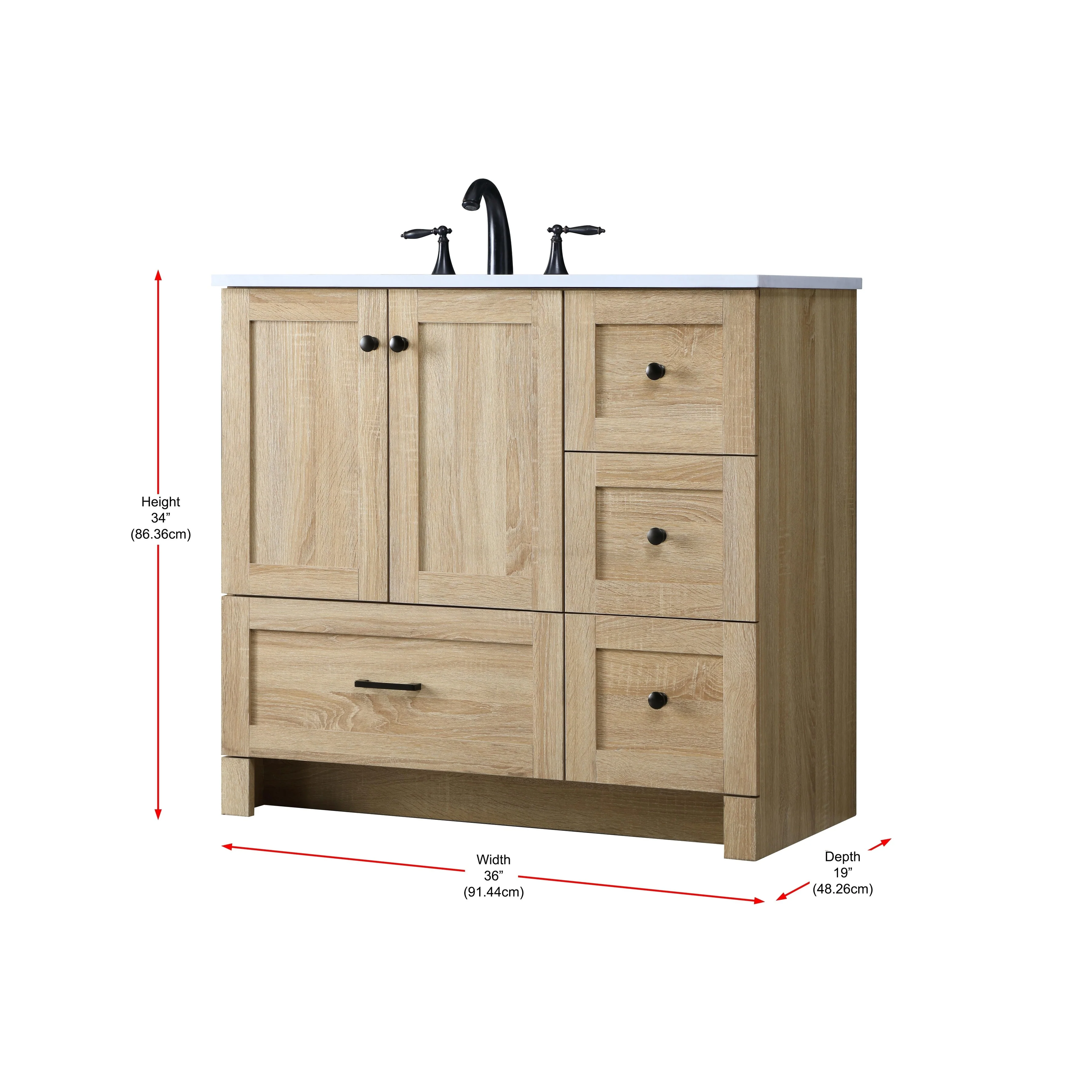 Delve into a world of minimalistic fashion and contemporary styling with this farmhouse vanity. The clean faux lines anchor the weathered design. A black handle adorns the door, hiding the base of the integrated porcelain sink, while the bottom drawer allows you to store your bathroom necessities and toiletries. The compact size makes it the perfect vanity for any bathroom or powder room, regardless of size. Crafted with a durable engineered marble top in an ivory white finish, this vanity is designed with soft-closing glides and soft-closing hinges, ensuring a quiet and smooth operation. The purposely distressed look with an MDF base adds a touch of rustic charm, making it a stylish addition to any modern home.
