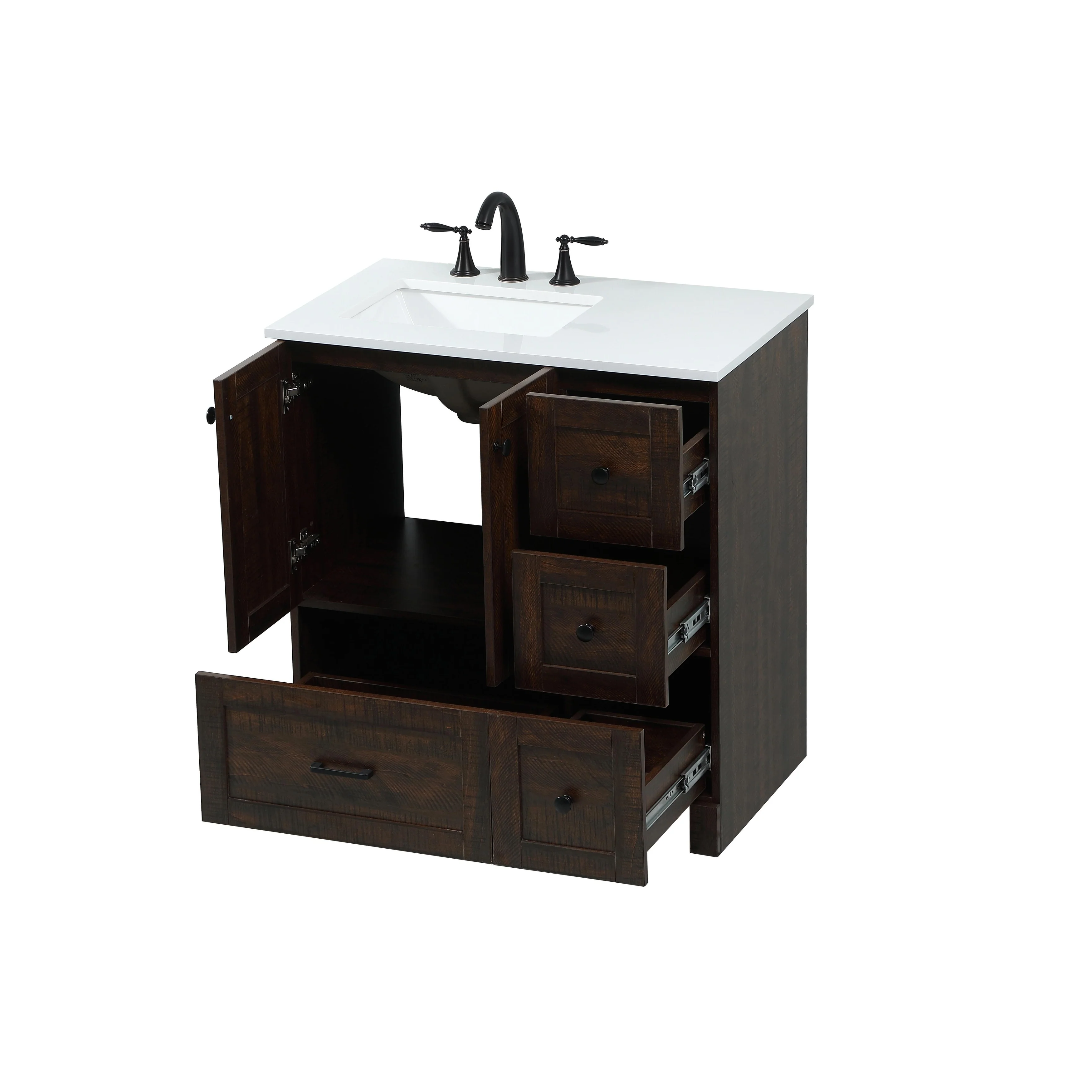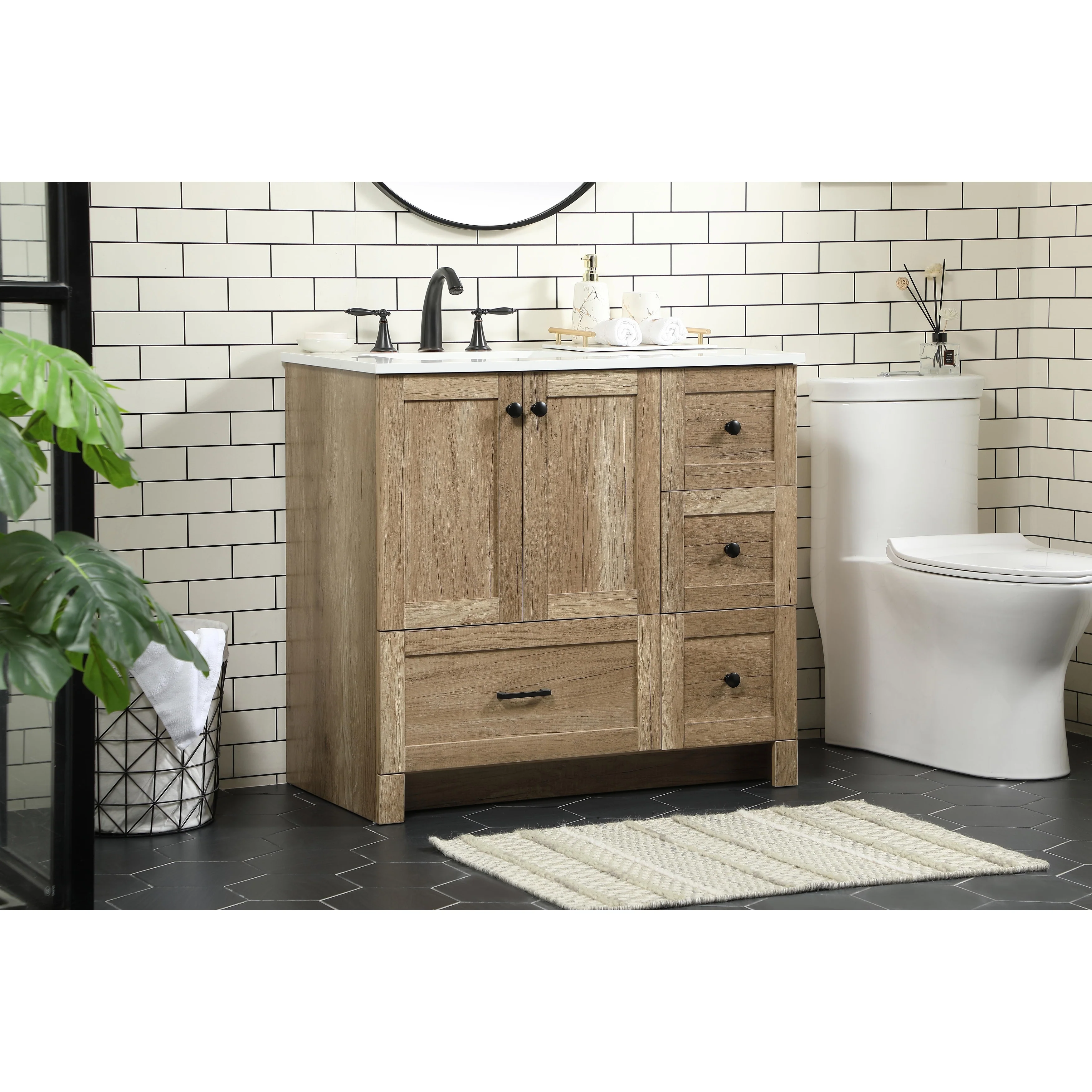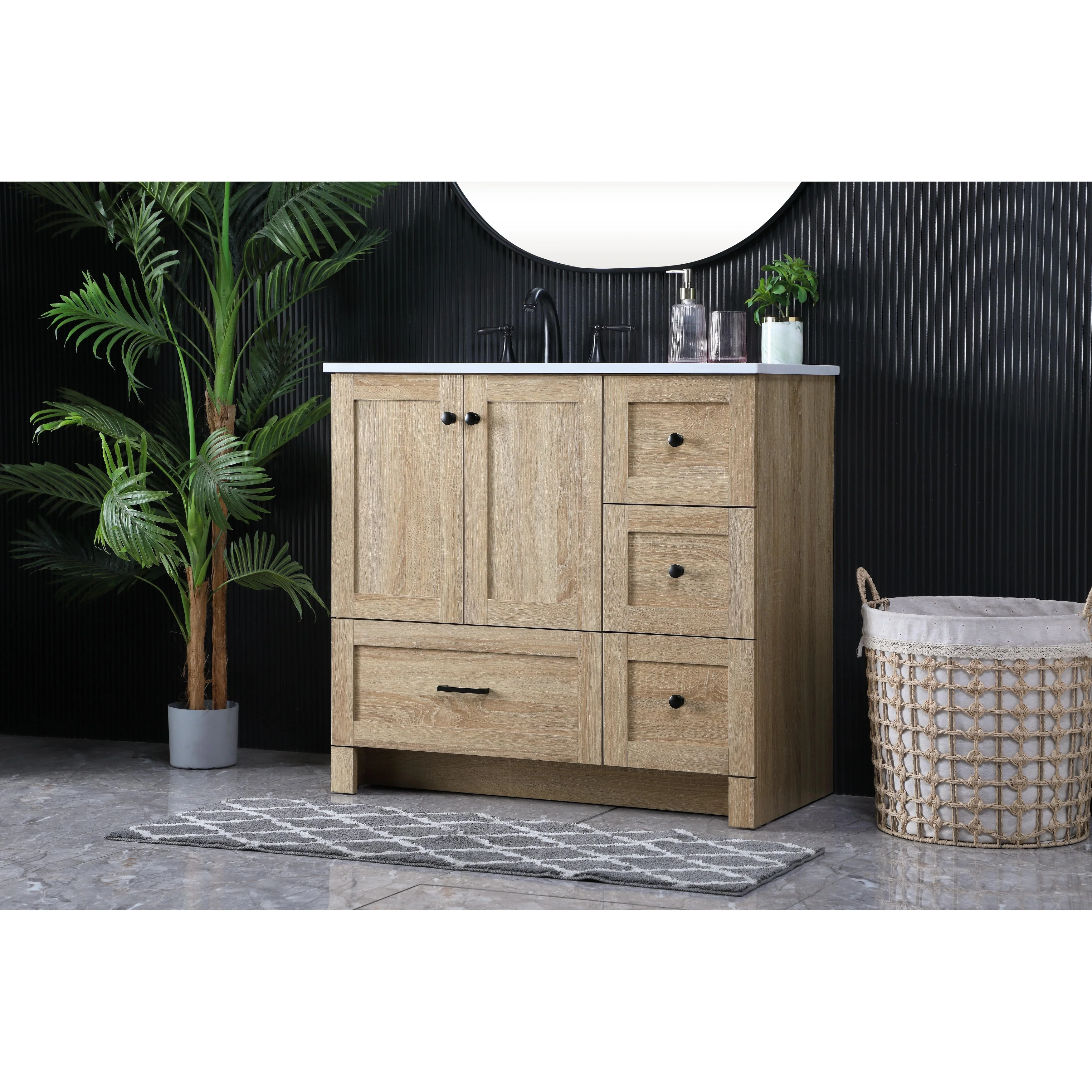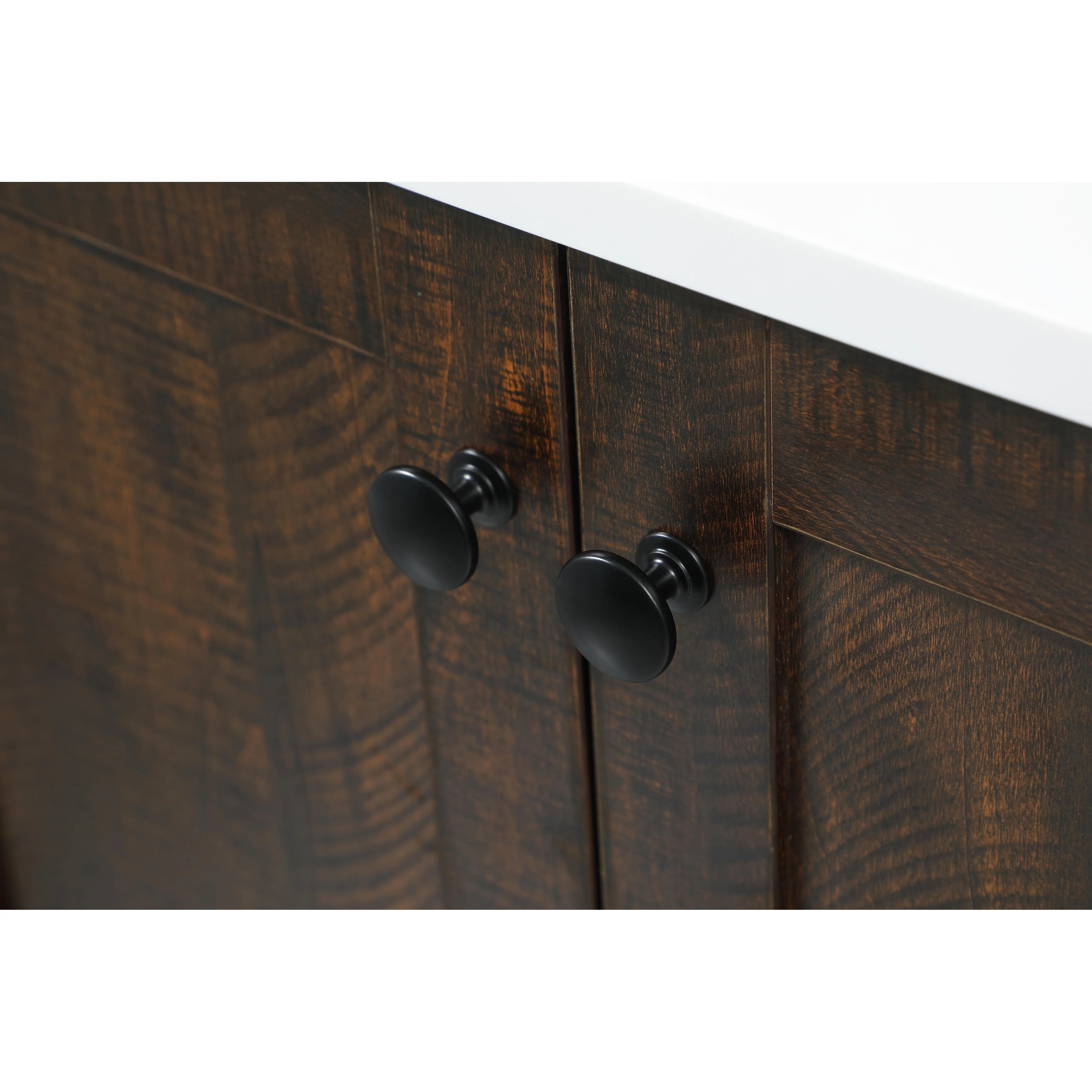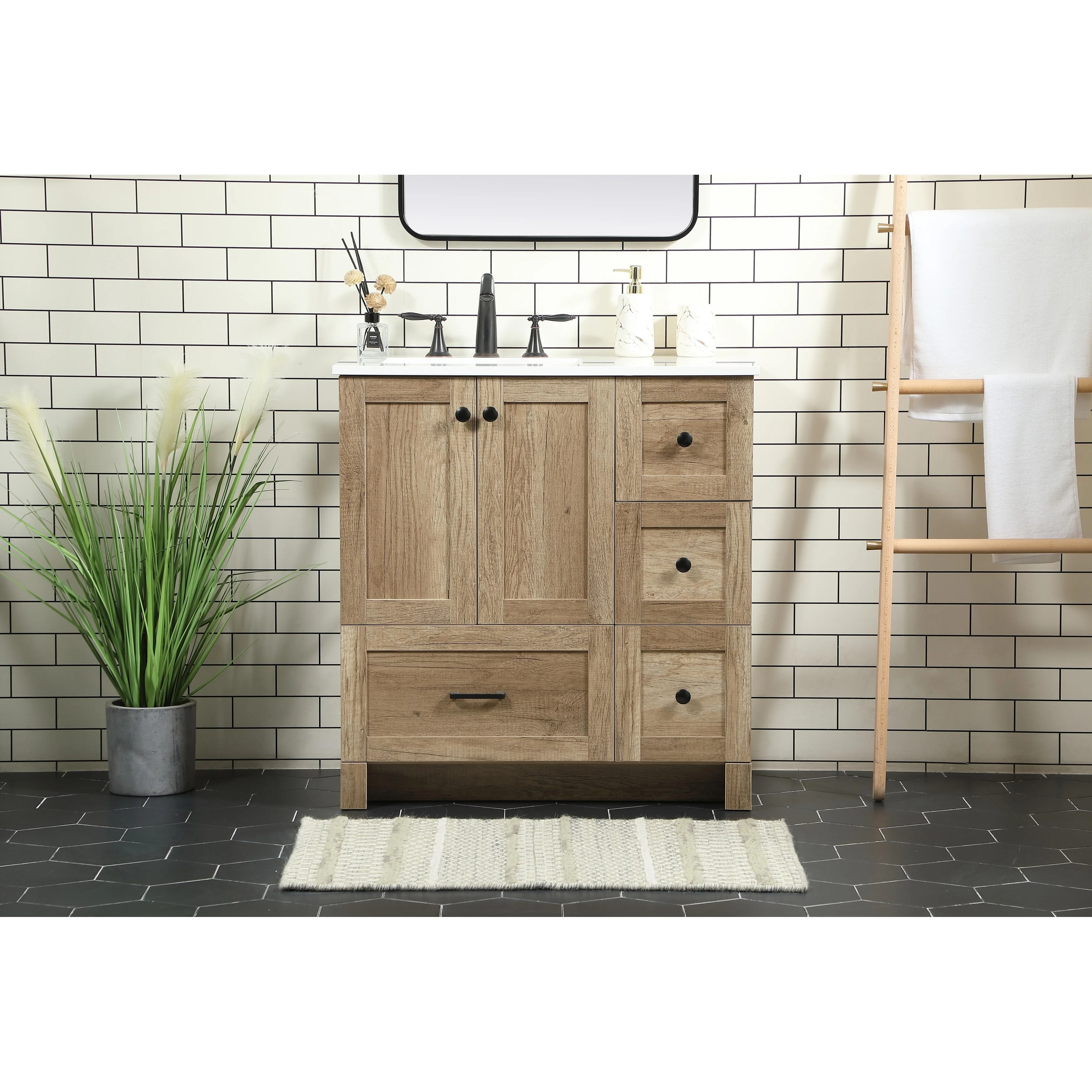 Delve into a world of minimalistic fashion and contemporary styling with this farmhouse vanity. The clean faux lines anchor the weathered design. A black handle adorns the door, hiding the base of the integrated porcelain sink, while the bottom drawer allows you to store your bathroom necessities and toiletries. The compact size makes it the perfect vanity for any bathroom or powder room, regardless of size. Crafted with a durable engineered marble top in an ivory white finish, this vanity is designed with soft-closing glides and soft-closing hinges, ensuring a quiet and smooth operation. The purposely distressed look with an MDF base adds a touch of rustic charm, making it a stylish addition to any modern home.
