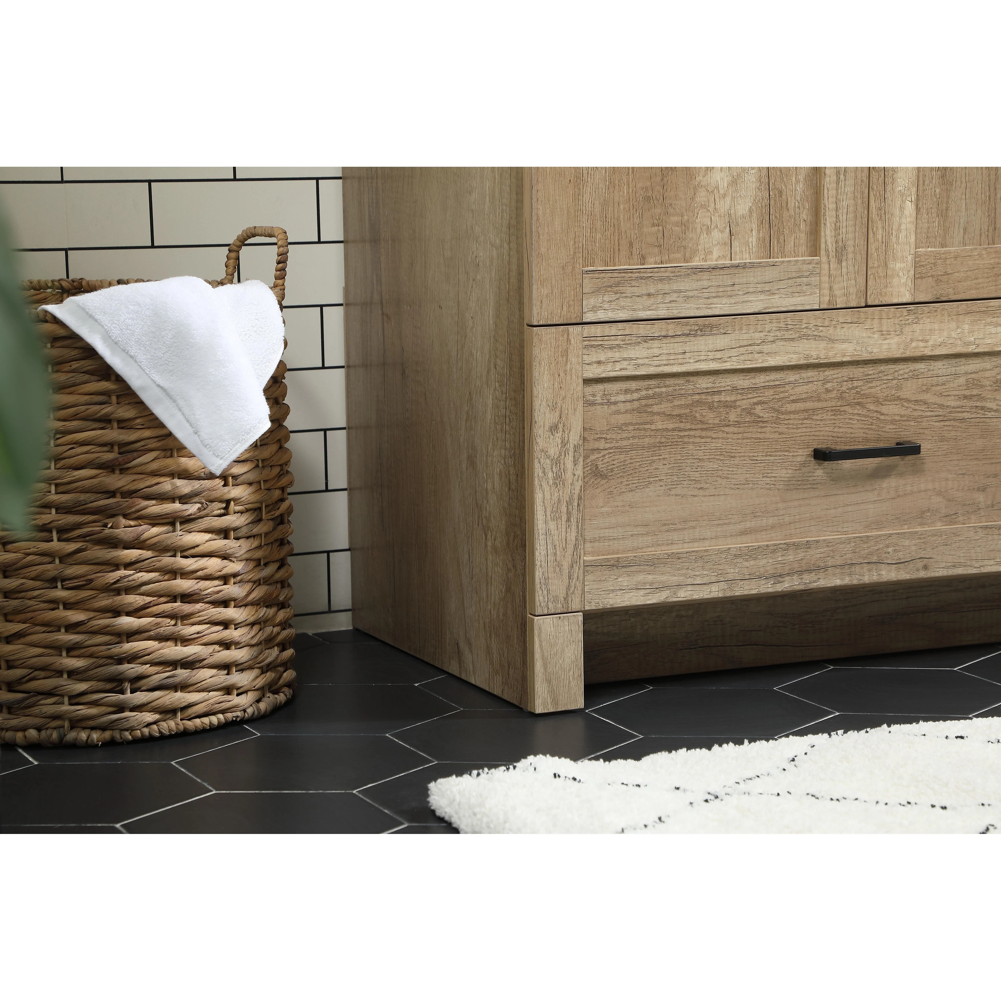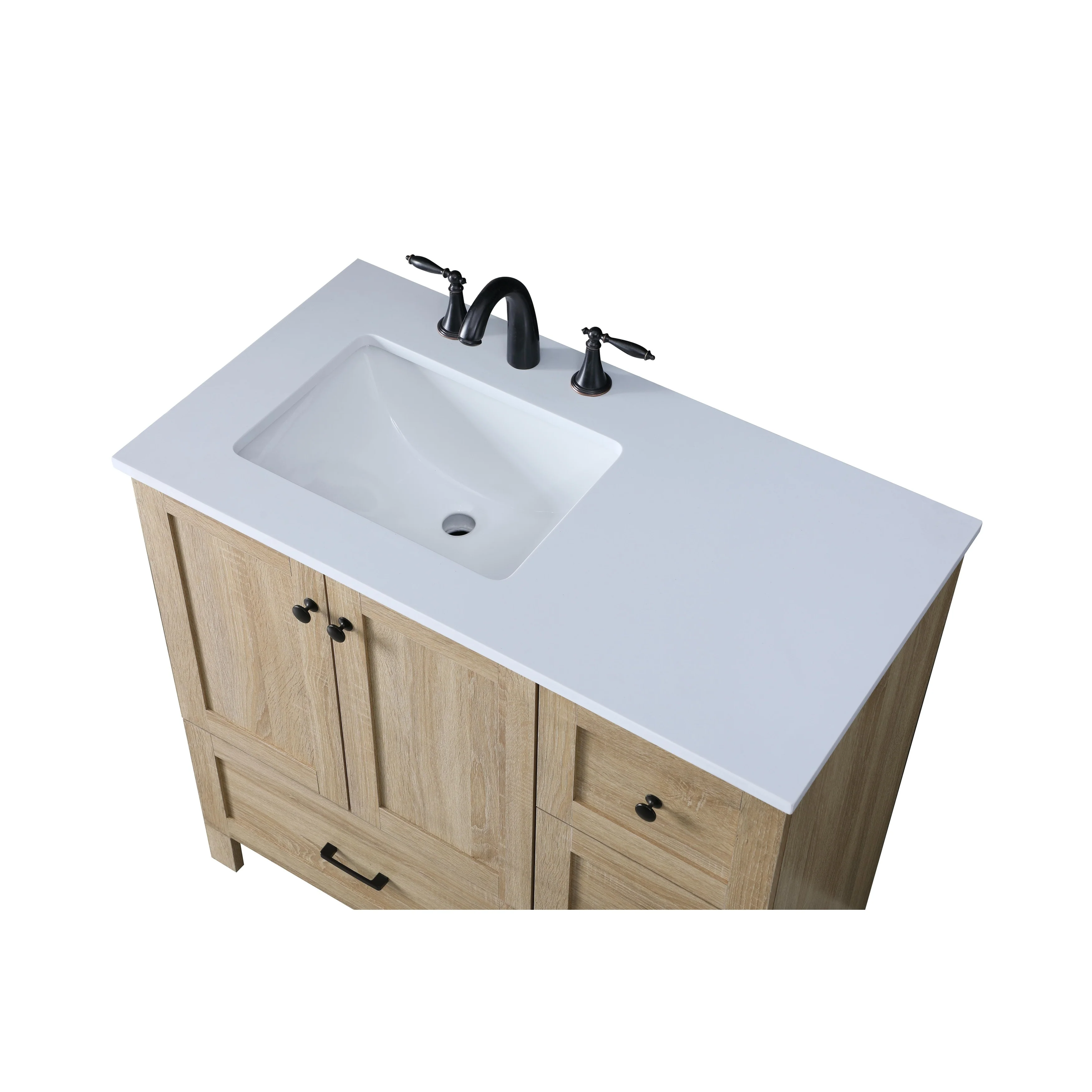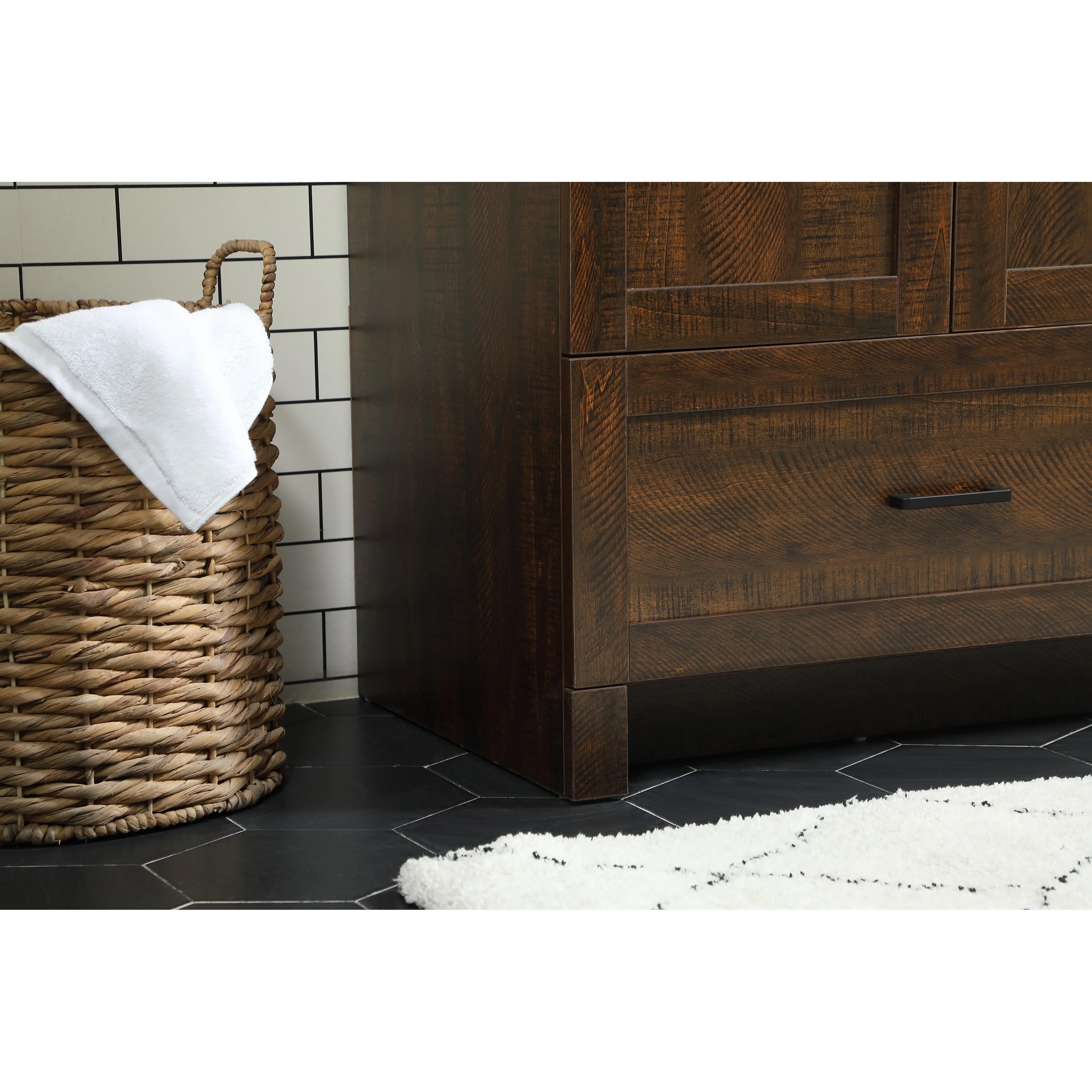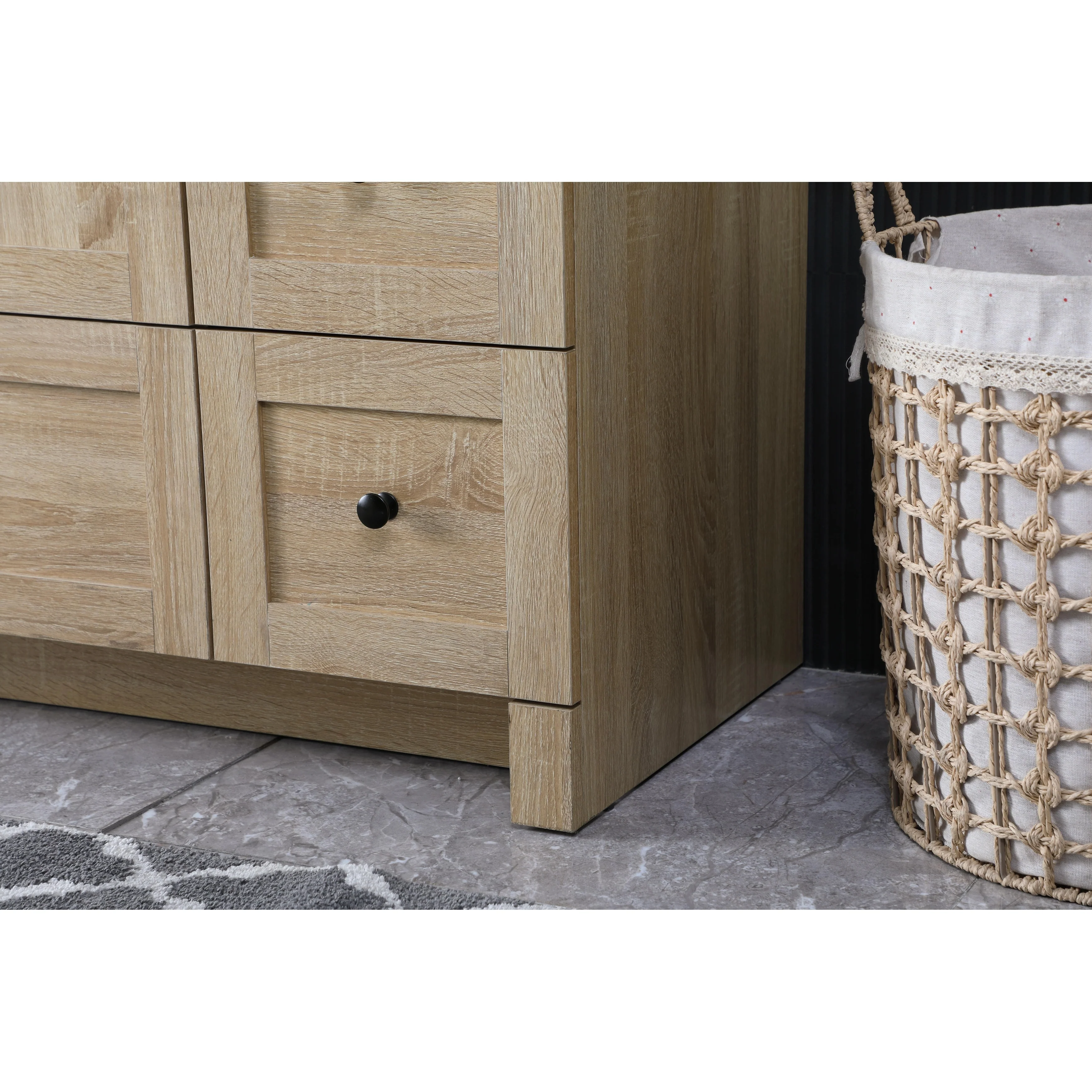 Delve into a world of minimalistic fashion and contemporary styling with this farmhouse vanity. The clean faux lines anchor the weathered design. A black handle adorns the door, hiding the base of the integrated porcelain sink, while the bottom drawer allows you to store your bathroom necessities and toiletries. The compact size makes it the perfect vanity for any bathroom or powder room, regardless of size. Crafted with a durable engineered marble top in an ivory white finish, this vanity is designed with soft-closing glides and soft-closing hinges, ensuring a quiet and smooth operation. The purposely distressed look with an MDF base adds a touch of rustic charm, making it a stylish addition to any modern home.