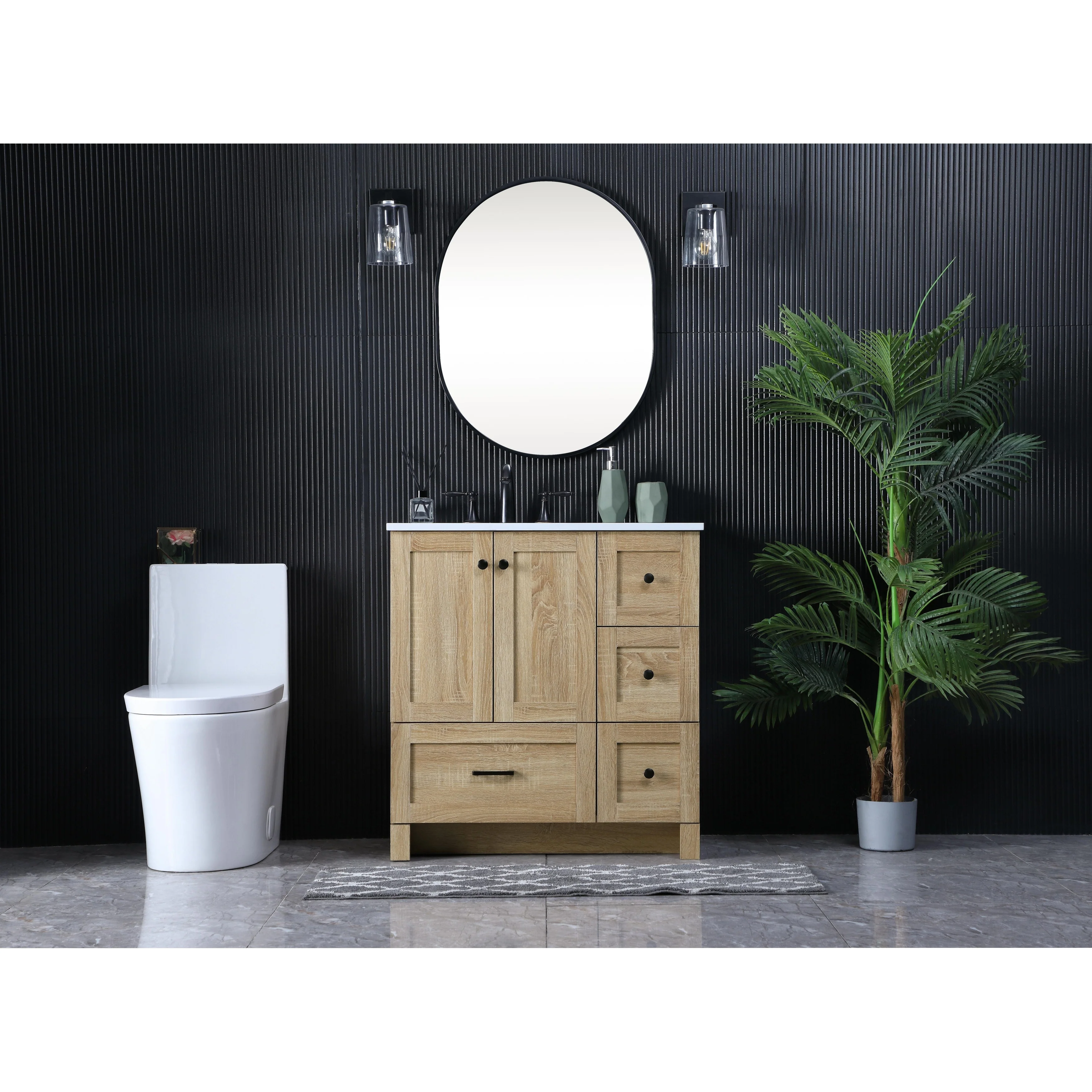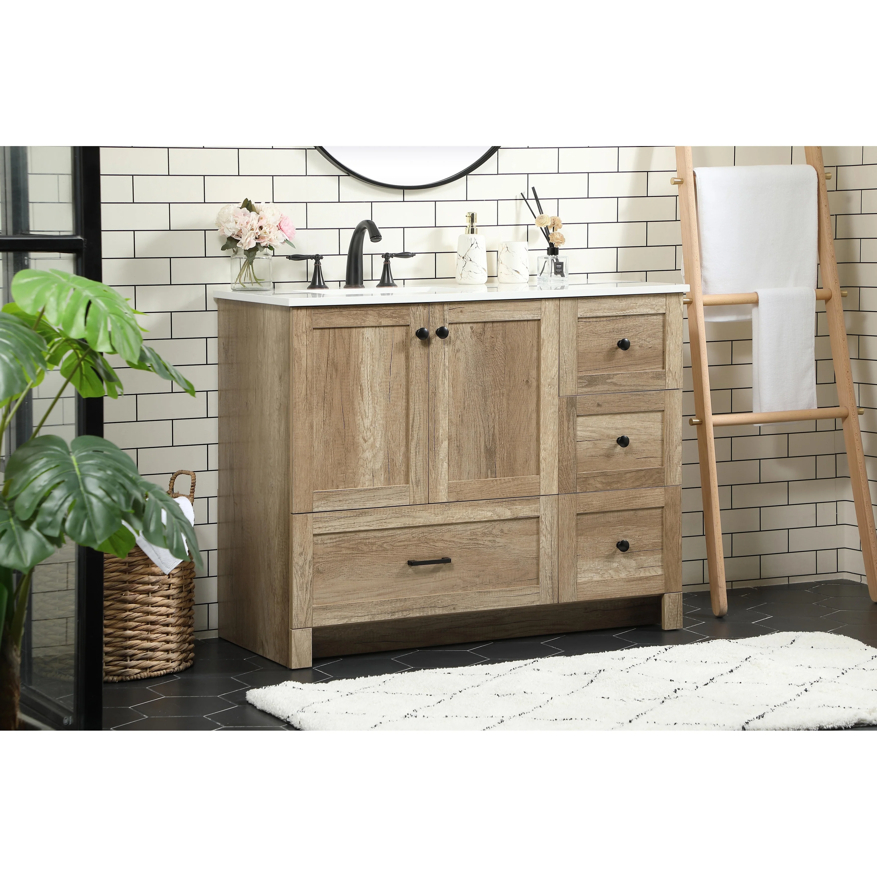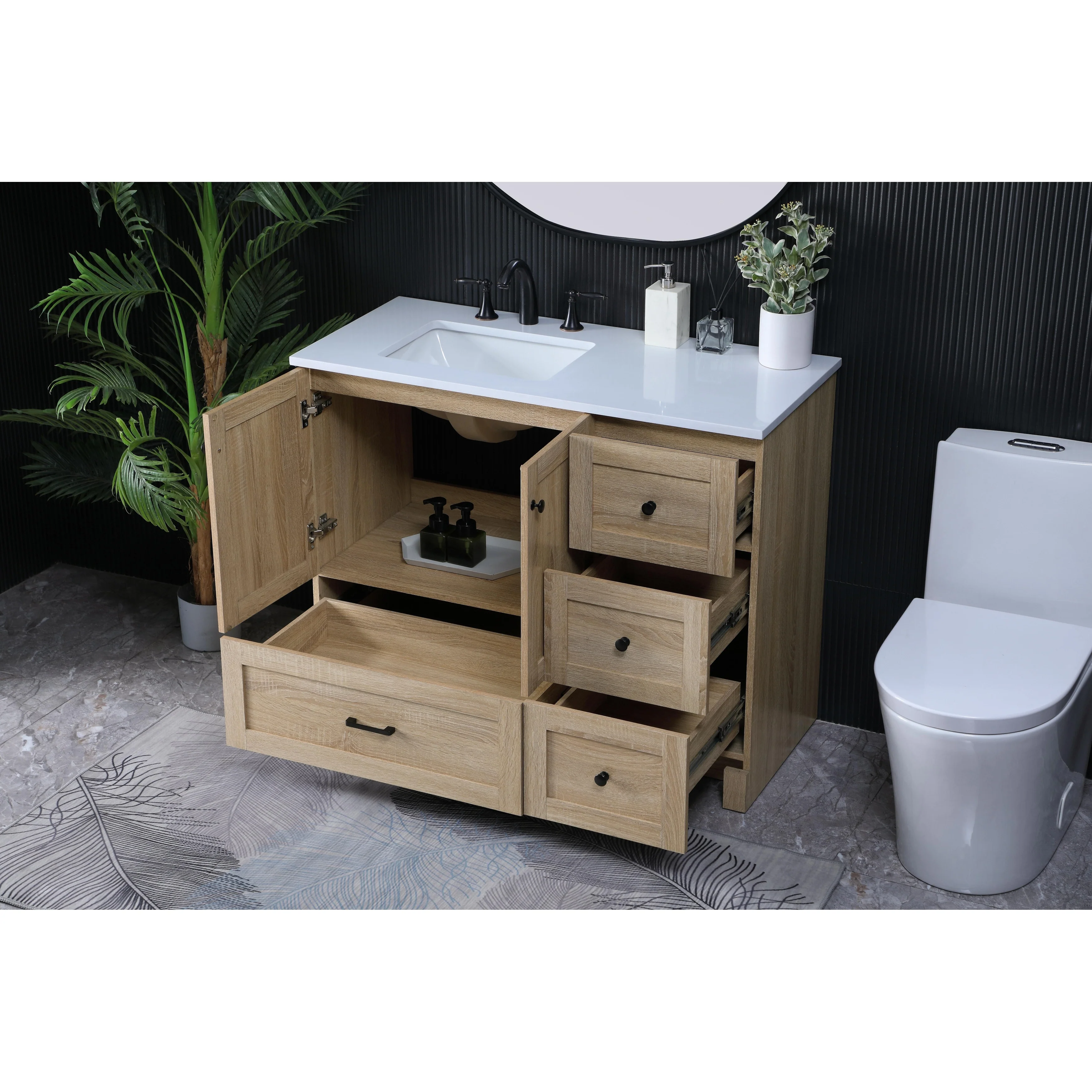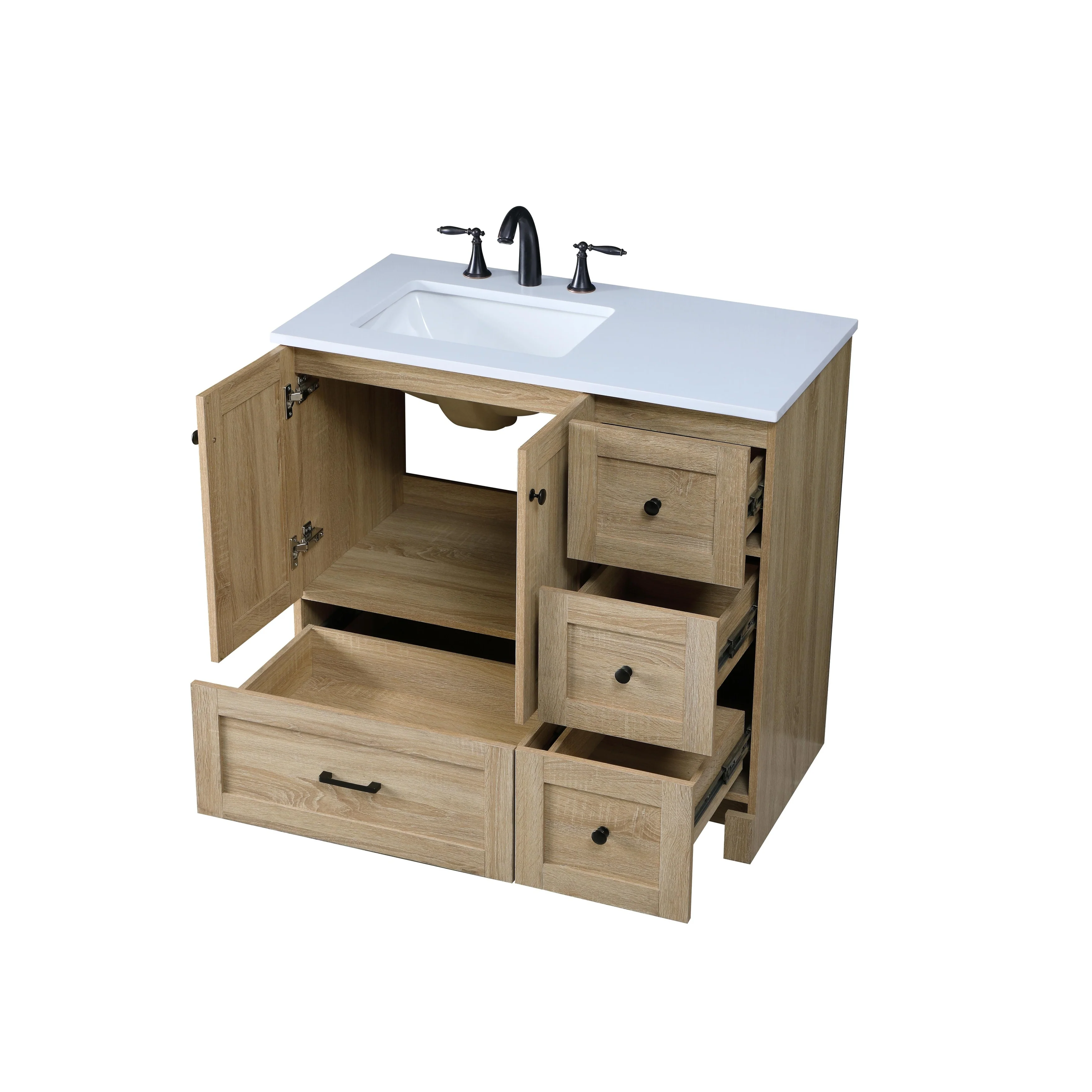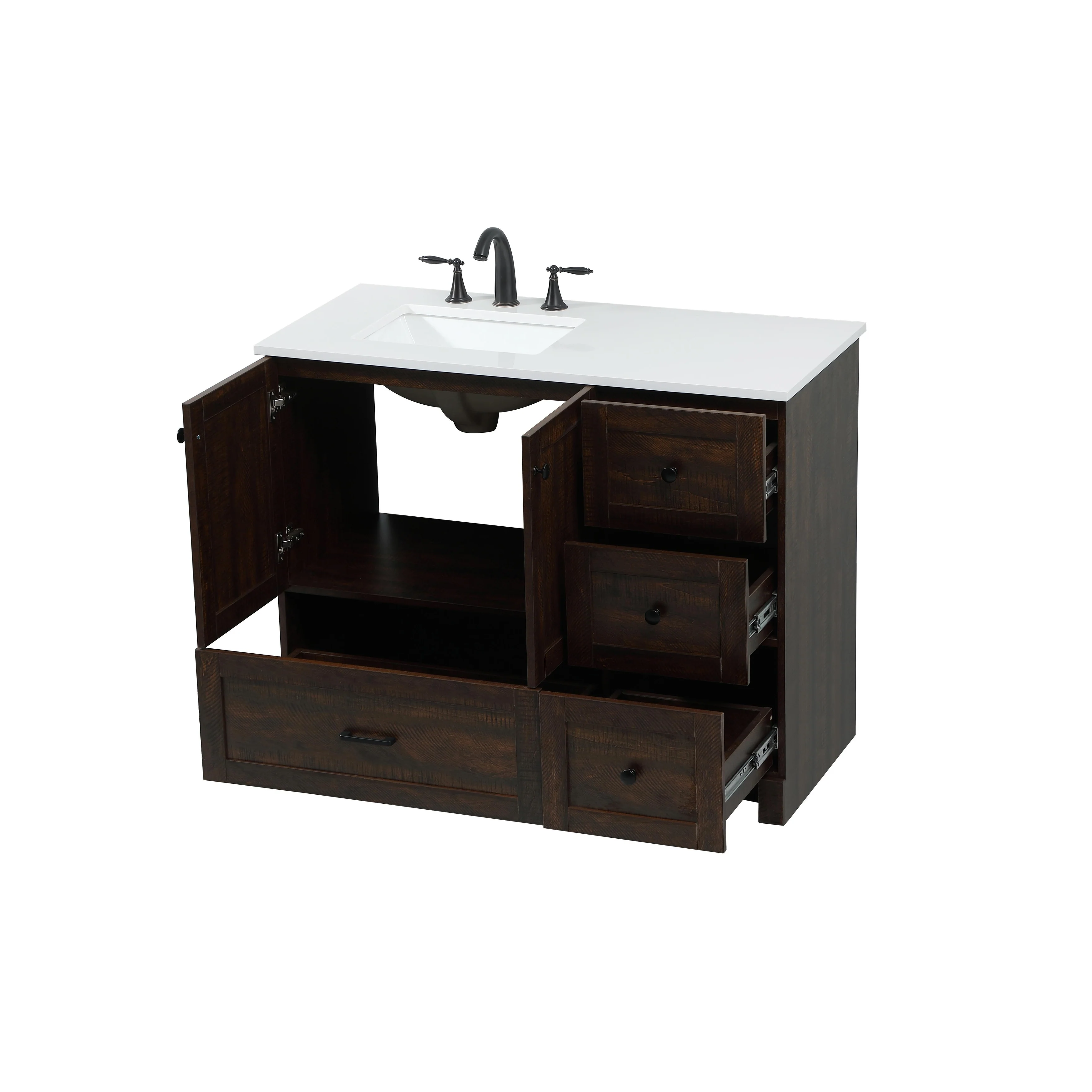 Delve into a world of minimalistic fashion and contemporary styling with this farmhouse vanity. The clean faux lines anchor the weathered design. A black handle adorns the door, hiding the base of the integrated porcelain sink, while the bottom drawer allows you to store your bathroom necessities and toiletries. The compact size makes it the perfect vanity for any bathroom or powder room, regardless of size. Crafted with a durable engineered marble top in an ivory white finish, this vanity is designed with soft-closing glides and soft-closing hinges, ensuring a quiet and smooth operation. The purposely distressed look with an MDF base adds a touch of rustic charm, making it a stylish addition to any modern home.