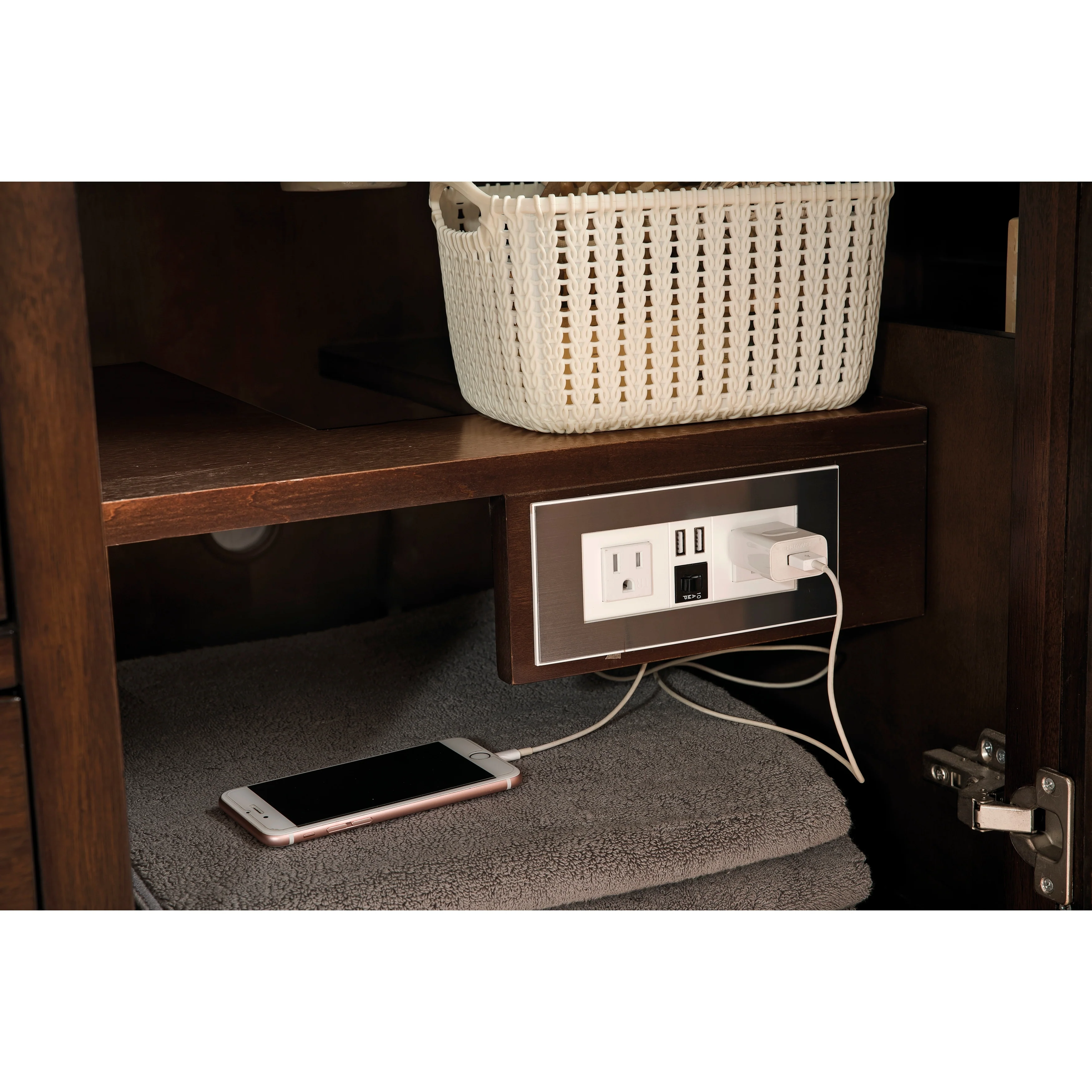 - Soft-close door and full-extension drawers with brushed aluminum finished laminate