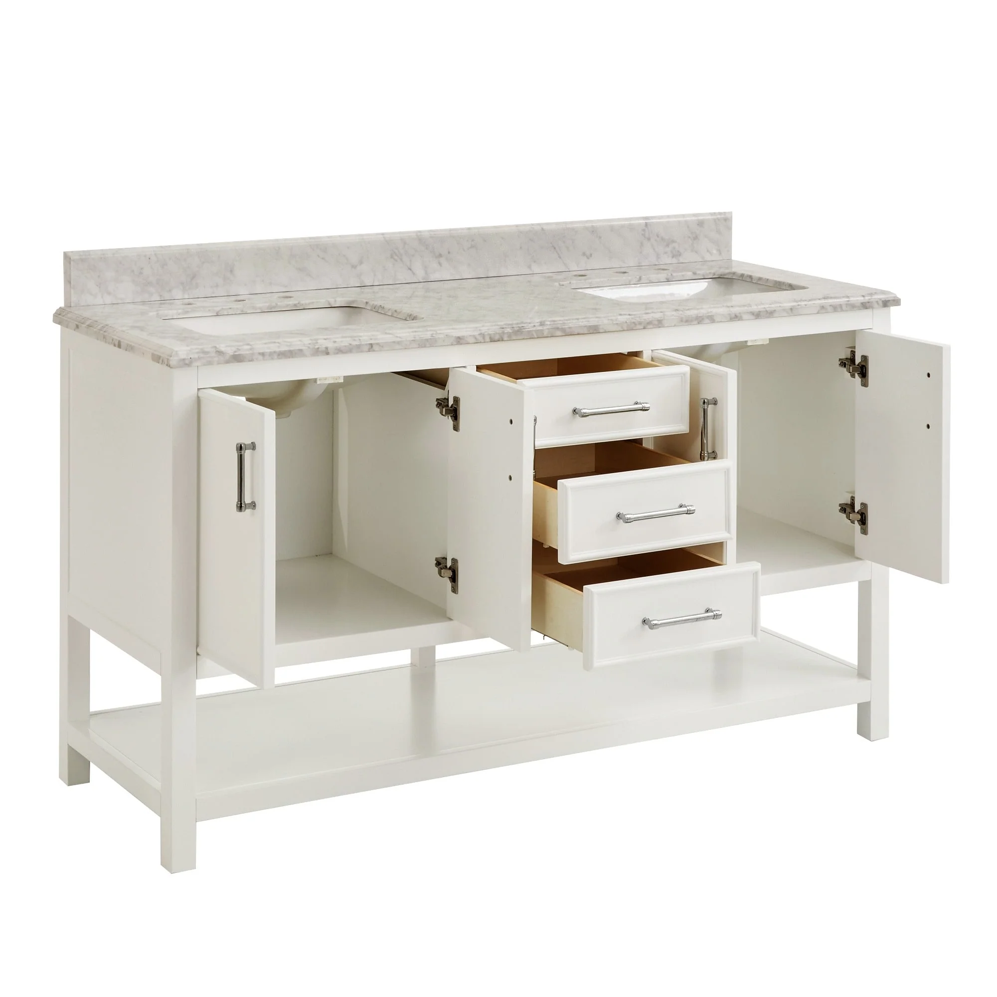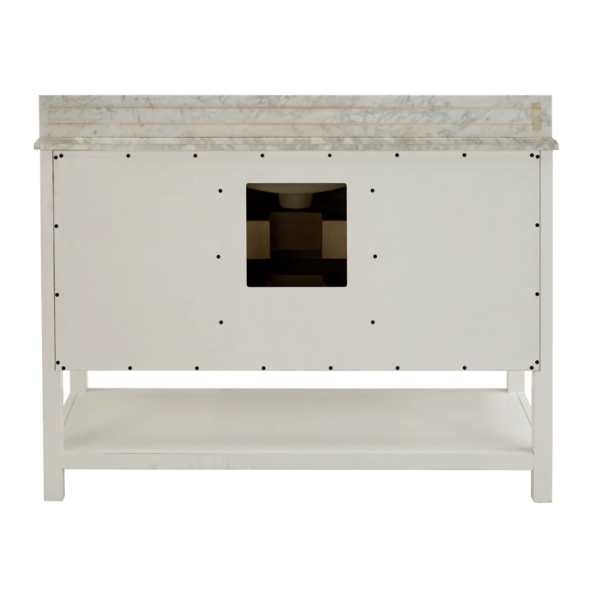 Transform your bathroom into a modern sanctuary with the Bathroom Sink Vanity boasting a pristine white marble veneer stone top. This stylish piece is available in single and double-sink configurations, perfect for any bathroom size. Constructed from premium rubberwood and poplar, this vanity is built to last. The white finish comes with chrome finish hardware, providing a touch of sophistication. The vanity includes adjustable leg levelers, soft-close drawers, and spacious cabinets, offering ample storage and easy installation. The large open shelf at the bottom is perfect for organizing towels and other essentials.