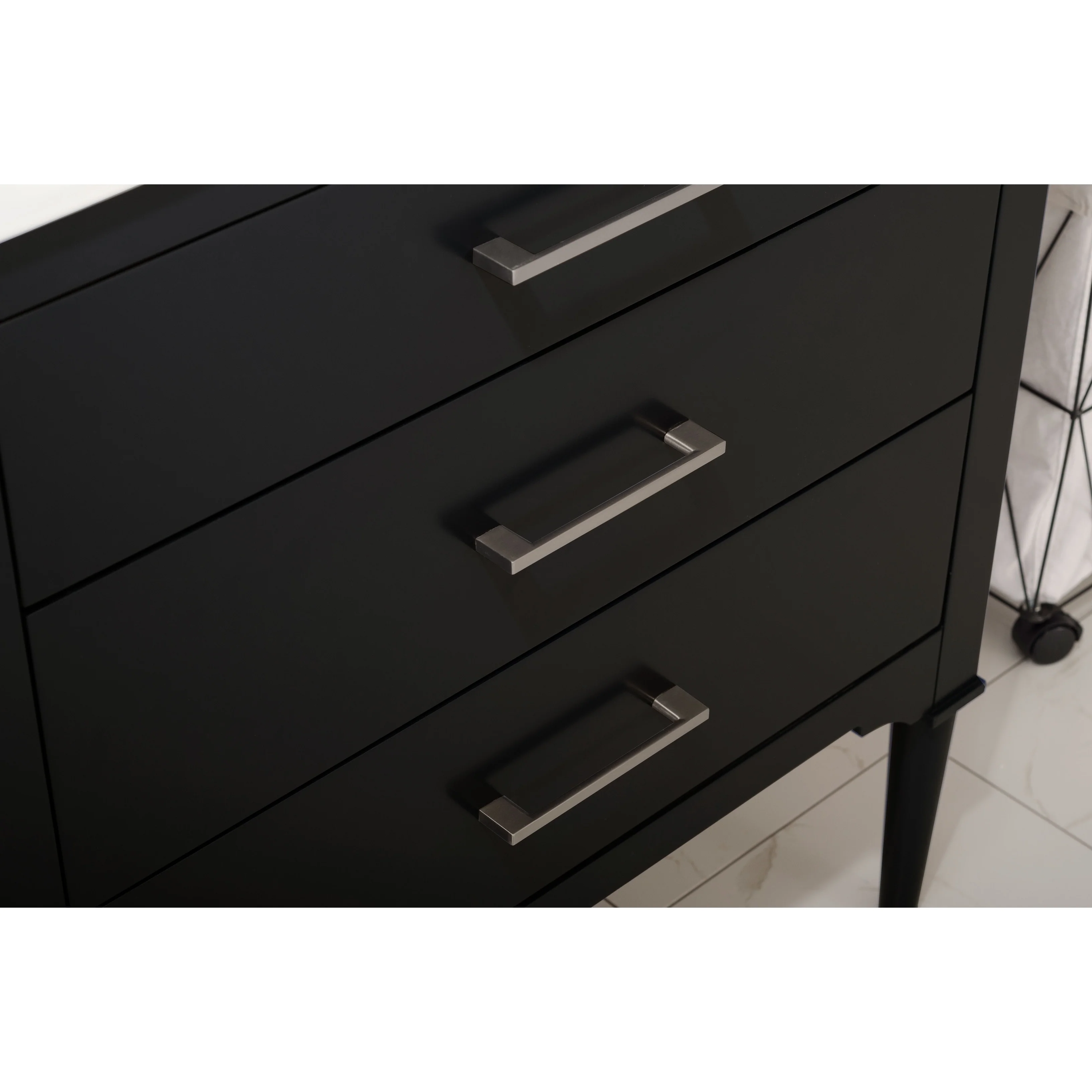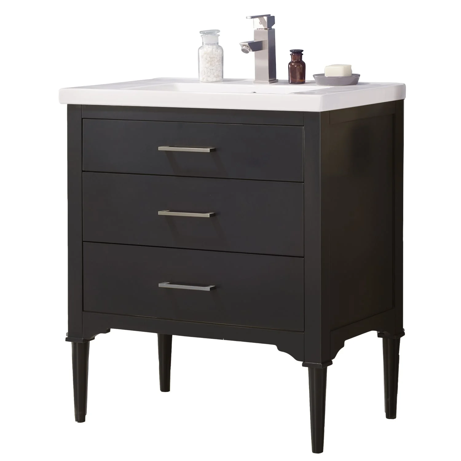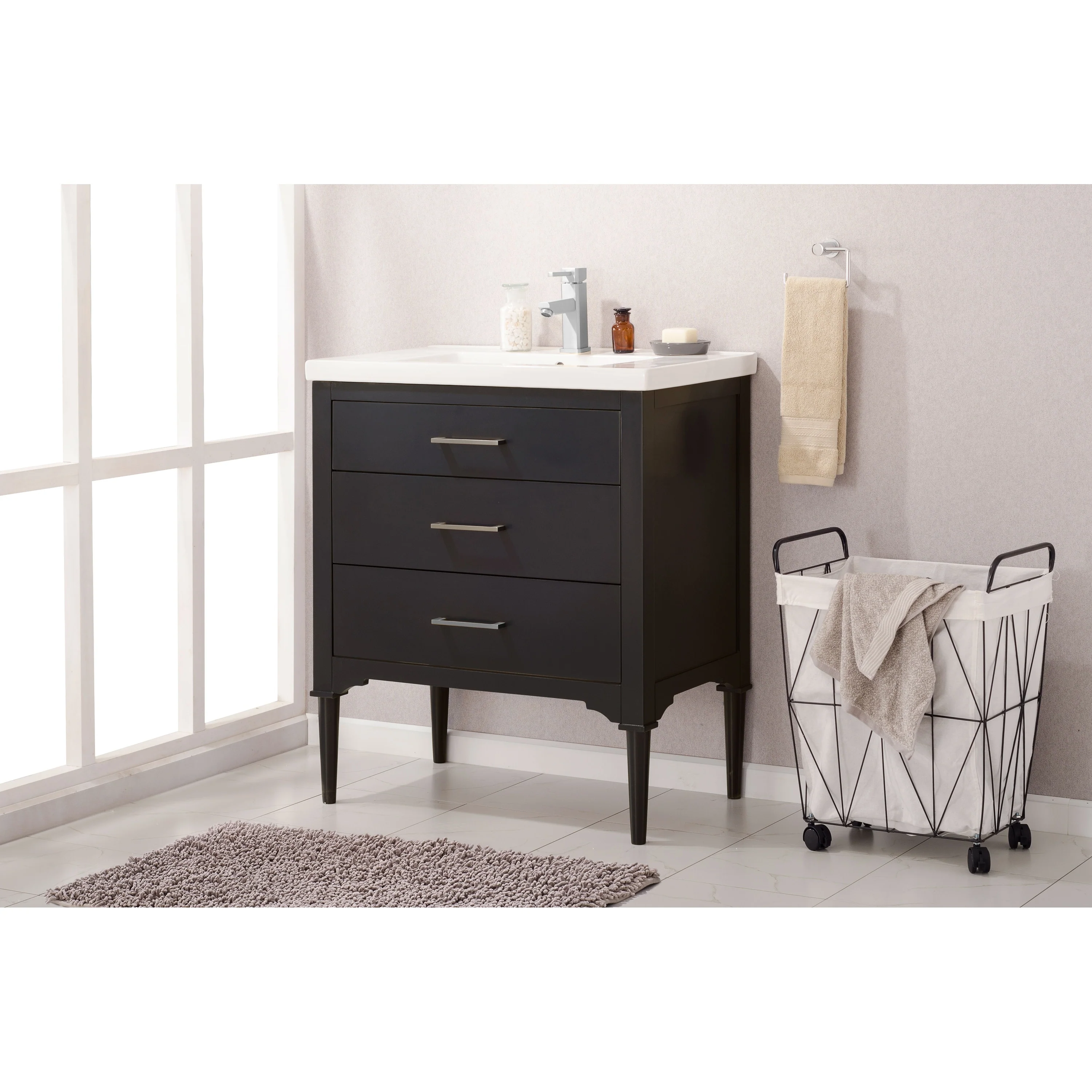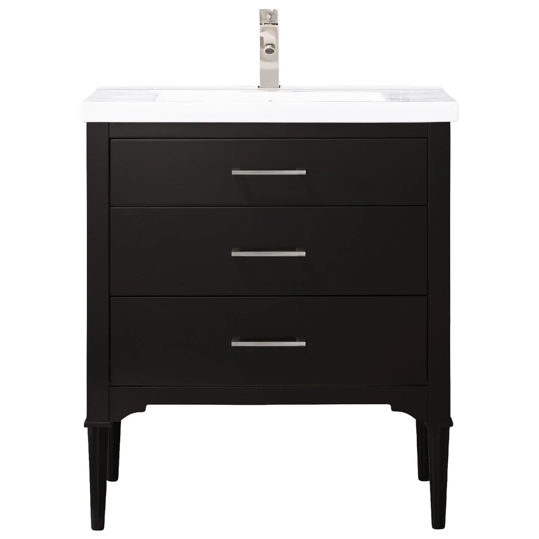 The Mason 30 inch single sink vanity by Design Element provides the perfect finishing touch to your bathroom remodel project. Featuring a solid wood frame, this vanity will maintain its beauty and functionality year after year. The porcelain countertop and integrated sink with overflow perfectly matches the styling of the cabinet, and is extremely simple to maintain. Each of the 2 fully functional drawers are constructed with dovetail joints and soft close glides. The included brushed finished hardware perfectly compliments the espresso cabinet. Faucet and drain are not included.