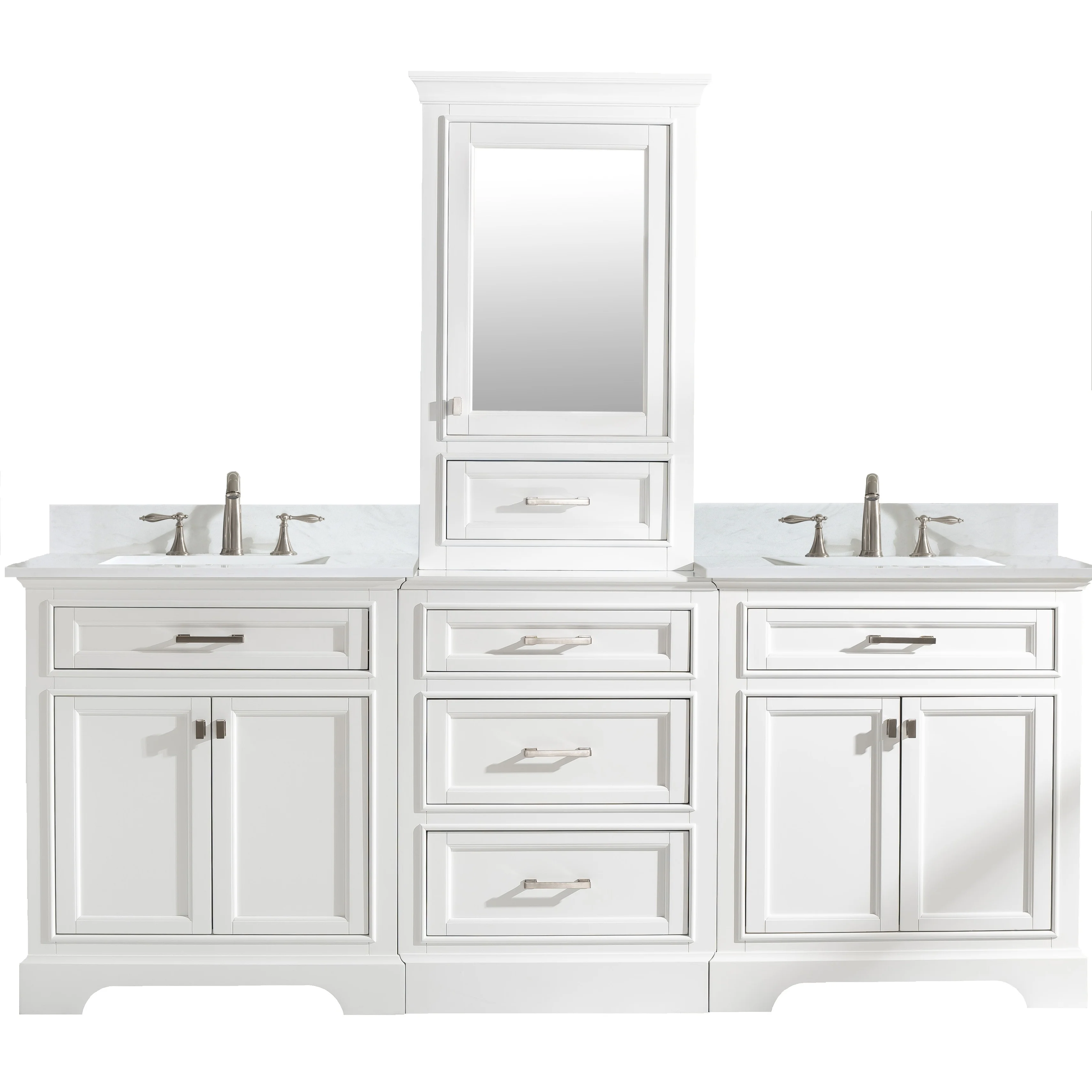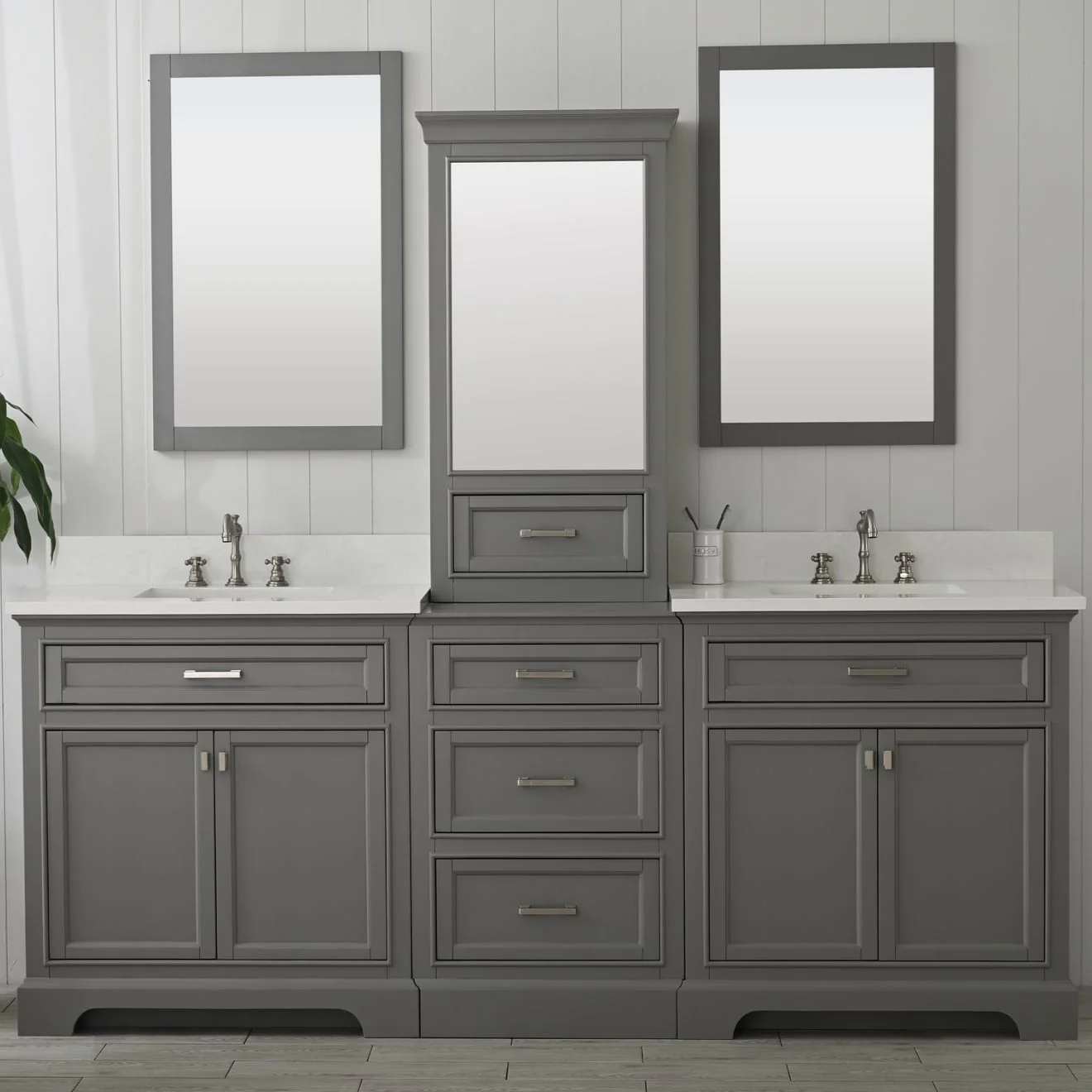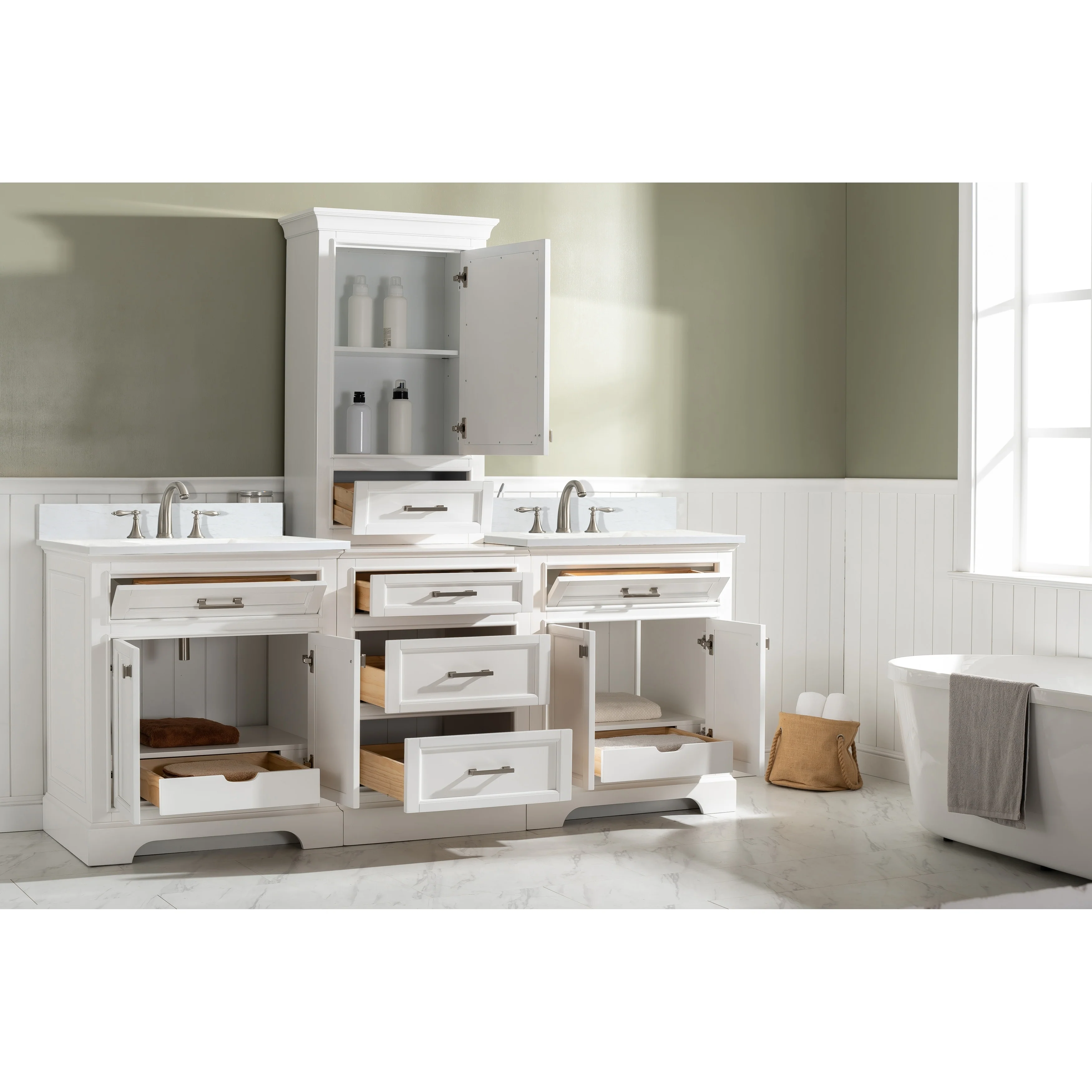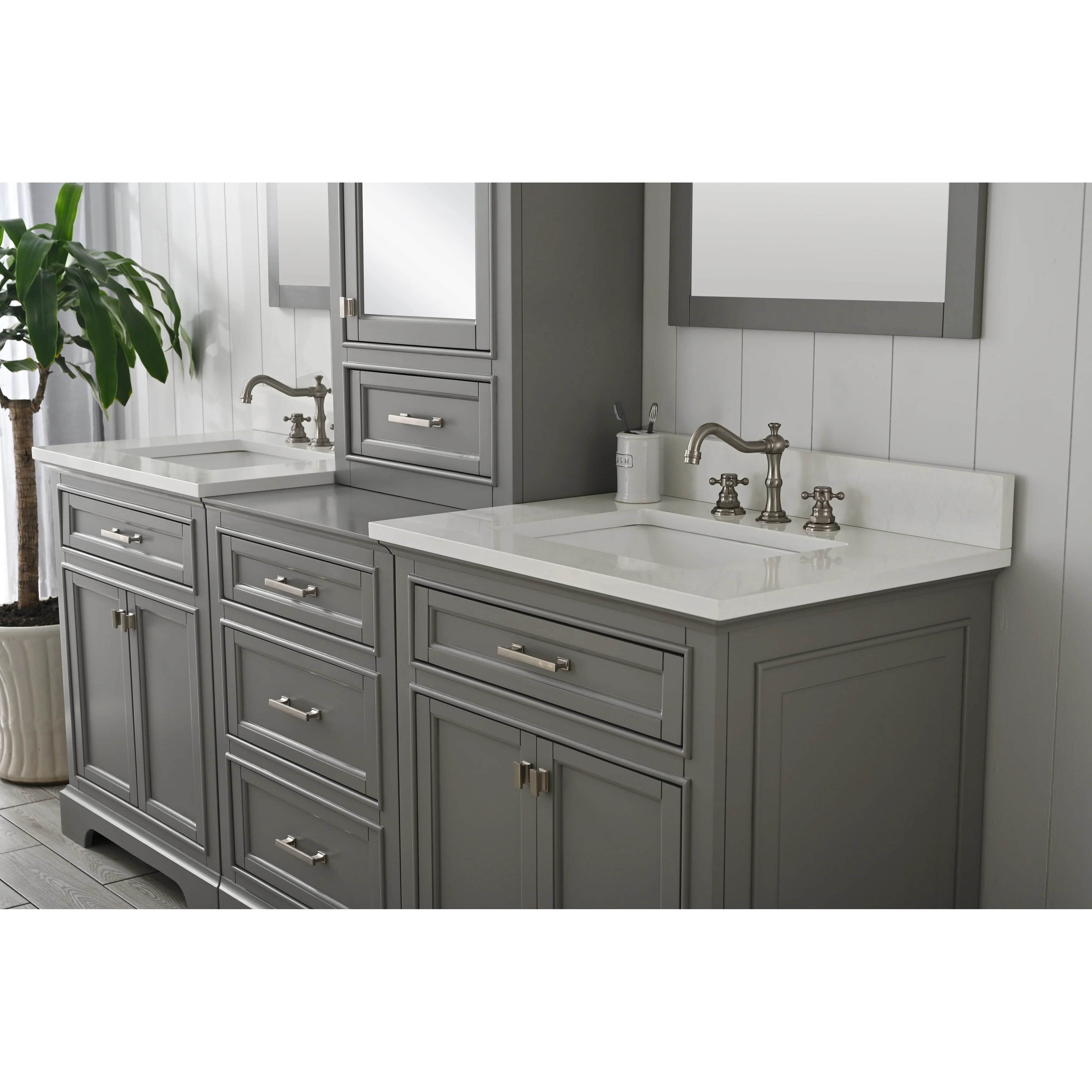 Elevate your bathroom decor with the Milano 84' Double Sink Bathroom Vanity Modular Set by Design Element. Crafted with solid birch hardwood, this elegant modular set features two single vanities, a draw unit, and a tower cabinet. The 1-inch thick white quartz countertop and backsplash provide ample space for your toiletries while the soft-closing drawers and doors ensure quiet operation. The brushed nickel finish hardware adds a touch of sophistication, and the porcelain undermount sinks come with an overflow. With dovetail joint drawer construction and a multi-layer paint finish, this vanity set is both beautiful and durable. Faucets, mirrors, and drains are not included.