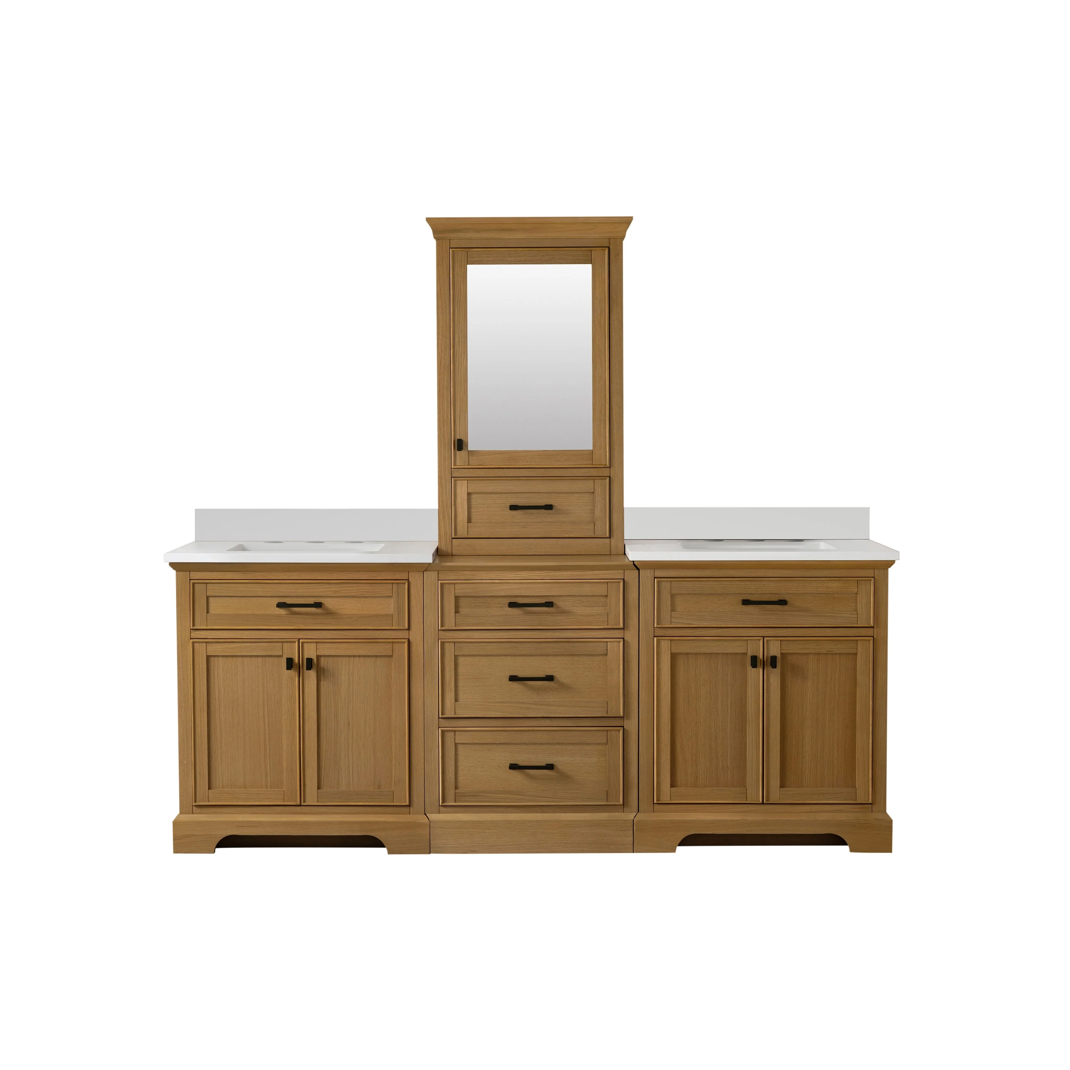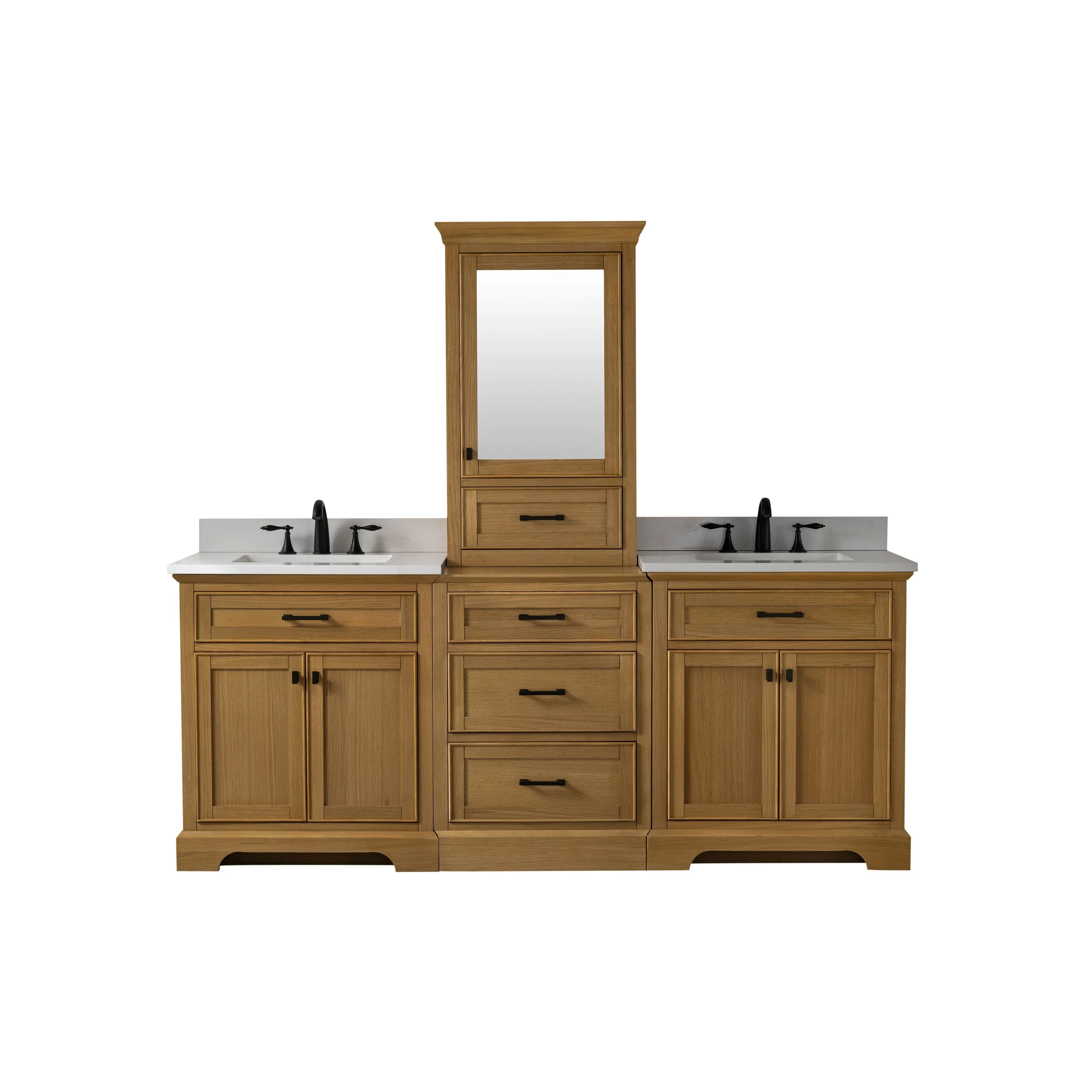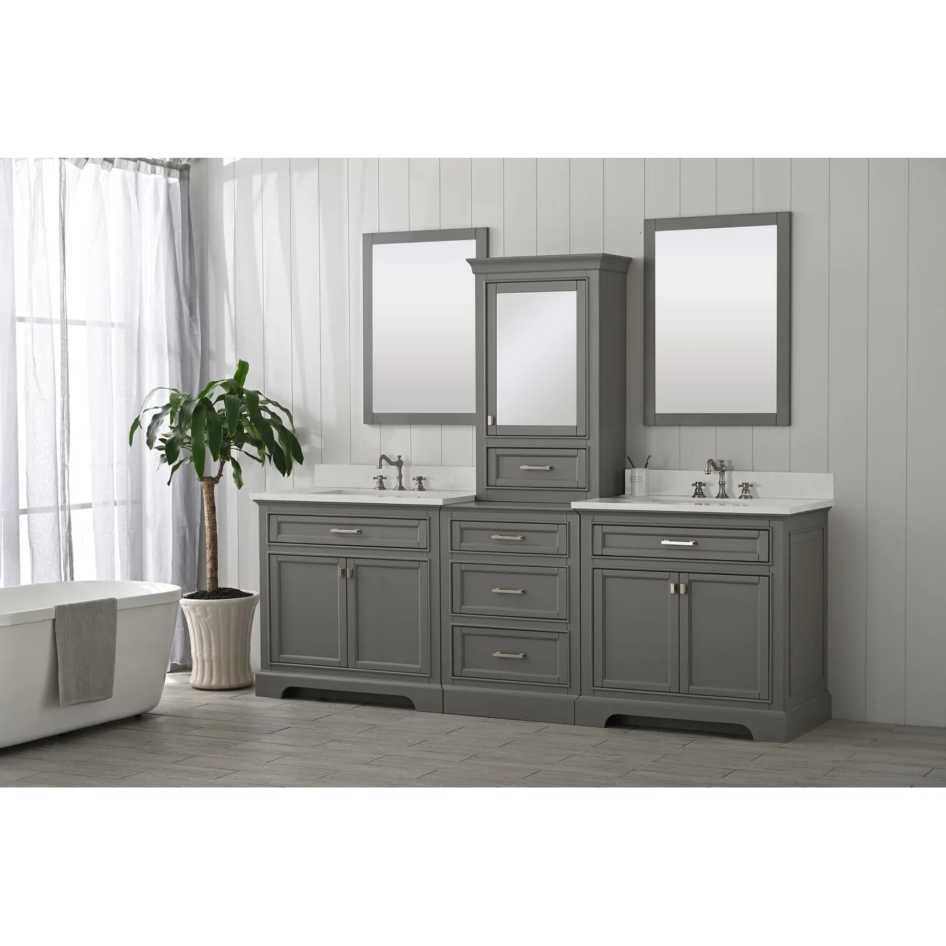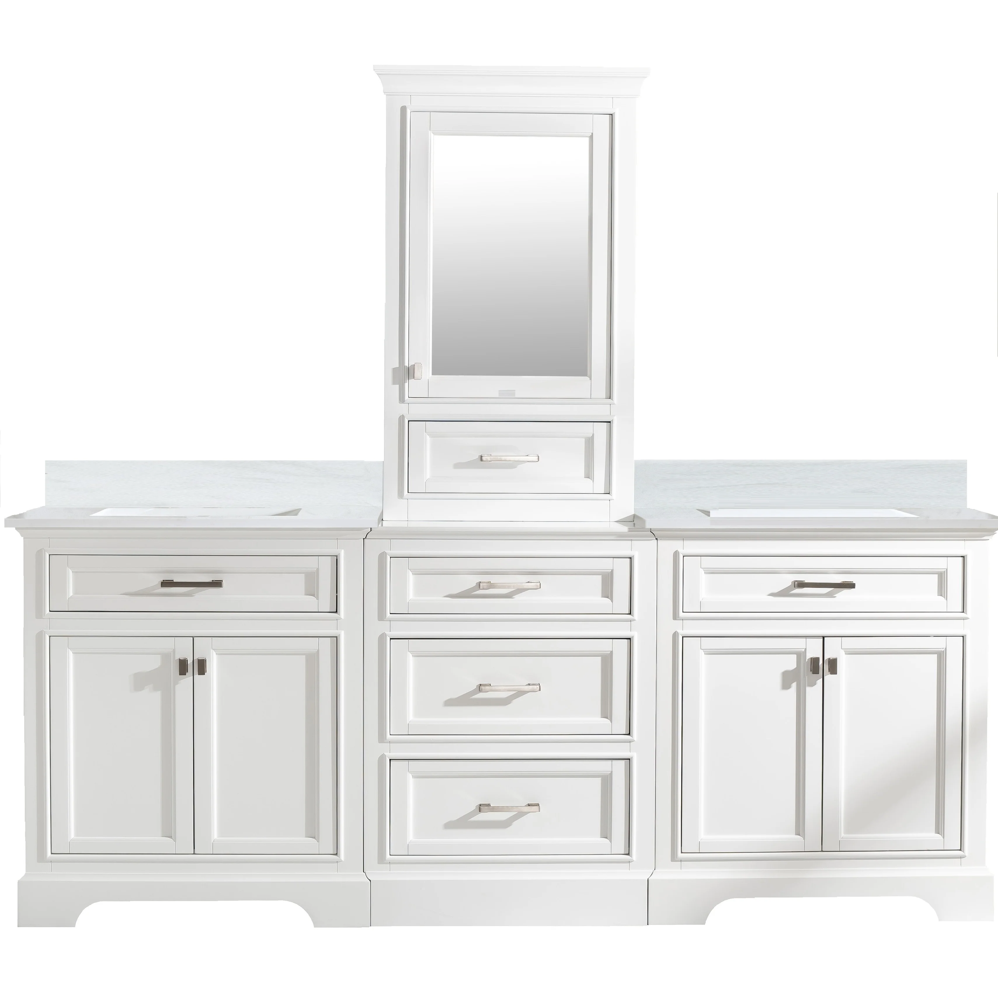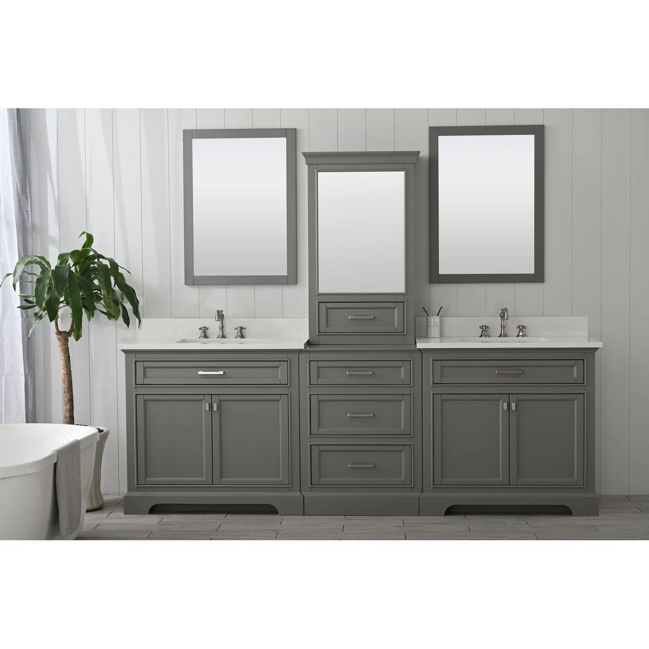 Elevate your bathroom decor with the Milano 84' Double Sink Bathroom Vanity Modular Set by Design Element. Crafted with solid birch hardwood, this elegant modular set features two single vanities, a draw unit, and a tower cabinet. The 1-inch thick white quartz countertop and backsplash provide ample space for your toiletries while the soft-closing drawers and doors ensure quiet operation. The brushed nickel finish hardware adds a touch of sophistication, and the porcelain undermount sinks come with an overflow. With dovetail joint drawer construction and a multi-layer paint finish, this vanity set is both beautiful and durable. Faucets, mirrors, and drains are not included.