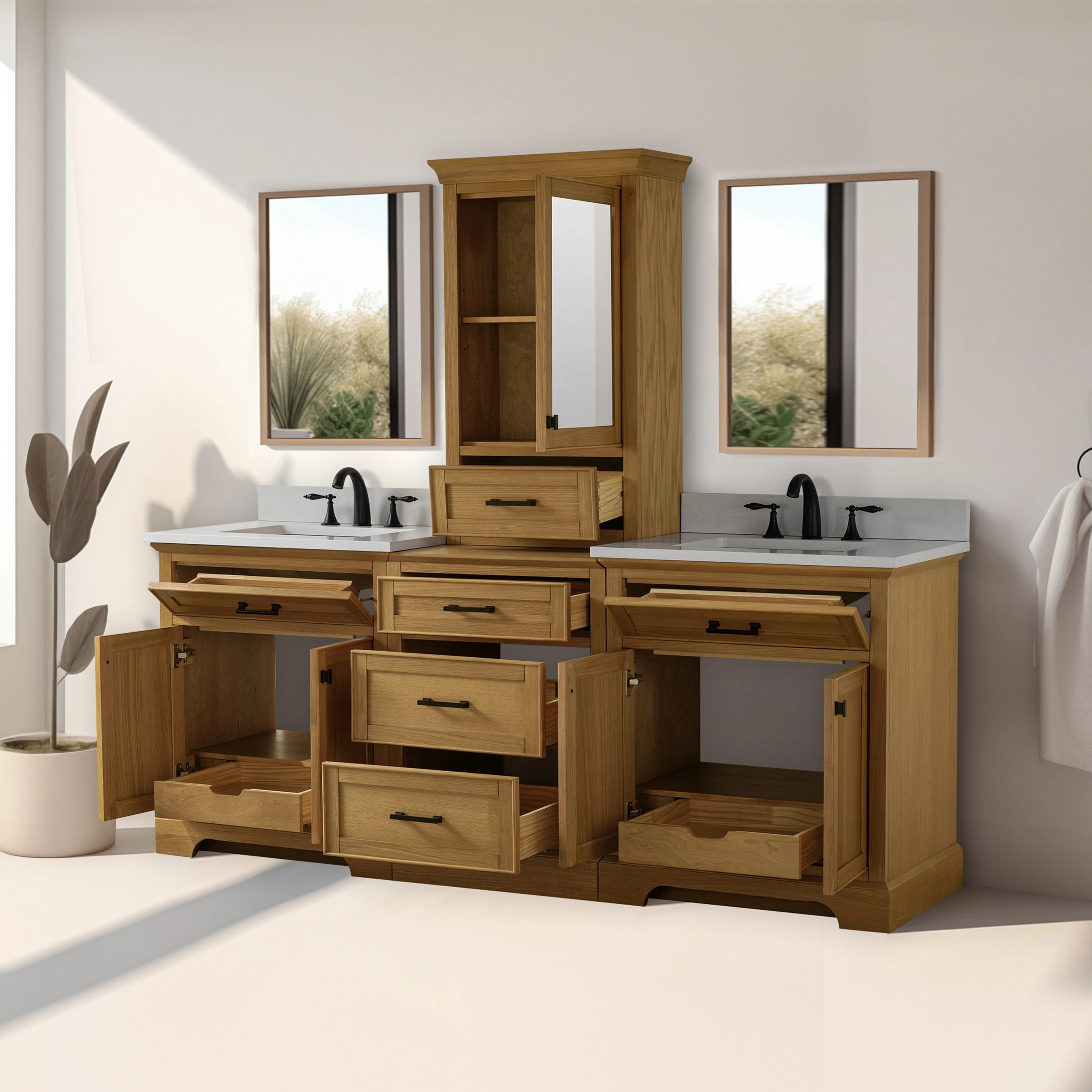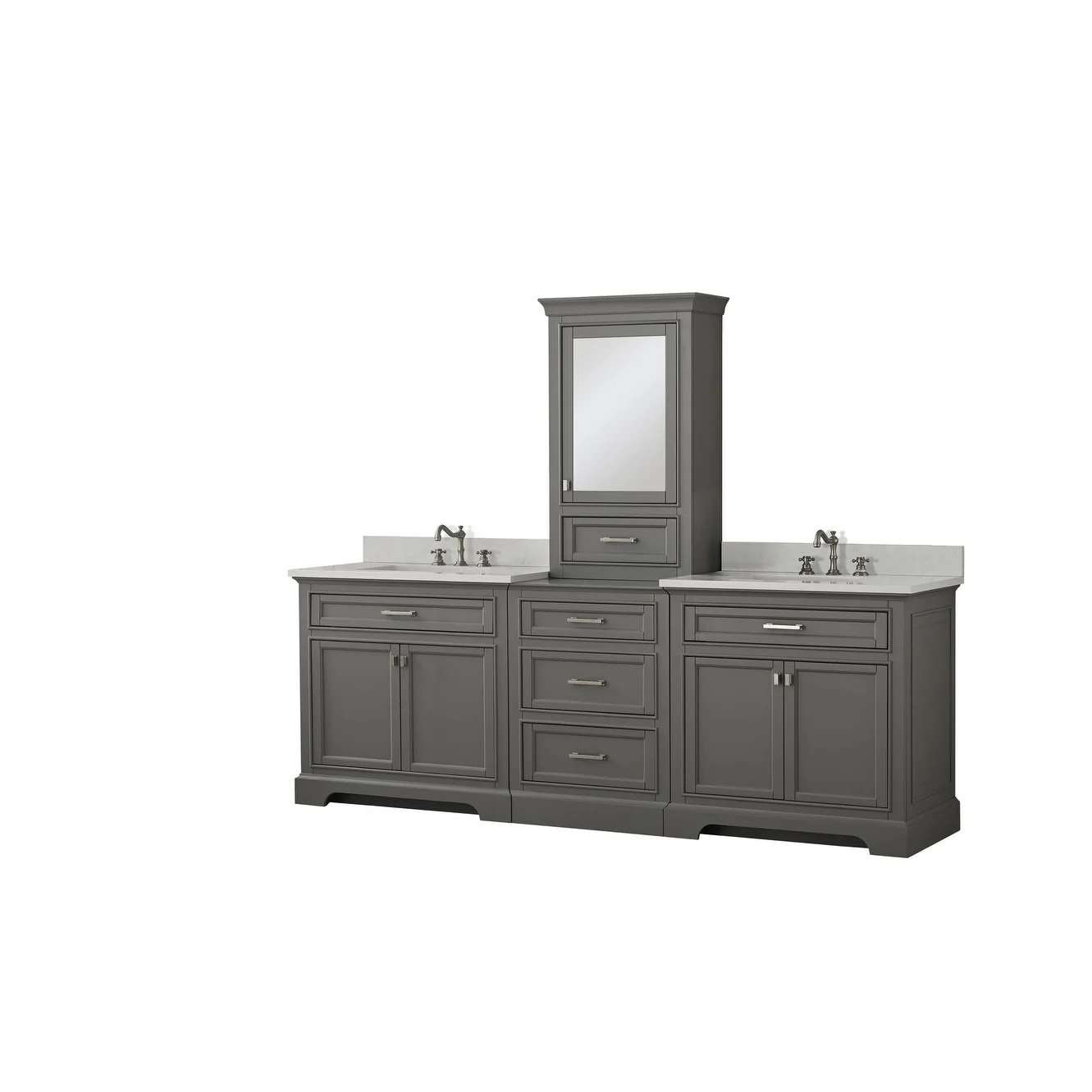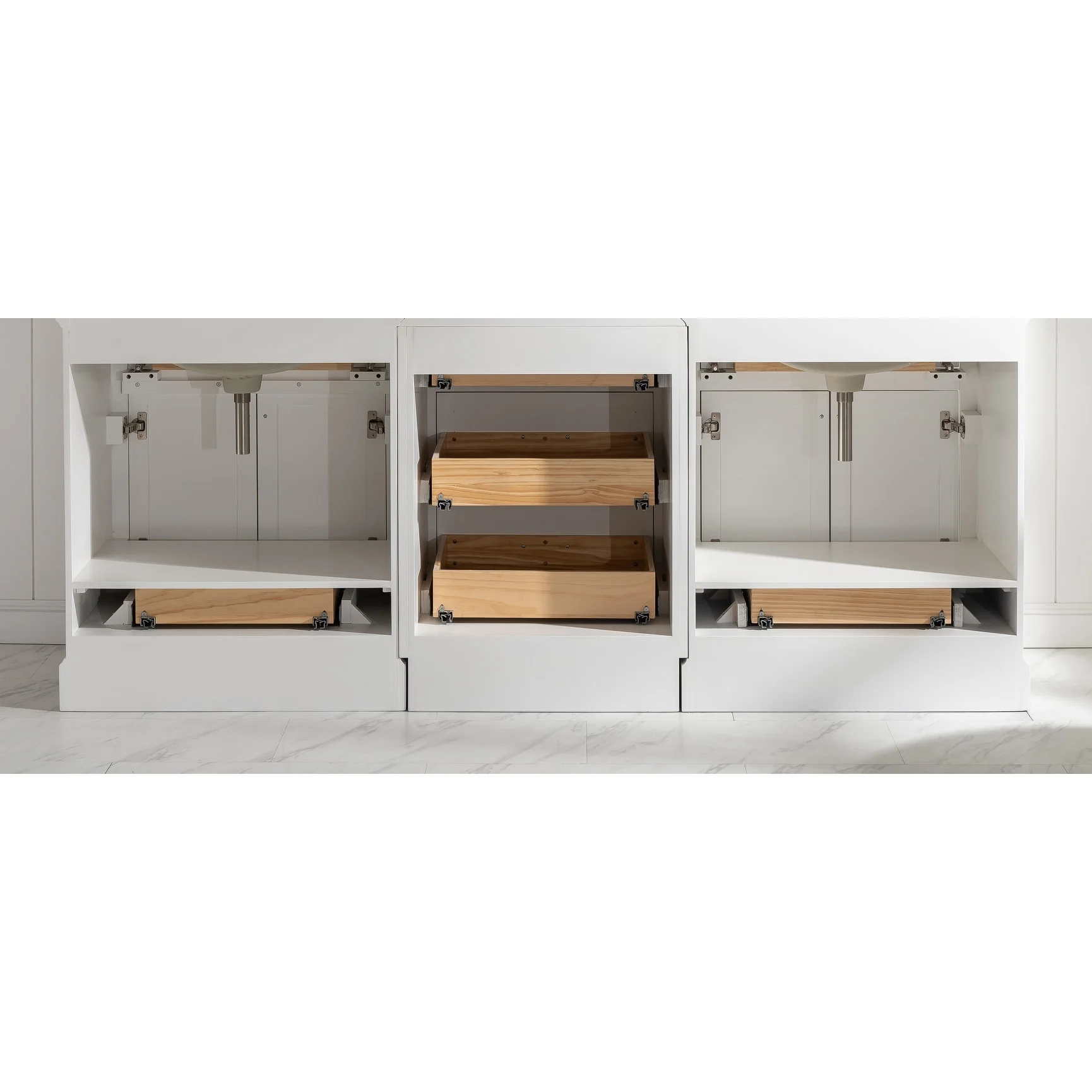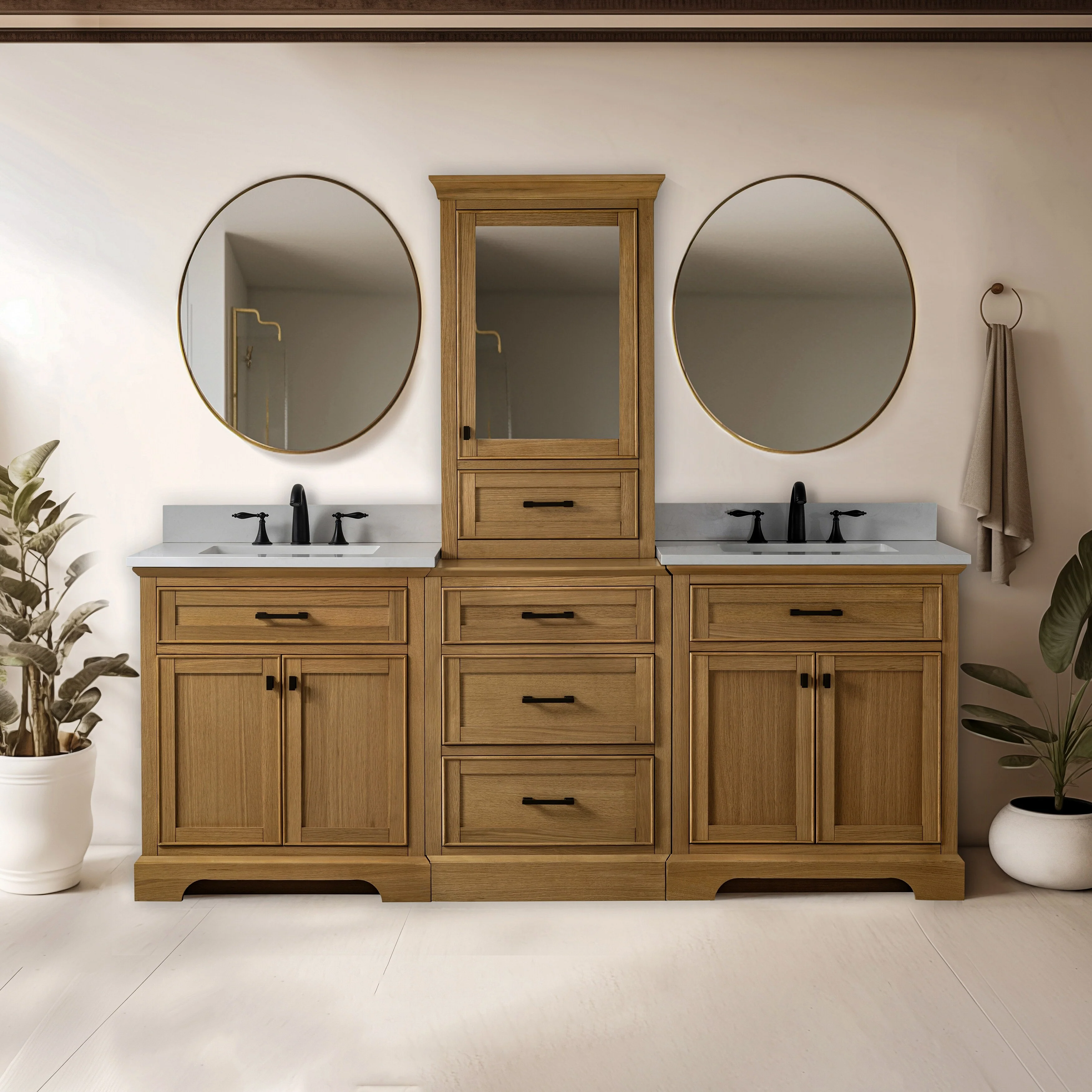 Elevate your bathroom decor with the Milano 84' Double Sink Bathroom Vanity Modular Set by Design Element. Crafted with solid birch hardwood, this elegant modular set features two single vanities, a draw unit, and a tower cabinet. The 1-inch thick white quartz countertop and backsplash provide ample space for your toiletries while the soft-closing drawers and doors ensure quiet operation. The brushed nickel finish hardware adds a touch of sophistication, and the porcelain undermount sinks come with an overflow. With dovetail joint drawer construction and a multi-layer paint finish, this vanity set is both beautiful and durable. Faucets, mirrors, and drains are not included.