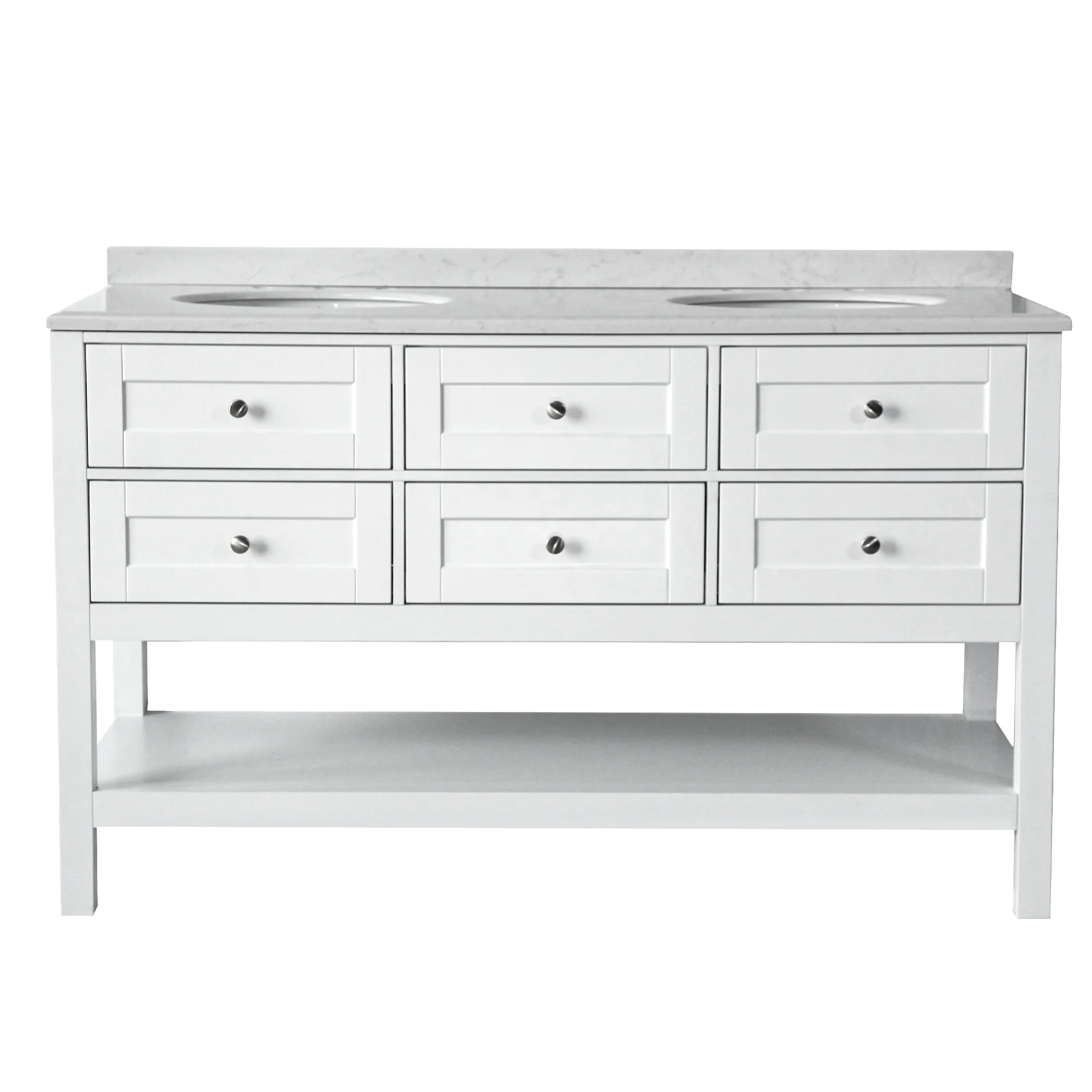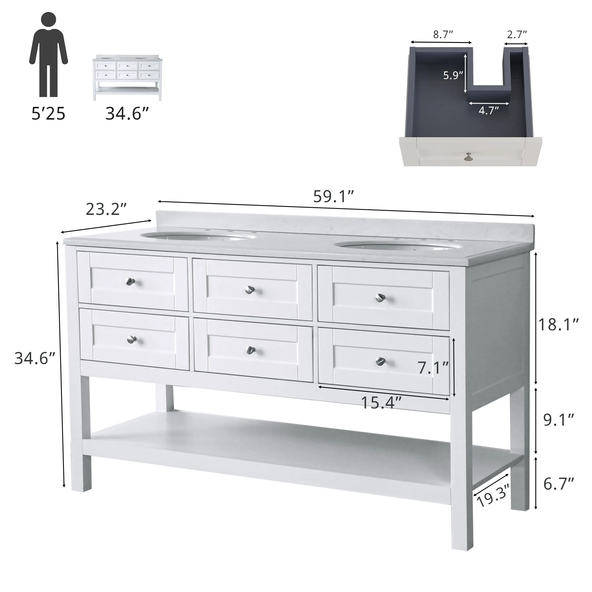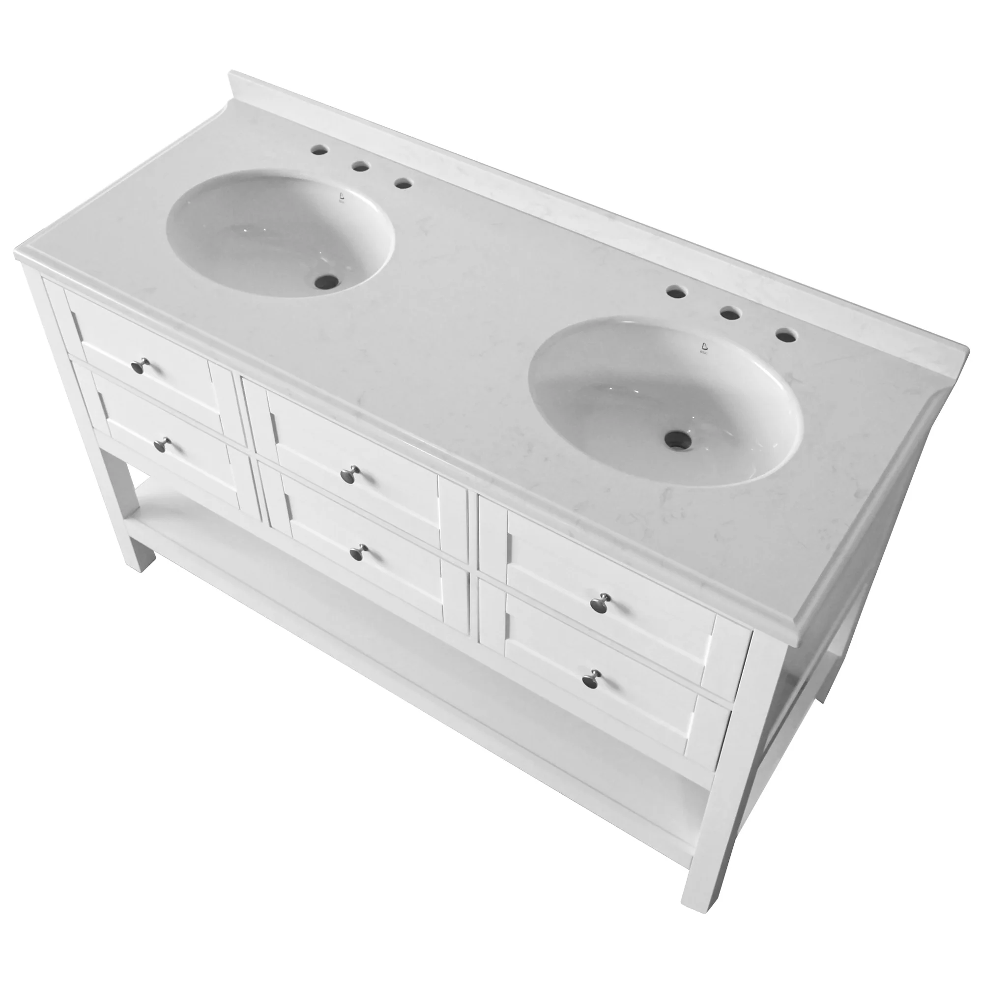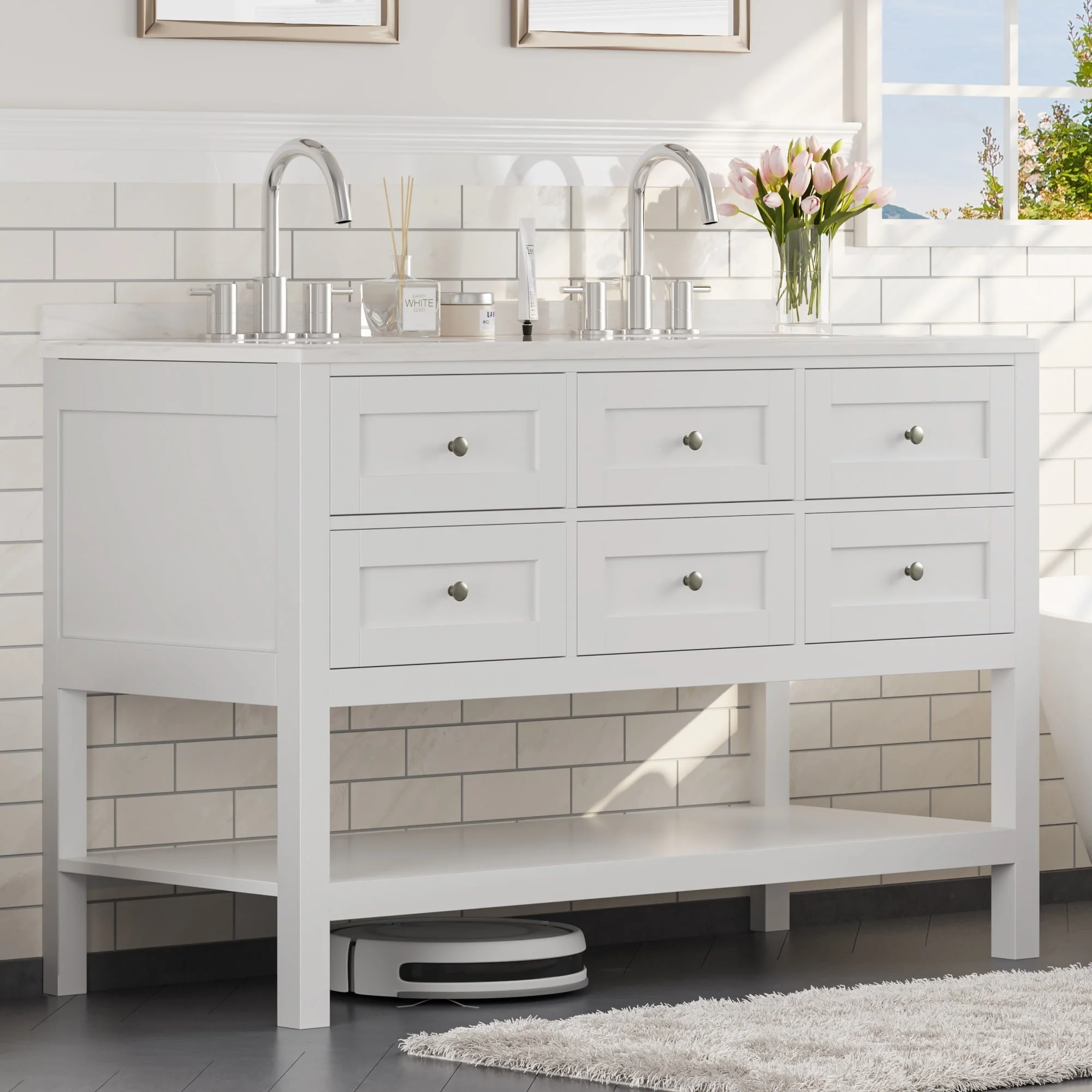 This 59' double bathroom vanity set has a slatted design and a crisp white engineered marble surface that adds coastal style to your main bathroom. Three drawers with sleek handrails open up to reveal space for makeup, jewelry, and other toiletries. Plus, the slatted open shelf on this vanity is ideal for holding bath towels and facecloths. Lend an eye-catching focal point to your bathroom base while increasing storage space with this stylish double vanity set. Crafted from a multilayer board, the base is stable and durable. Up top, the marble countertop includes a backsplash and two integrated sinks with three holes each for pairing with fitting faucets of your choice.