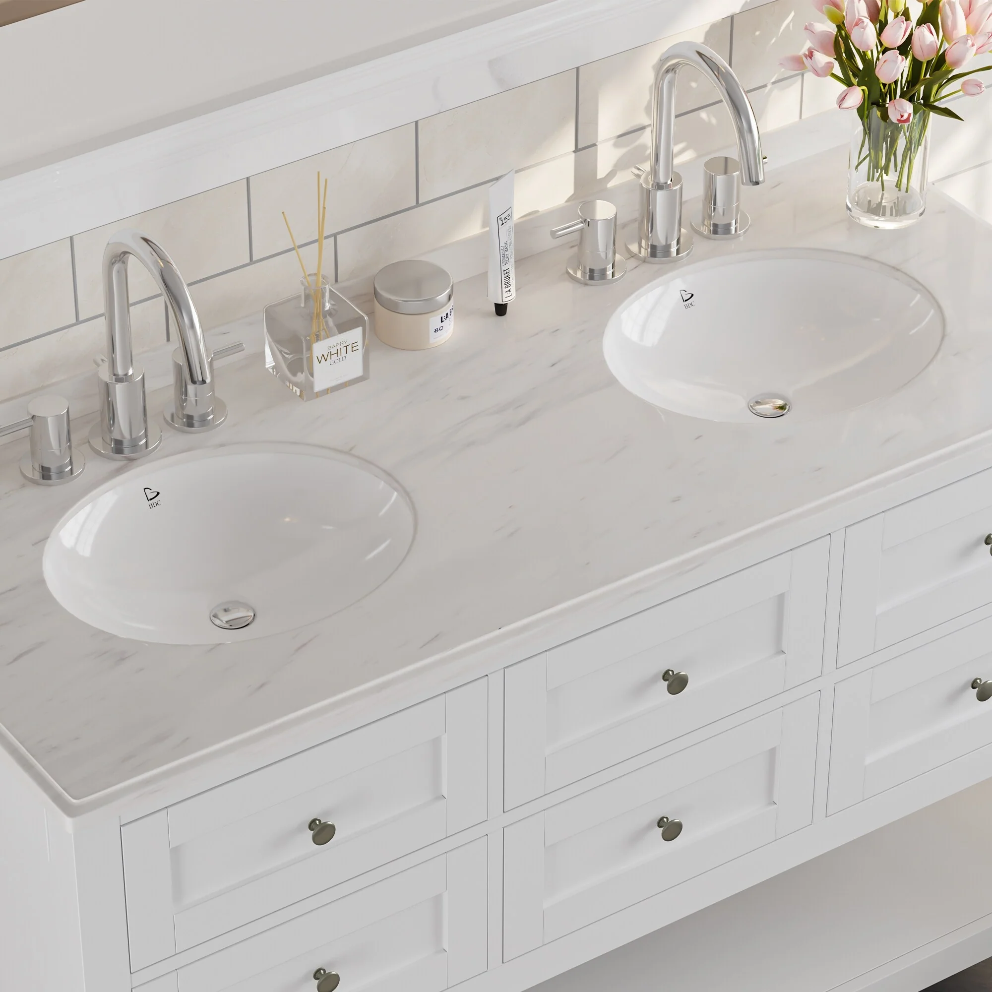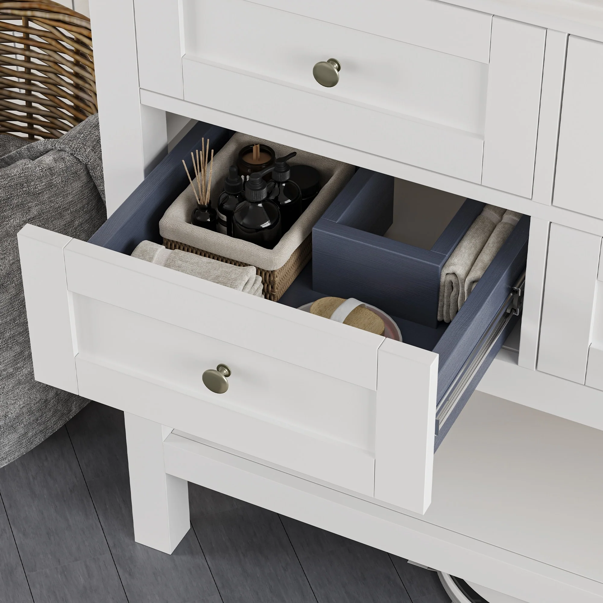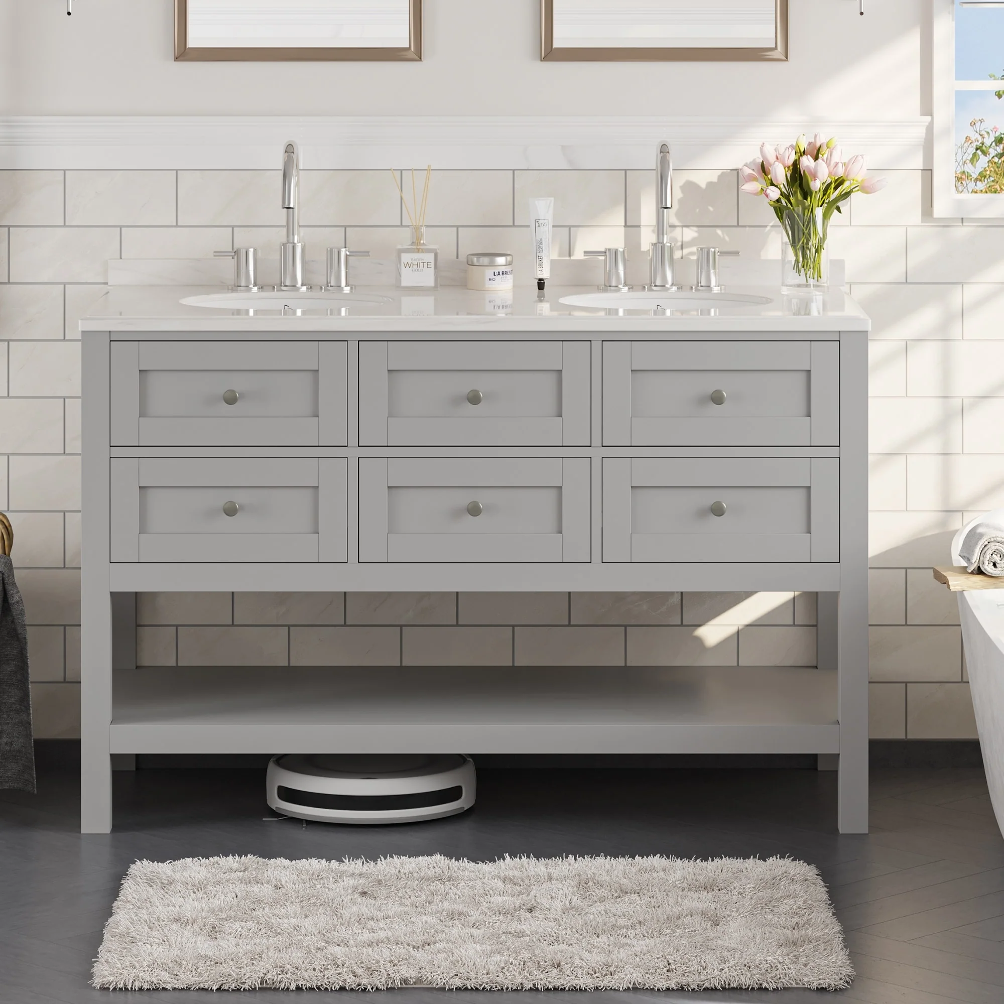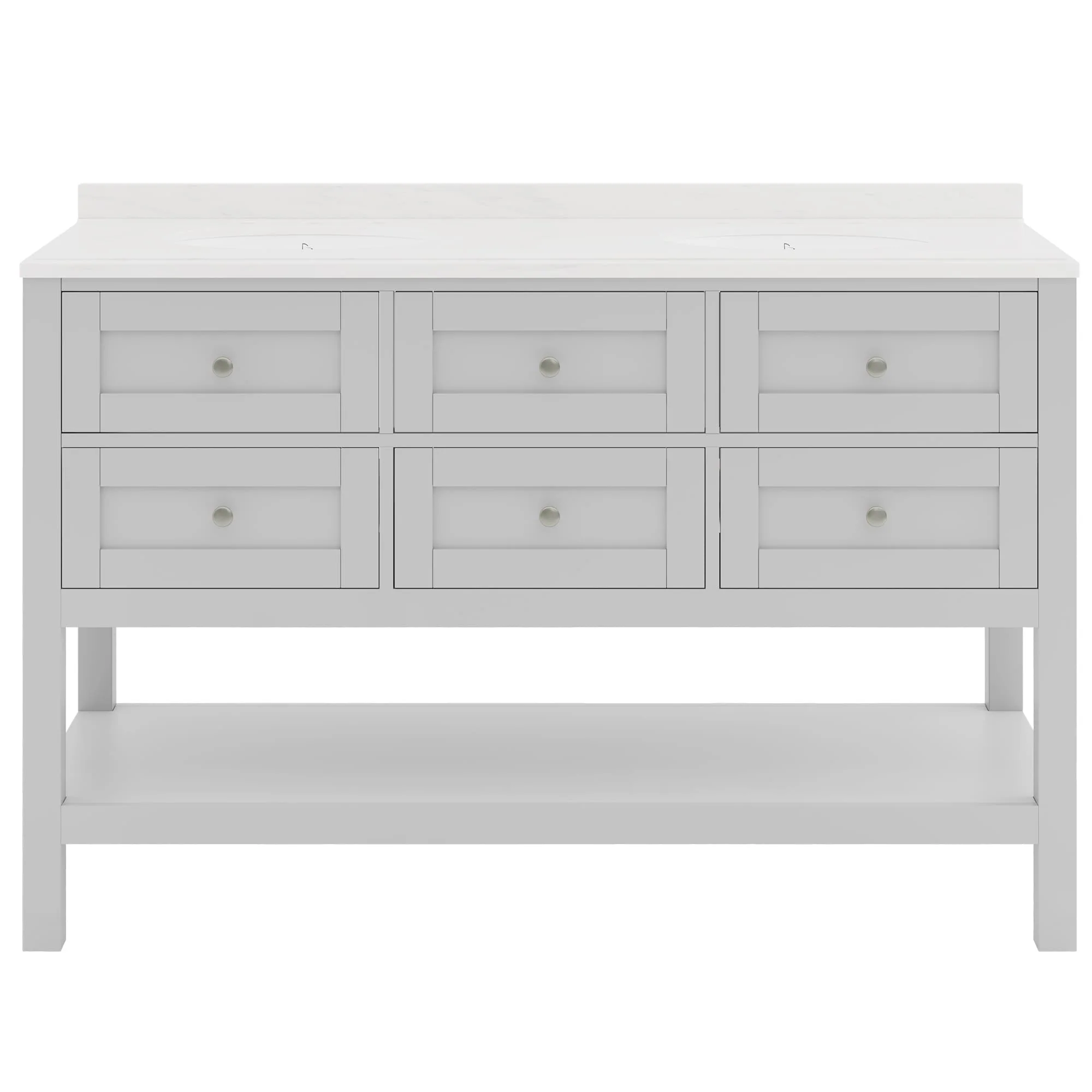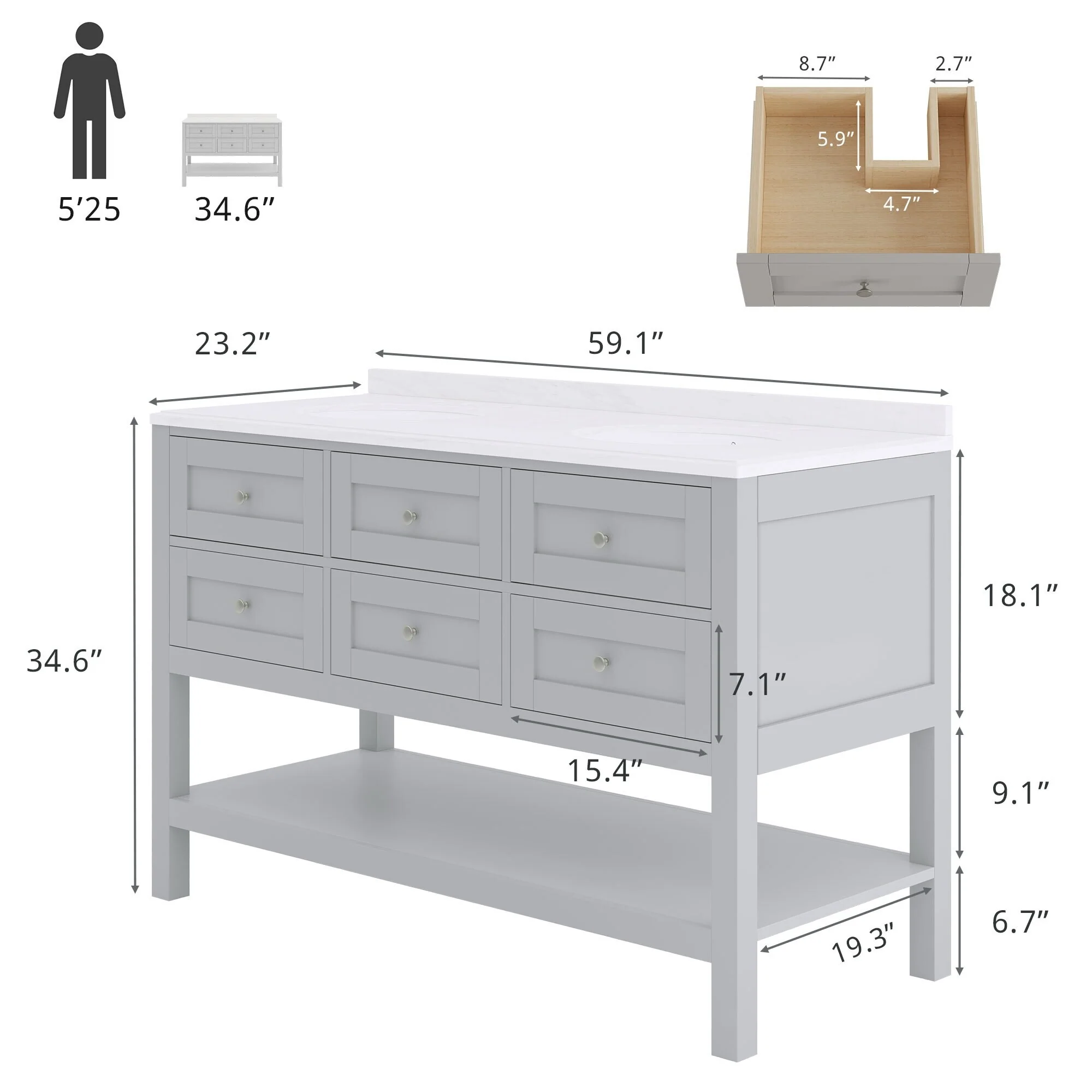 This 59' double bathroom vanity set has a slatted design and a crisp white engineered marble surface that adds coastal style to your main bathroom. Three drawers with sleek handrails open up to reveal space for makeup, jewelry, and other toiletries. Plus, the slatted open shelf on this vanity is ideal for holding bath towels and facecloths. Lend an eye-catching focal point to your bathroom base while increasing storage space with this stylish double vanity set. Crafted from a multilayer board, the base is stable and durable. Up top, the marble countertop includes a backsplash and two integrated sinks with three holes each for pairing with fitting faucets of your choice.