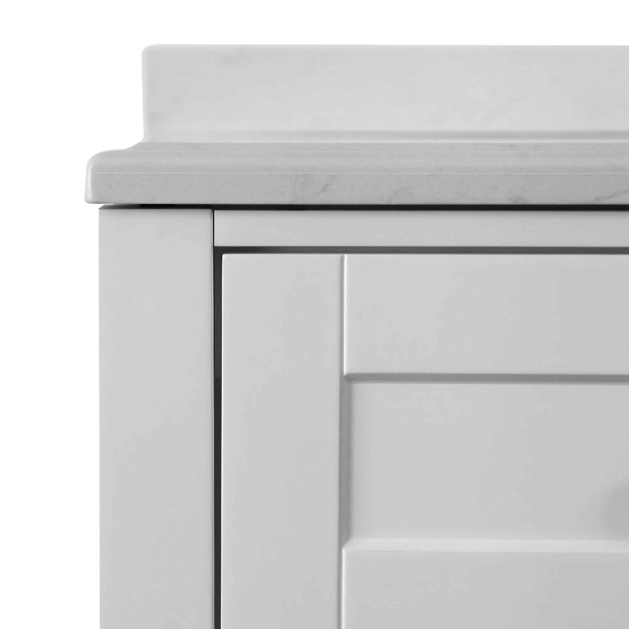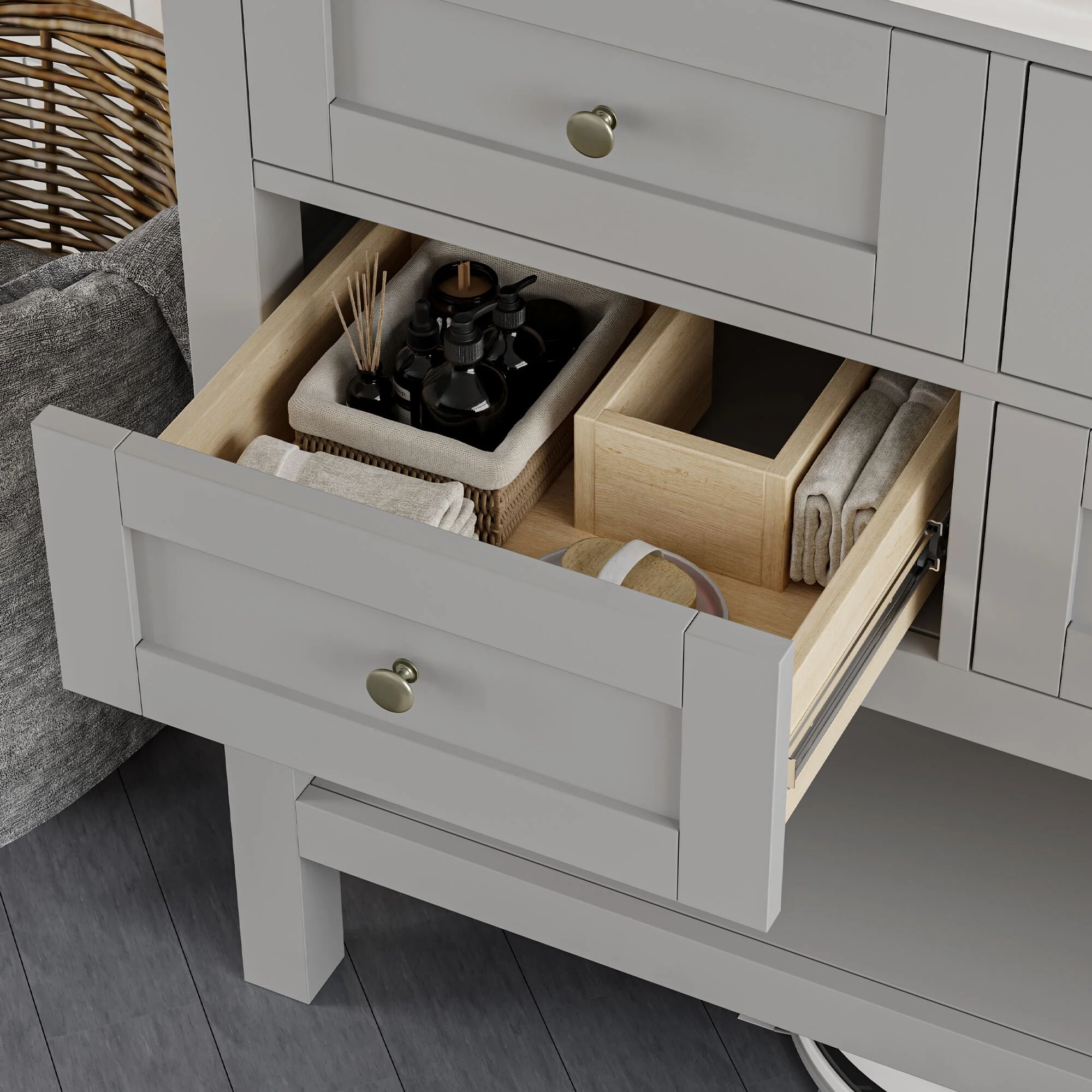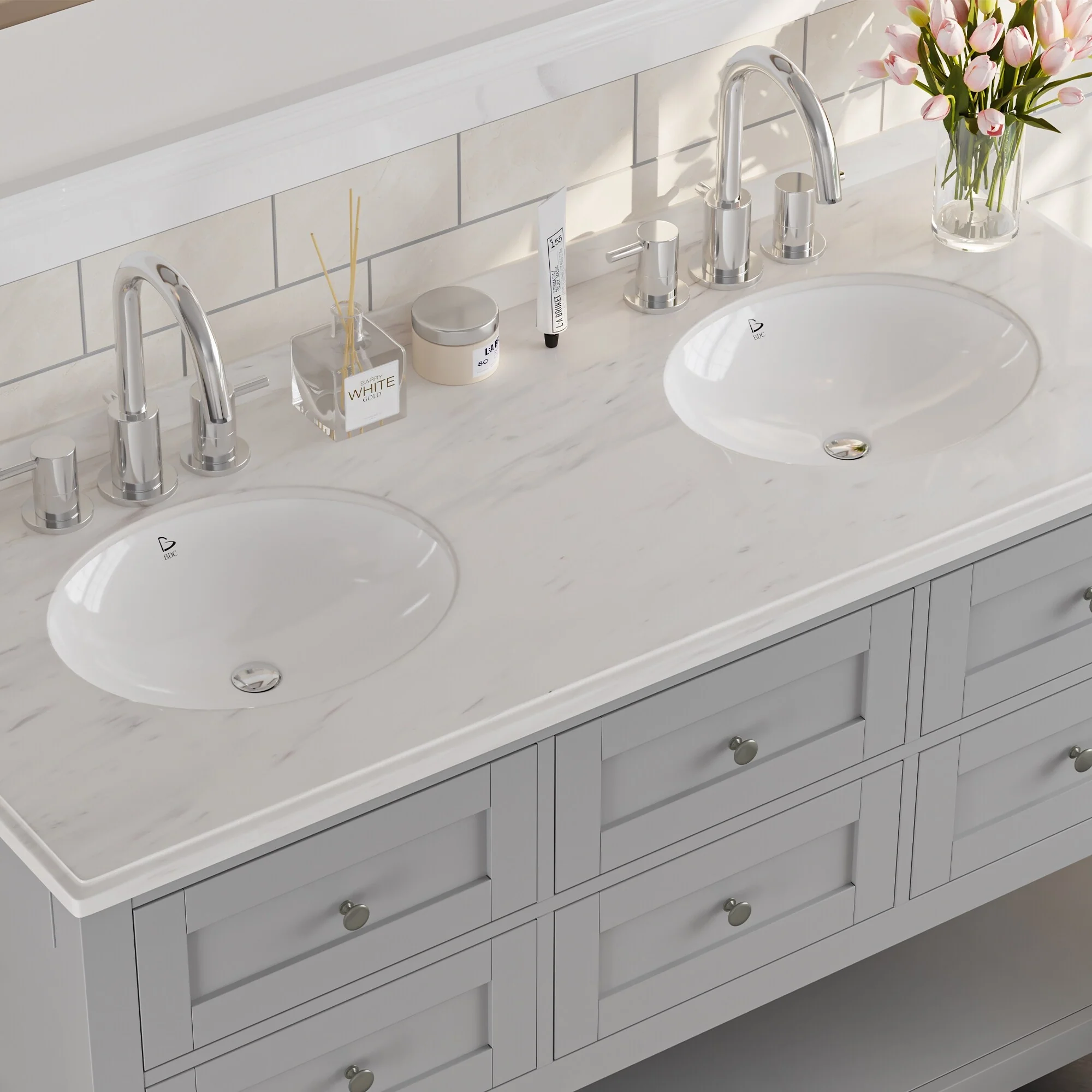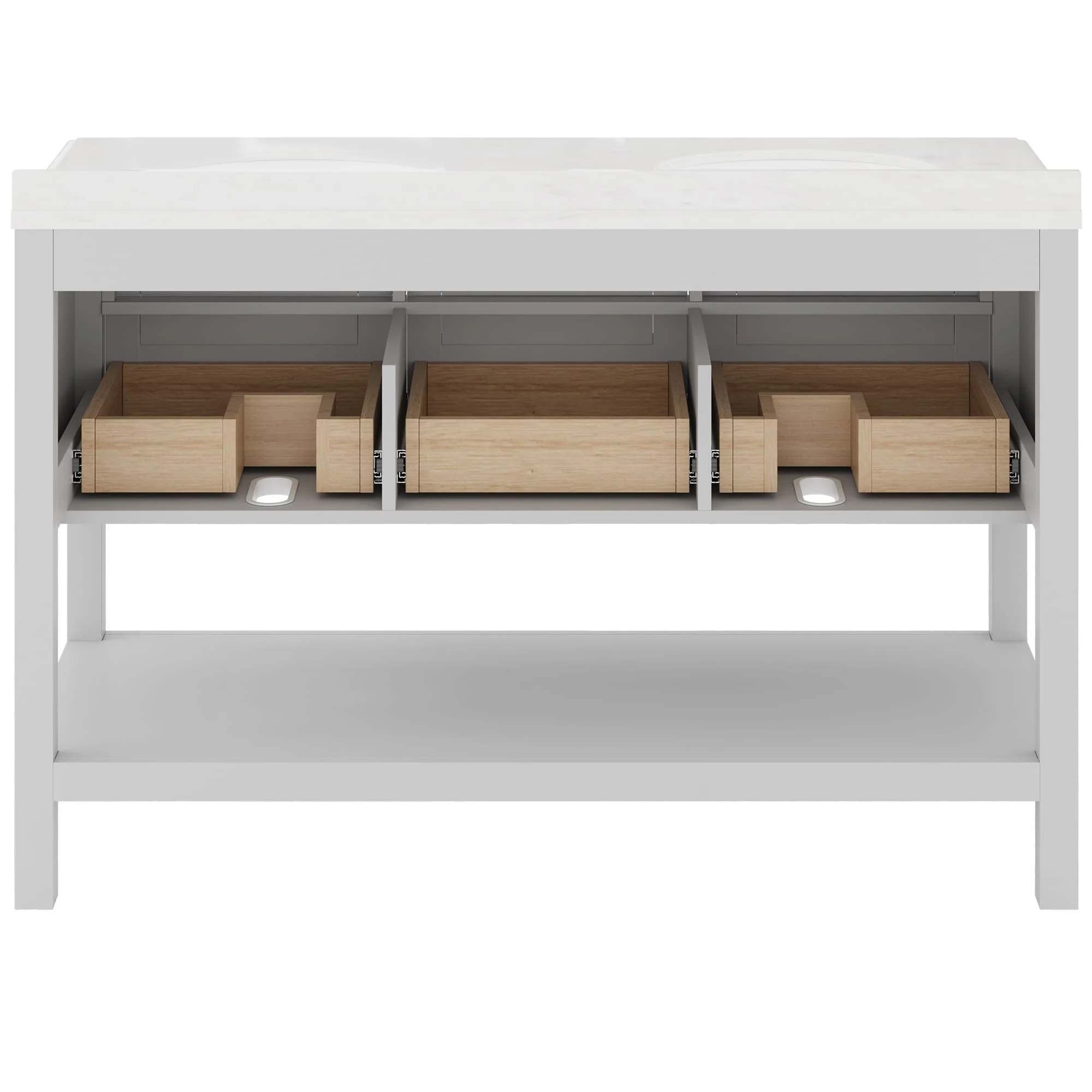 This 59' double bathroom vanity set has a slatted design and a crisp white engineered marble surface that adds coastal style to your main bathroom. Three drawers with sleek handrails open up to reveal space for makeup, jewelry, and other toiletries. Plus, the slatted open shelf on this vanity is ideal for holding bath towels and facecloths. Lend an eye-catching focal point to your bathroom base while increasing storage space with this stylish double vanity set. Crafted from a multilayer board, the base is stable and durable. Up top, the marble countertop includes a backsplash and two integrated sinks with three holes each for pairing with fitting faucets of your choice.