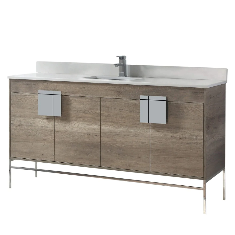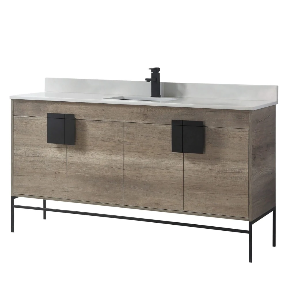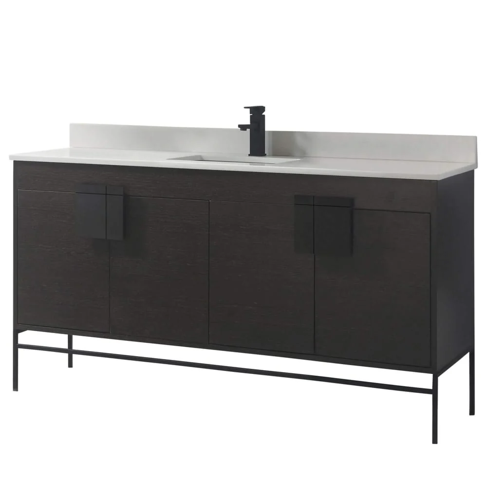 Introducing our newest collection, inspired by postmodernism and featuring smoked oak and smooth metals. This Modern Bathroom Vanity Set boasts a thick wood frame and upgraded finishes, giving it a bespoke quality. The cube-like structure is enhanced by a clever fold-over illusion and designed square metal that blends symmetry and functionality seamlessly. Recessed grooves in the hardware double as segmented openings, revealing roomy storage space, while soft-close doors and hand-cut hardware add to the overall durability. Available in an extra-large size with dual design and storage, this vanity set is a perfect blend of natural wood grains and modern sleekness.