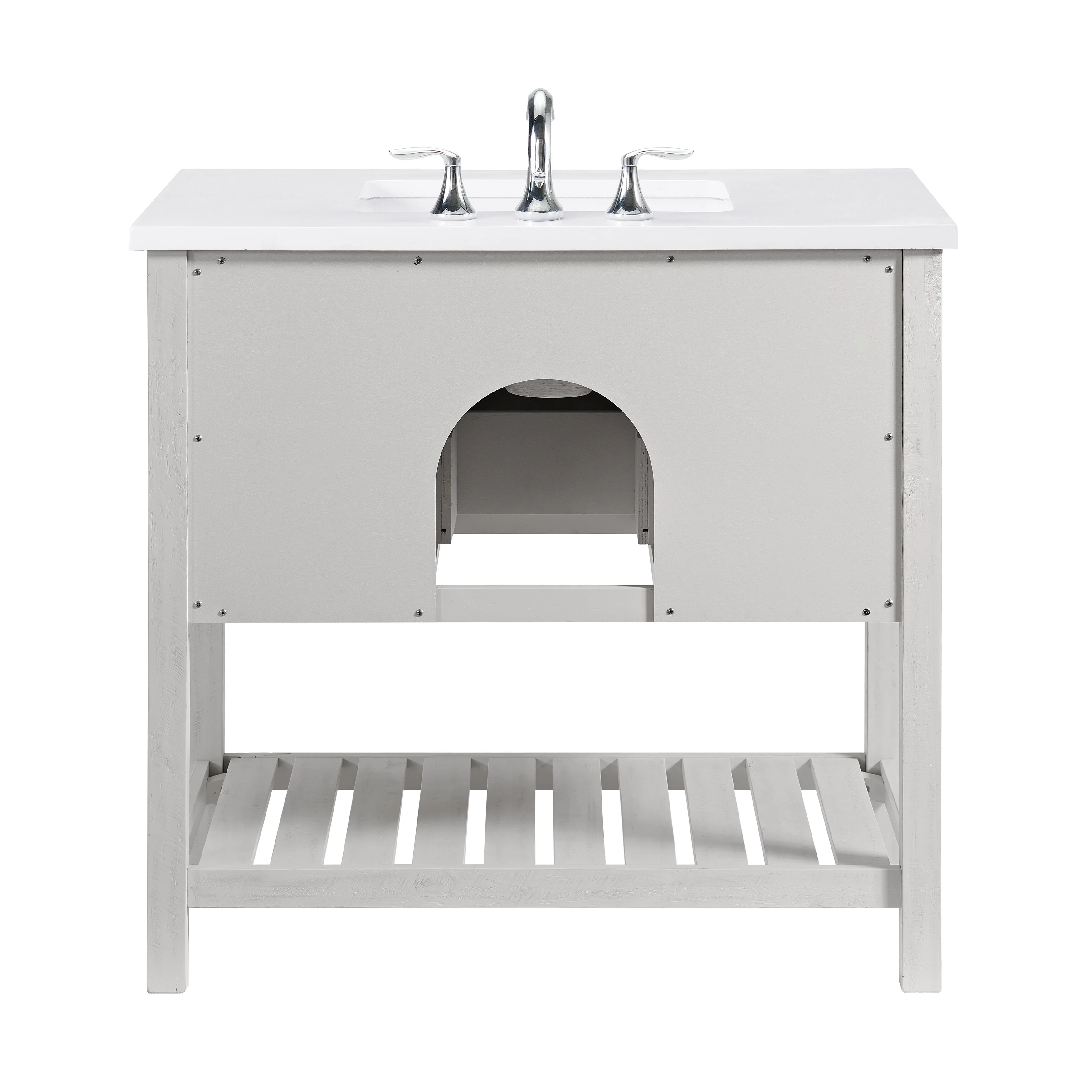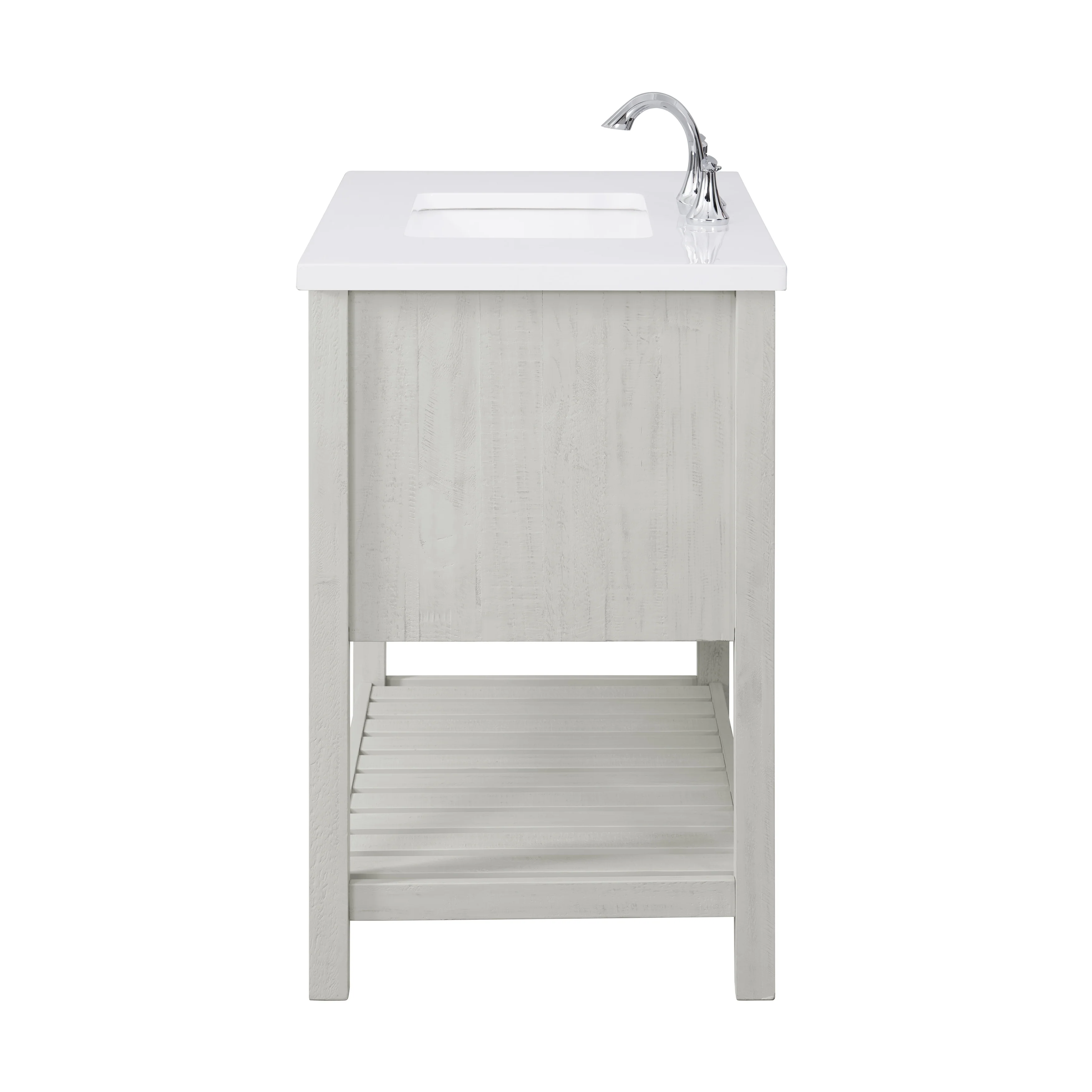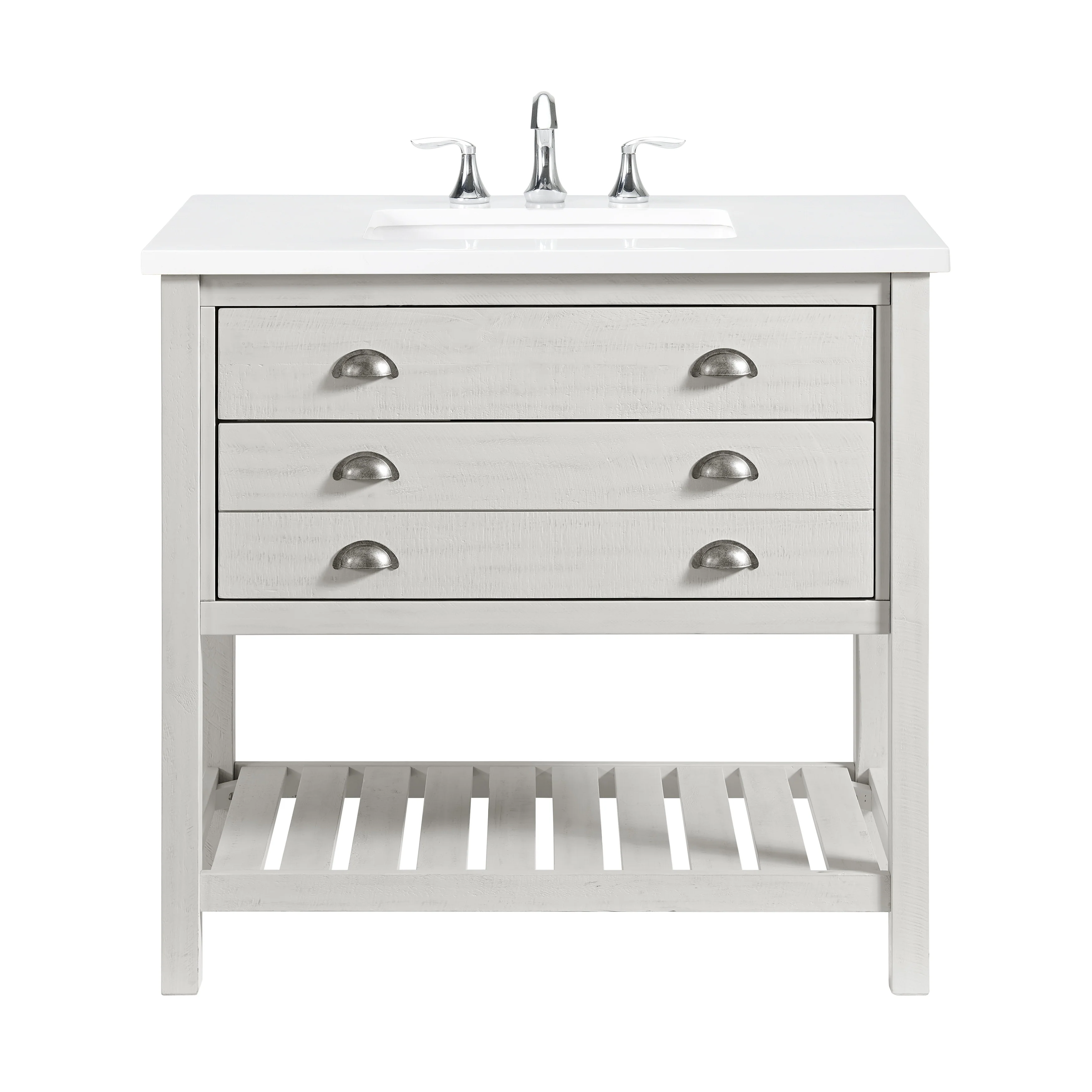Transform your bathroom into a coastal farmhouse oasis with the Monterey 37' single bathroom vanity. Crafted from durable solid pine wood base, this single sink vanity features a solid white cultured marble top with pre-drilled holes for an 8' faucet (faucet not included). One nicely sized split drawer and a top tilt down drawer offer plenty of storage space for toiletries. A bottom slat shelf provides additional storage space for towels, linens, and other items.