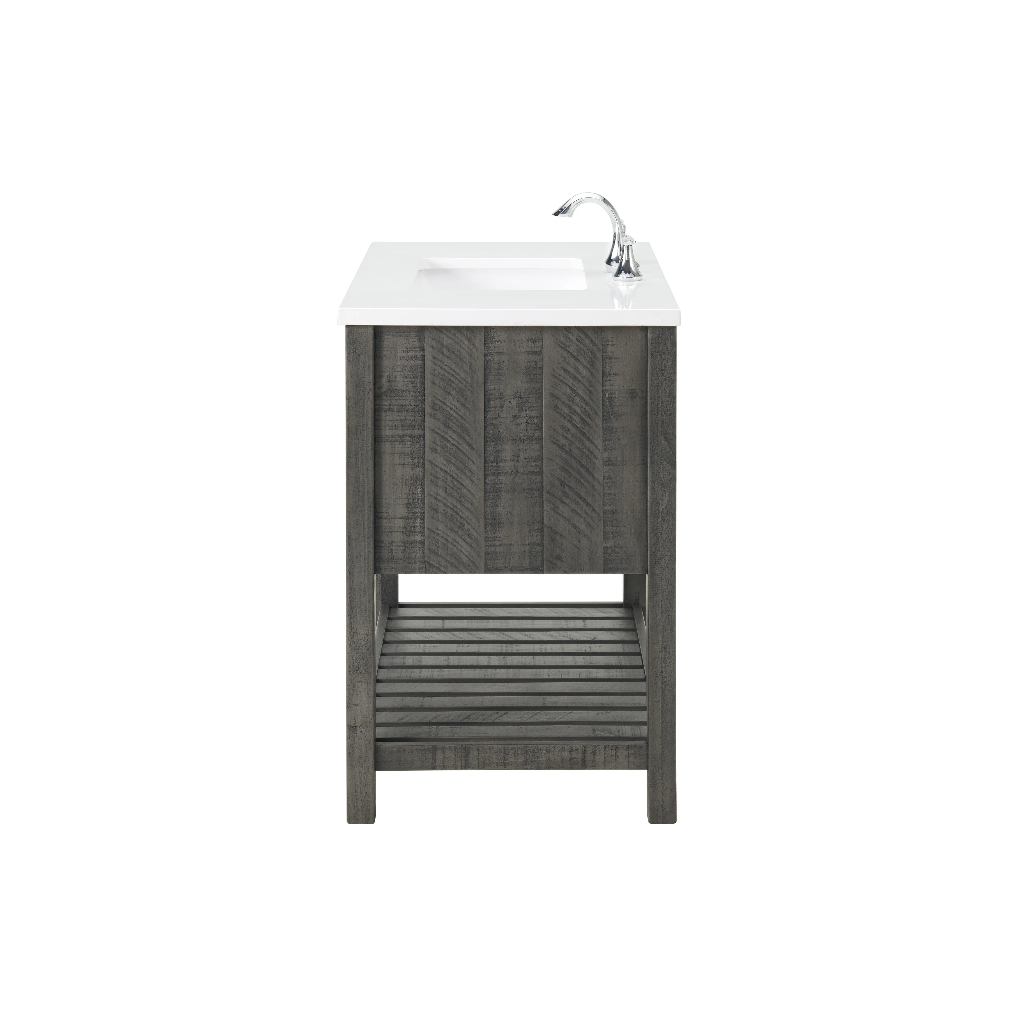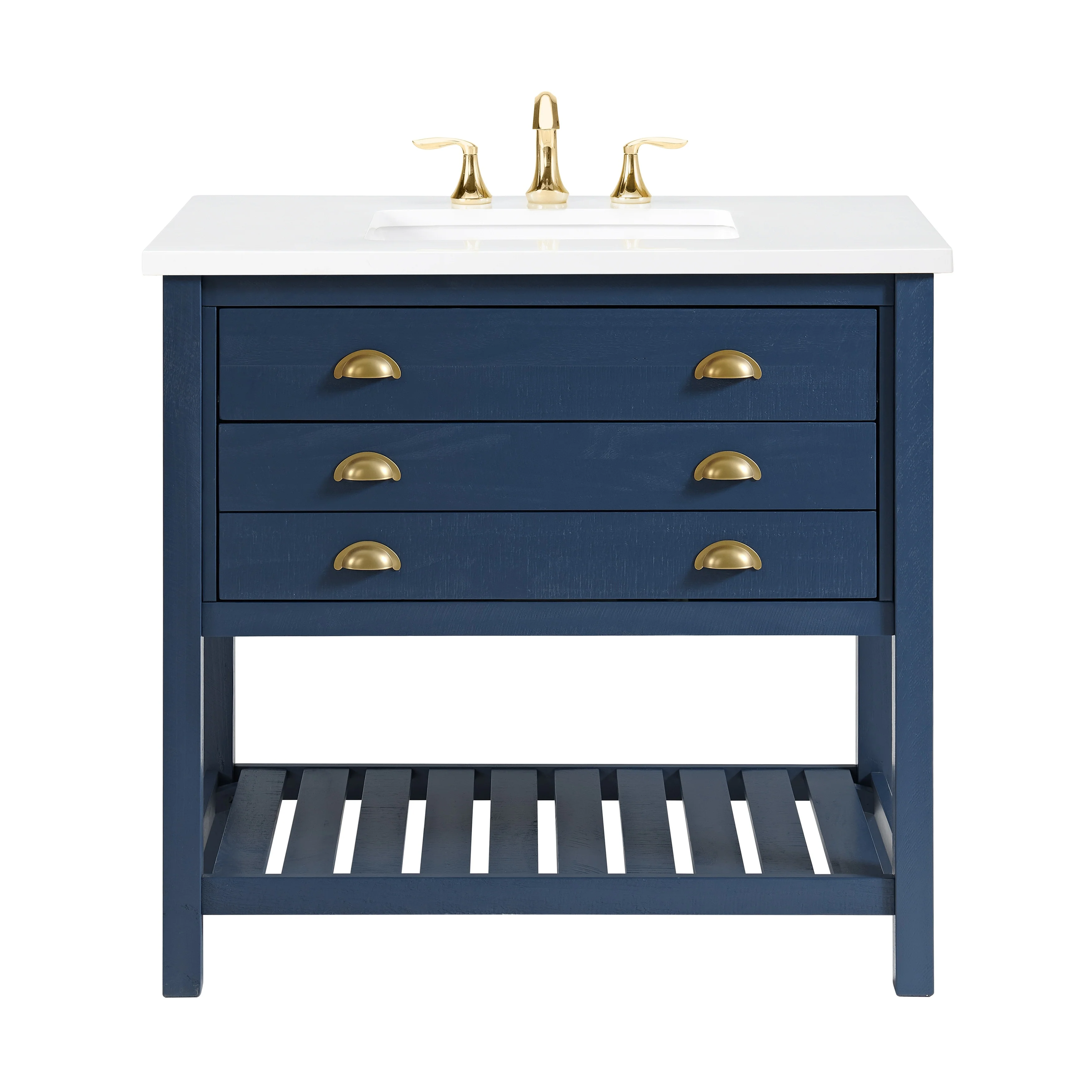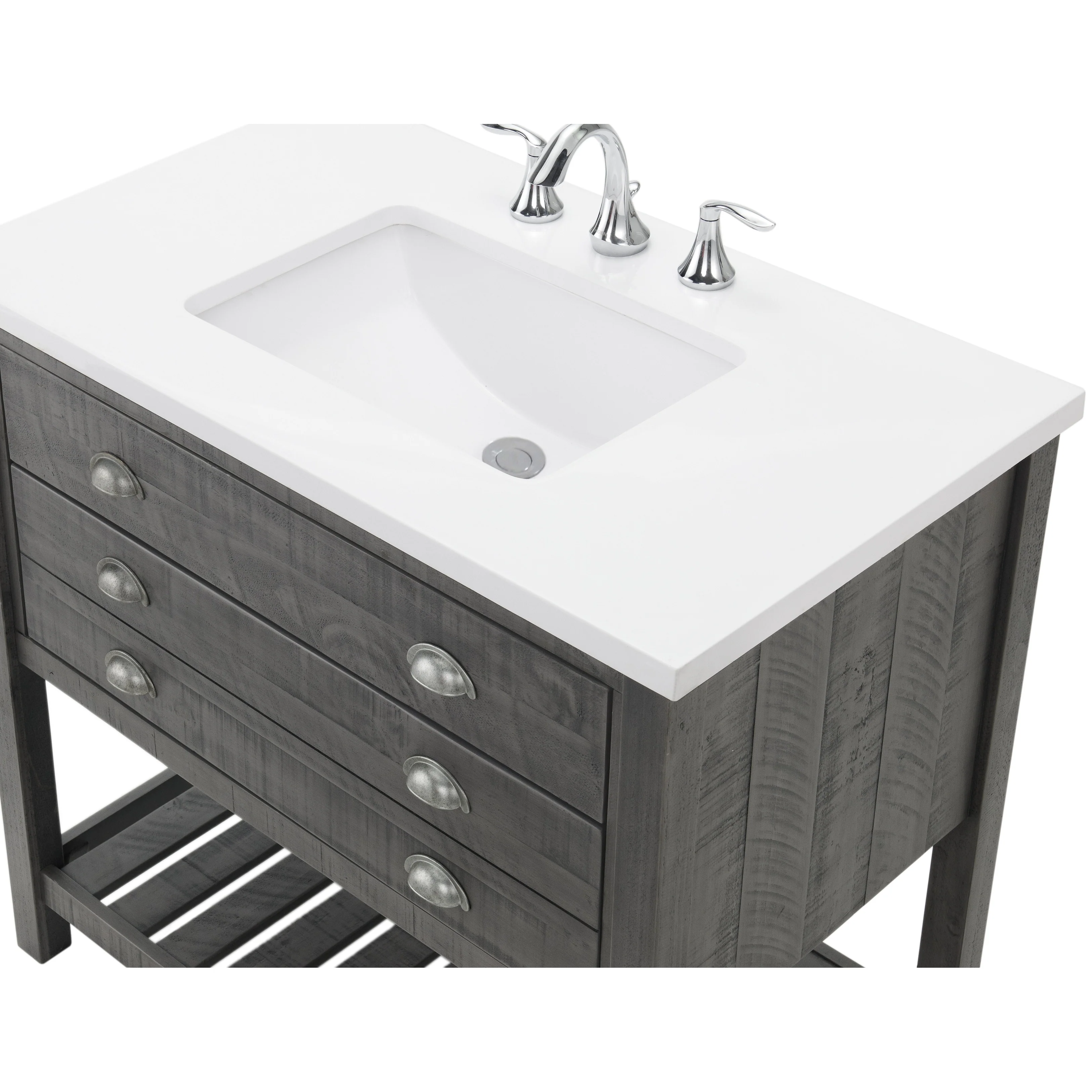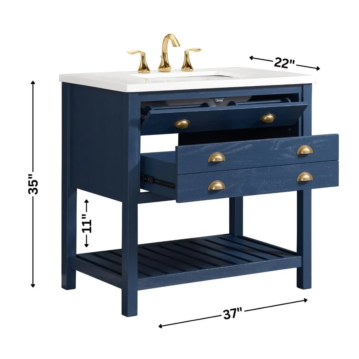 Transform your bathroom into a coastal farmhouse oasis with the Monterey 37' single bathroom vanity. Crafted from durable solid pine wood base, this single sink vanity features a solid white cultured marble top with pre-drilled holes for an 8' faucet (faucet not included). One nicely sized split drawer and a top tilt down drawer offer plenty of storage space for toiletries. A bottom slat shelf provides additional storage space for towels, linens, and other items.