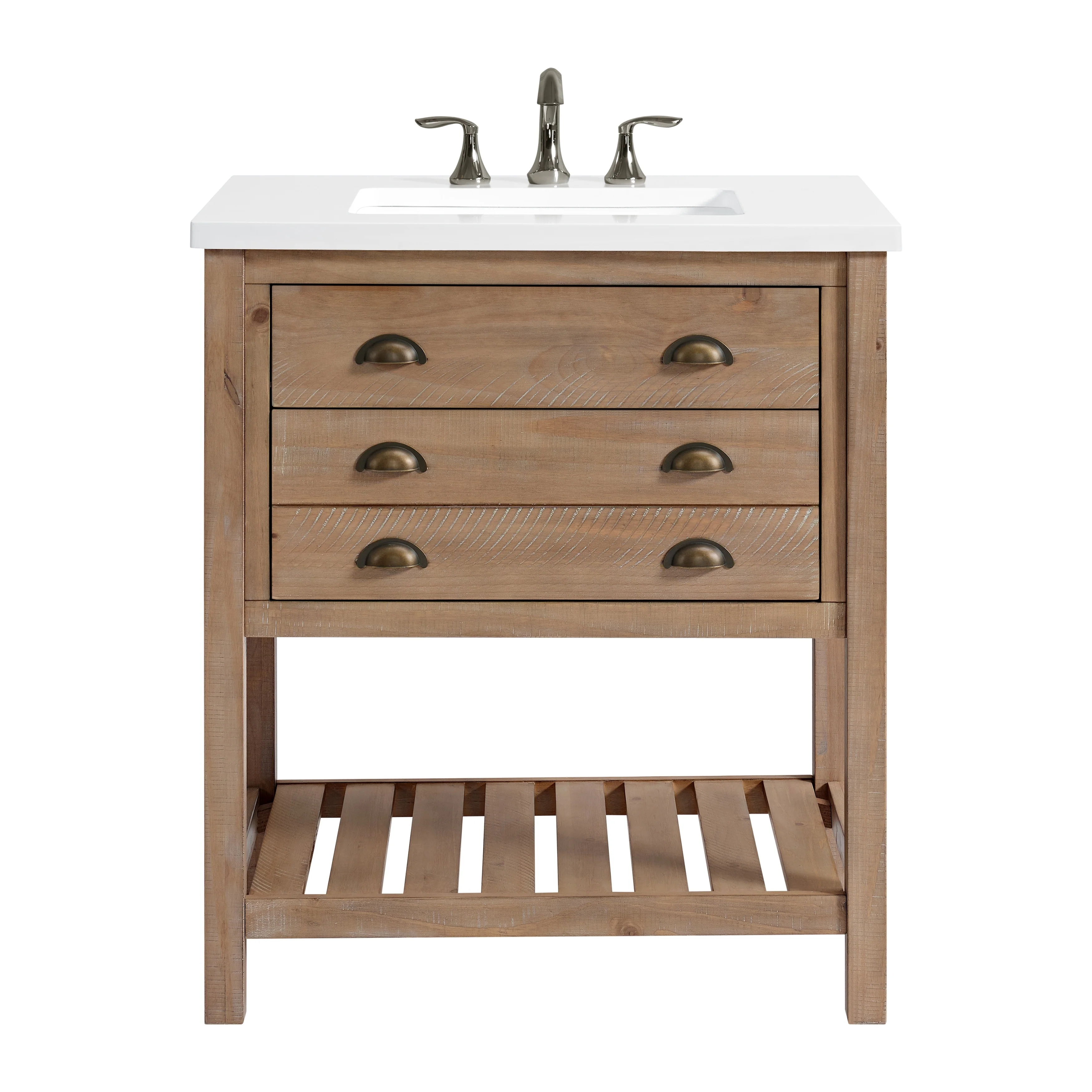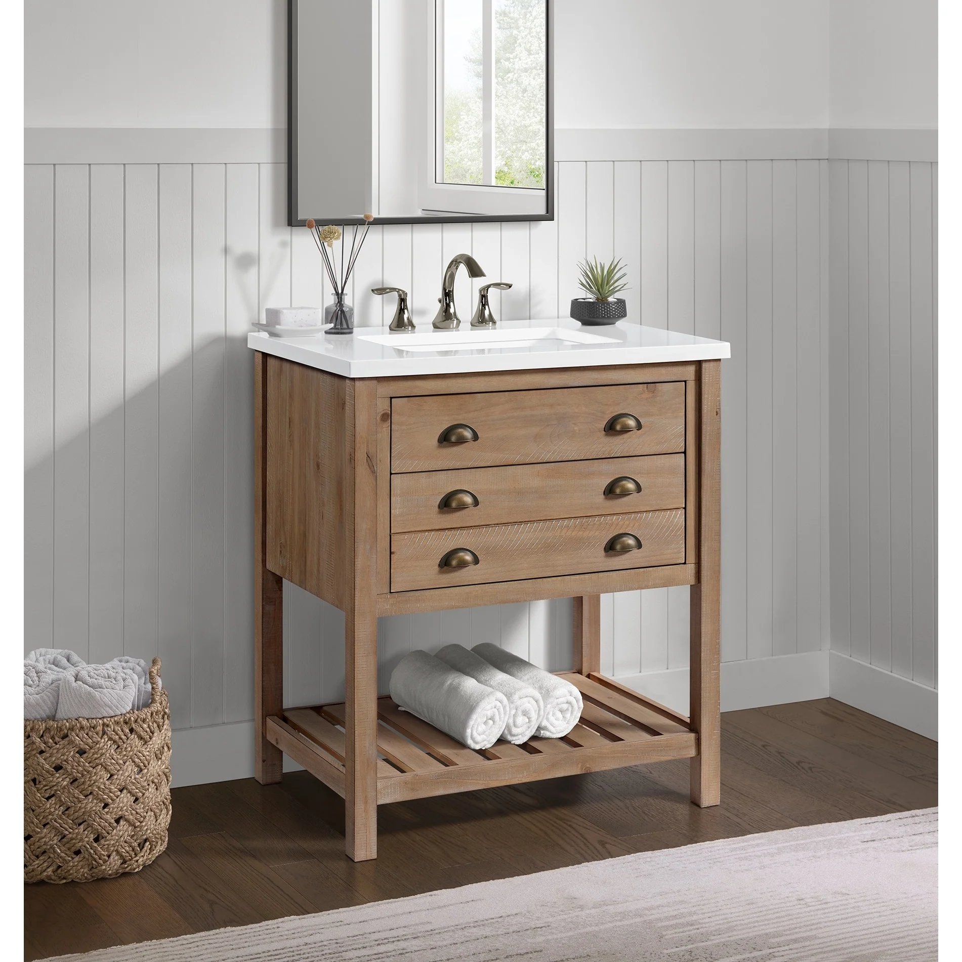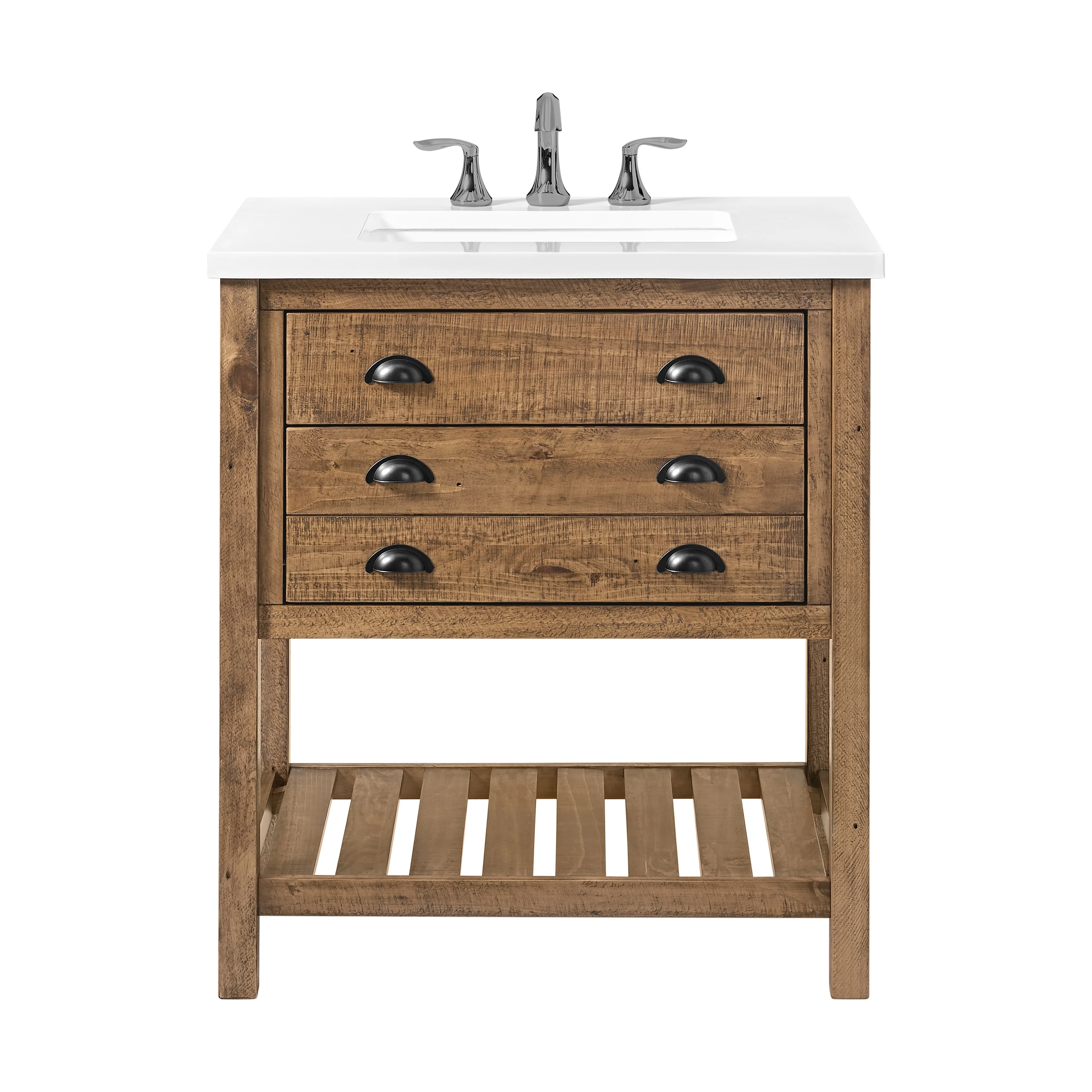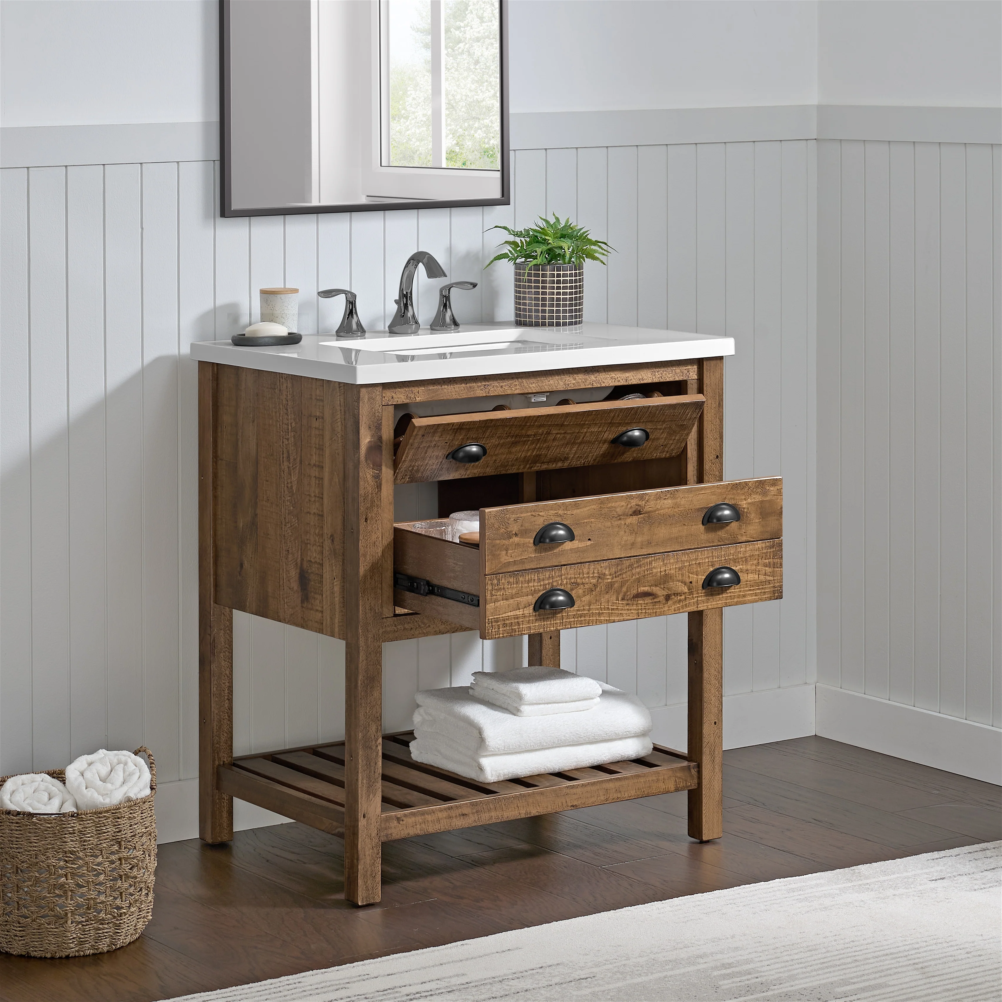 Upgrade your bathroom to a coastal farmhouse look with the Monterey 31-inch wide bathroom vanity. This single sink bathroom vanity features a pine wood base complemented by a solid white cultured marble top. Oil rubbed bronze finished cup pulls on both drawers add an extra dimension to the rustic look. One nicely sized split drawer and a top tilt down drawer offers plenty of storage space for toiletries. A bottom slat shelf offers additional storage space for towels, linens, and other items.