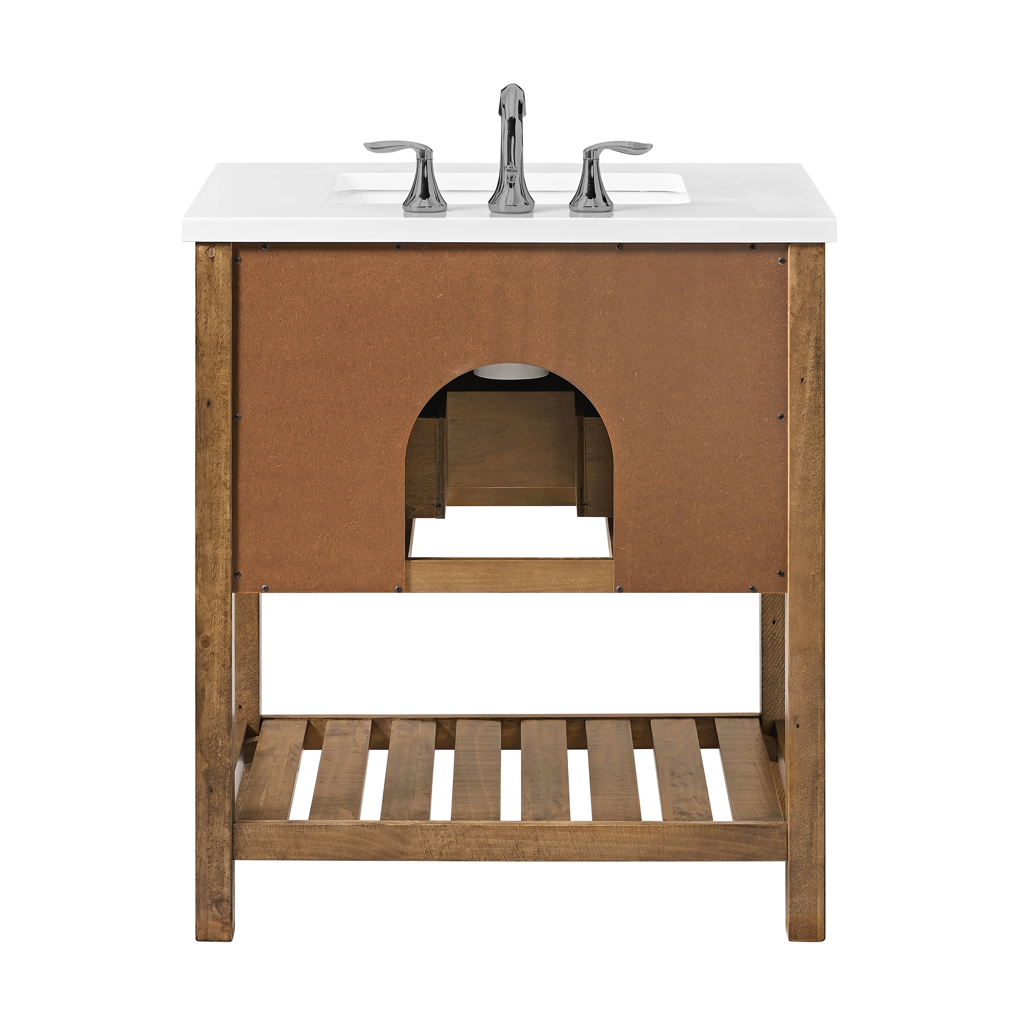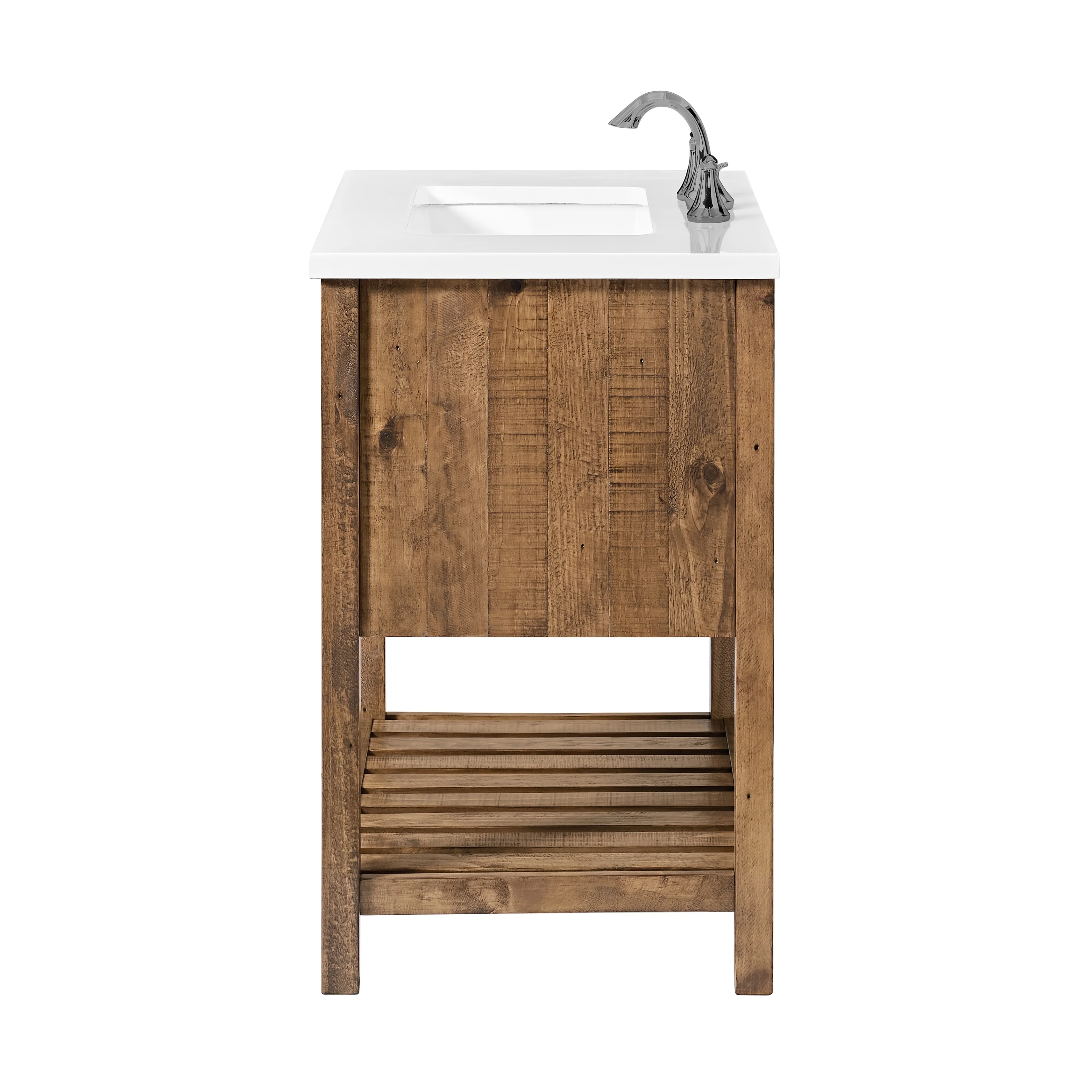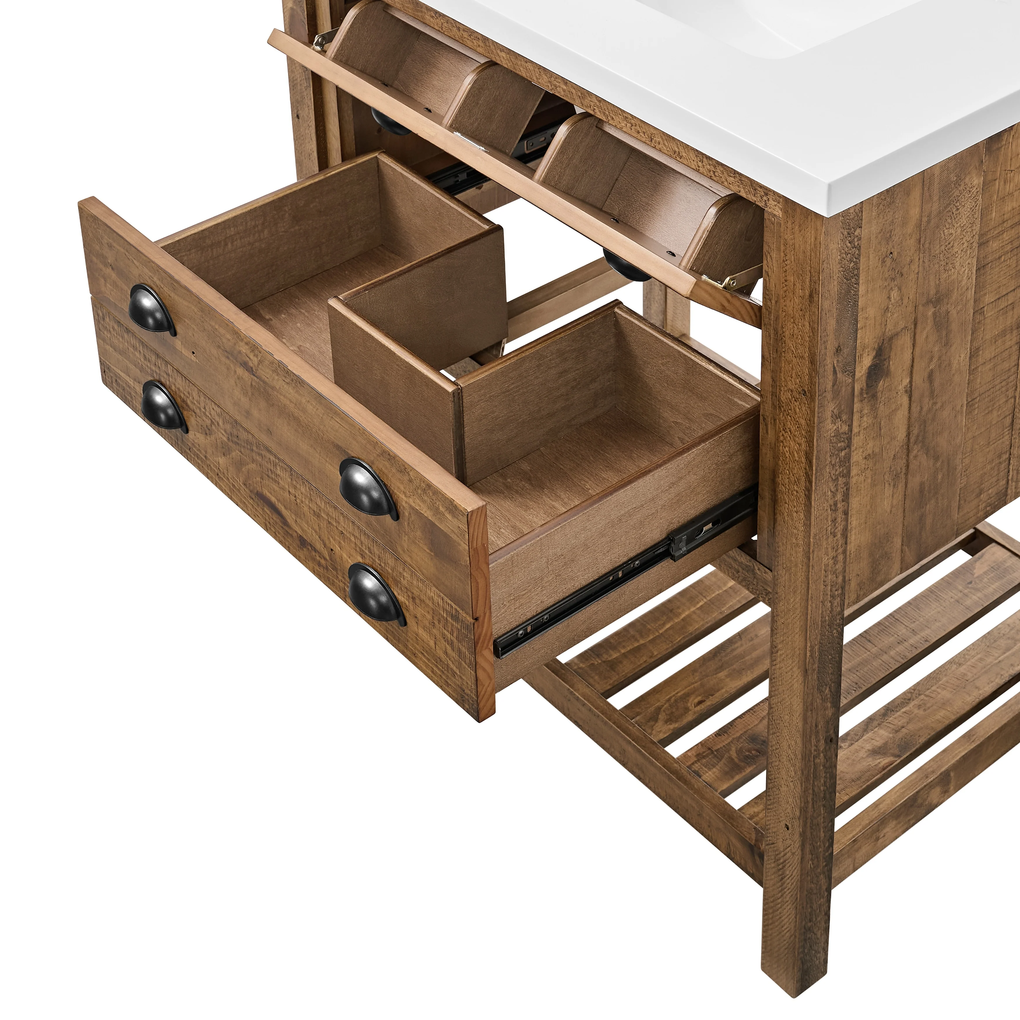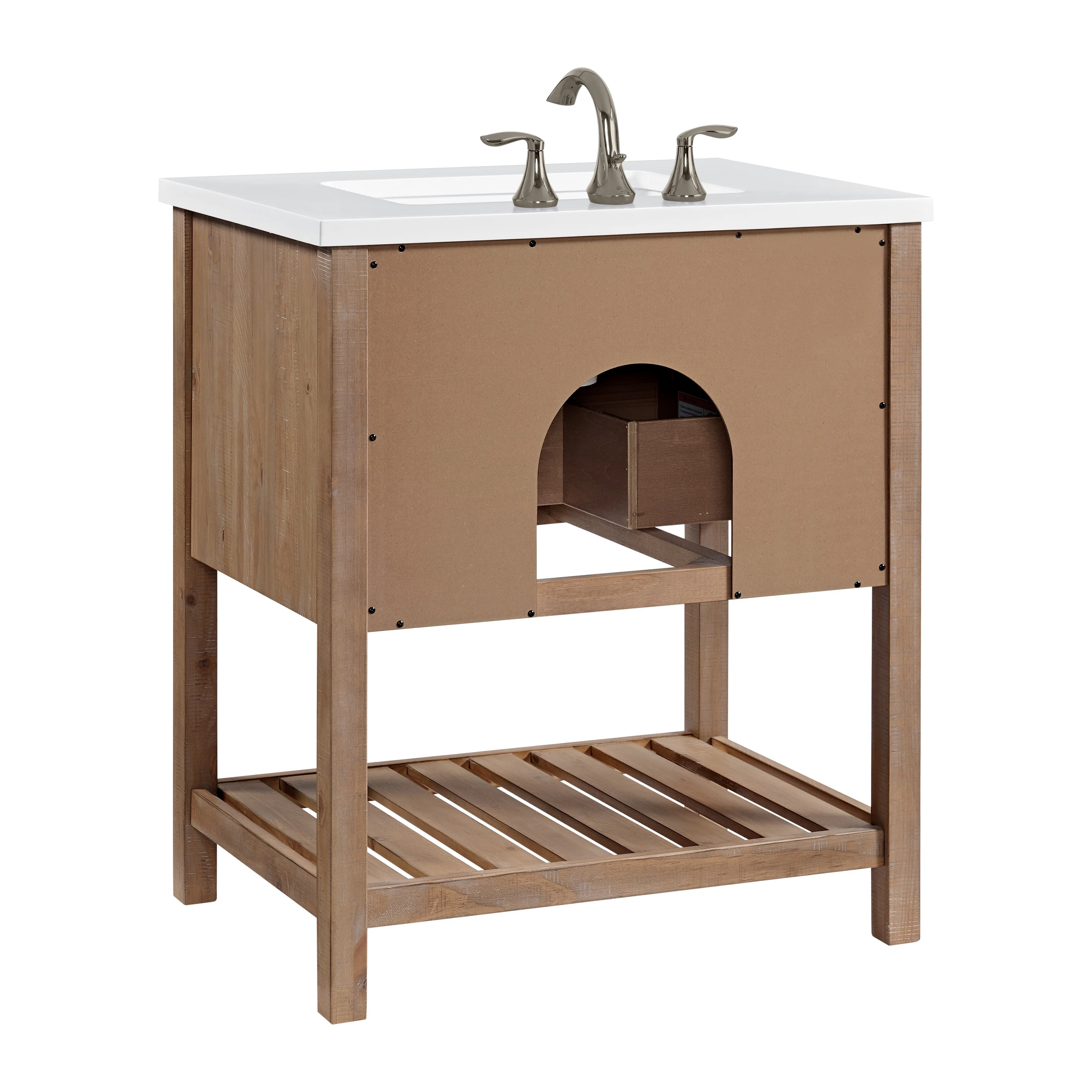 Upgrade your bathroom to a coastal farmhouse look with the Monterey 31-inch wide bathroom vanity. This single sink bathroom vanity features a pine wood base complemented by a solid white cultured marble top. Oil rubbed bronze finished cup pulls on both drawers add an extra dimension to the rustic look. One nicely sized split drawer and a top tilt down drawer offers plenty of storage space for toiletries. A bottom slat shelf offers additional storage space for towels, linens, and other items.