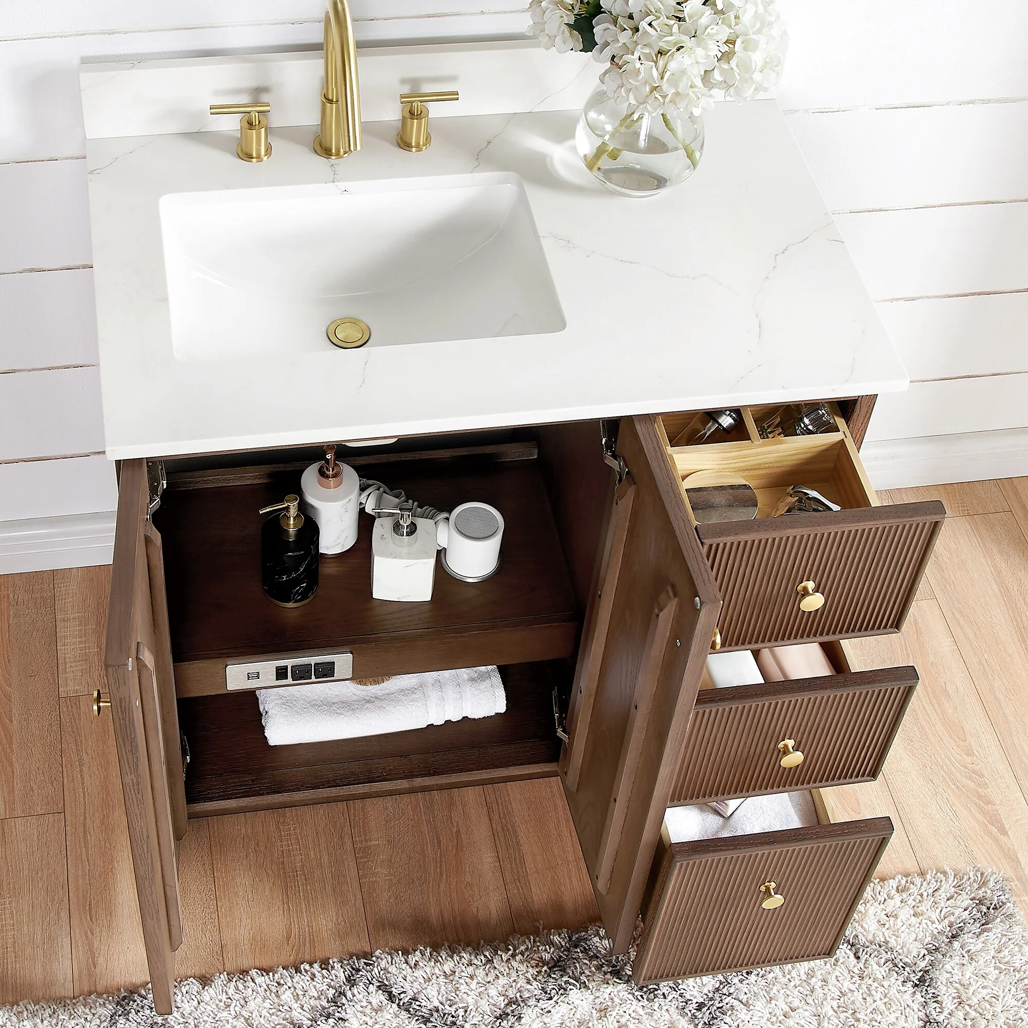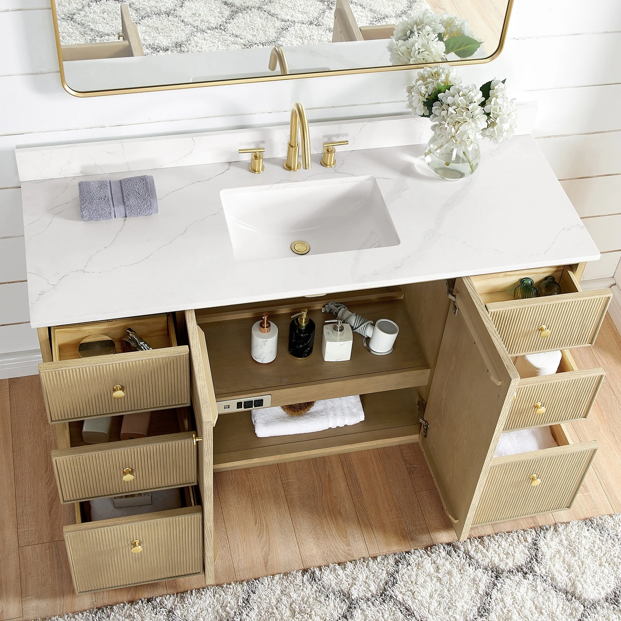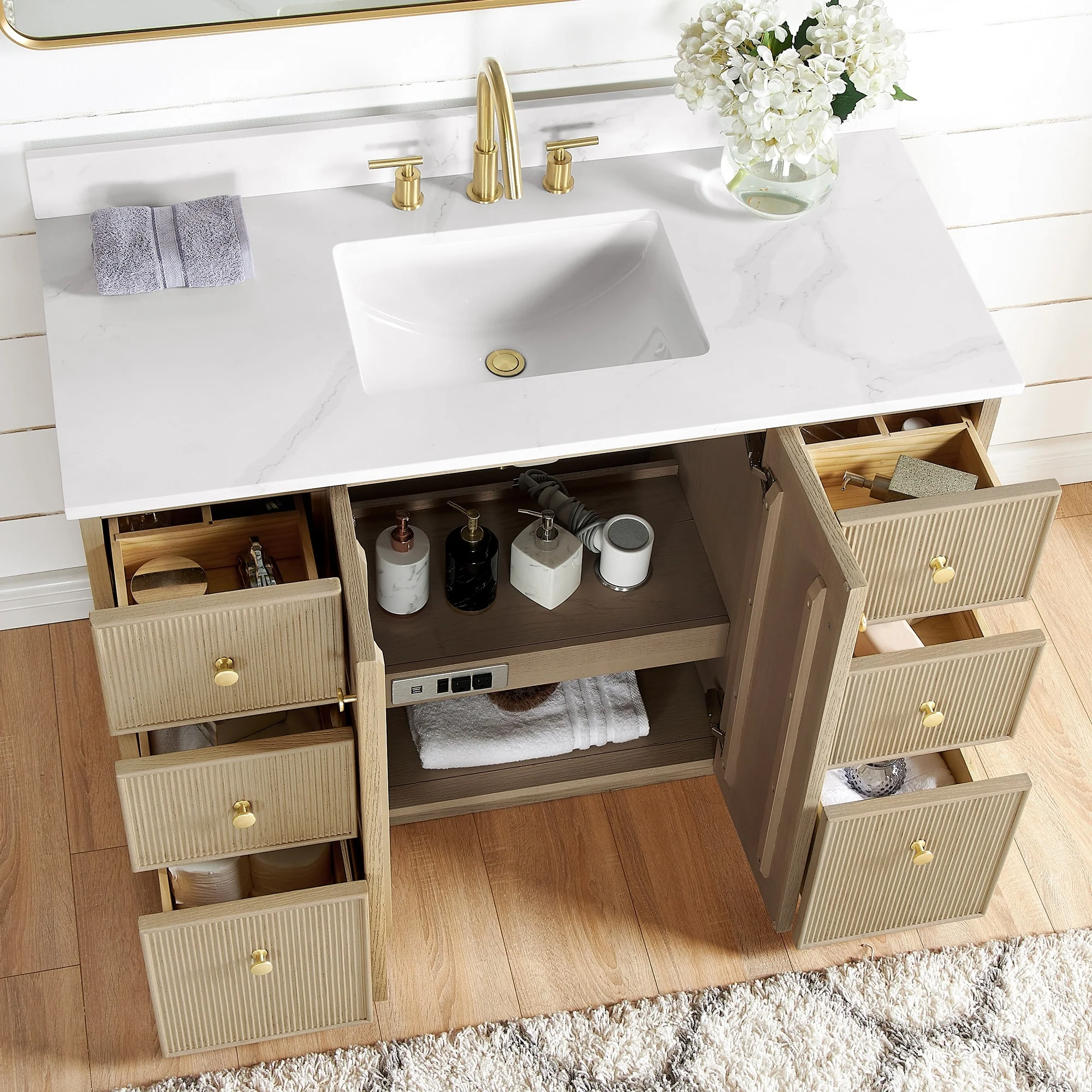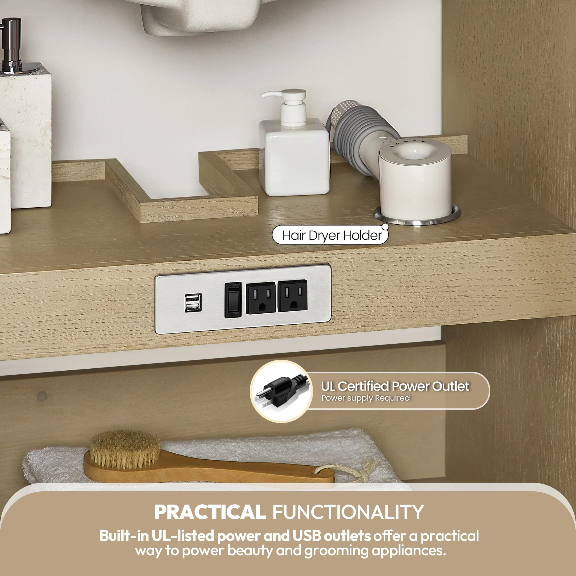 · Practical Functionality: Built-in UL-listed power and USB outlets.Includes convenient hair dryer organizer.