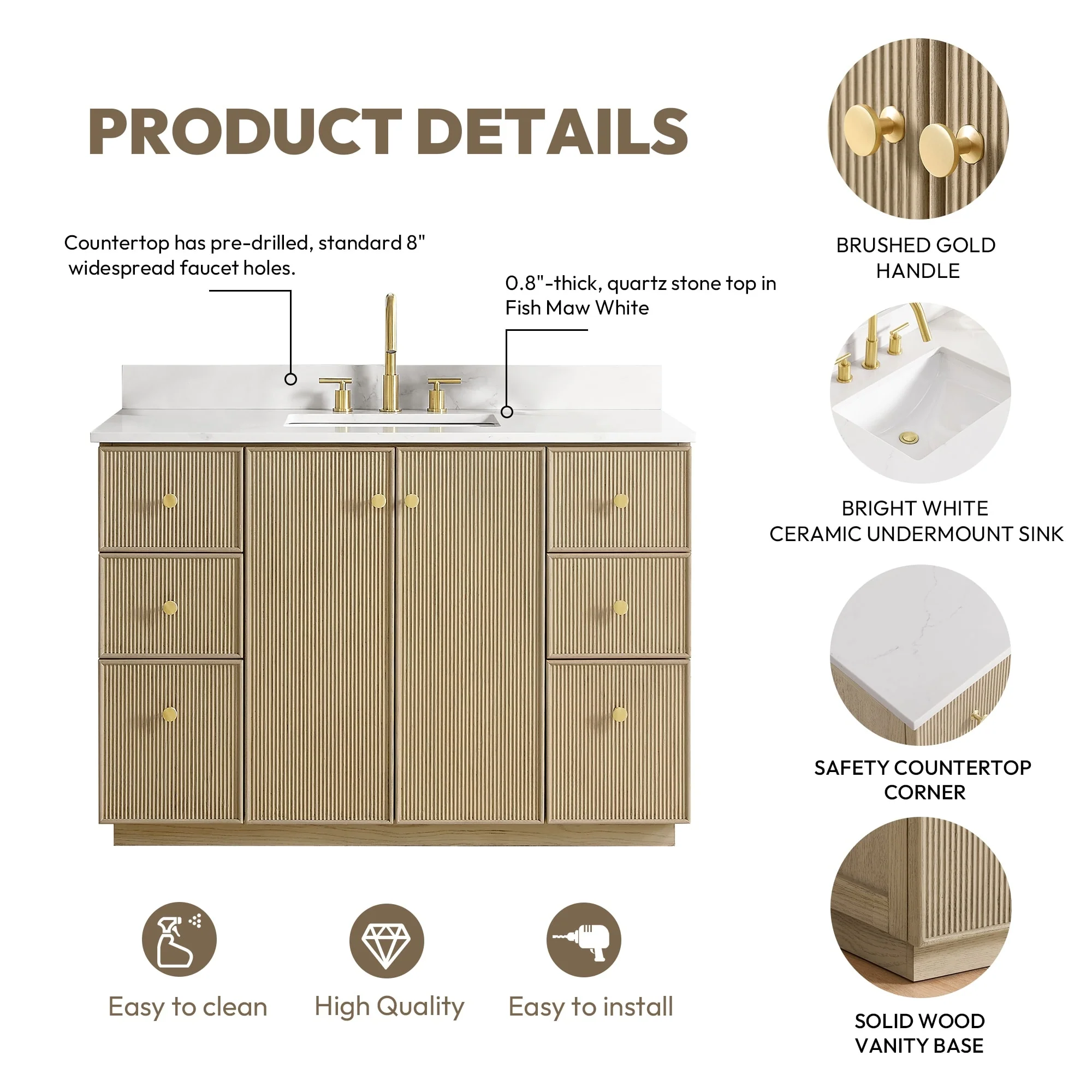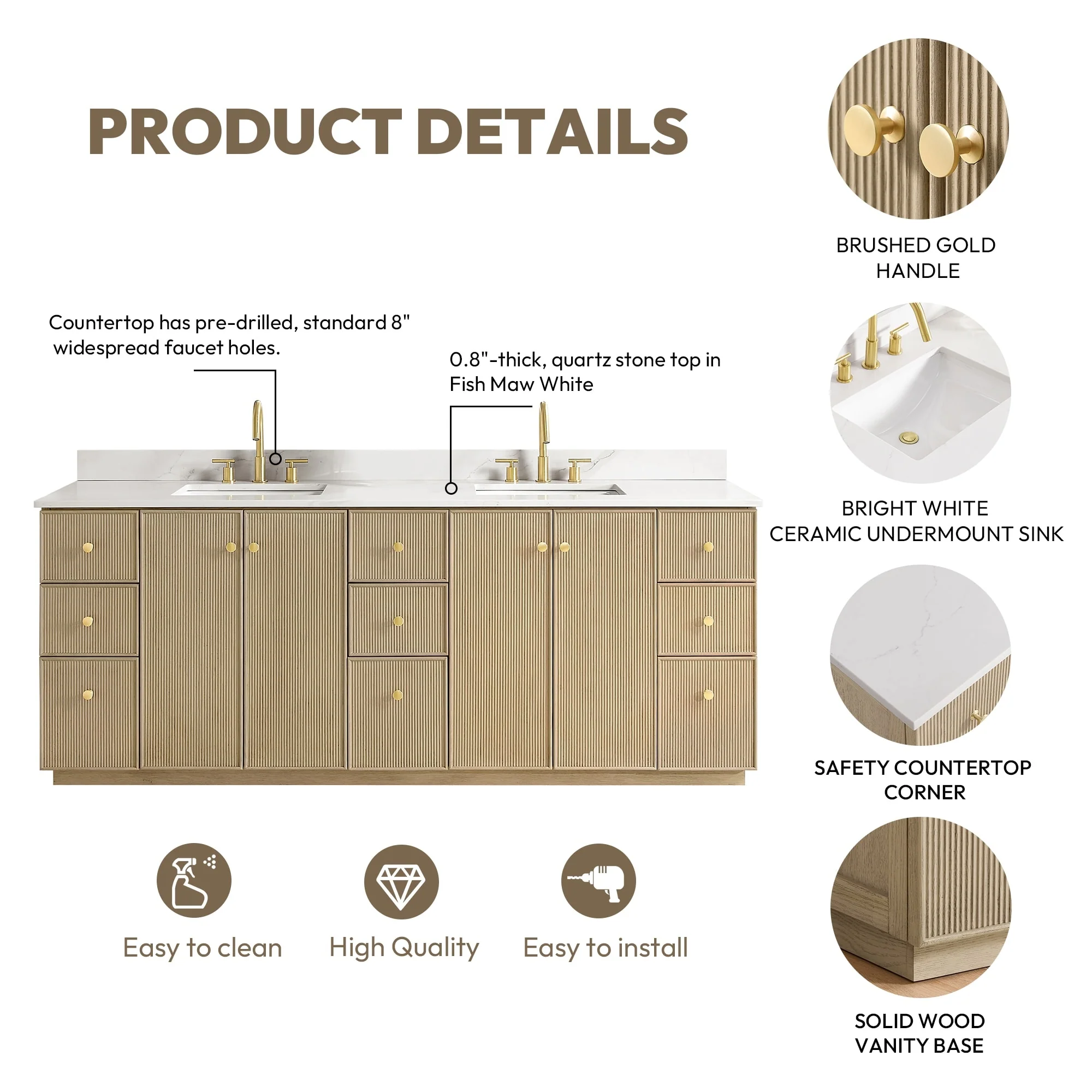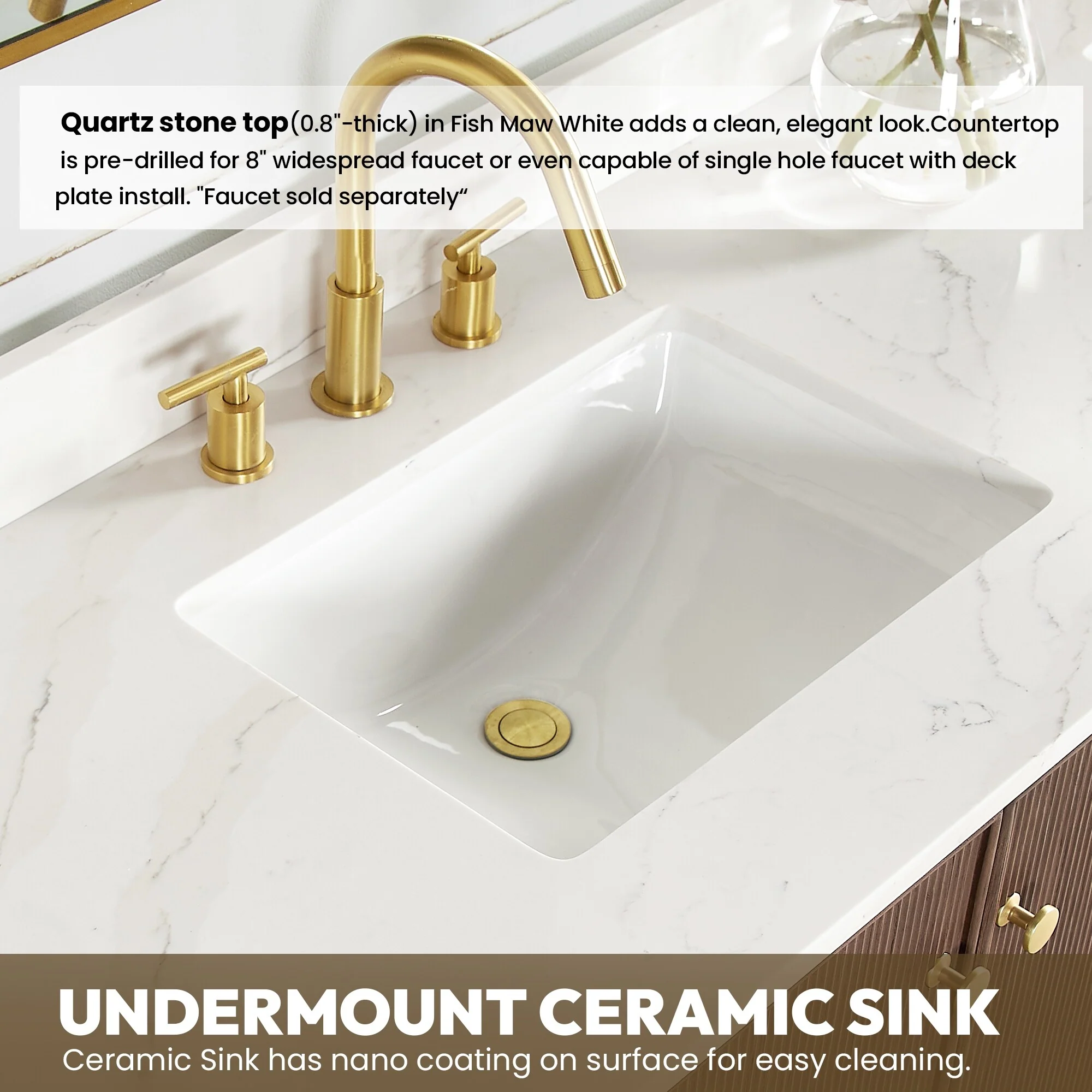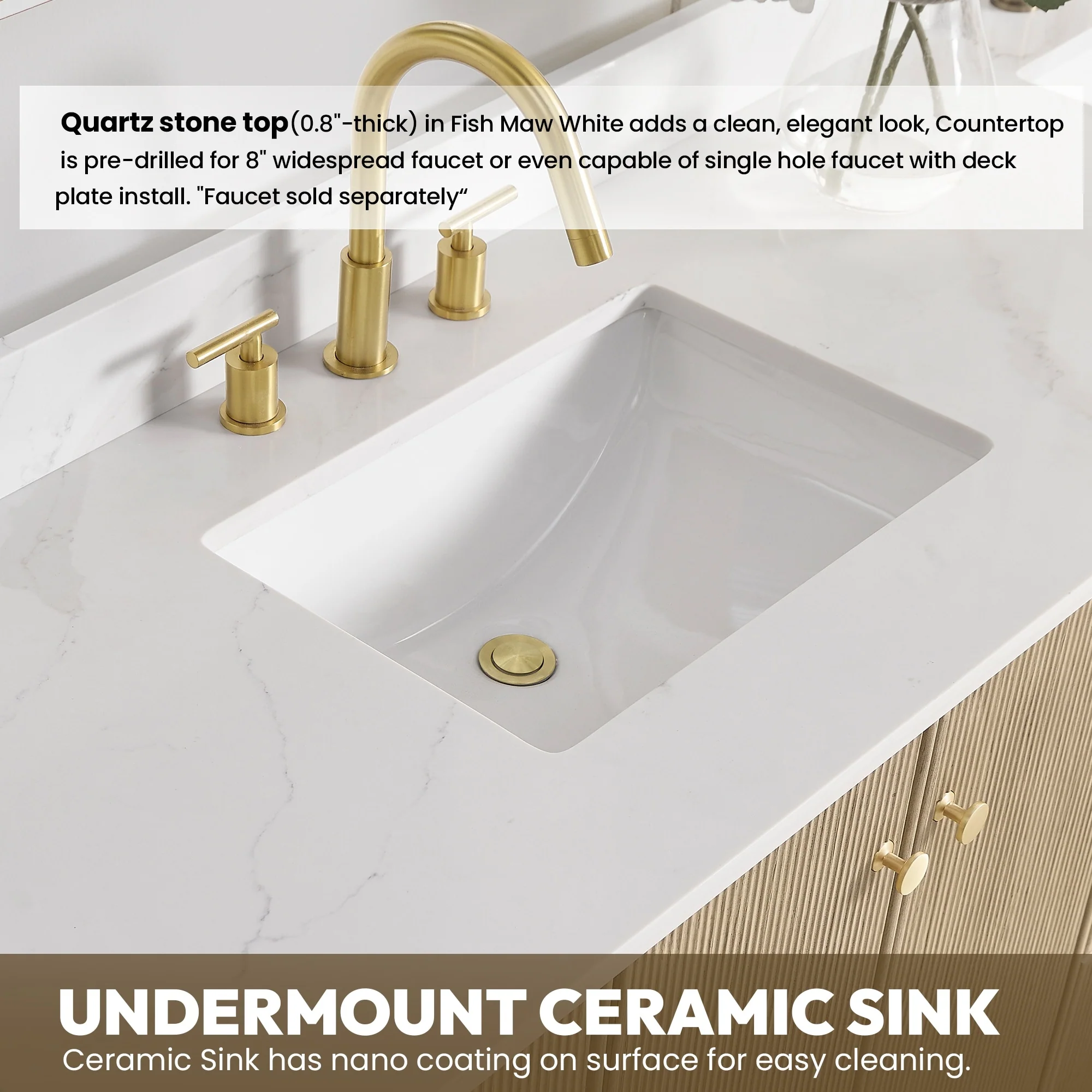 · Modern Top: 0.8'-thick, quartz stone top with backsplash. The countertop is scratch-resistant, wear-resistant, and easy to clean.