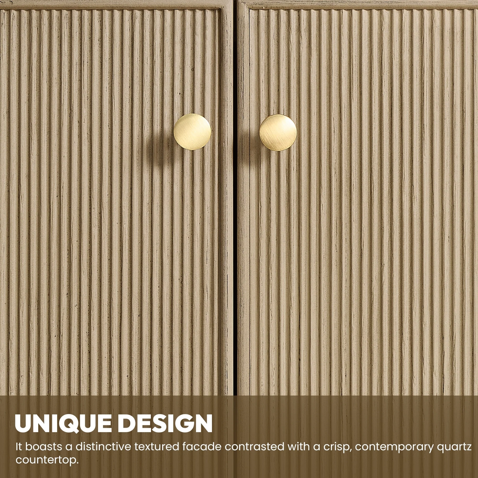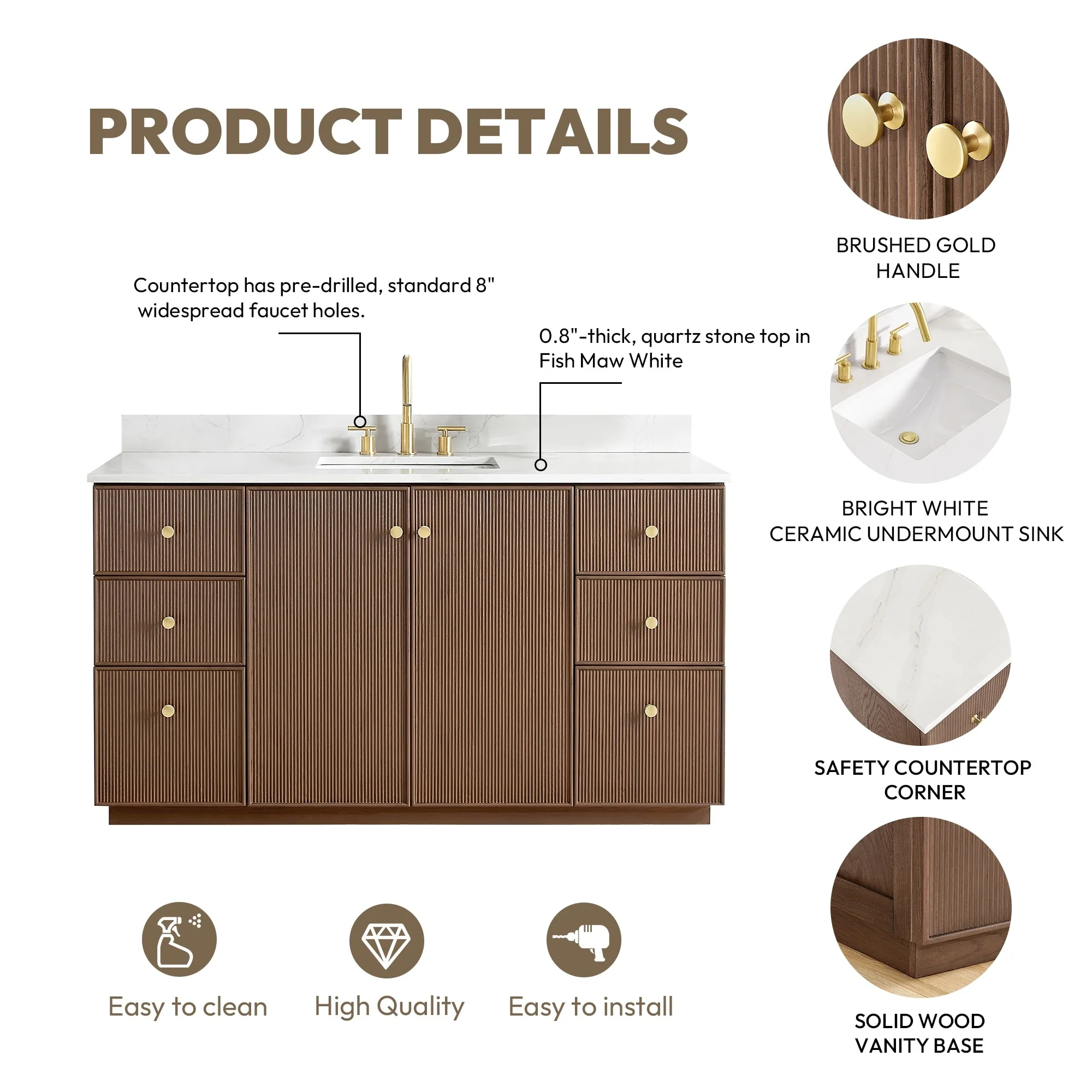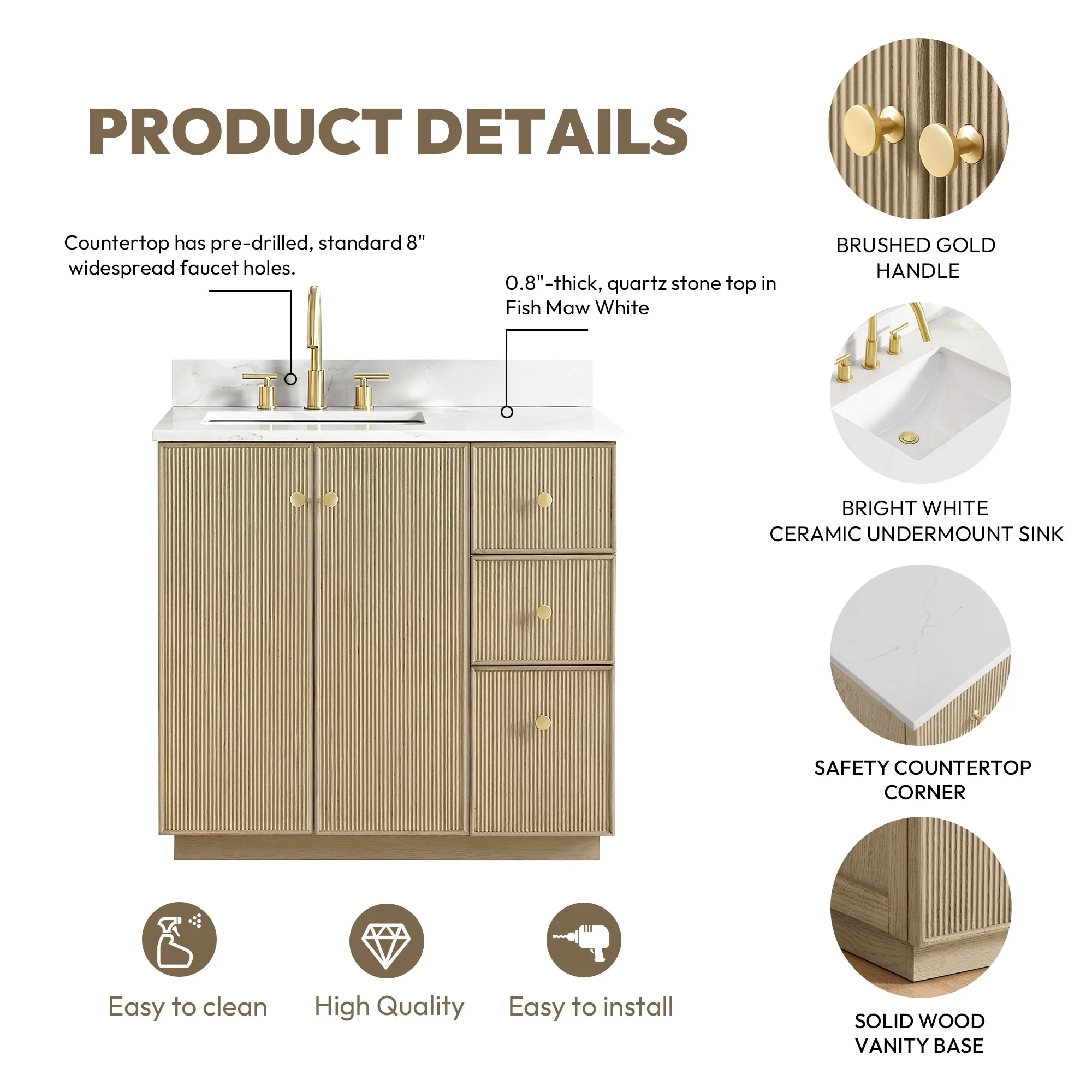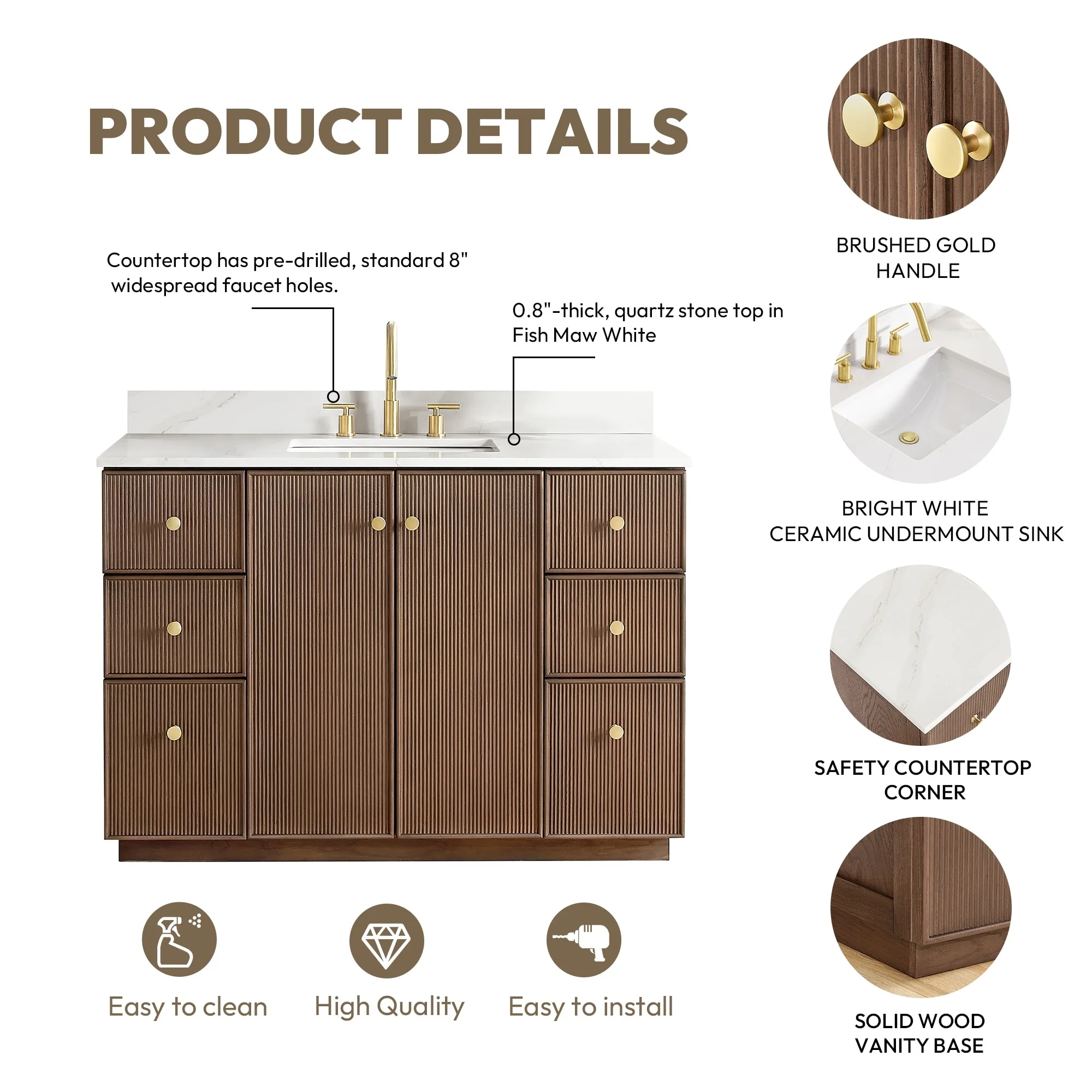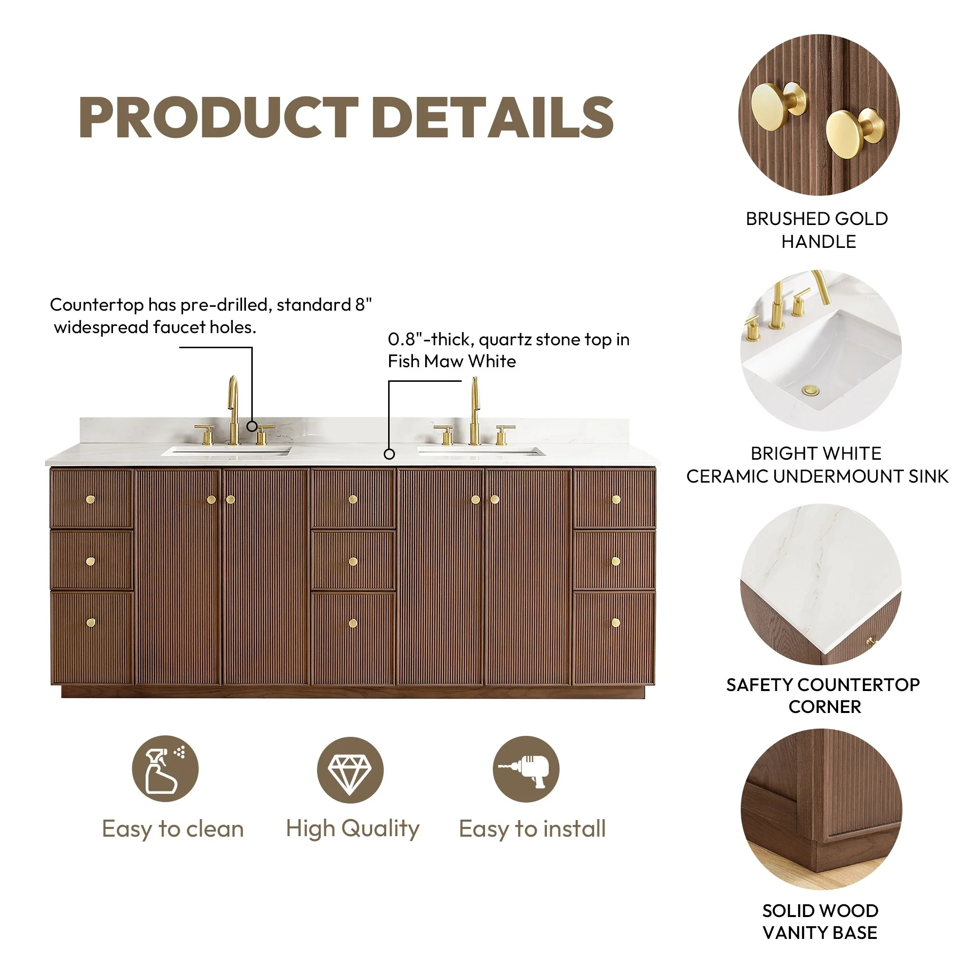 · Modern Top: 0.8'-thick, quartz stone top with backsplash. The countertop is scratch-resistant, wear-resistant, and easy to clean.