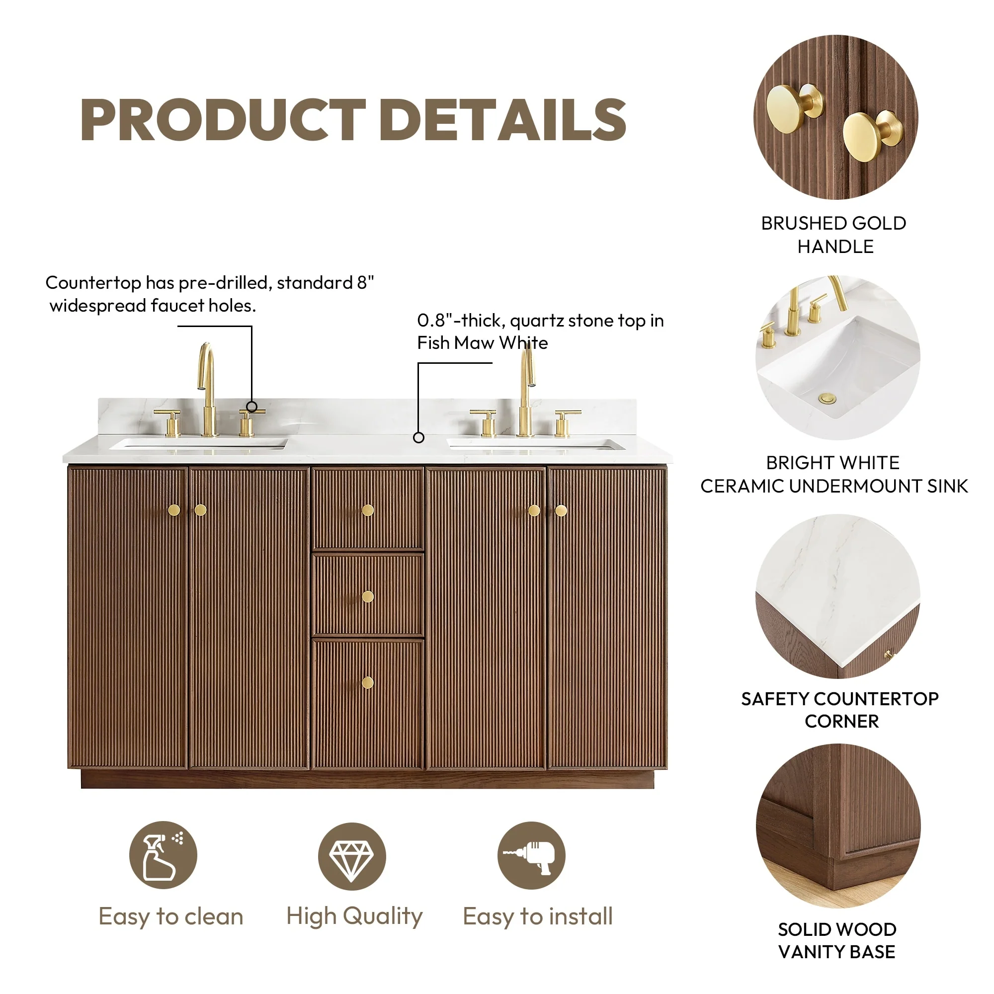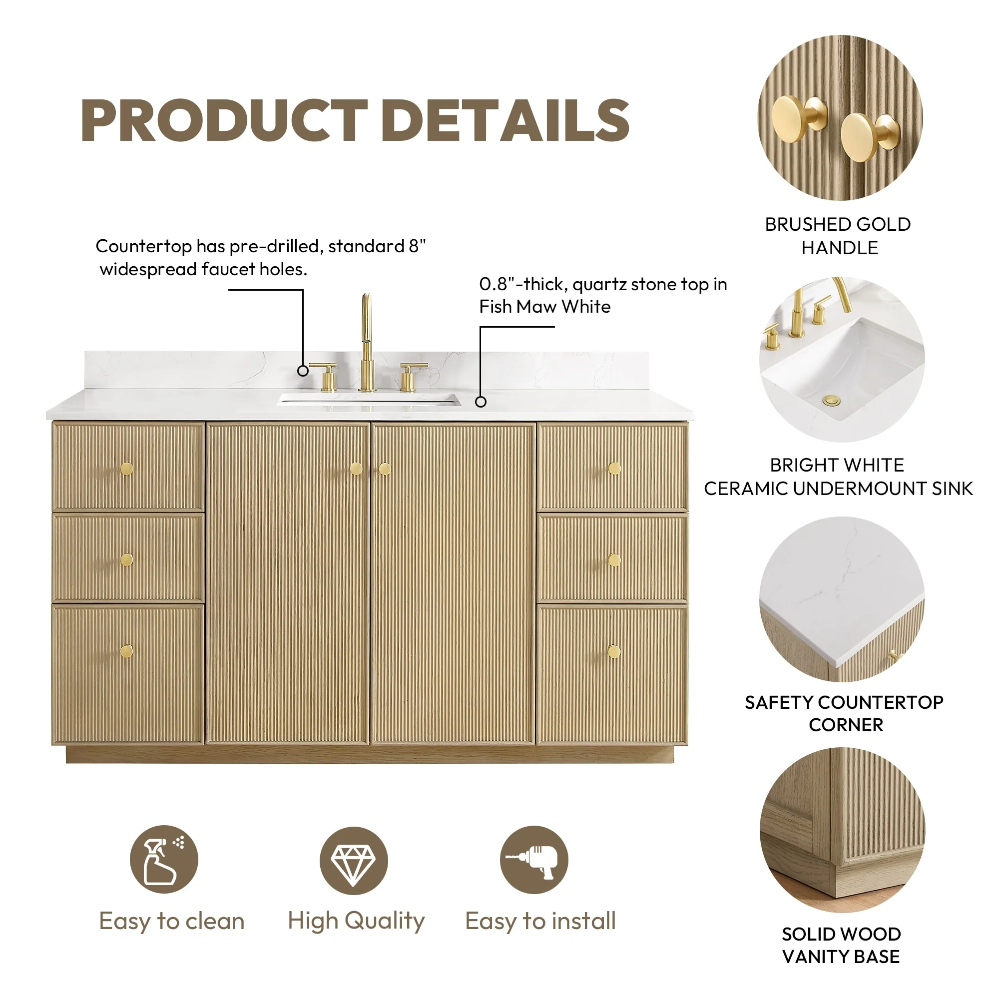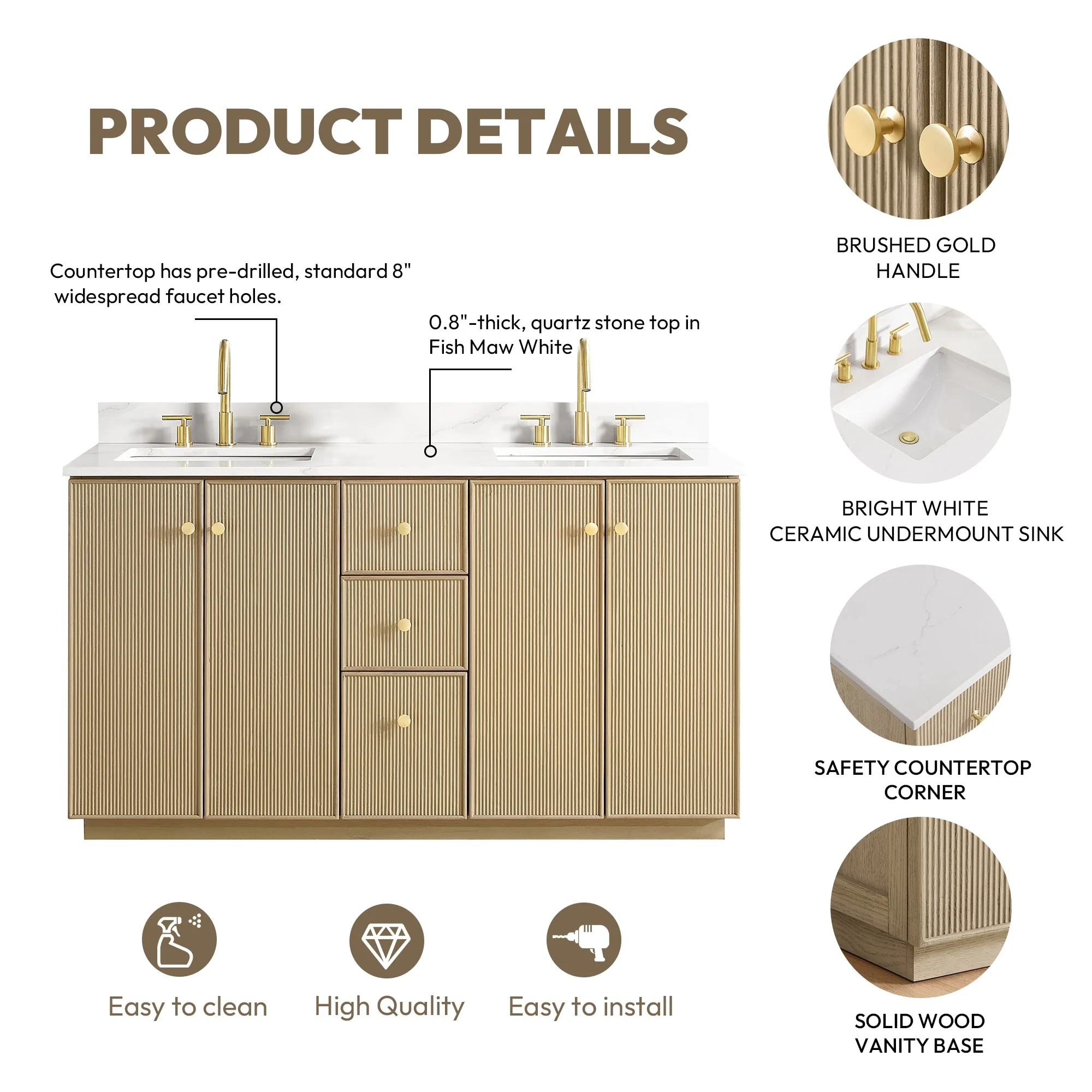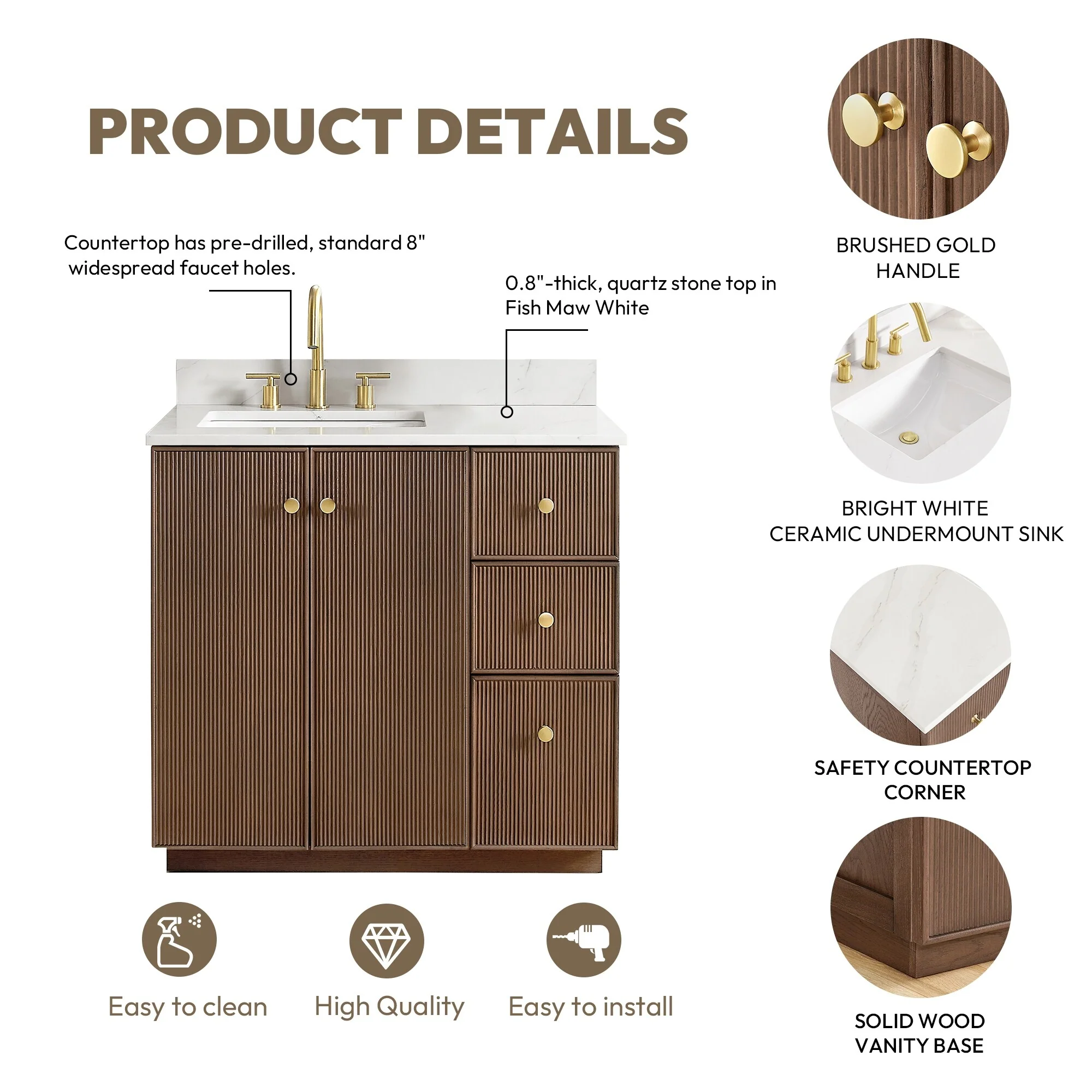 · Modern Top: 0.8'-thick, quartz stone top with backsplash. The countertop is scratch-resistant, wear-resistant, and easy to clean.