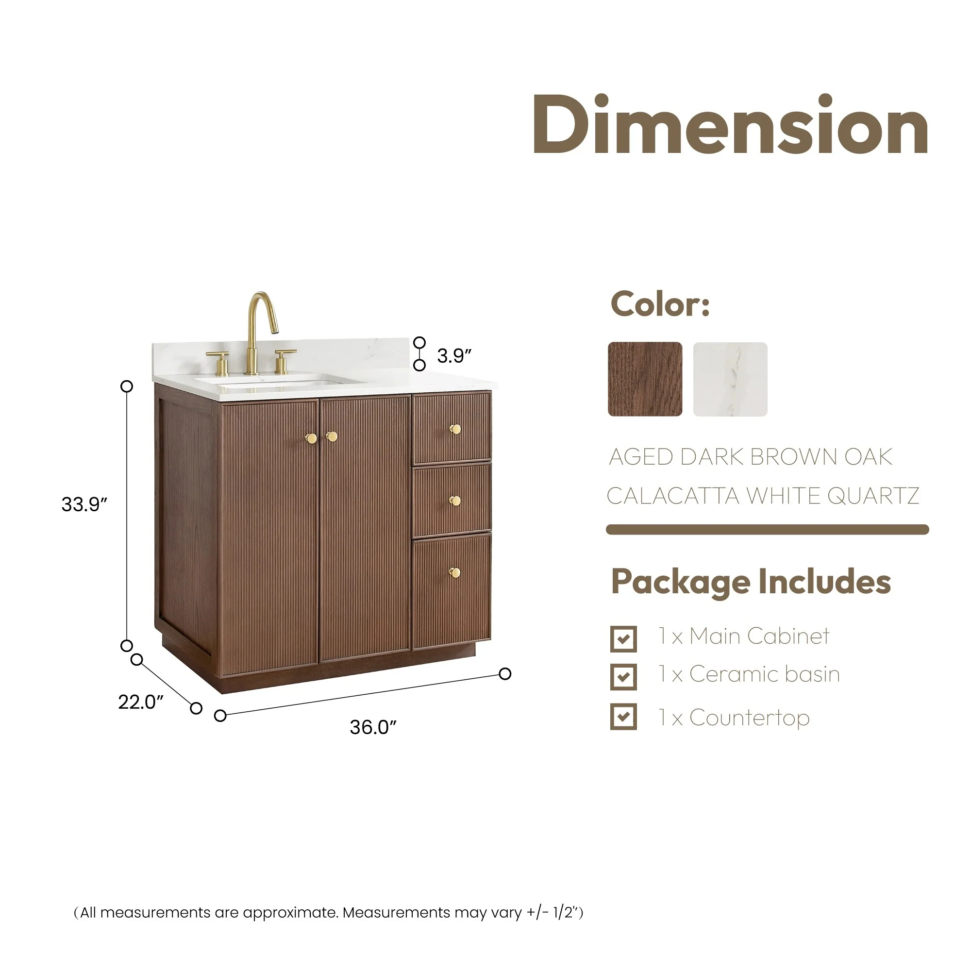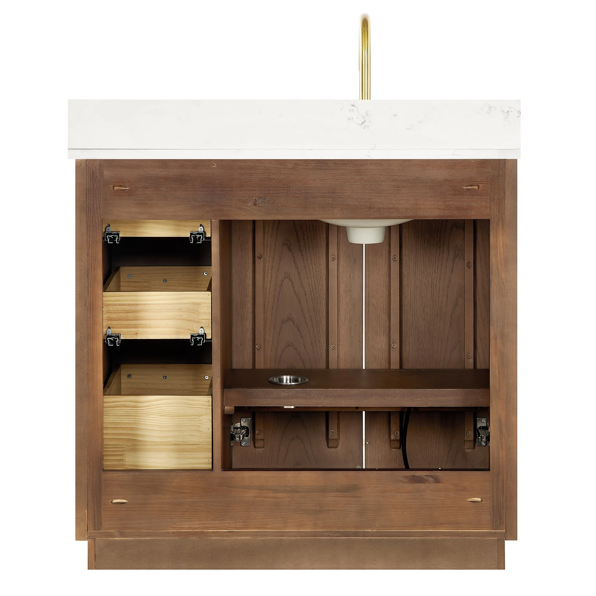 36 inch - 2 soft-closing doors and 3 sturdy, soft-closing dovetail drawers.