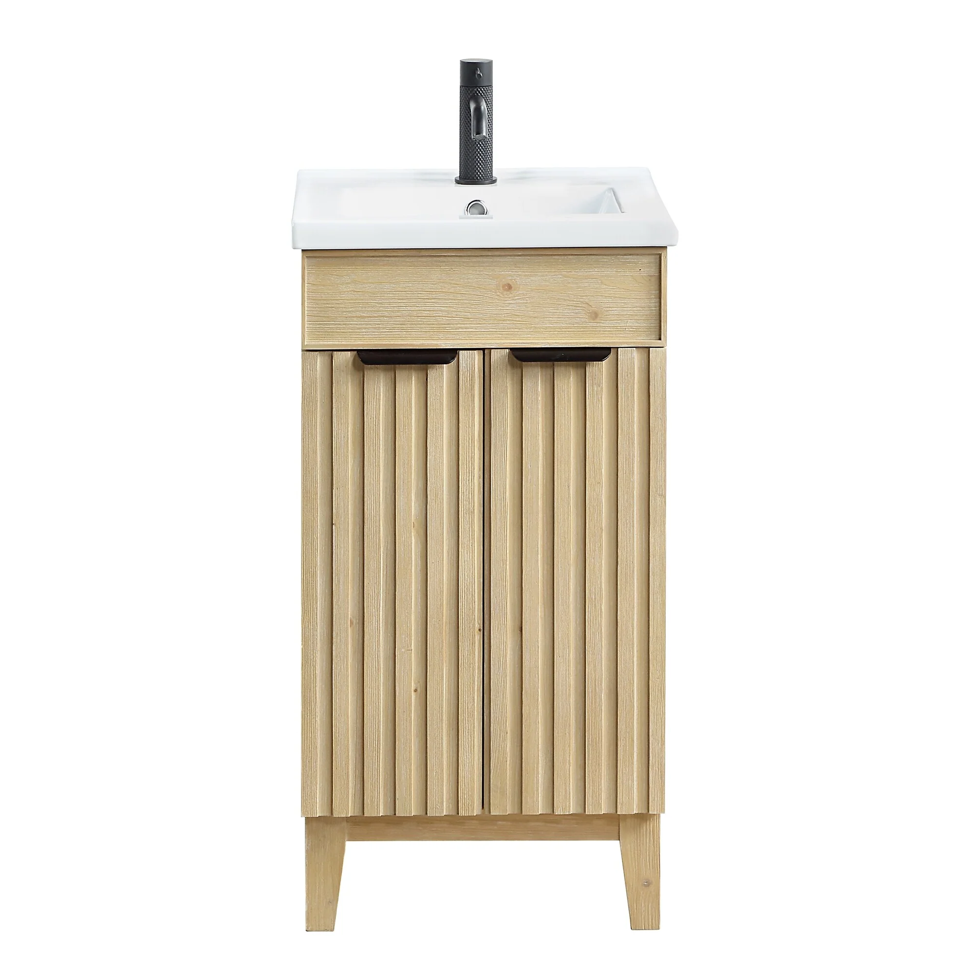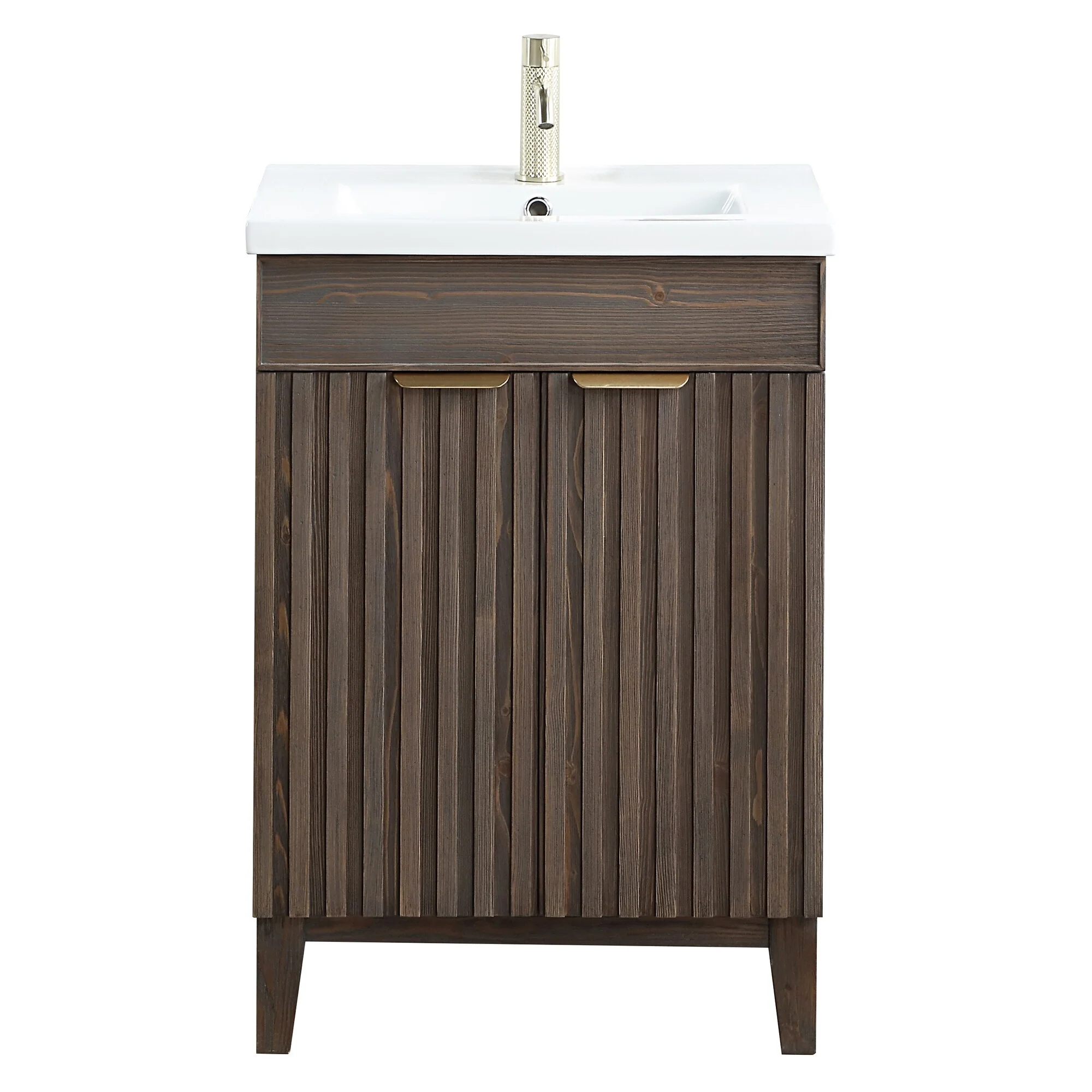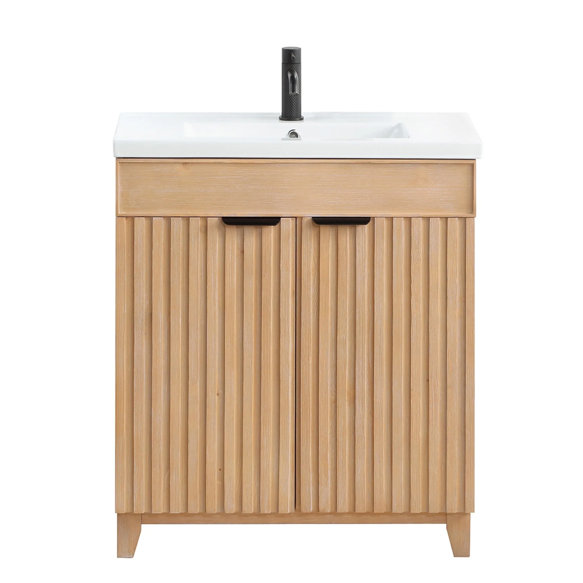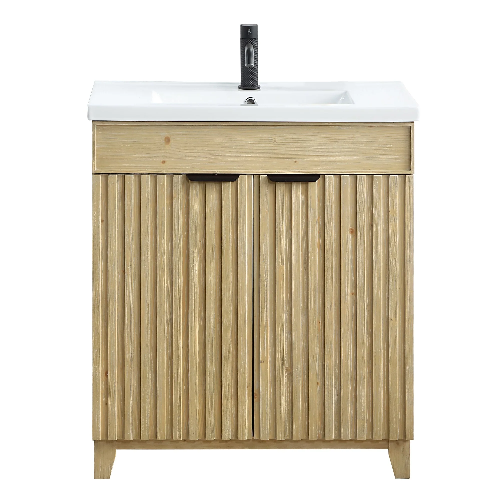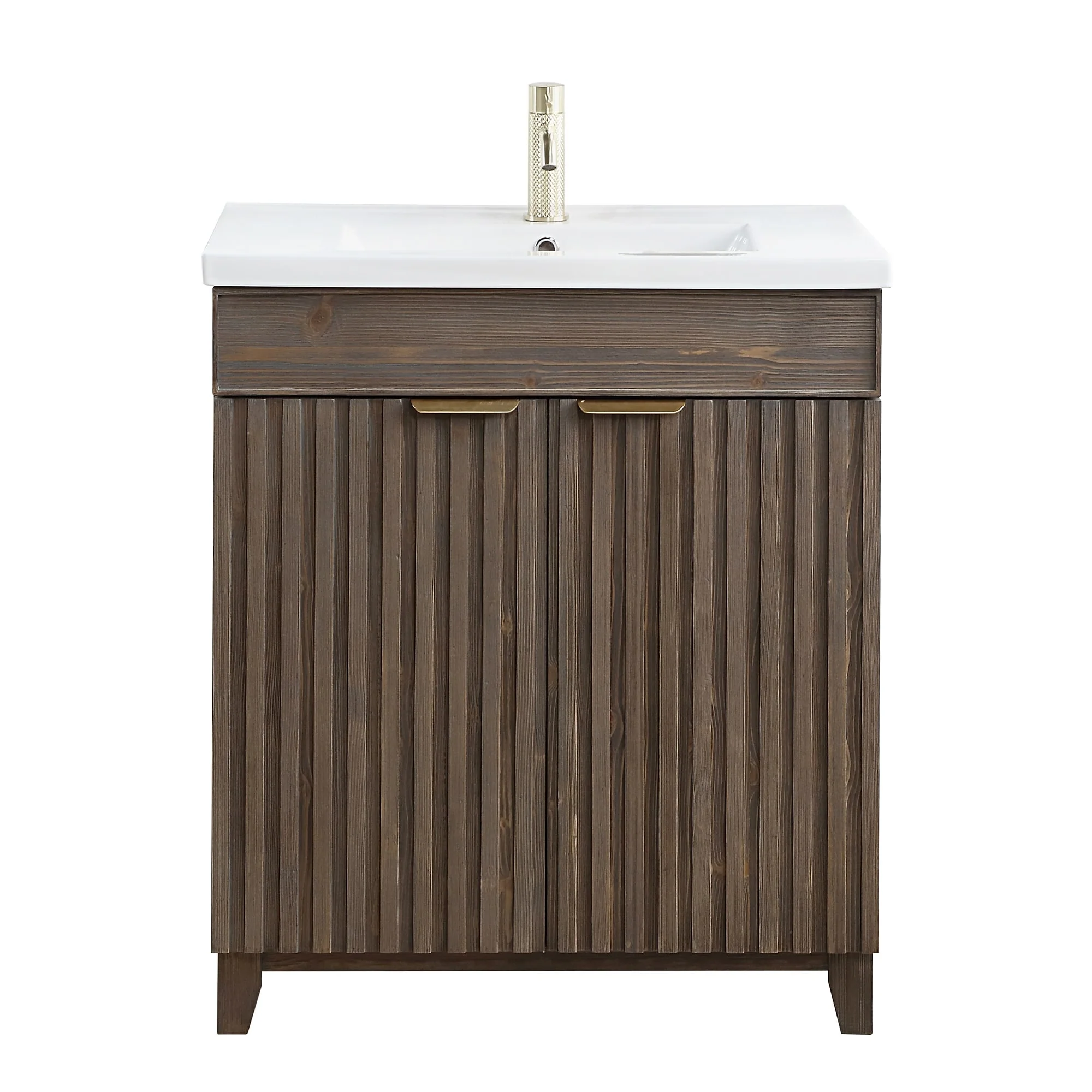 Our Palos Series Vanity—ruggedly crafted from fine solid wood and available in a trio of stunning finishes—embodies the elegance of minimalist design. It features ample storage space concealed behind grooved cabinet doors, making organizing your essentials effortless. A white drop-in white ceramic basin provides a bold pop of contrast with the textured wood to complete the contemporary look.