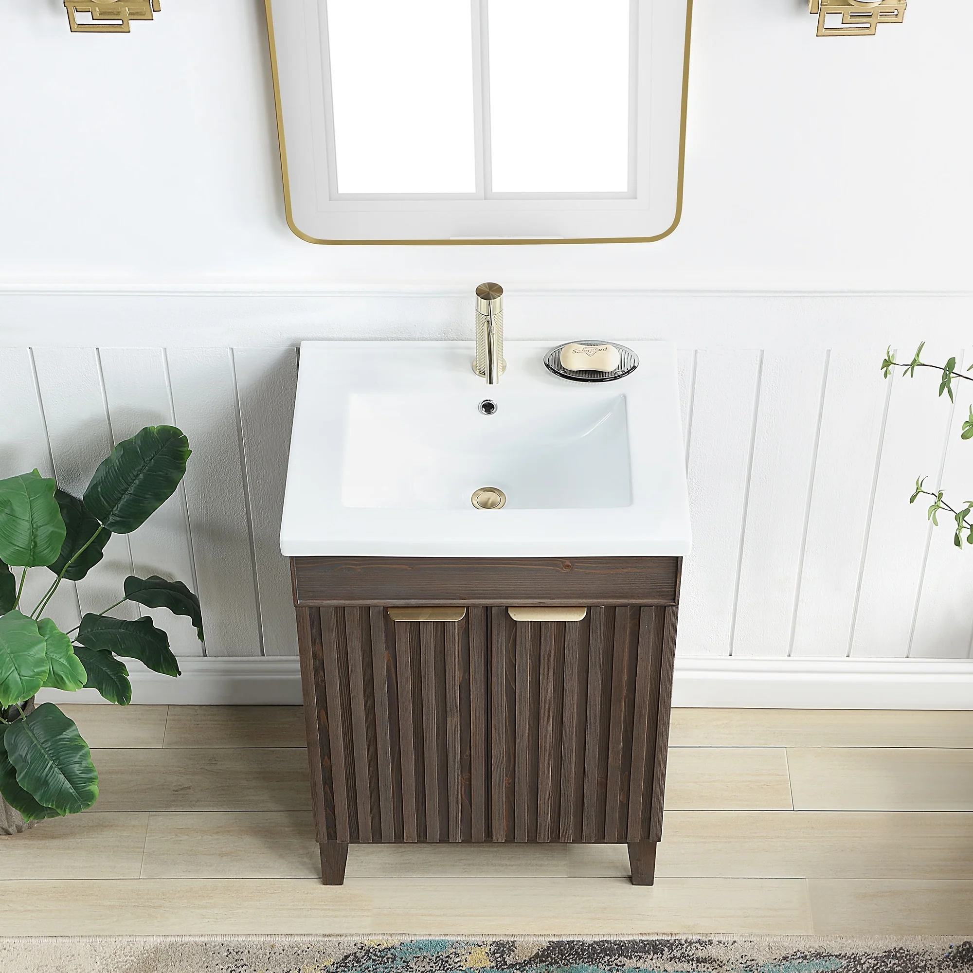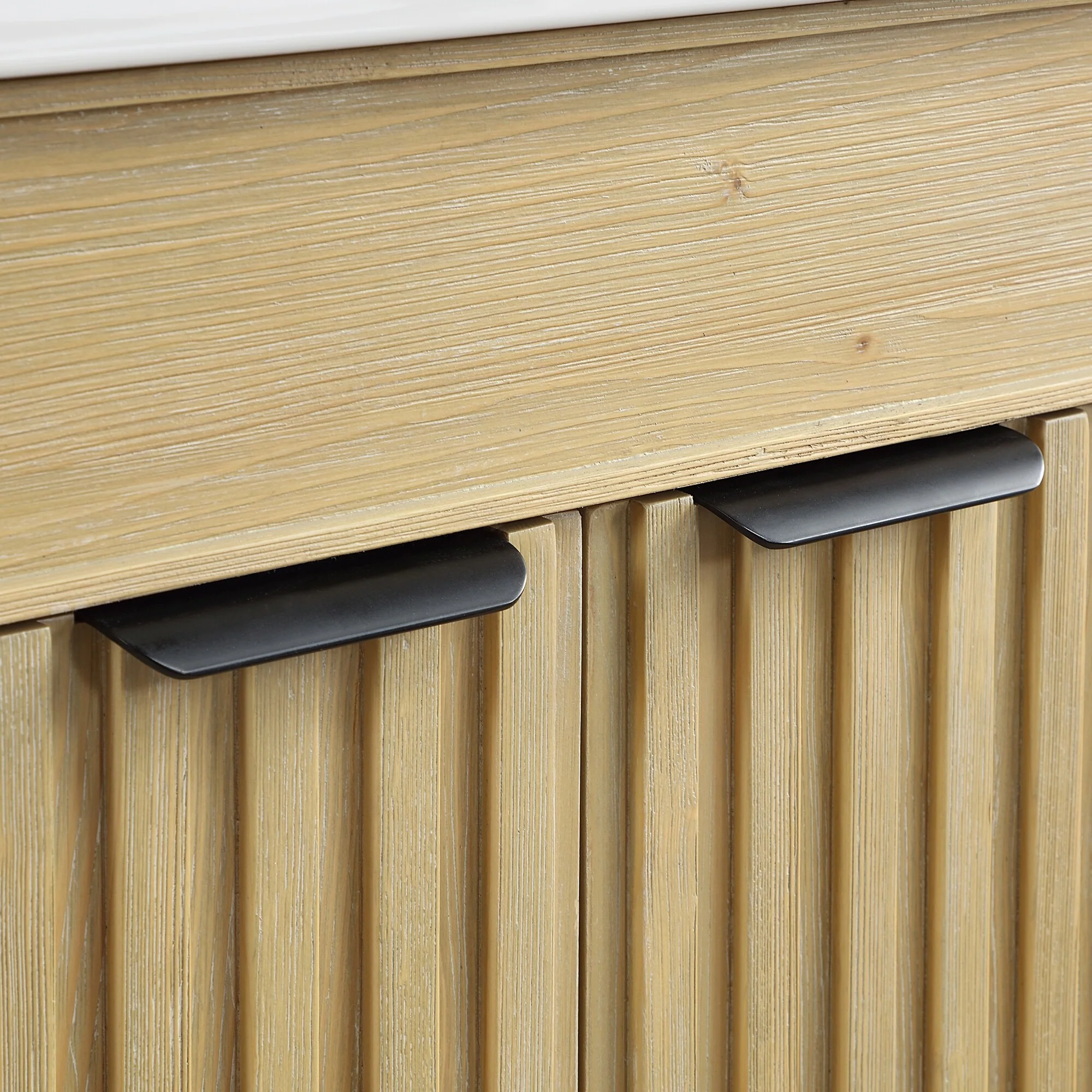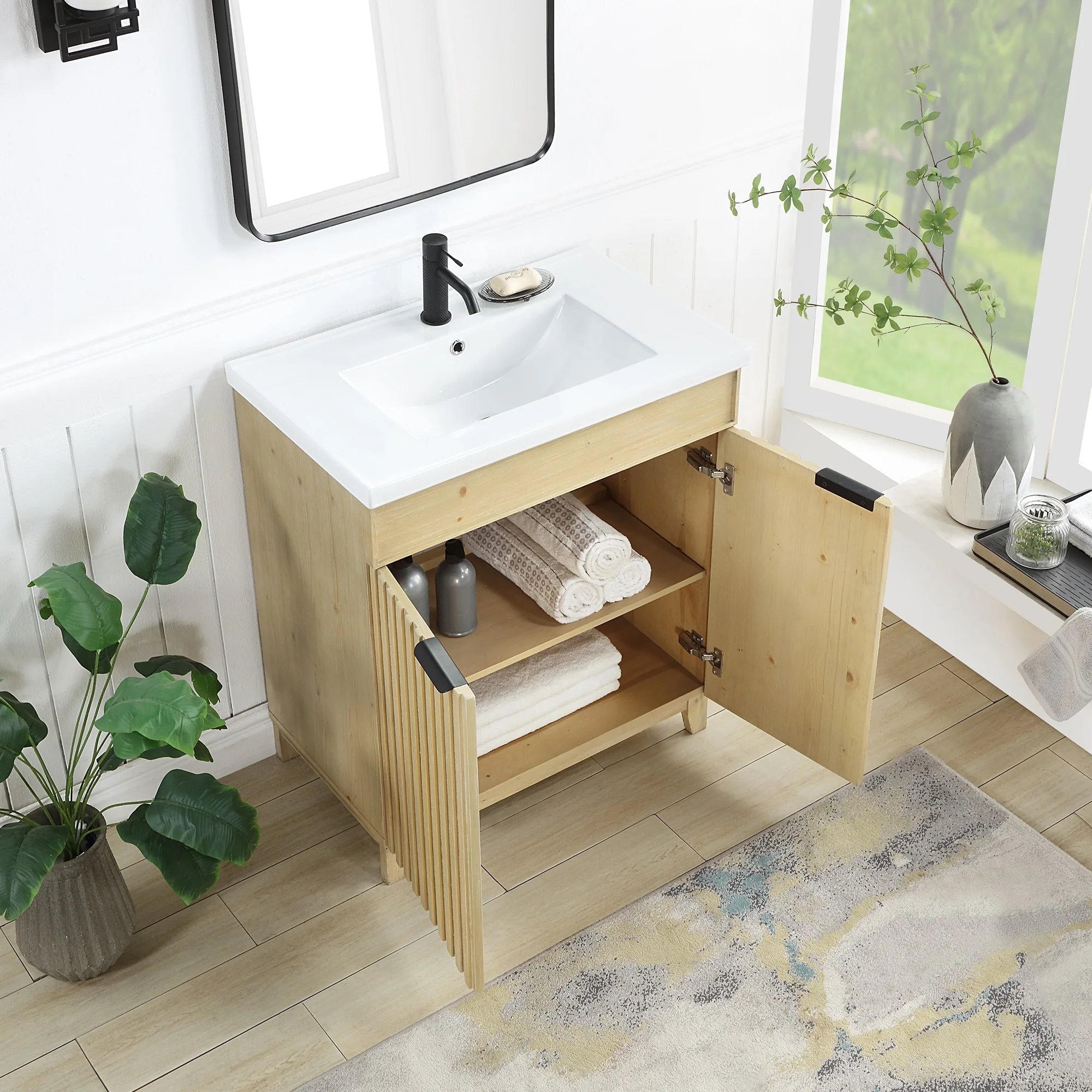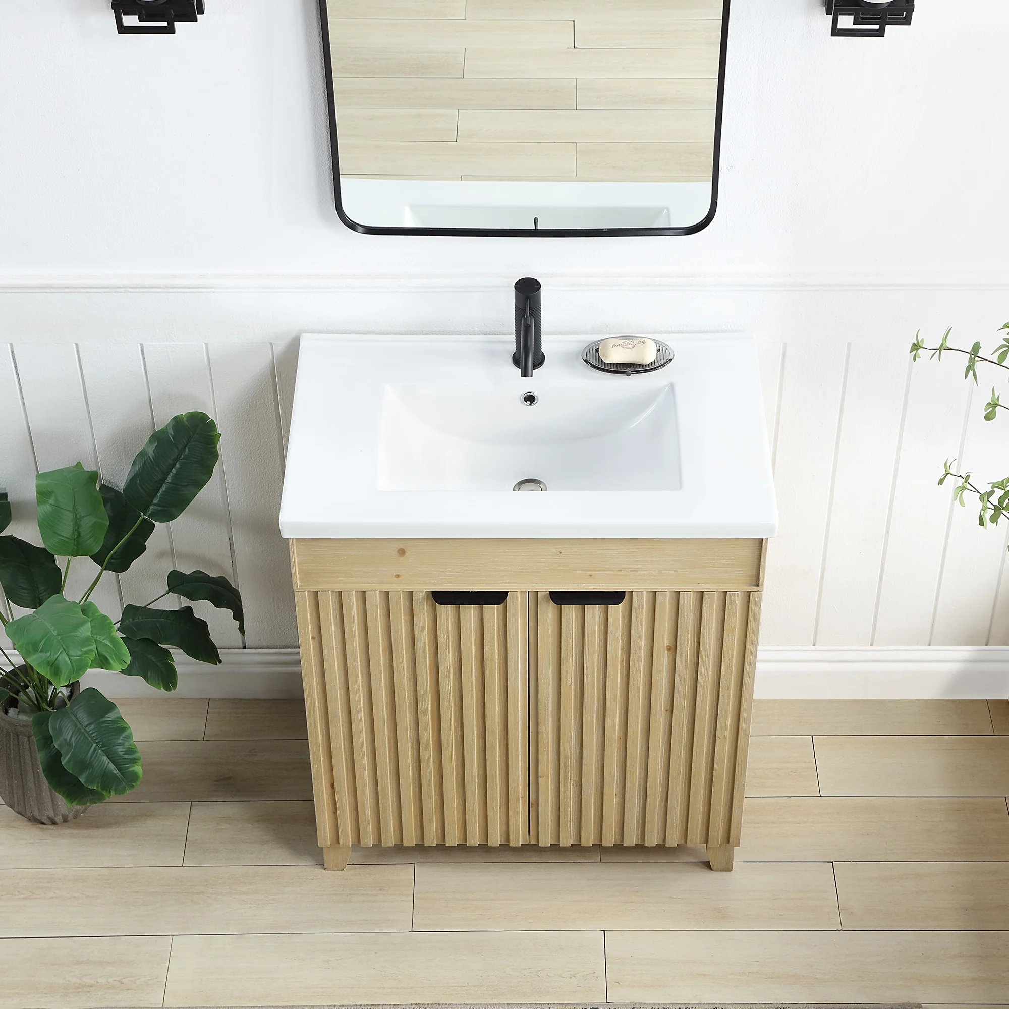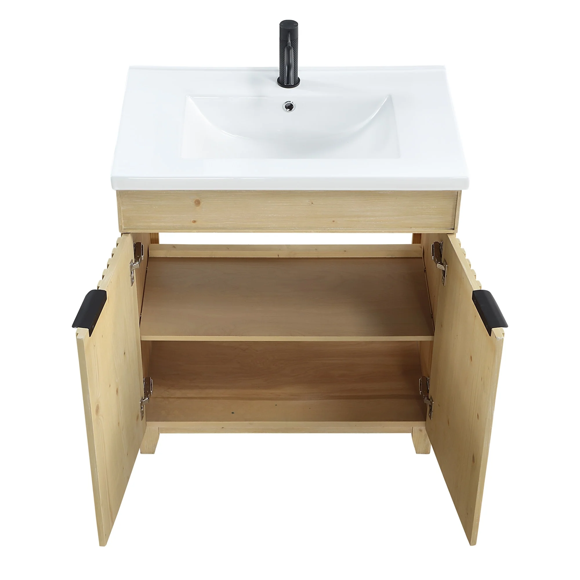 Our Palos Series Vanity—ruggedly crafted from fine solid wood and available in a trio of stunning finishes—embodies the elegance of minimalist design. It features ample storage space concealed behind grooved cabinet doors, making organizing your essentials effortless. A white drop-in white ceramic basin provides a bold pop of contrast with the textured wood to complete the contemporary look.