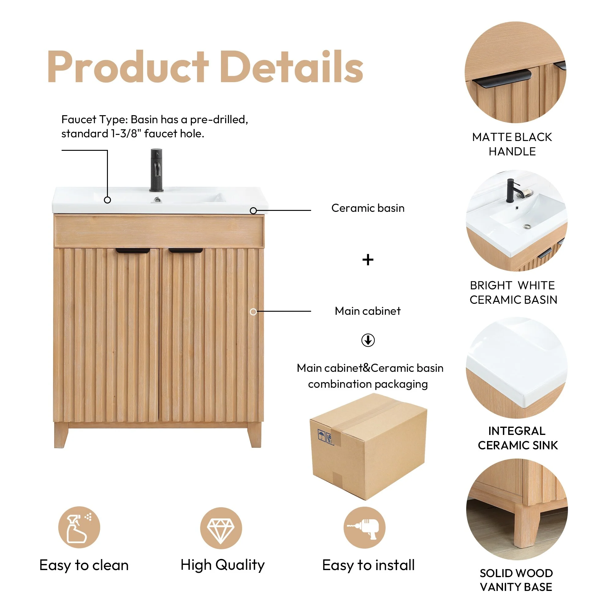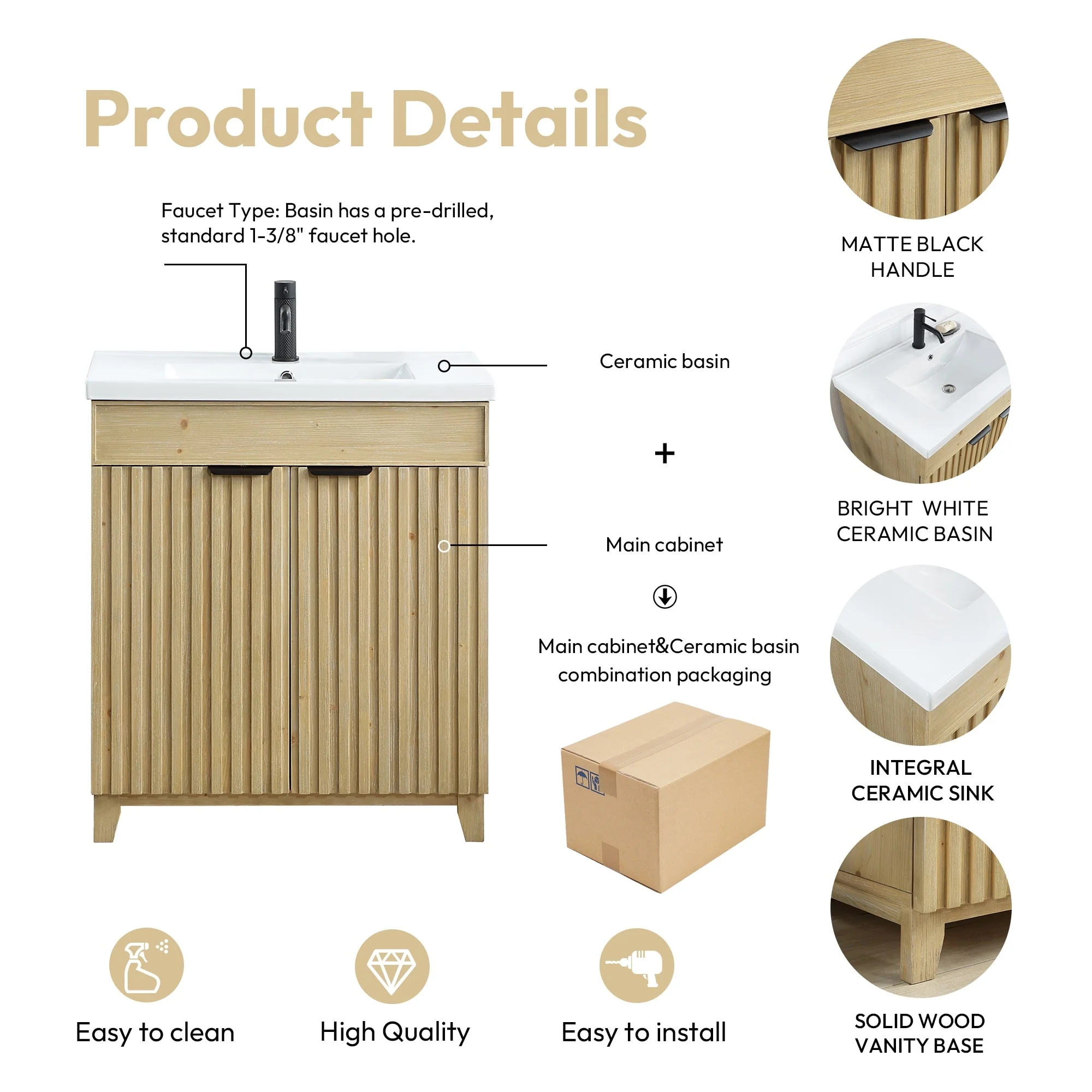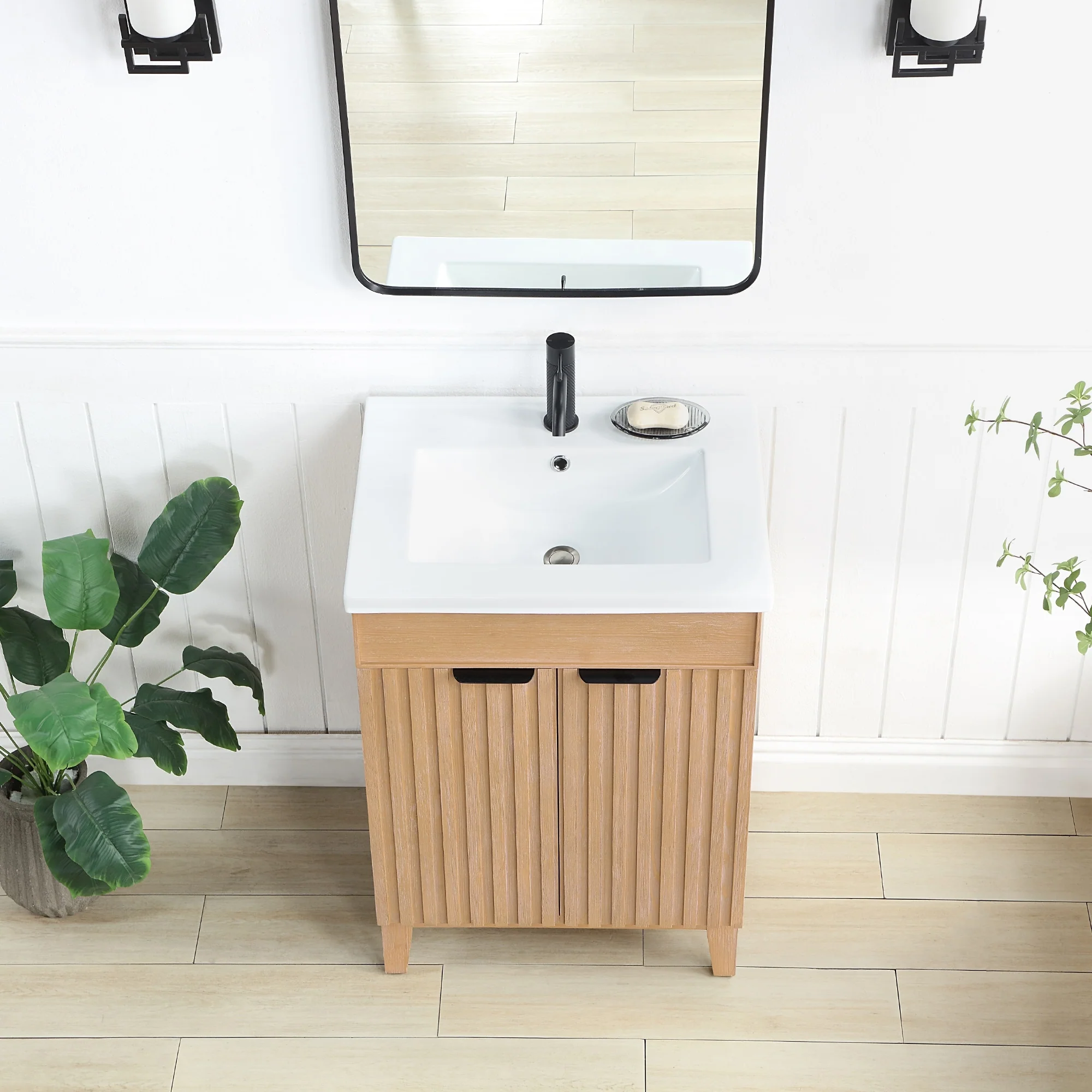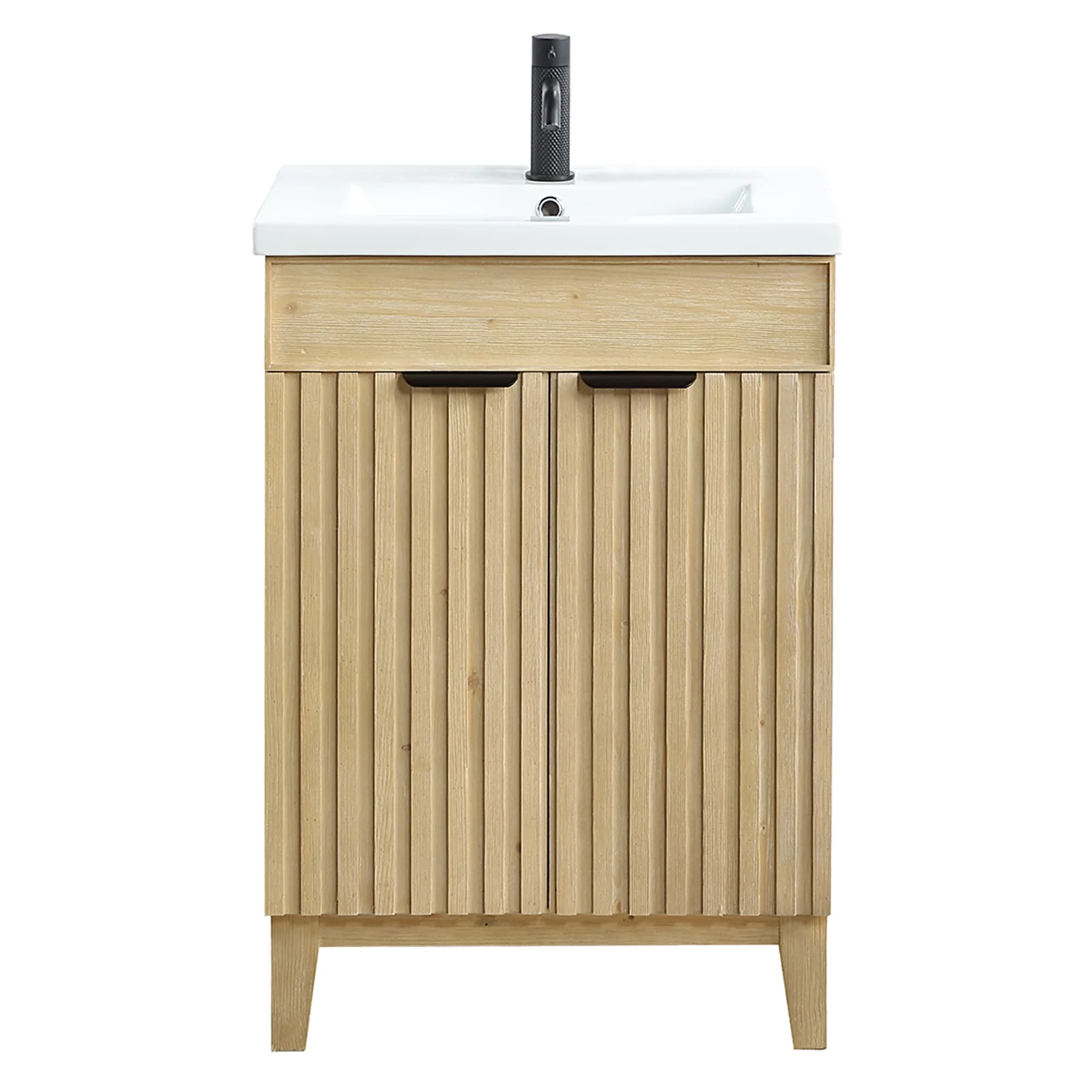 Our Palos Series Vanity—ruggedly crafted from fine solid wood and available in a trio of stunning finishes—embodies the elegance of minimalist design. It features ample storage space concealed behind grooved cabinet doors, making organizing your essentials effortless. A white drop-in white ceramic basin provides a bold pop of contrast with the textured wood to complete the contemporary look.