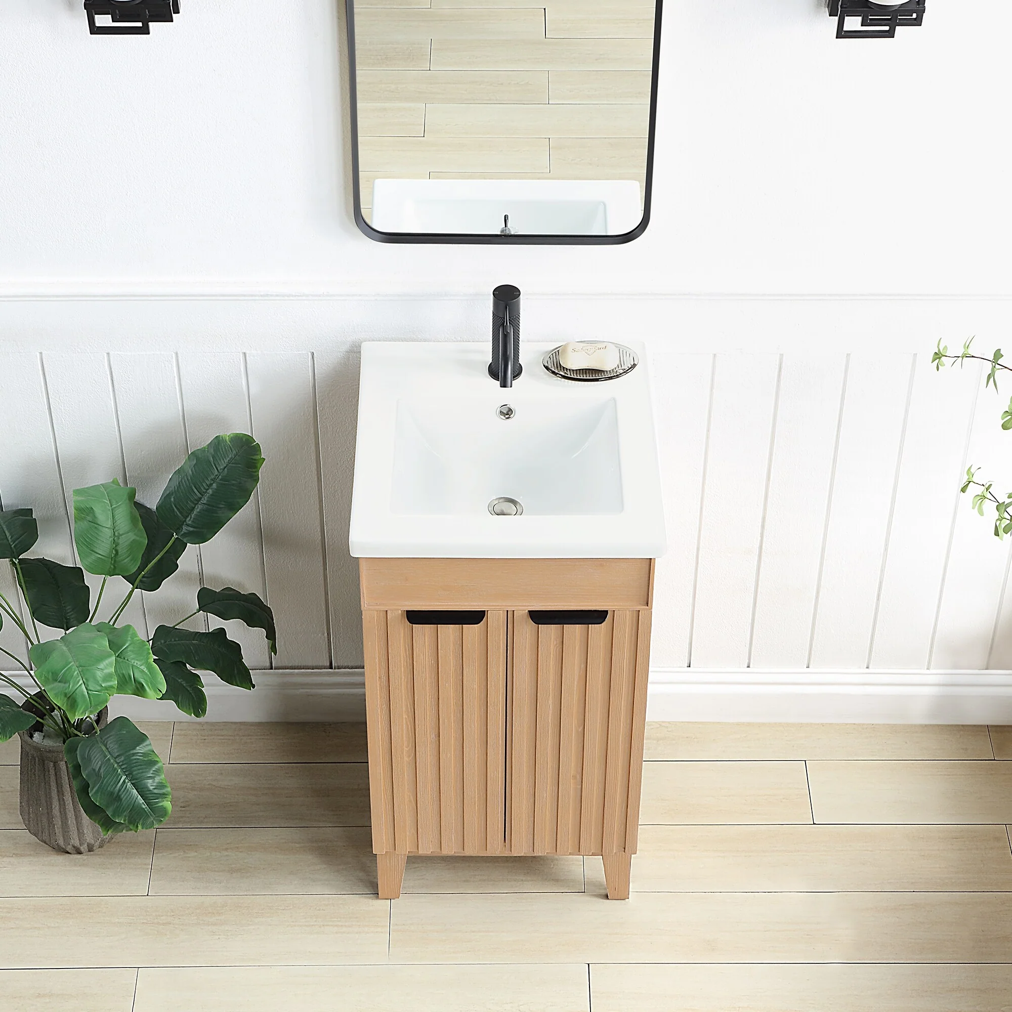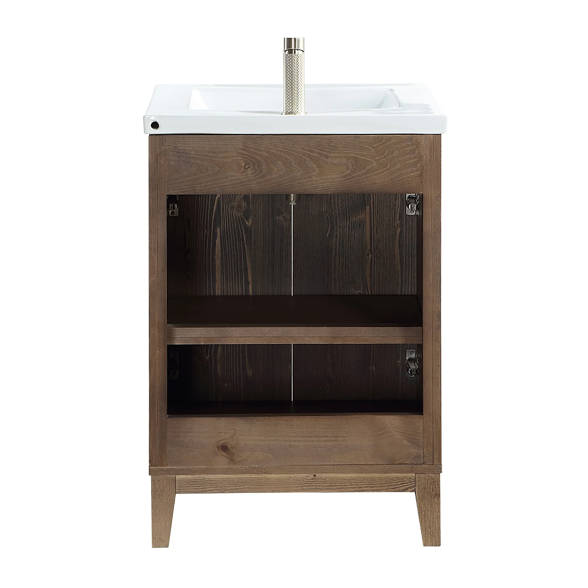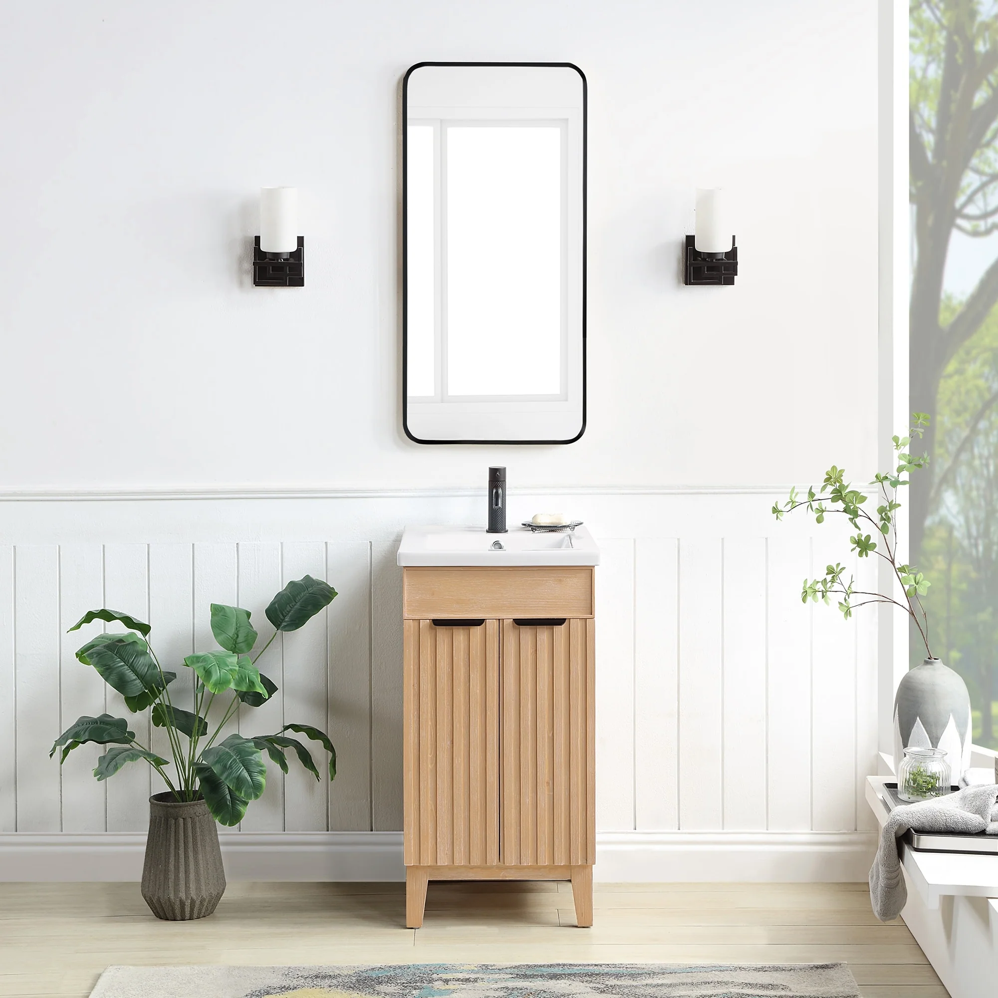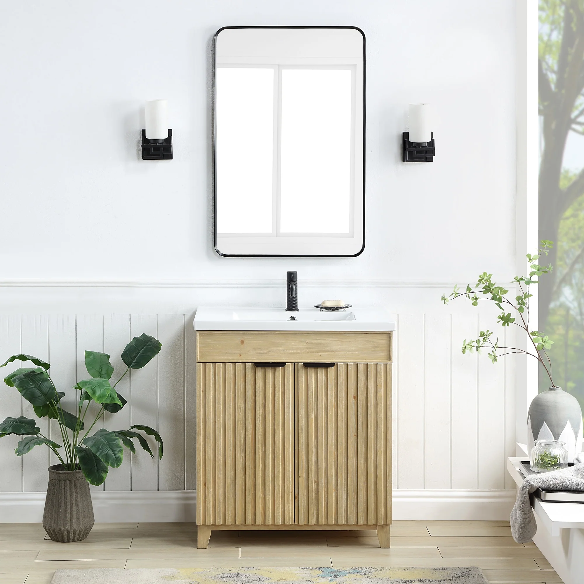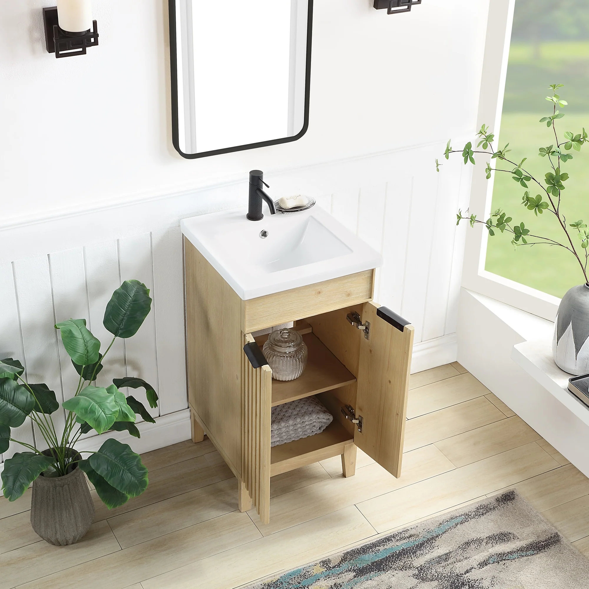 Our Palos Series Vanity—ruggedly crafted from fine solid wood and available in a trio of stunning finishes—embodies the elegance of minimalist design. It features ample storage space concealed behind grooved cabinet doors, making organizing your essentials effortless. A white drop-in white ceramic basin provides a bold pop of contrast with the textured wood to complete the contemporary look.