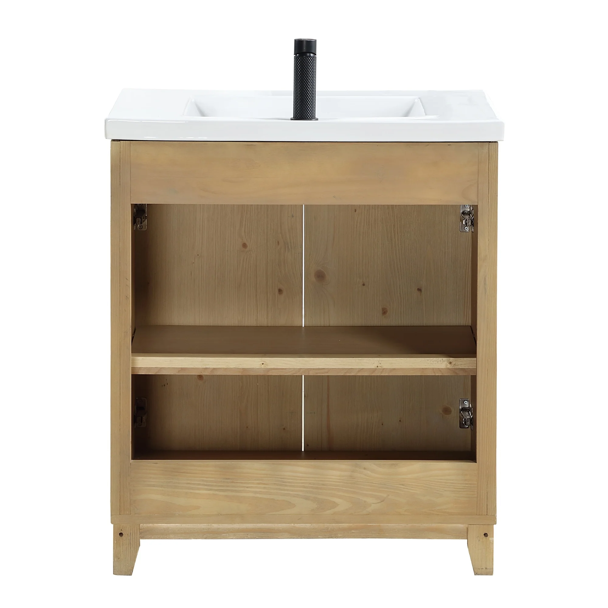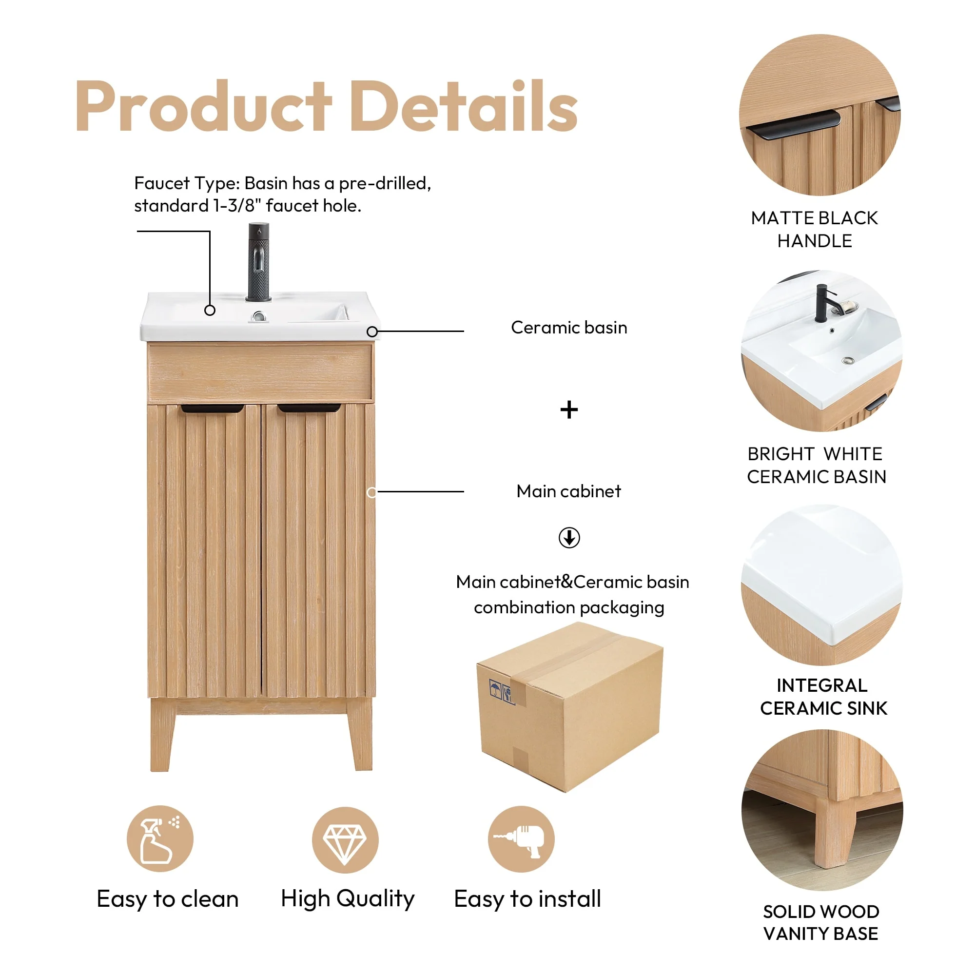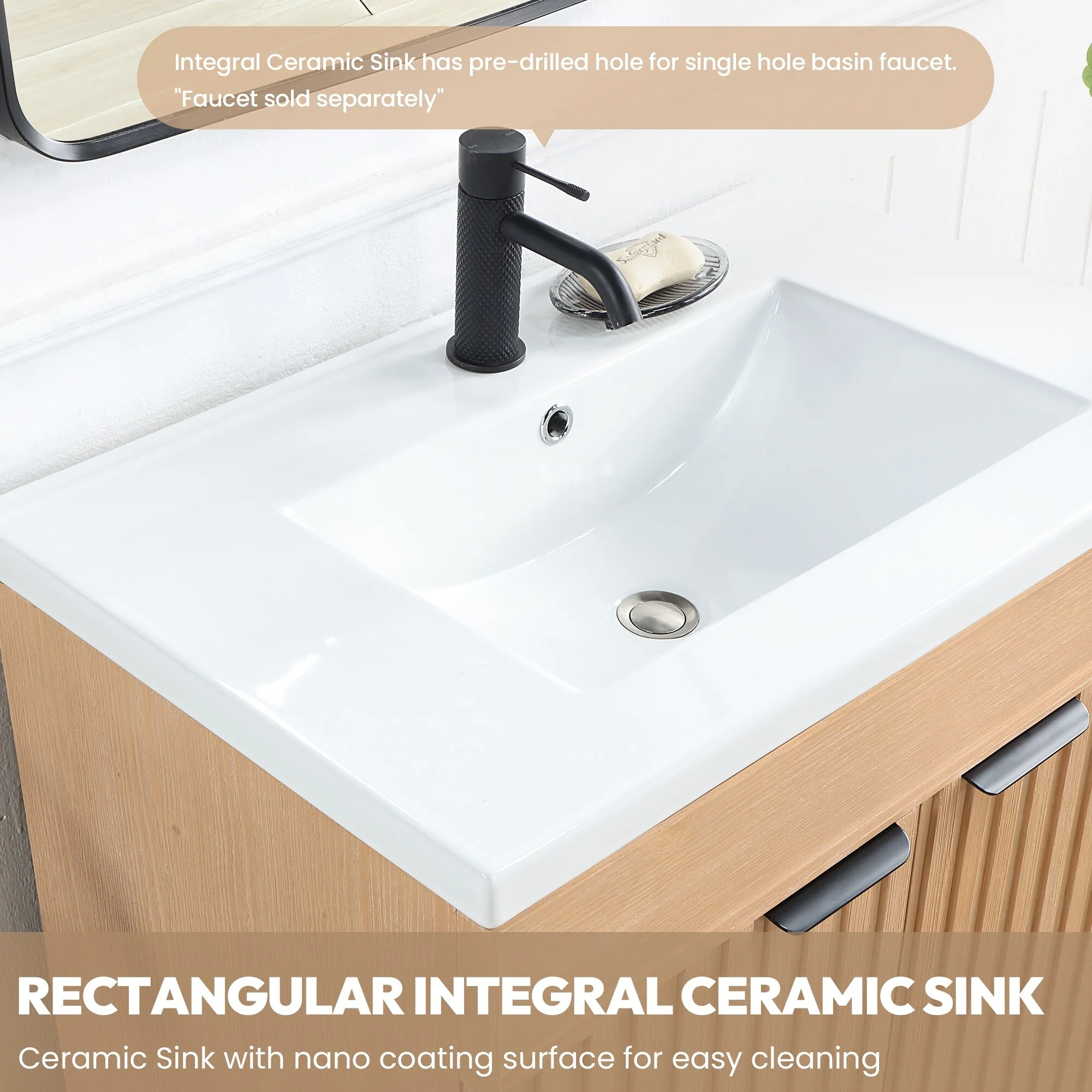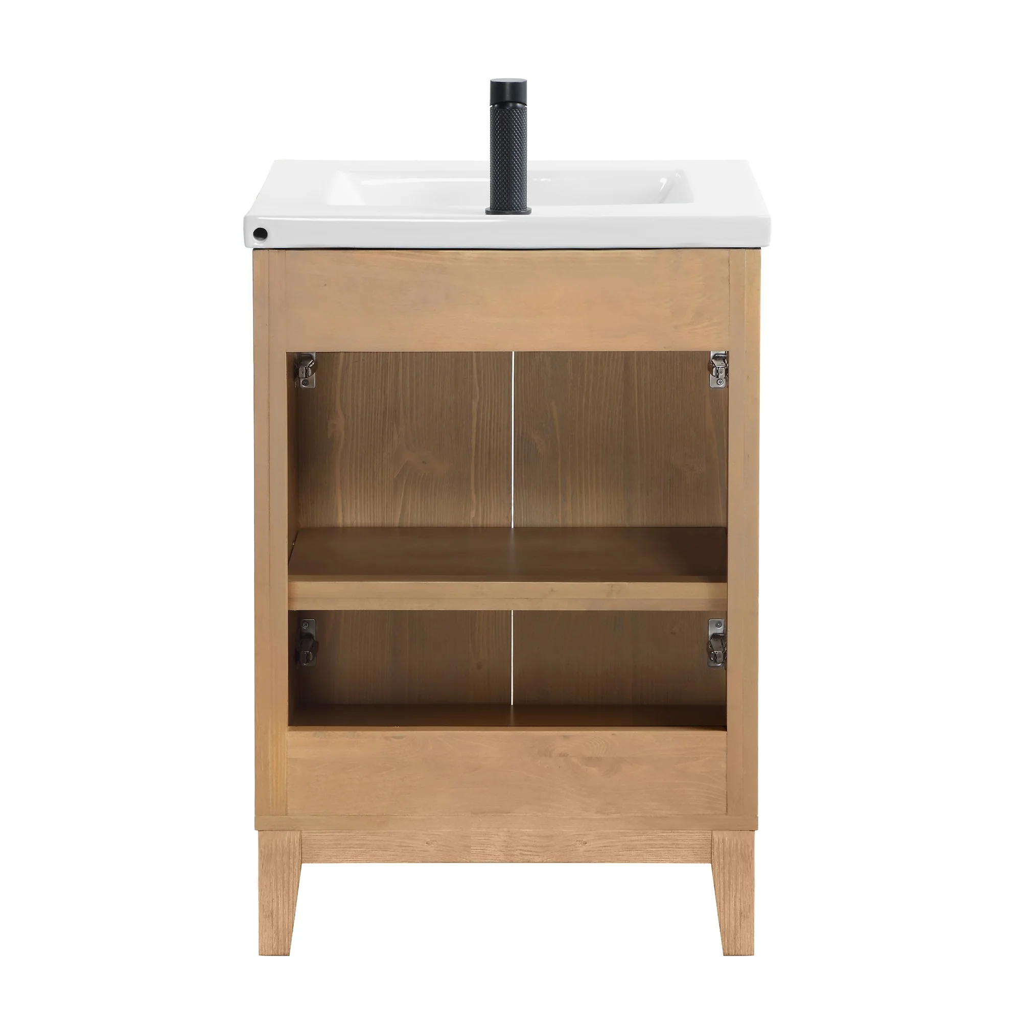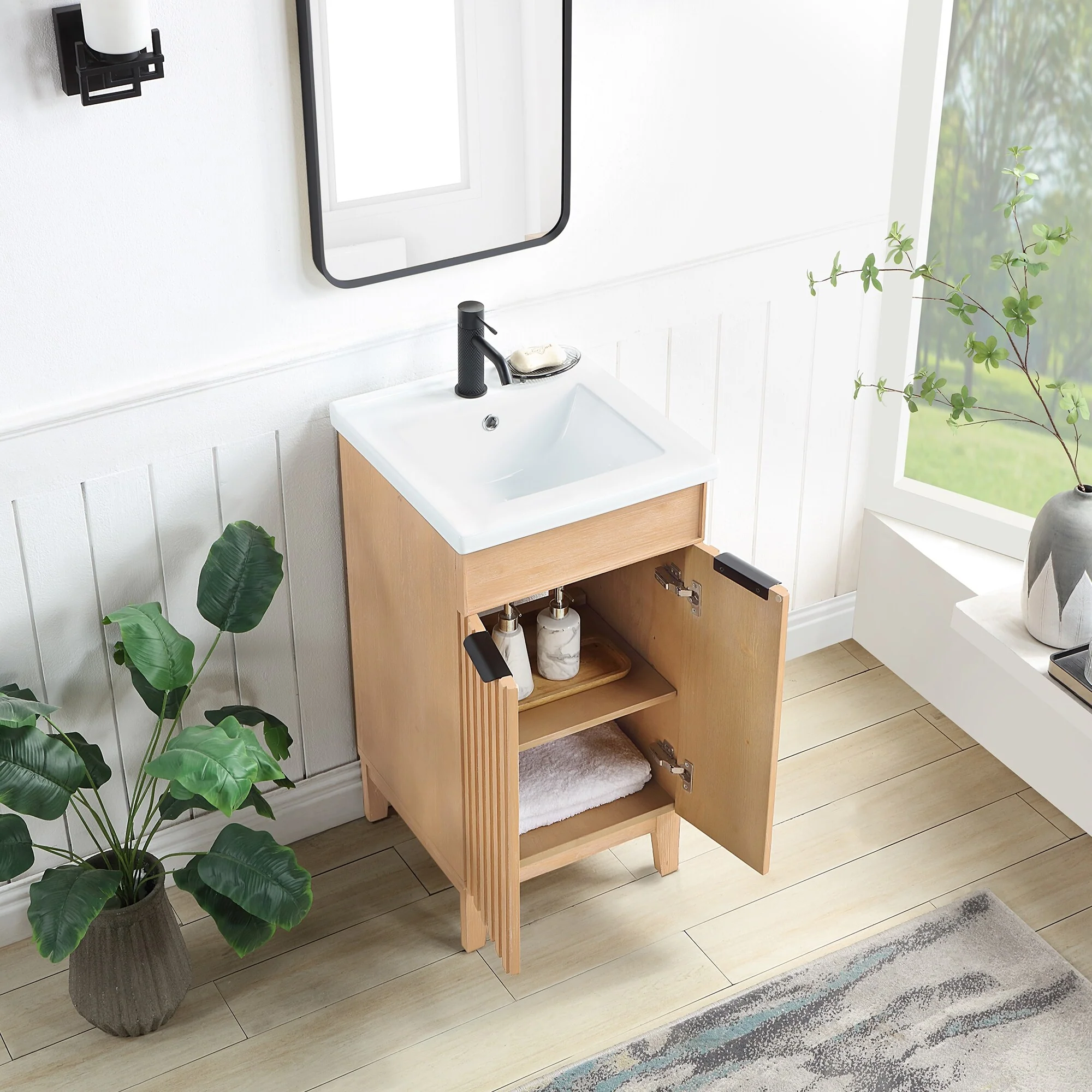 Our Palos Series Vanity—ruggedly crafted from fine solid wood and available in a trio of stunning finishes—embodies the elegance of minimalist design. It features ample storage space concealed behind grooved cabinet doors, making organizing your essentials effortless. A white drop-in white ceramic basin provides a bold pop of contrast with the textured wood to complete the contemporary look.