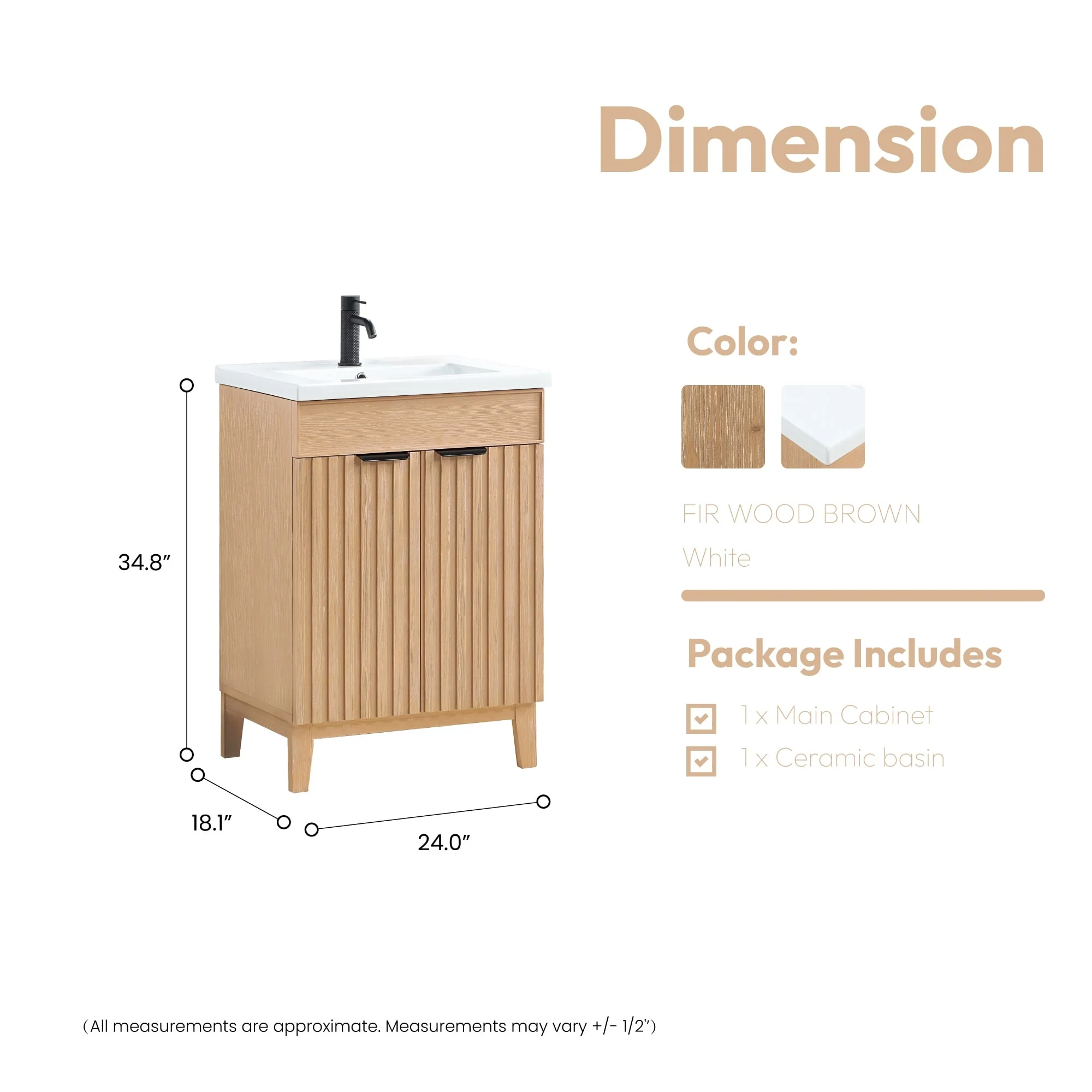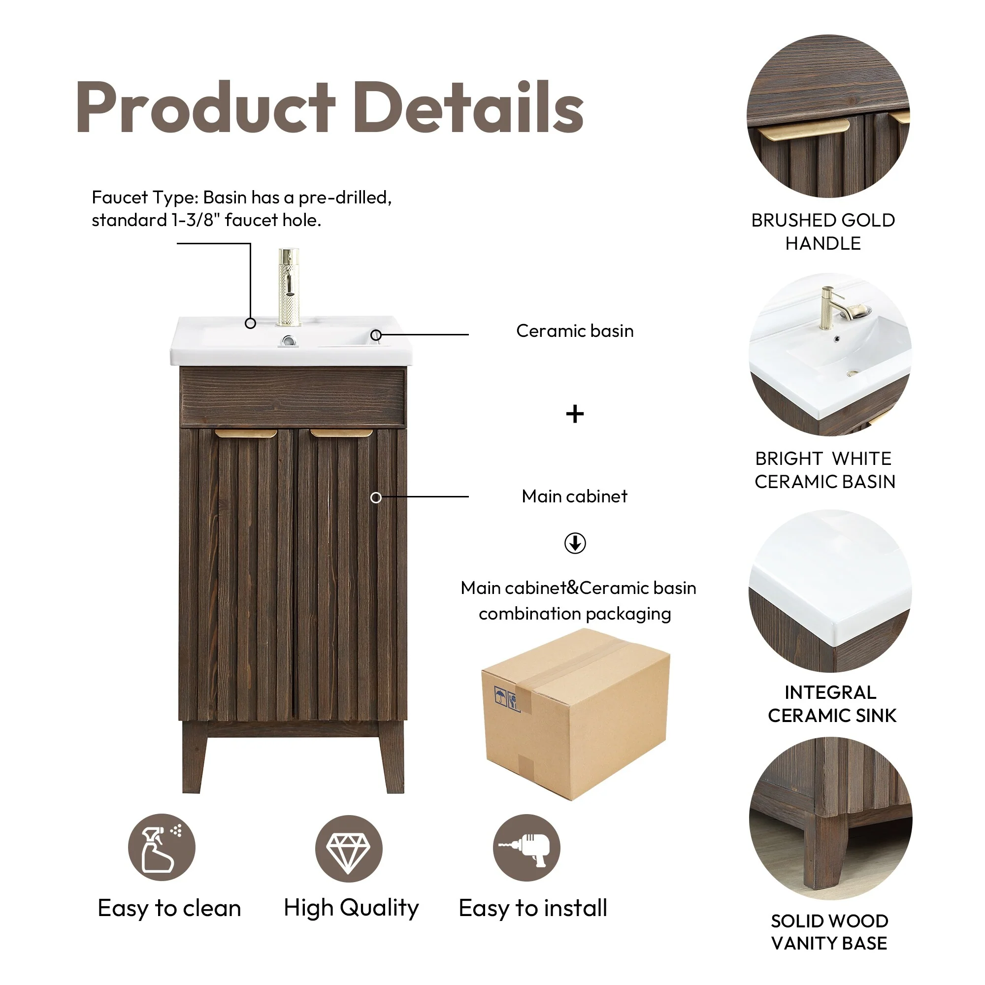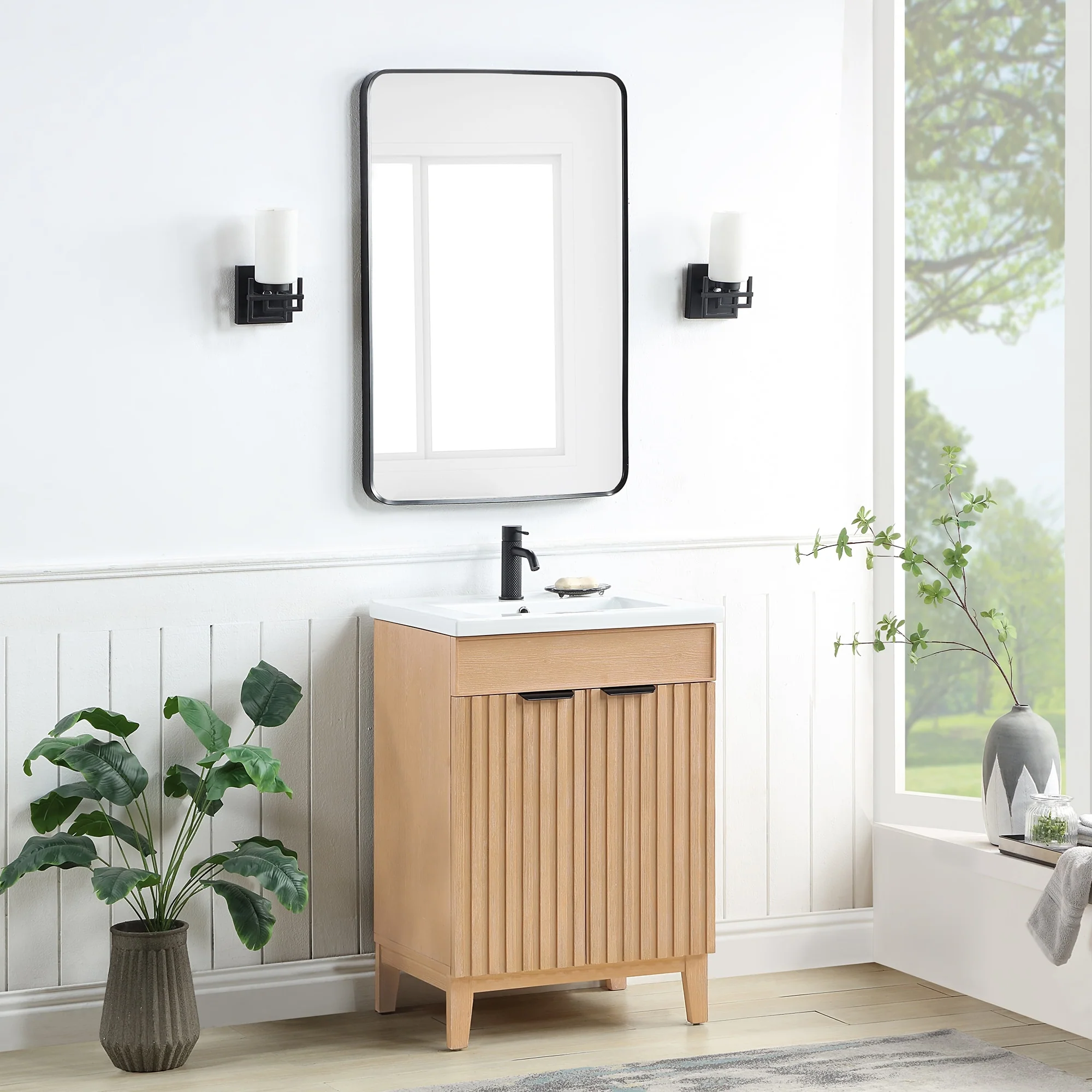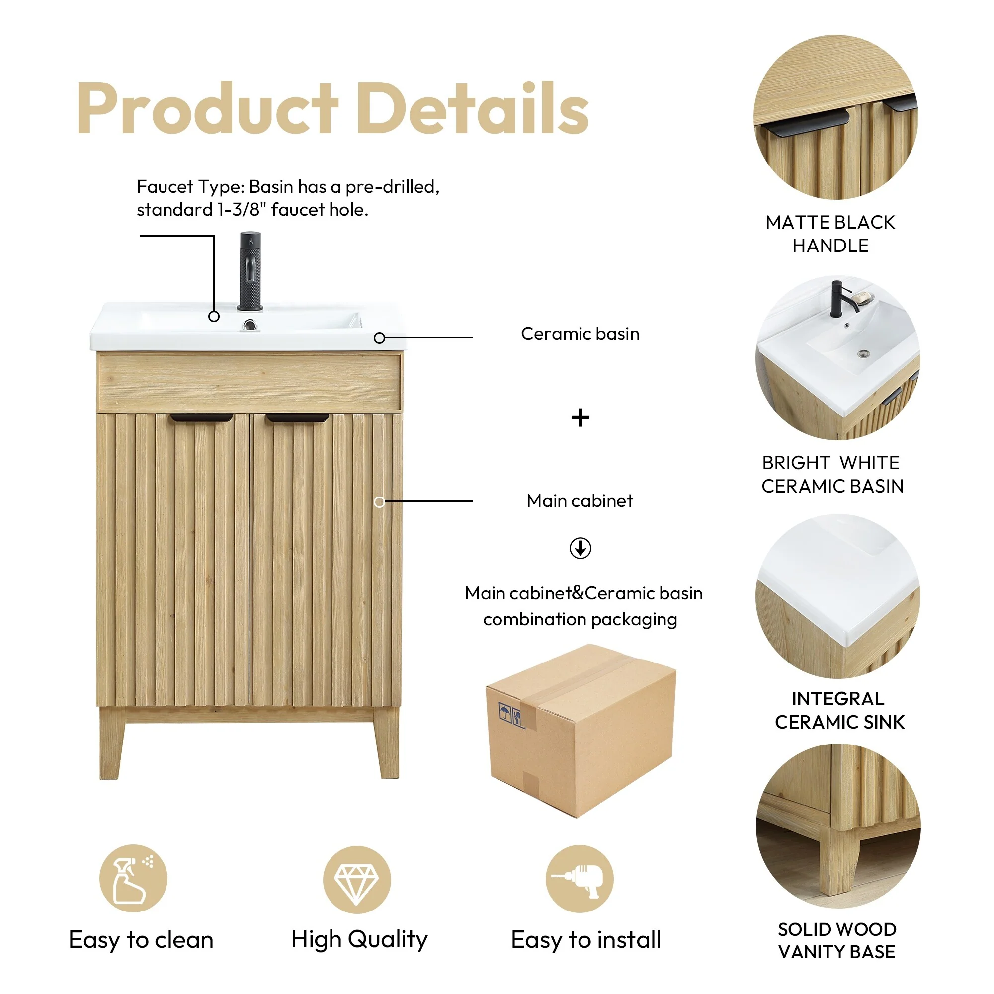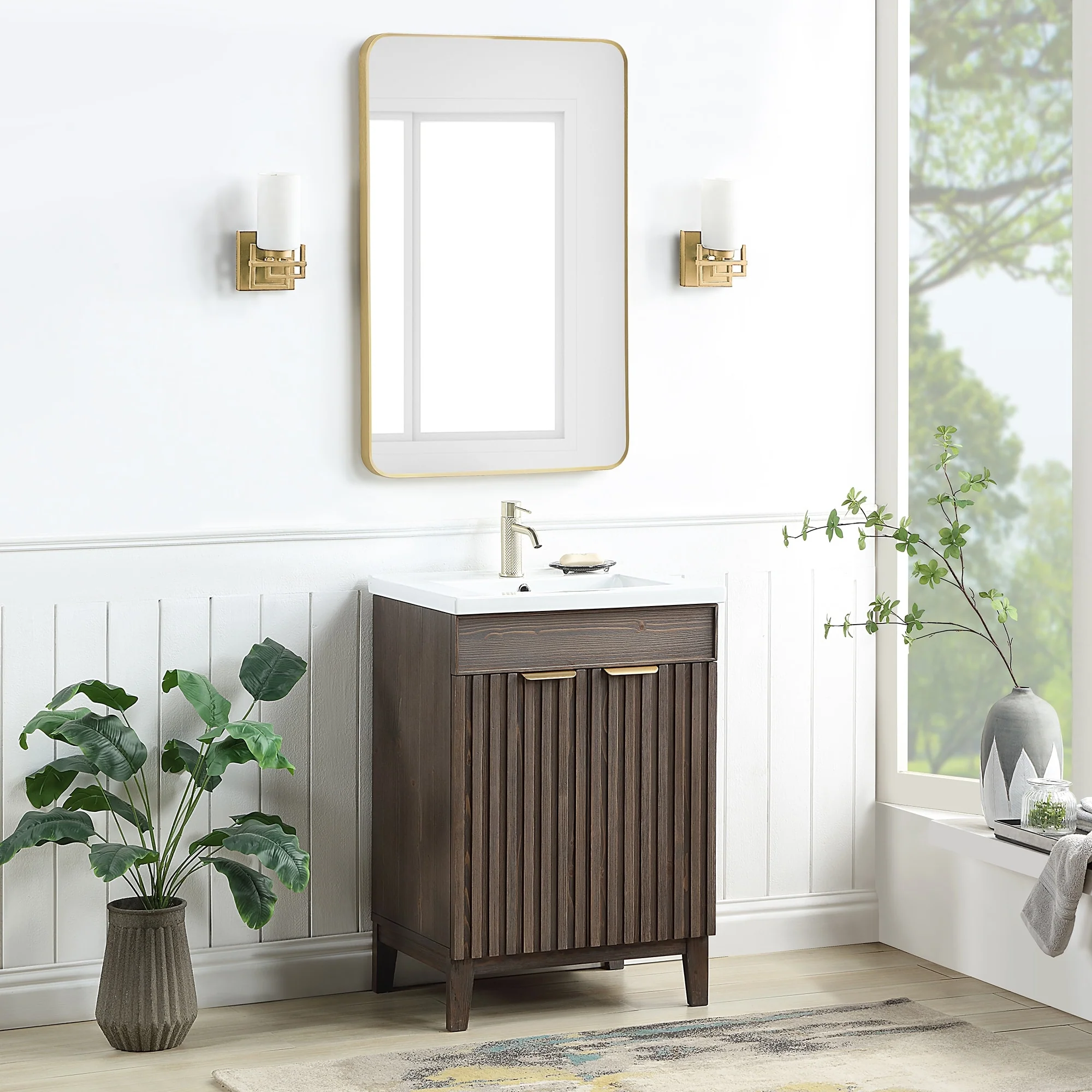 Our Palos Series Vanity—ruggedly crafted from fine solid wood and available in a trio of stunning finishes—embodies the elegance of minimalist design. It features ample storage space concealed behind grooved cabinet doors, making organizing your essentials effortless. A white drop-in white ceramic basin provides a bold pop of contrast with the textured wood to complete the contemporary look.