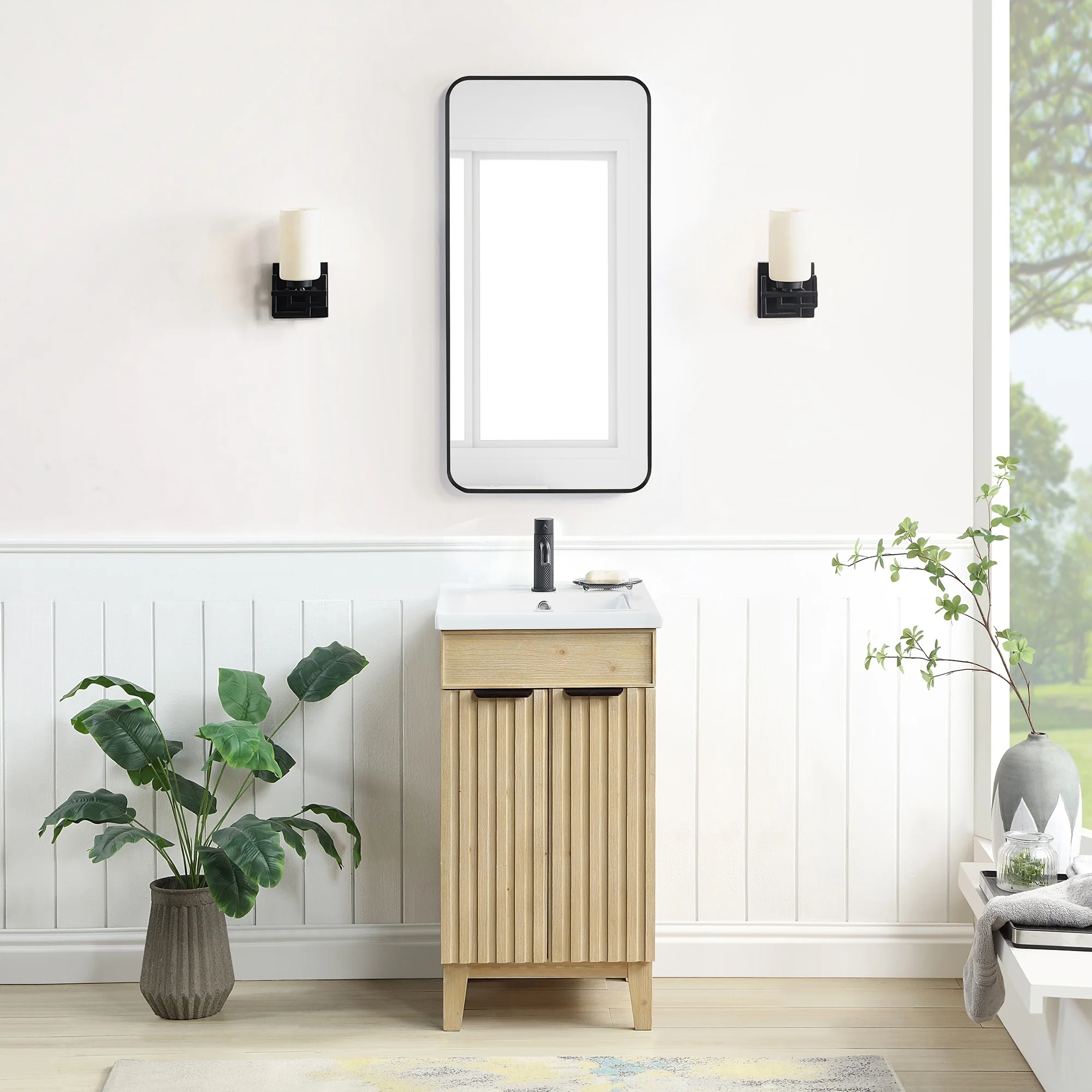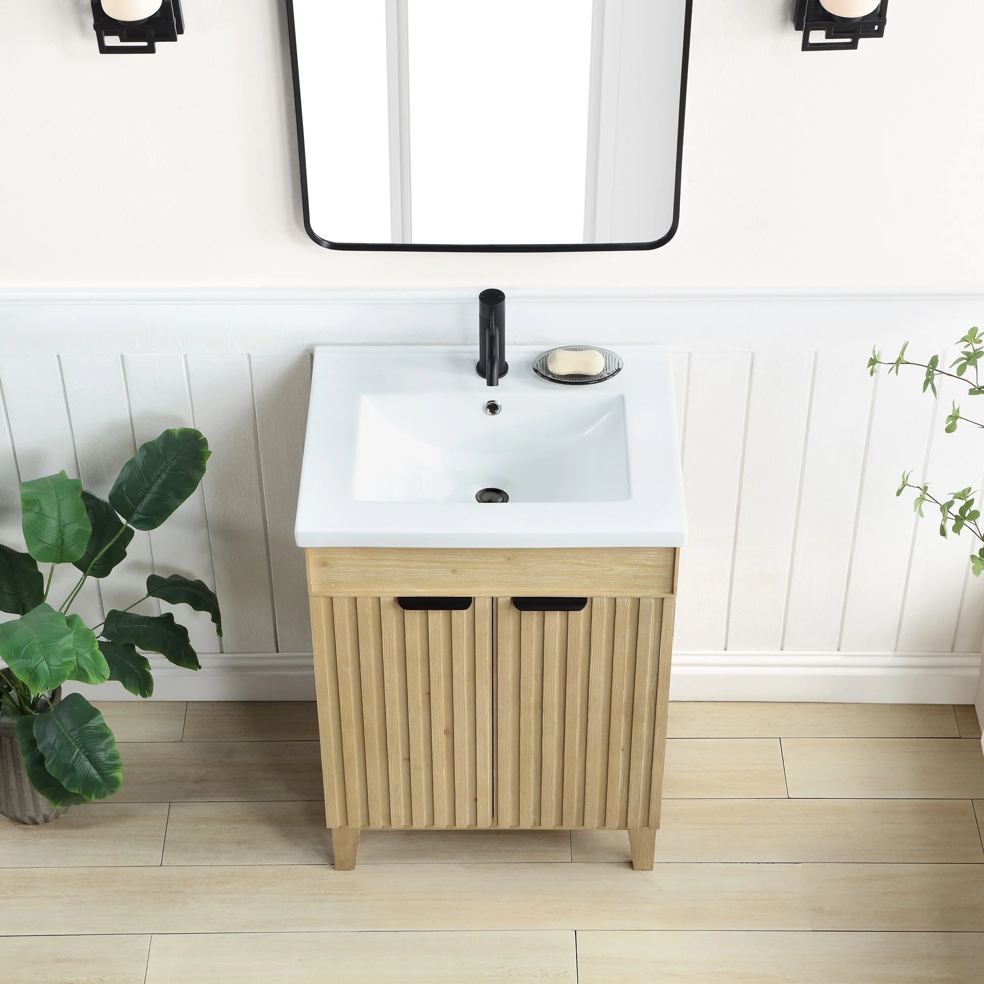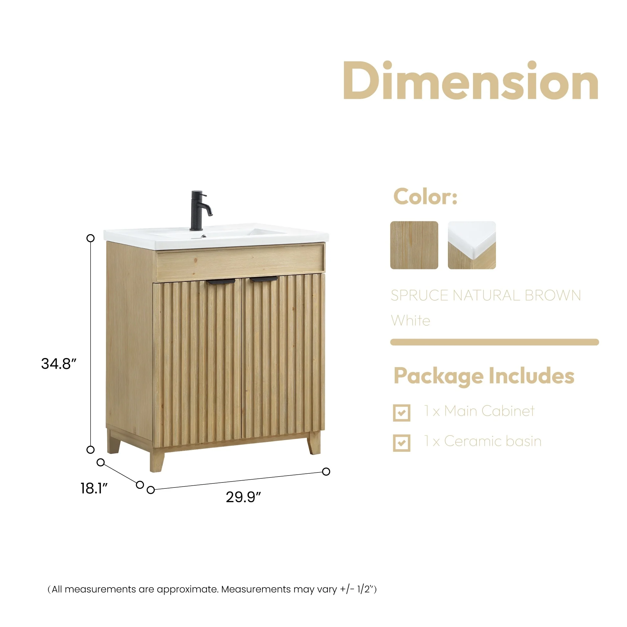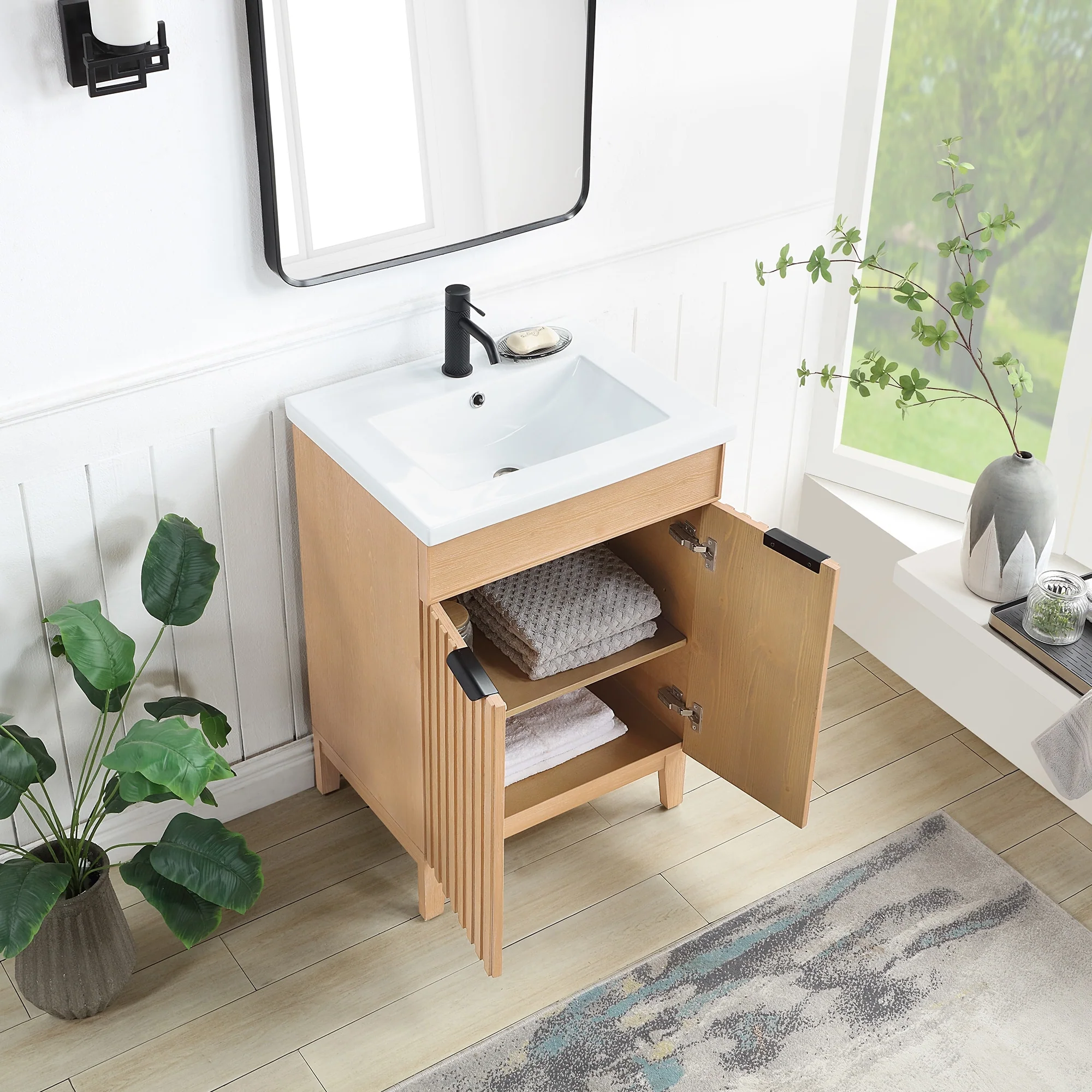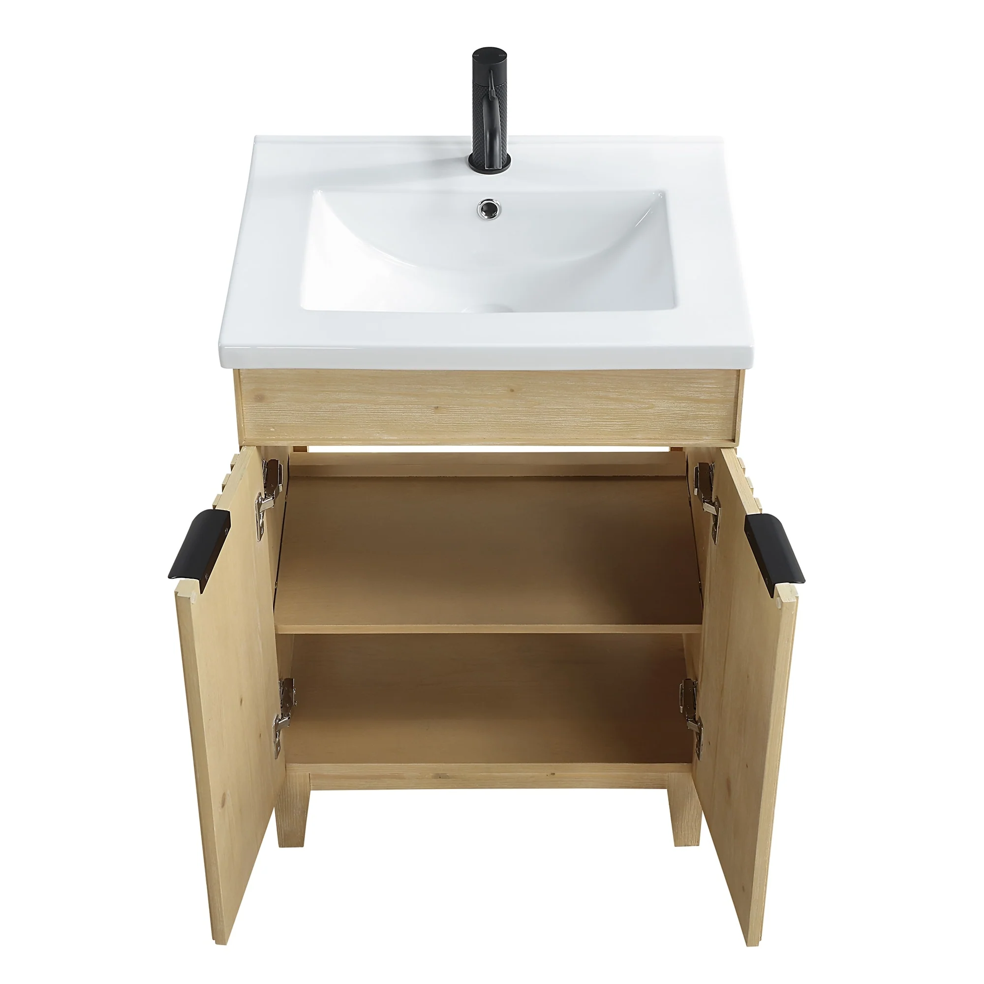 Our Palos Series Vanity—ruggedly crafted from fine solid wood and available in a trio of stunning finishes—embodies the elegance of minimalist design. It features ample storage space concealed behind grooved cabinet doors, making organizing your essentials effortless. A white drop-in white ceramic basin provides a bold pop of contrast with the textured wood to complete the contemporary look.