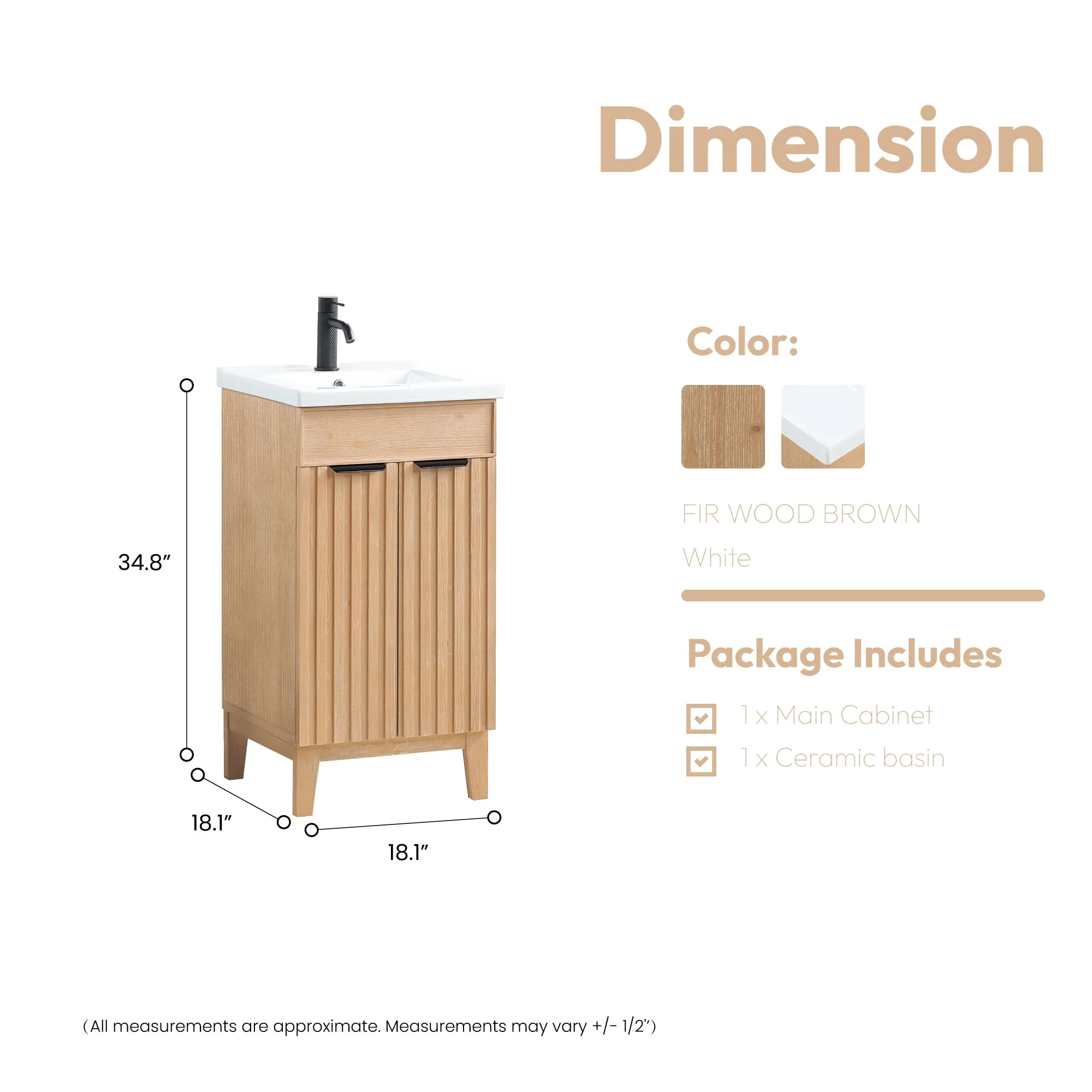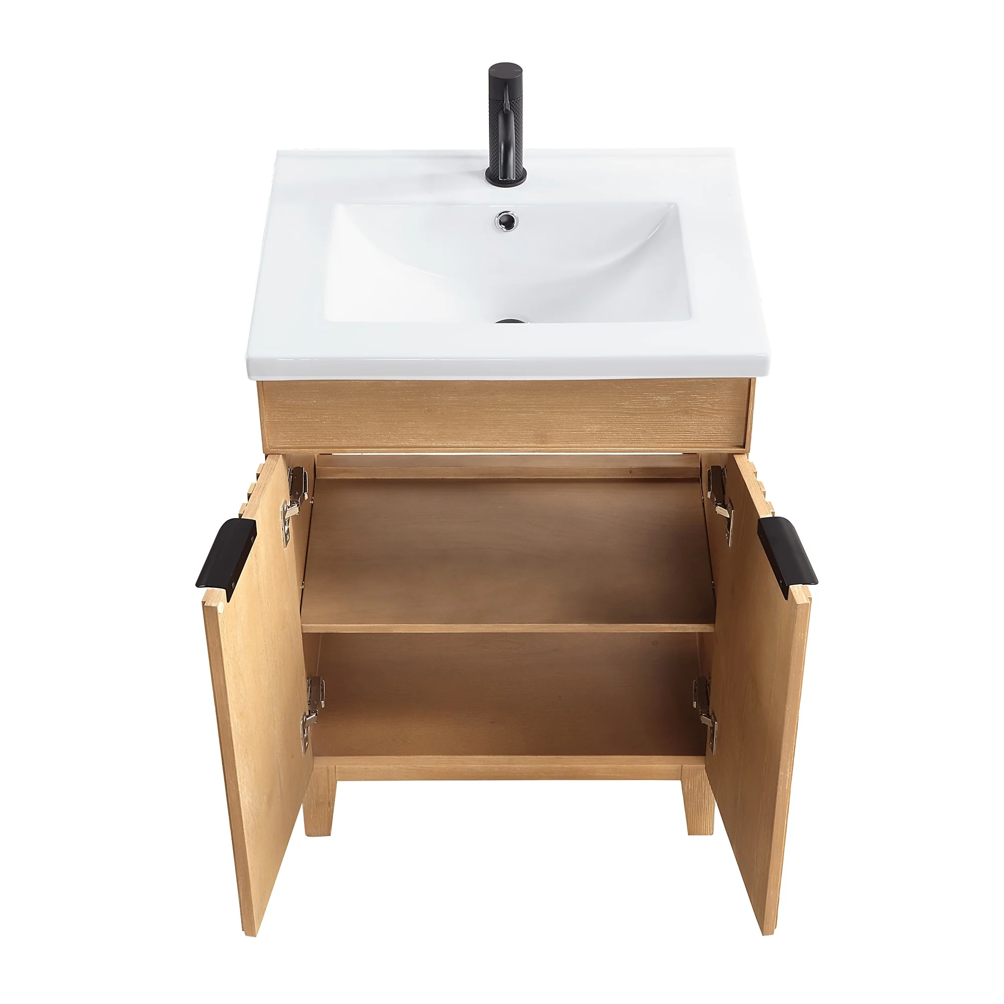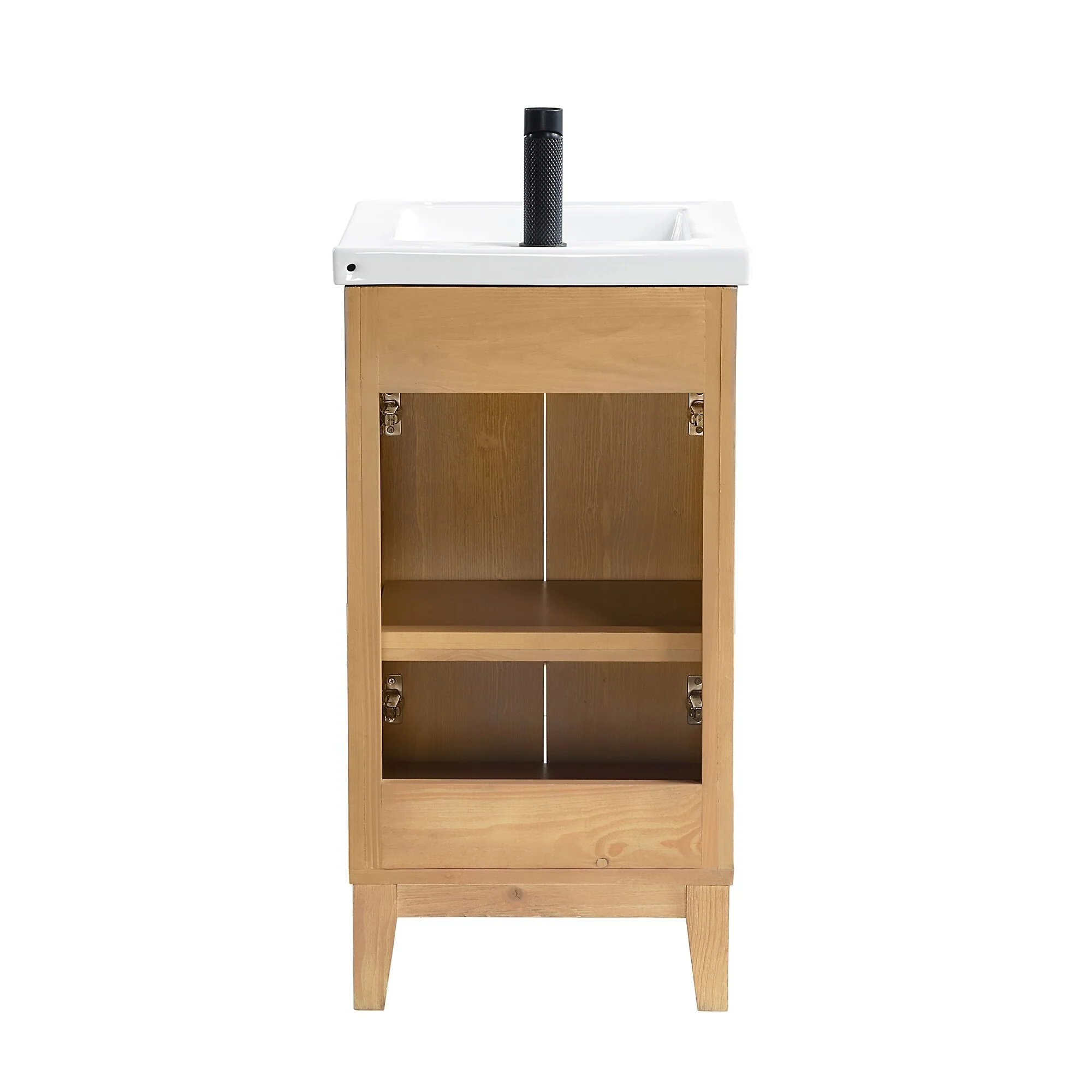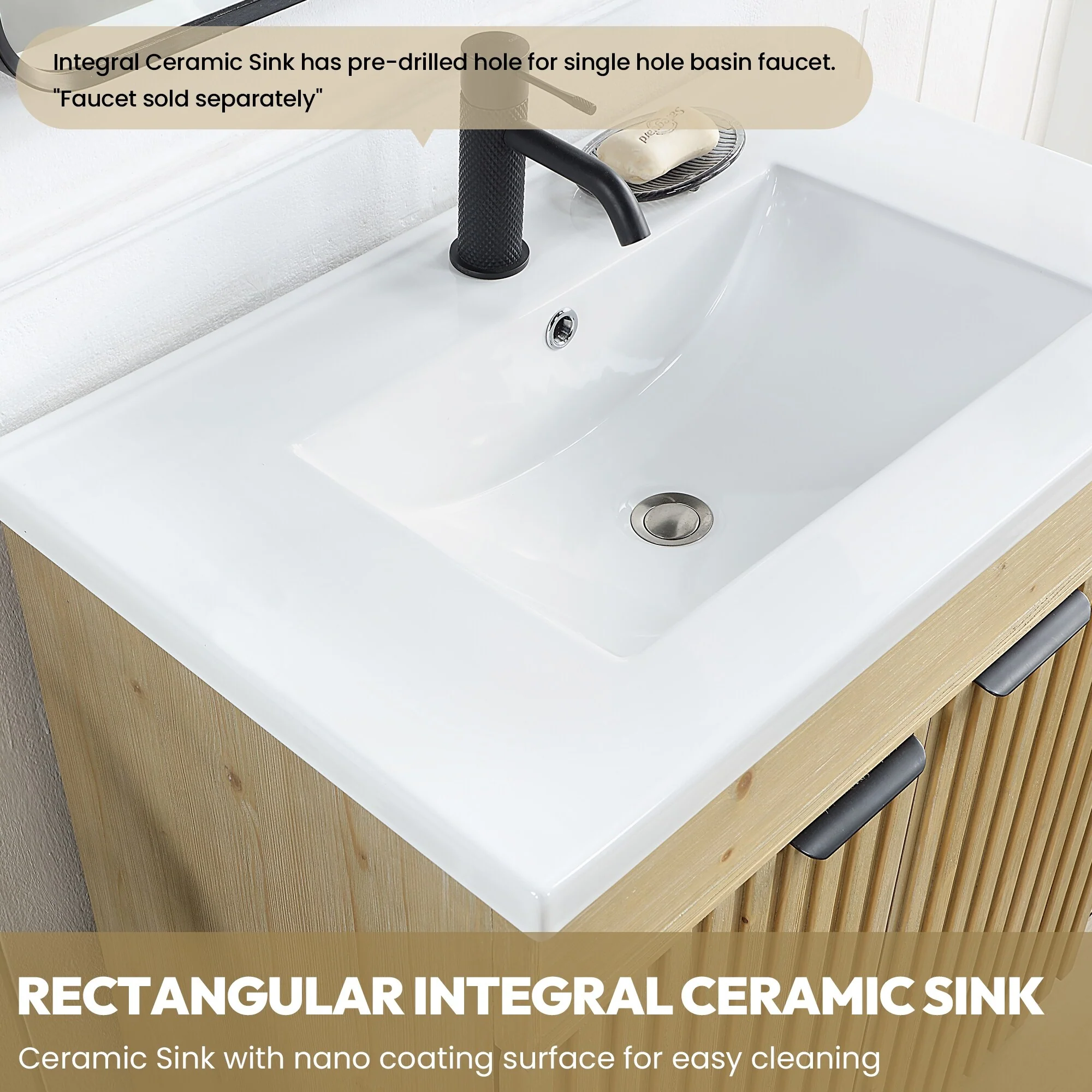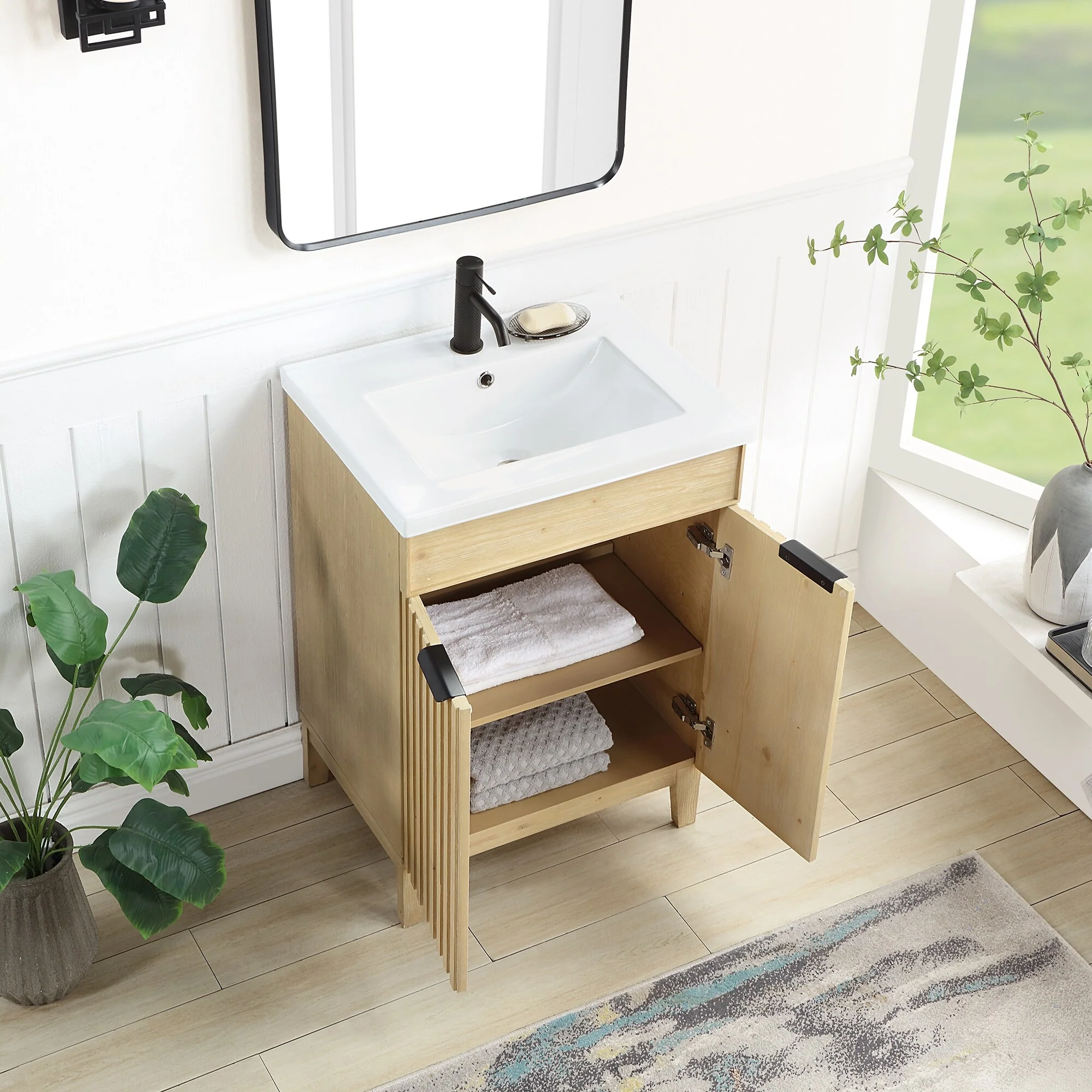 Our Palos Series Vanity—ruggedly crafted from fine solid wood and available in a trio of stunning finishes—embodies the elegance of minimalist design. It features ample storage space concealed behind grooved cabinet doors, making organizing your essentials effortless. A white drop-in white ceramic basin provides a bold pop of contrast with the textured wood to complete the contemporary look.