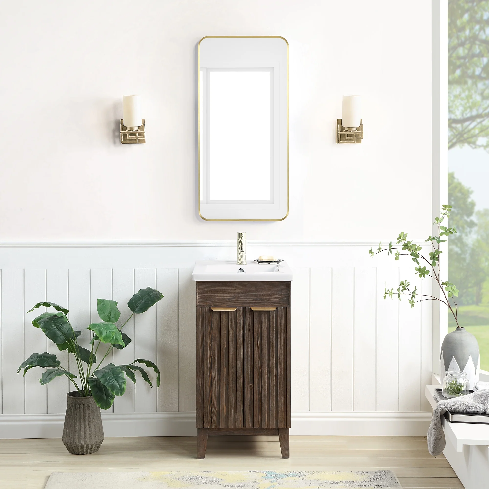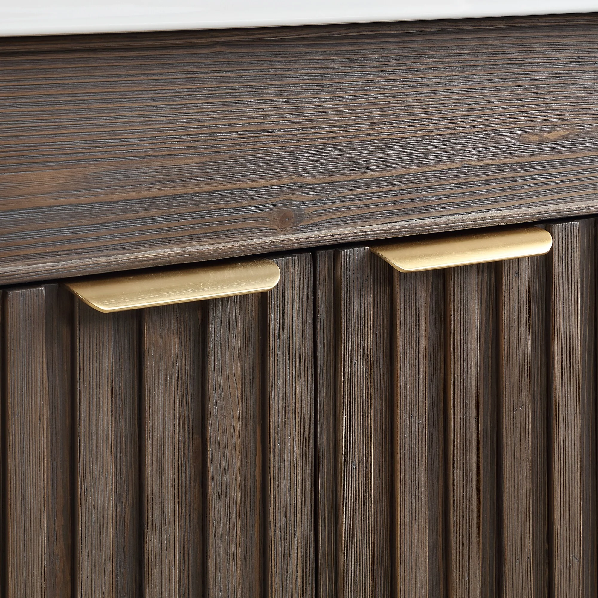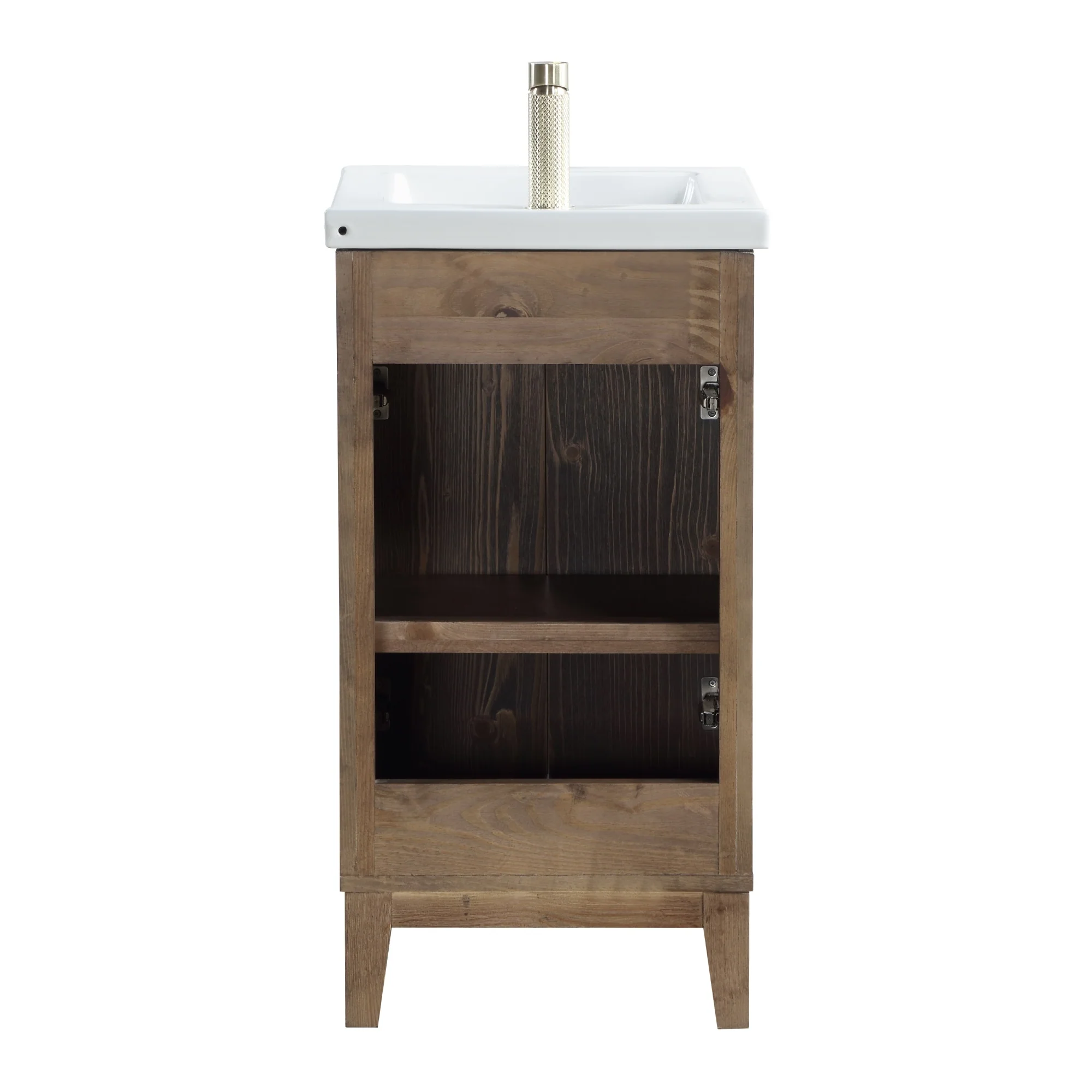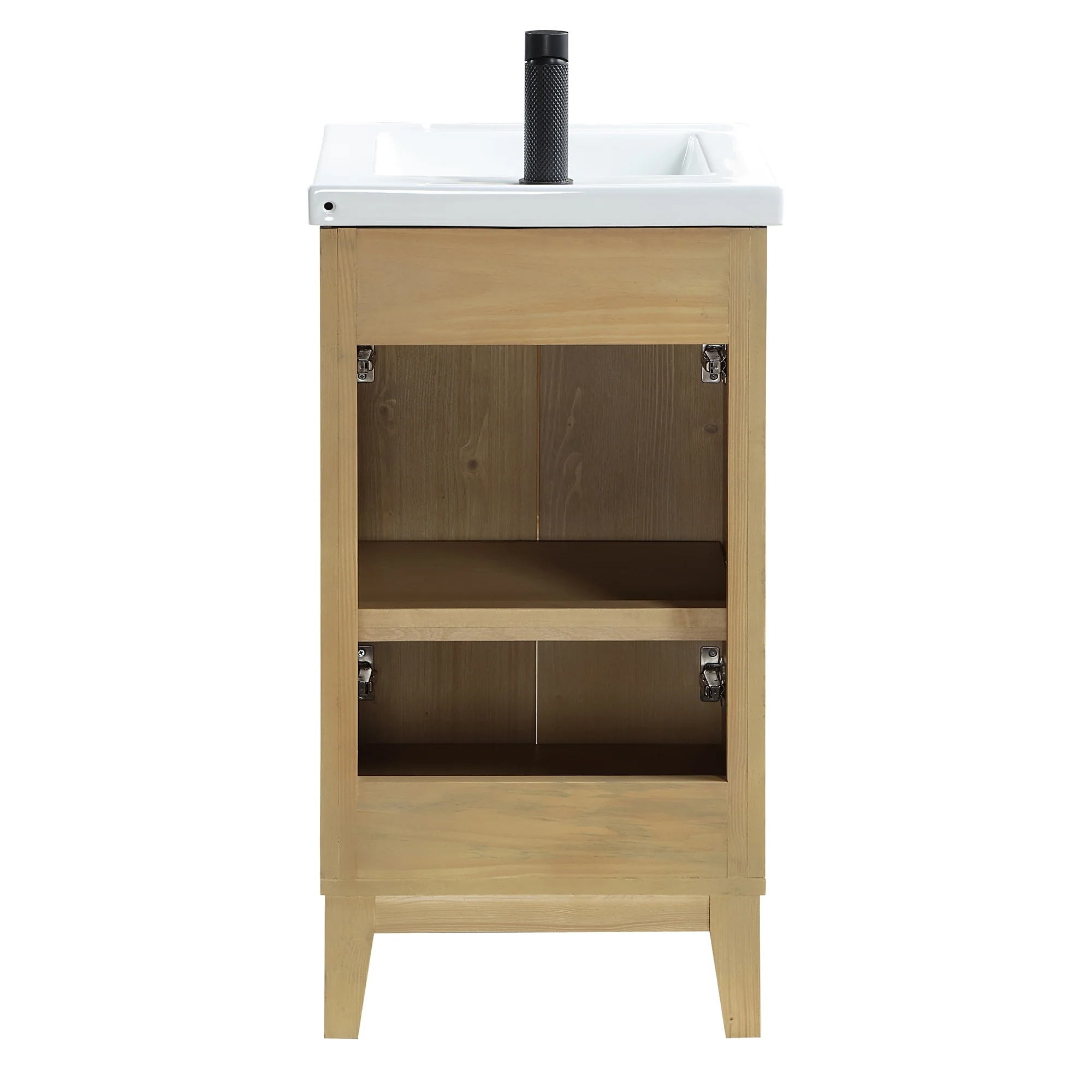 Our Palos Series Vanity—ruggedly crafted from fine solid wood and available in a trio of stunning finishes—embodies the elegance of minimalist design. It features ample storage space concealed behind grooved cabinet doors, making organizing your essentials effortless. A white drop-in white ceramic basin provides a bold pop of contrast with the textured wood to complete the contemporary look.