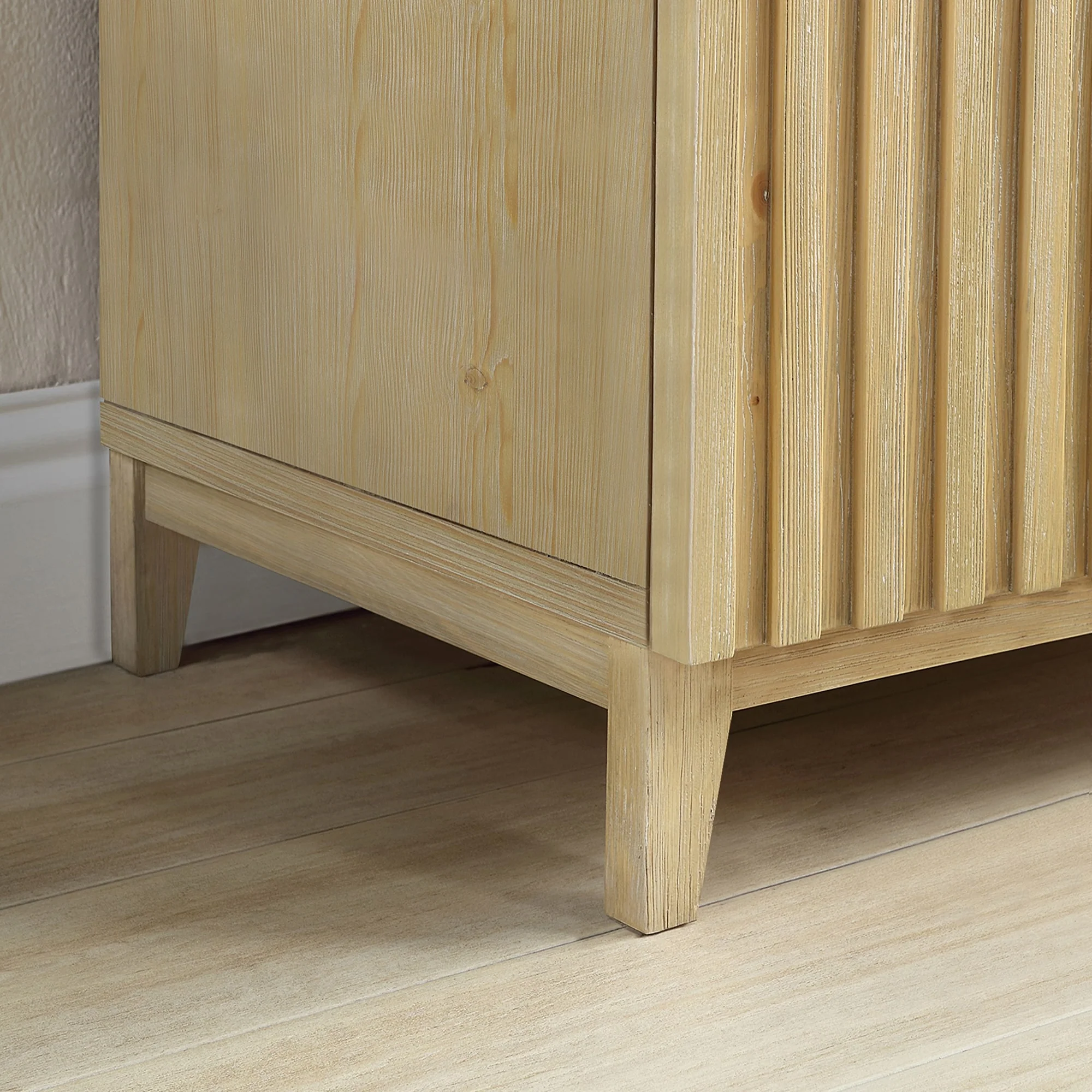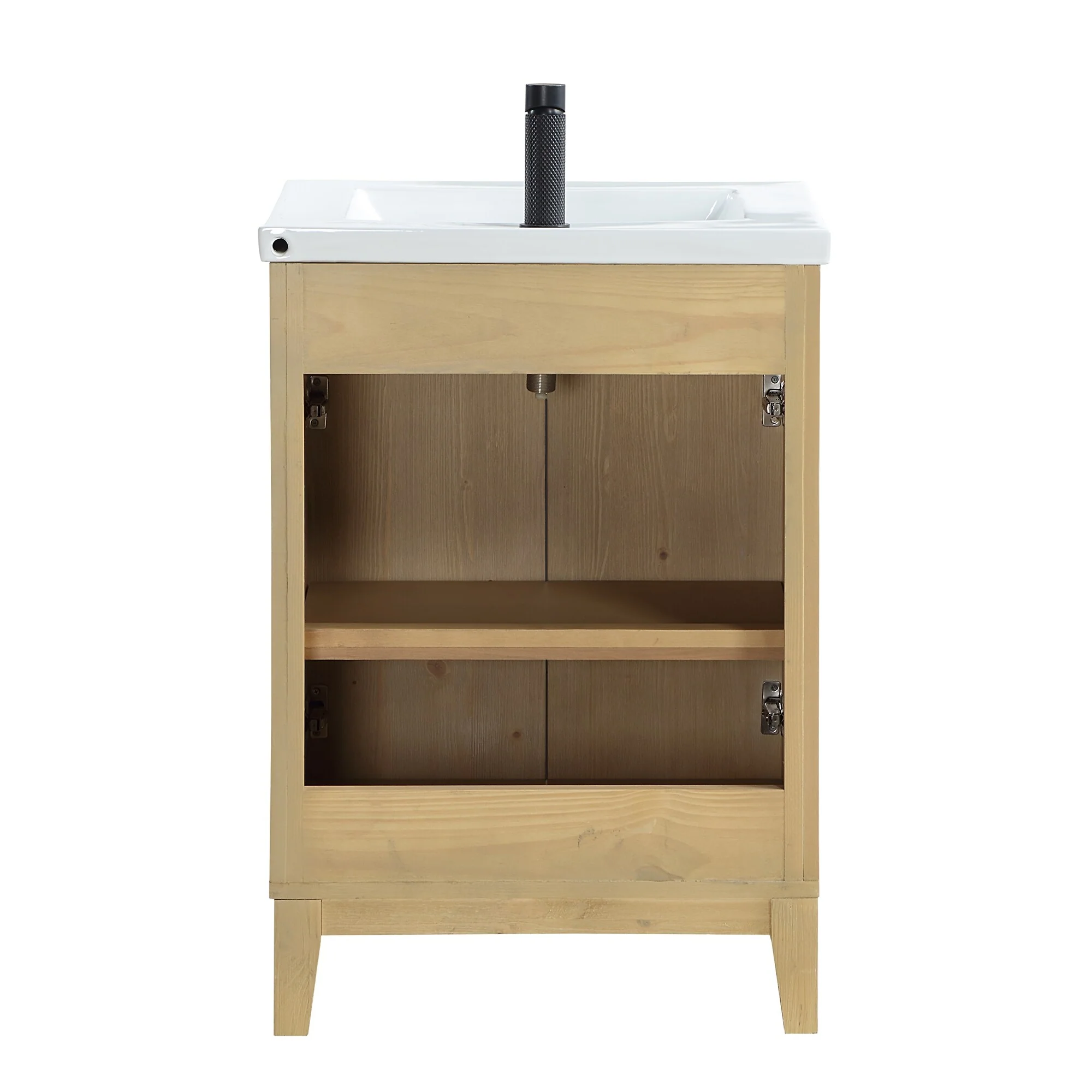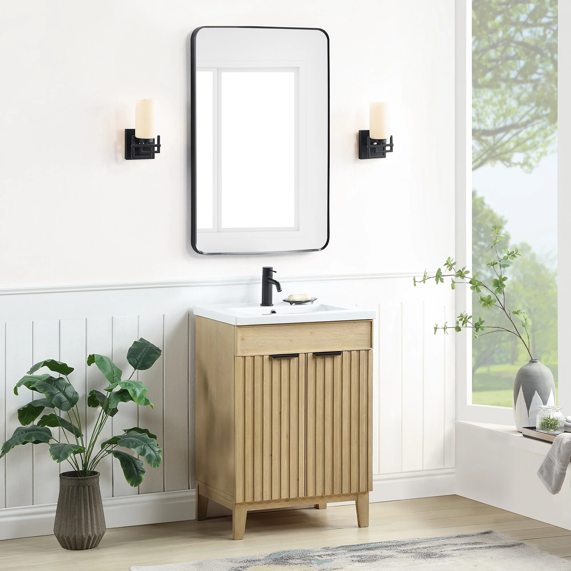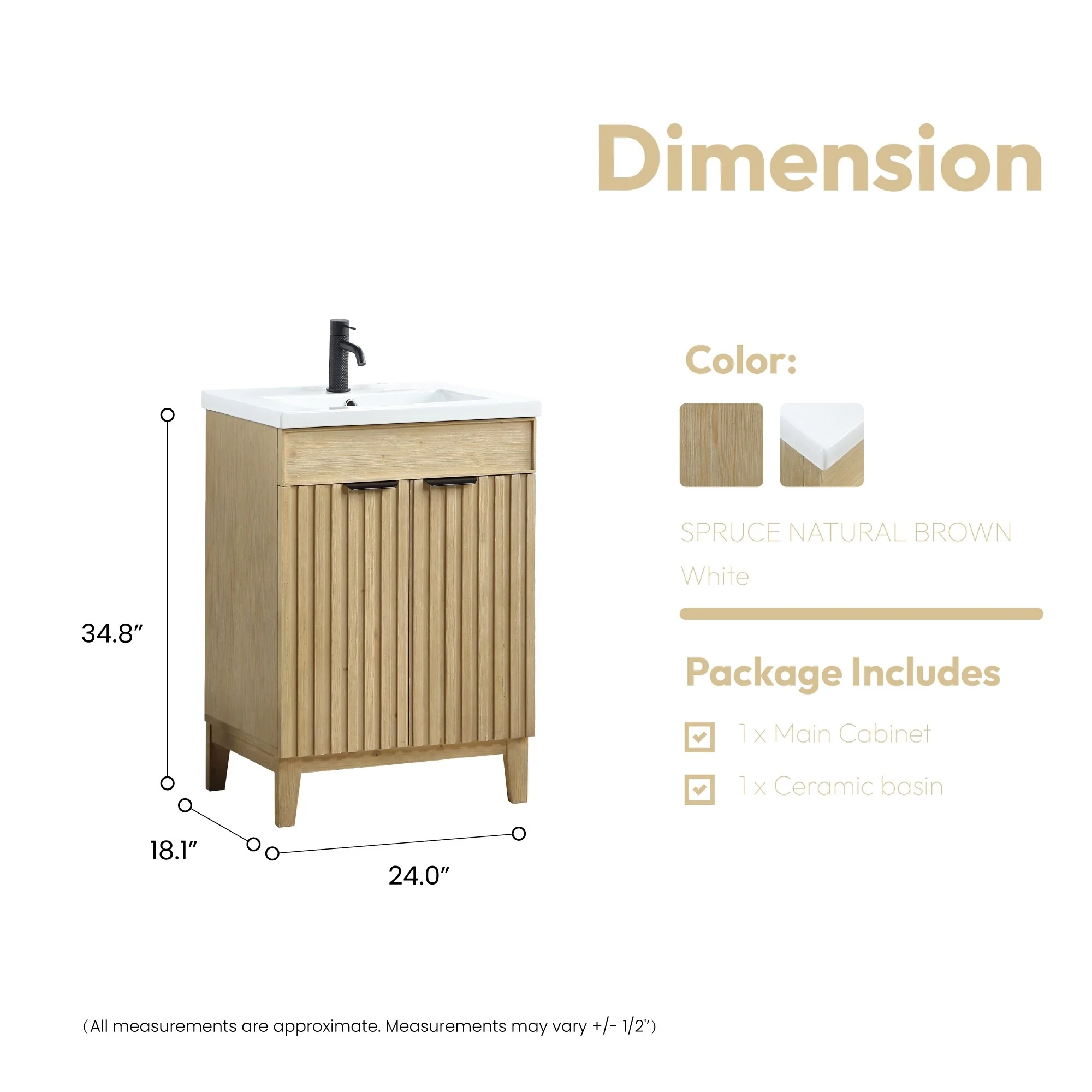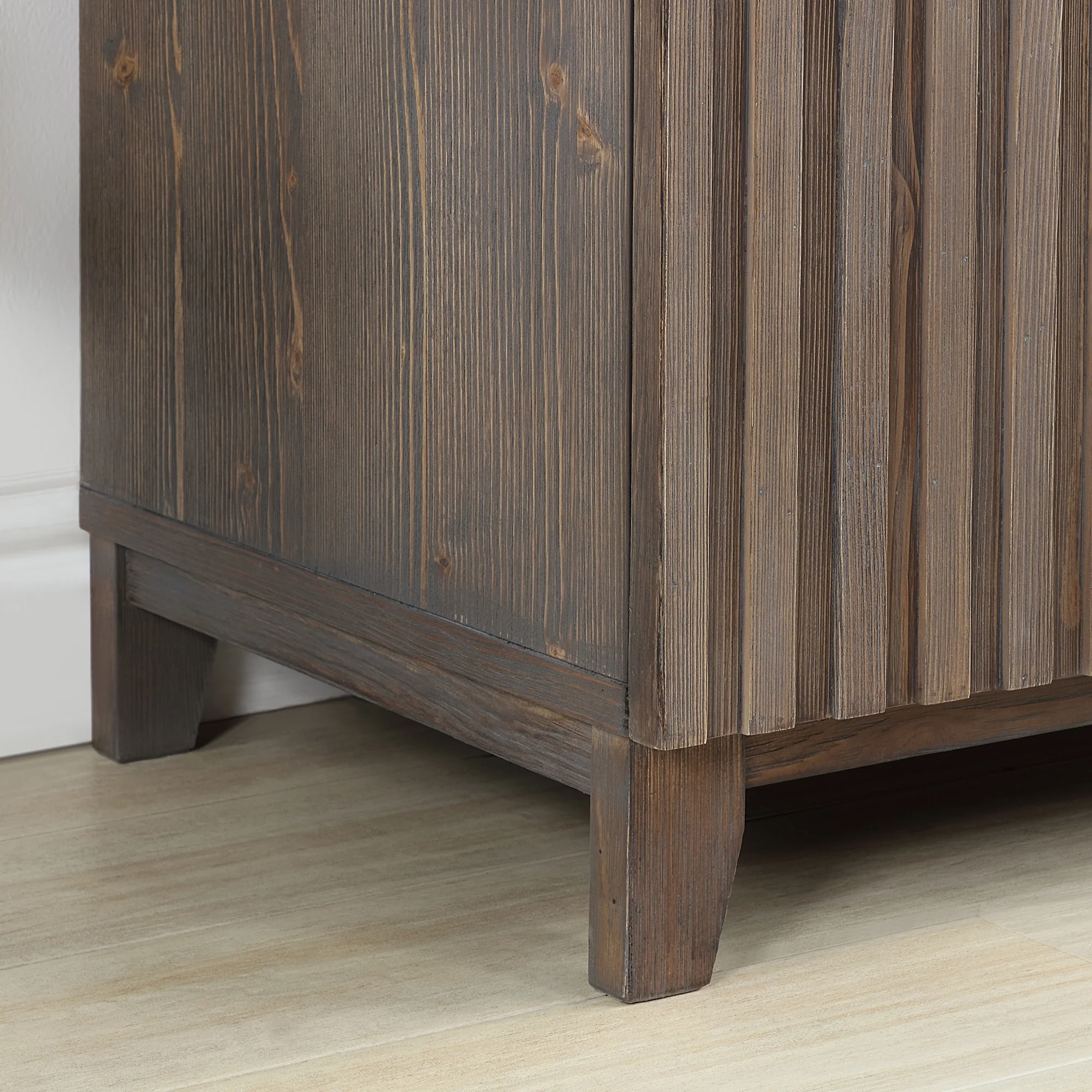Our Palos Series Vanity—ruggedly crafted from fine solid wood and available in a trio of stunning finishes—embodies the elegance of minimalist design. It features ample storage space concealed behind grooved cabinet doors, making organizing your essentials effortless. A white drop-in white ceramic basin provides a bold pop of contrast with the textured wood to complete the contemporary look.