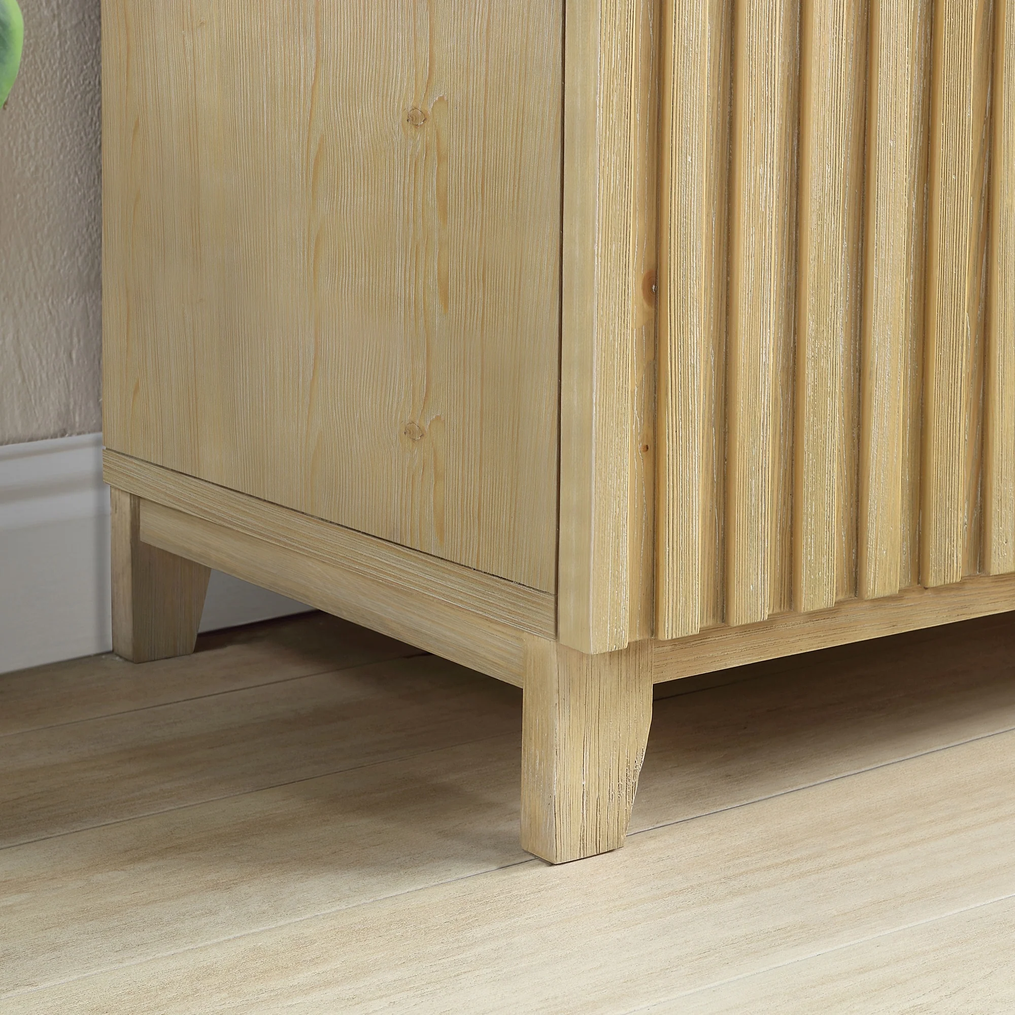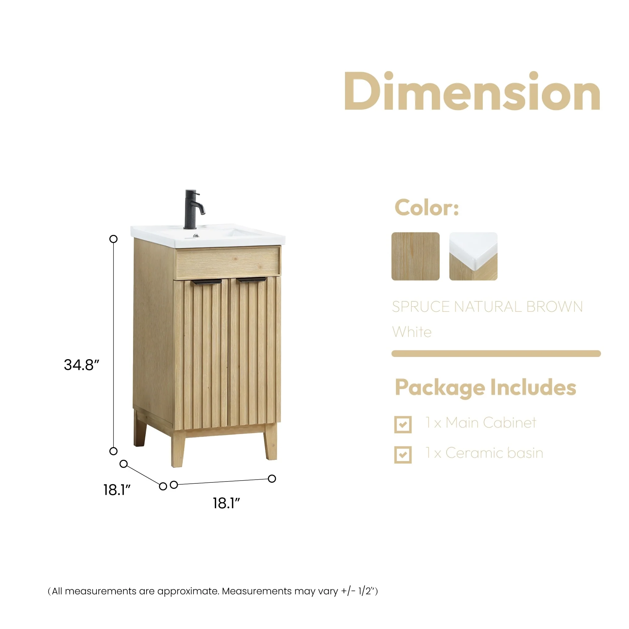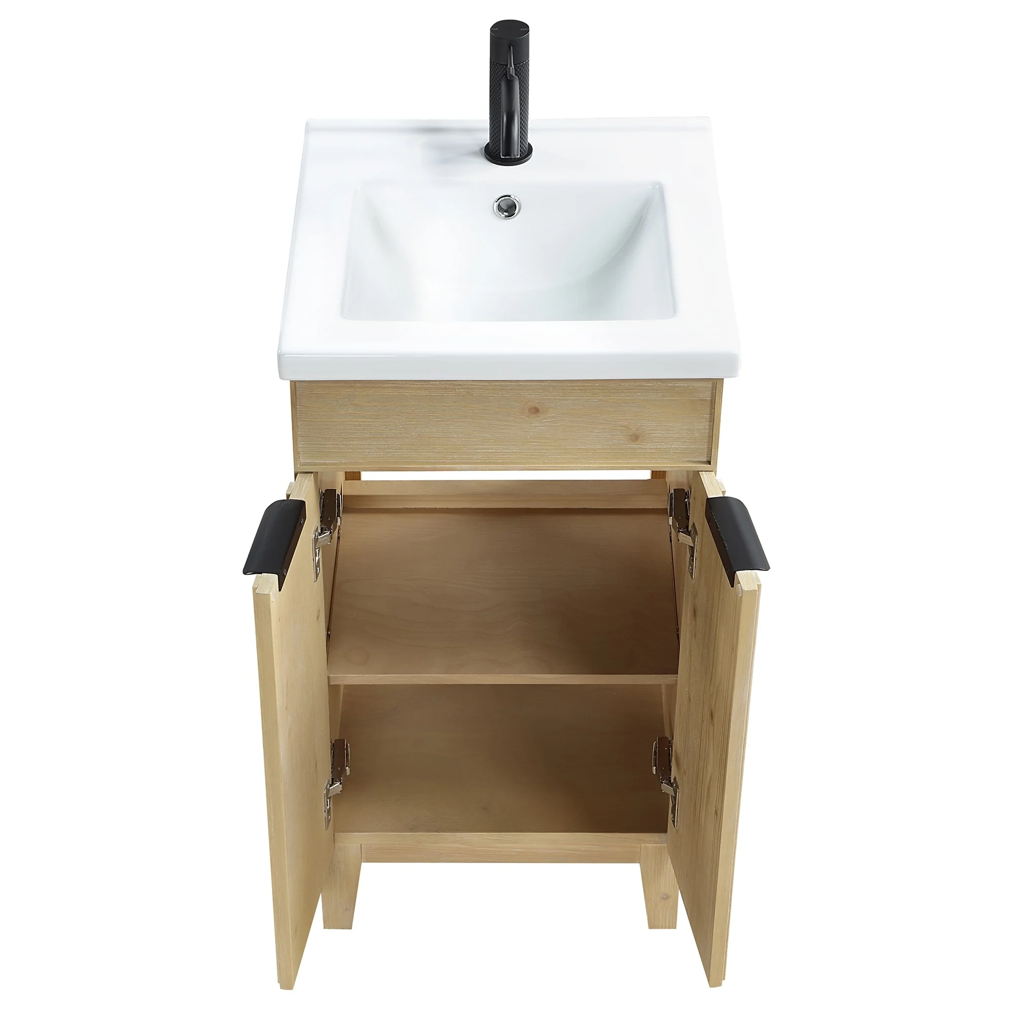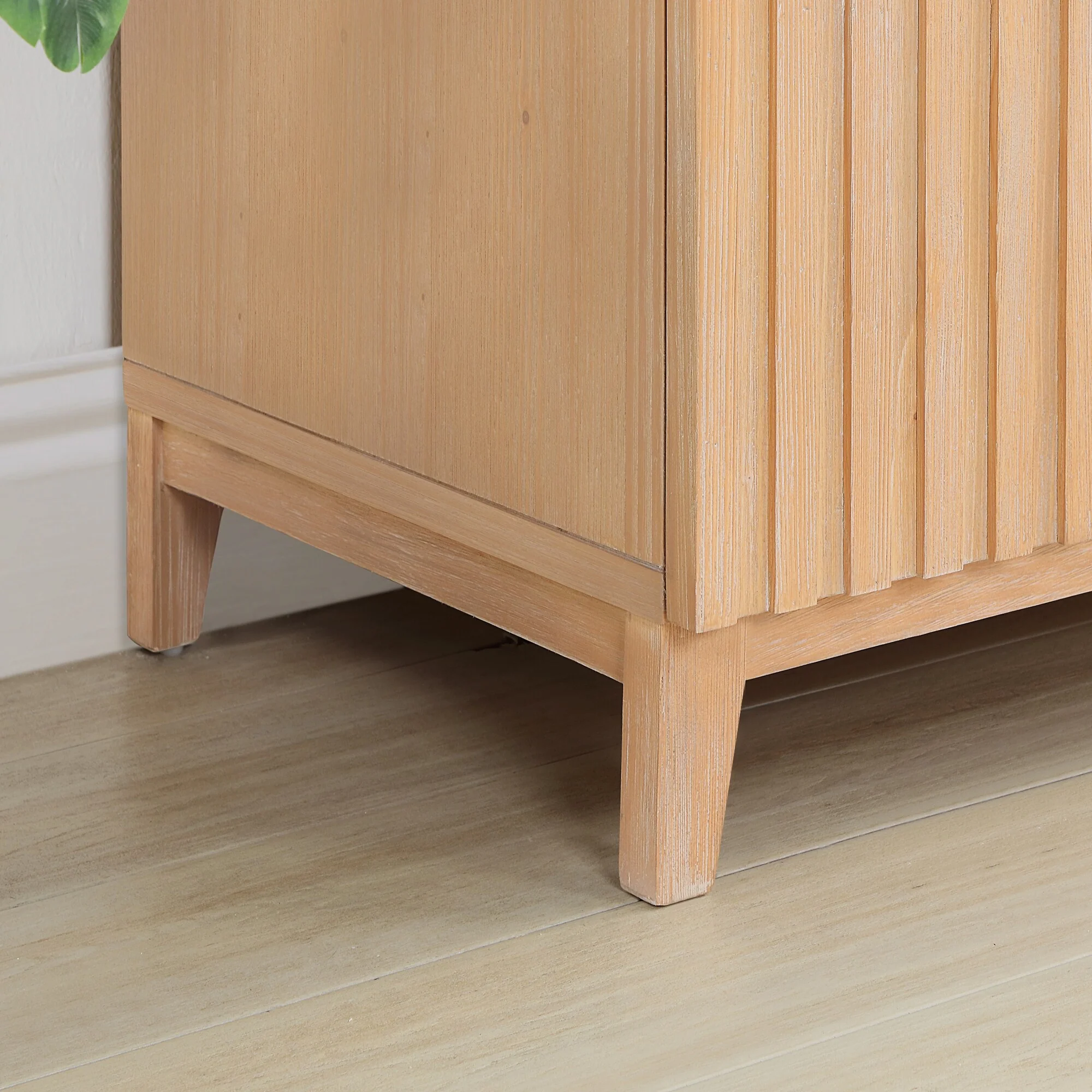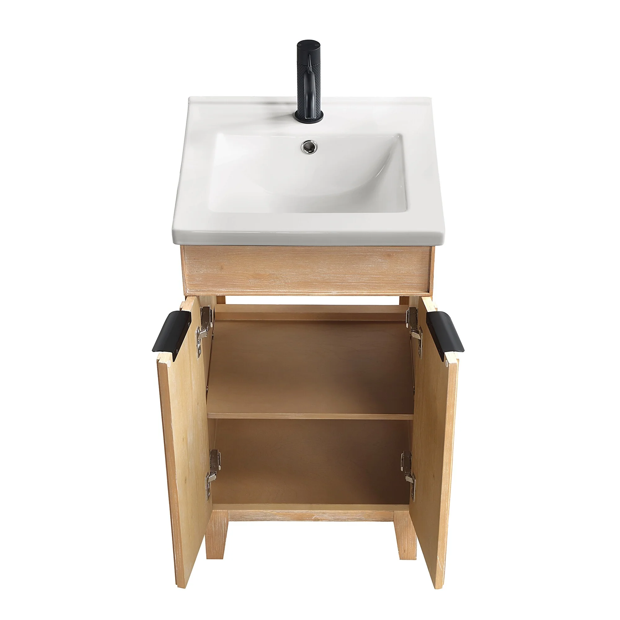 Our Palos Series Vanity—ruggedly crafted from fine solid wood and available in a trio of stunning finishes—embodies the elegance of minimalist design. It features ample storage space concealed behind grooved cabinet doors, making organizing your essentials effortless. A white drop-in white ceramic basin provides a bold pop of contrast with the textured wood to complete the contemporary look.