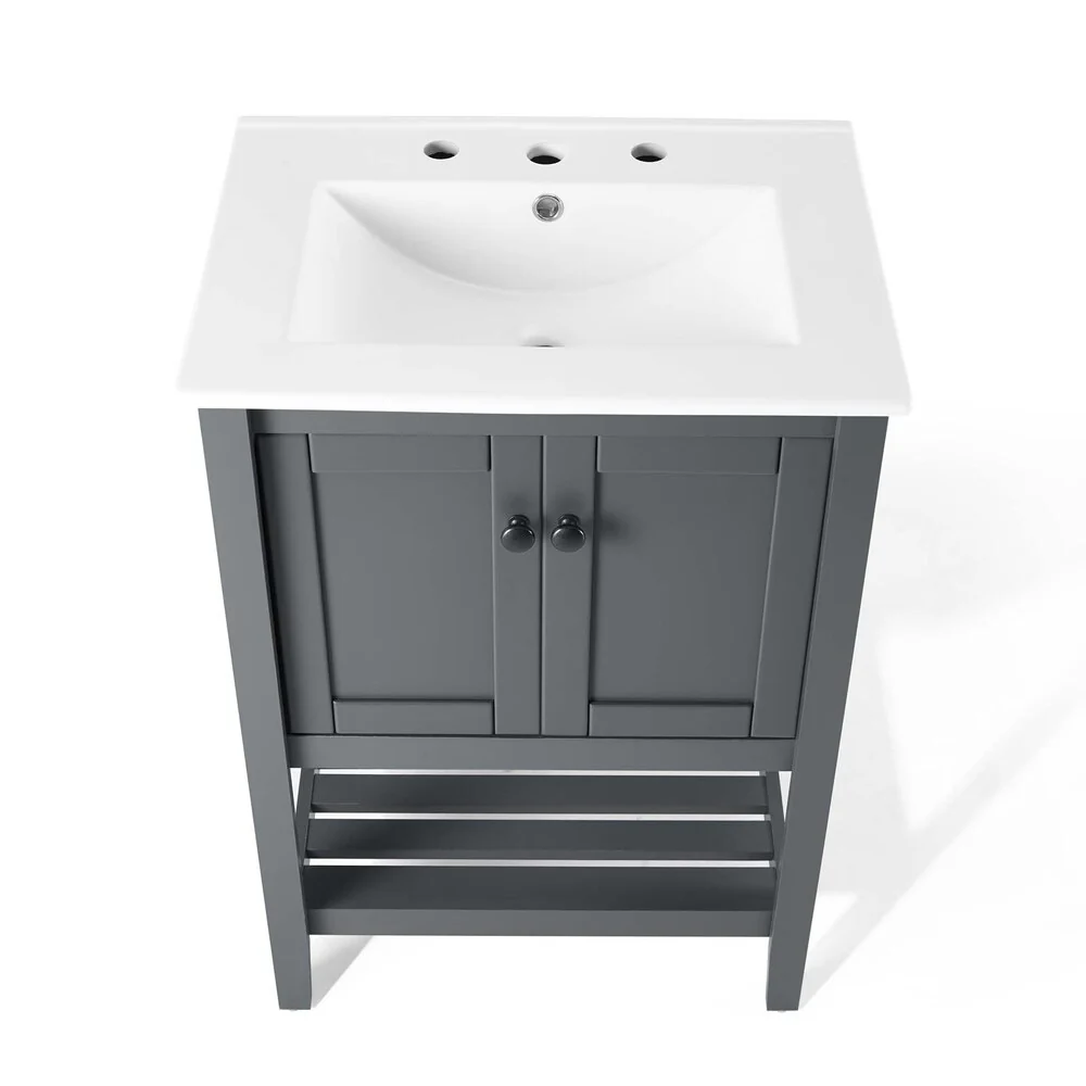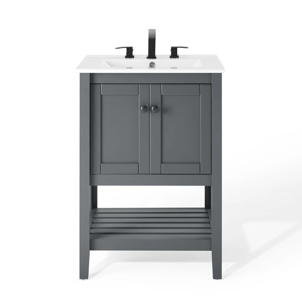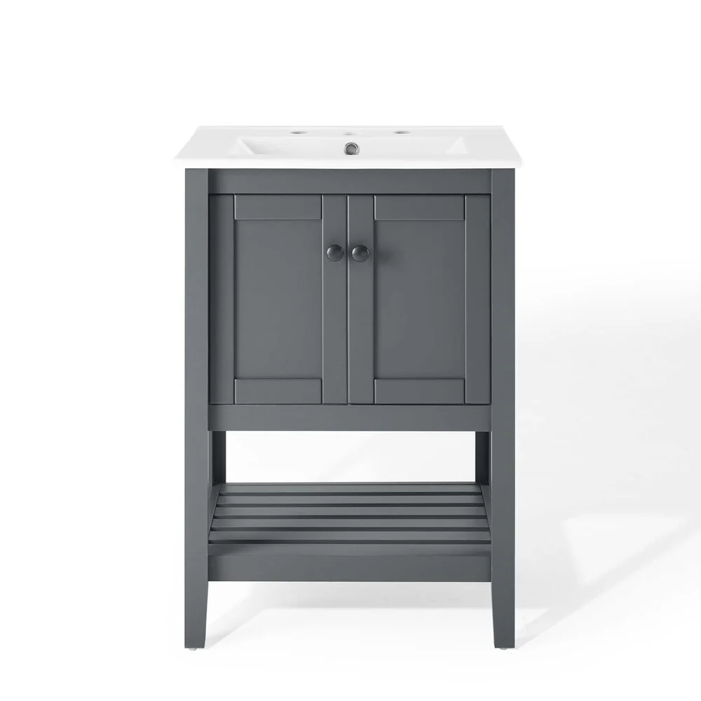 Introduce a modern touch to your bathroom with the Prestige Bathroom Vanity. The vanity is a perfect blend of rustic and contemporary styles, featuring a vertical slat design on the side panel. Crafted from high-quality wood and MDF particleboard, this vanity includes soft-close doors, an interior hidden storage area, and a slatted open exterior shelf. The curved sink basin has 8-inch centerset faucet holes and an integrated ceramic top. With non-marking foot caps to protect your flooring, this elegant vanity is a must-have addition to your bathroom. Assembly is required, fixtures sold separately.
