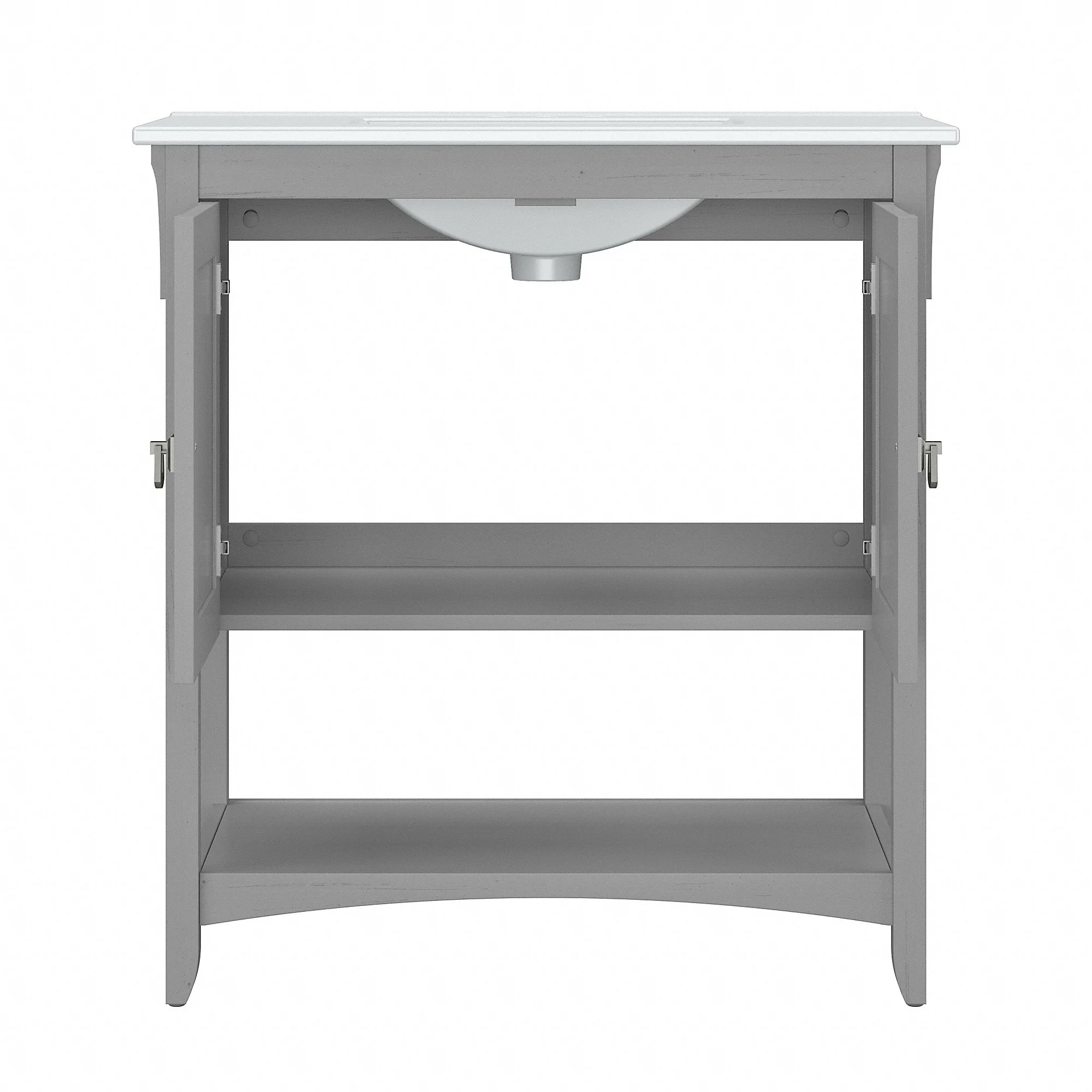 - Vanity includes a lower shelf and 2 door storage cabinet for organizing toiletries, cleaning supplies and more