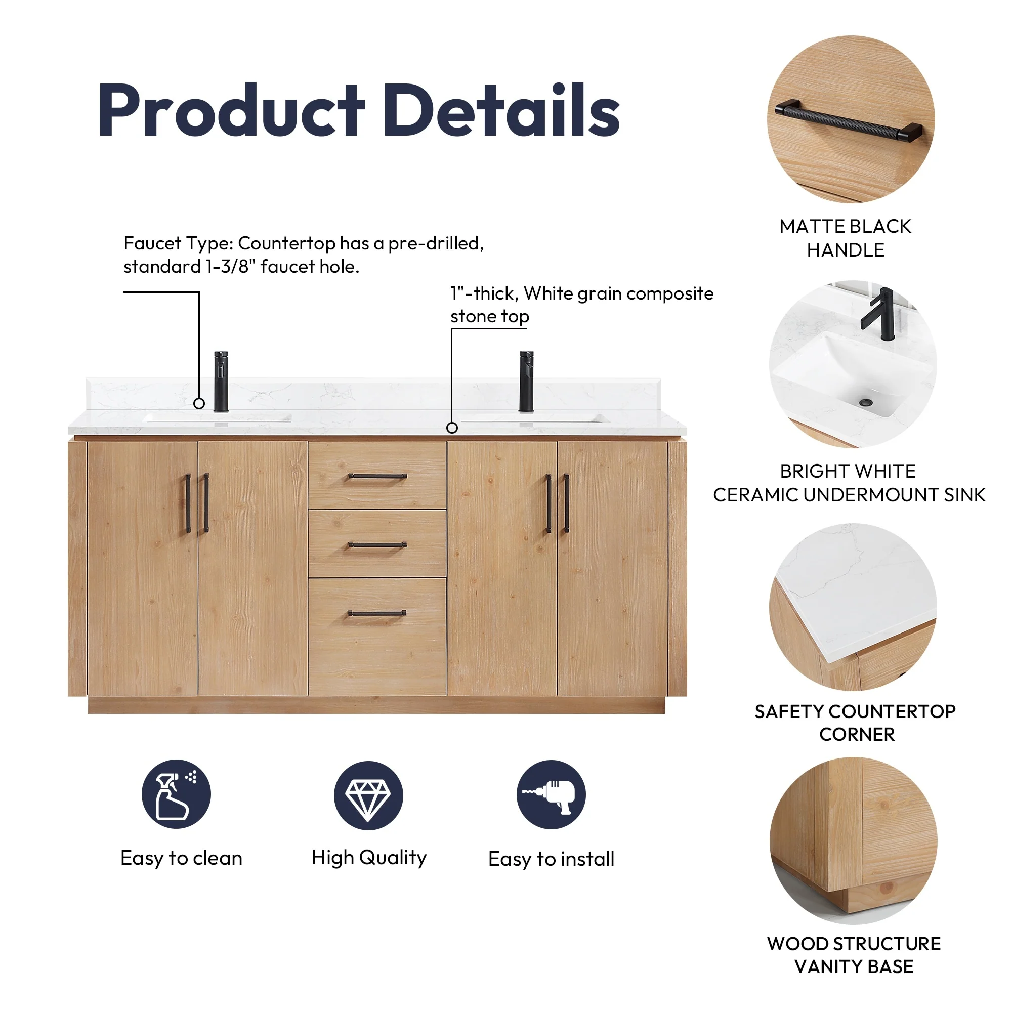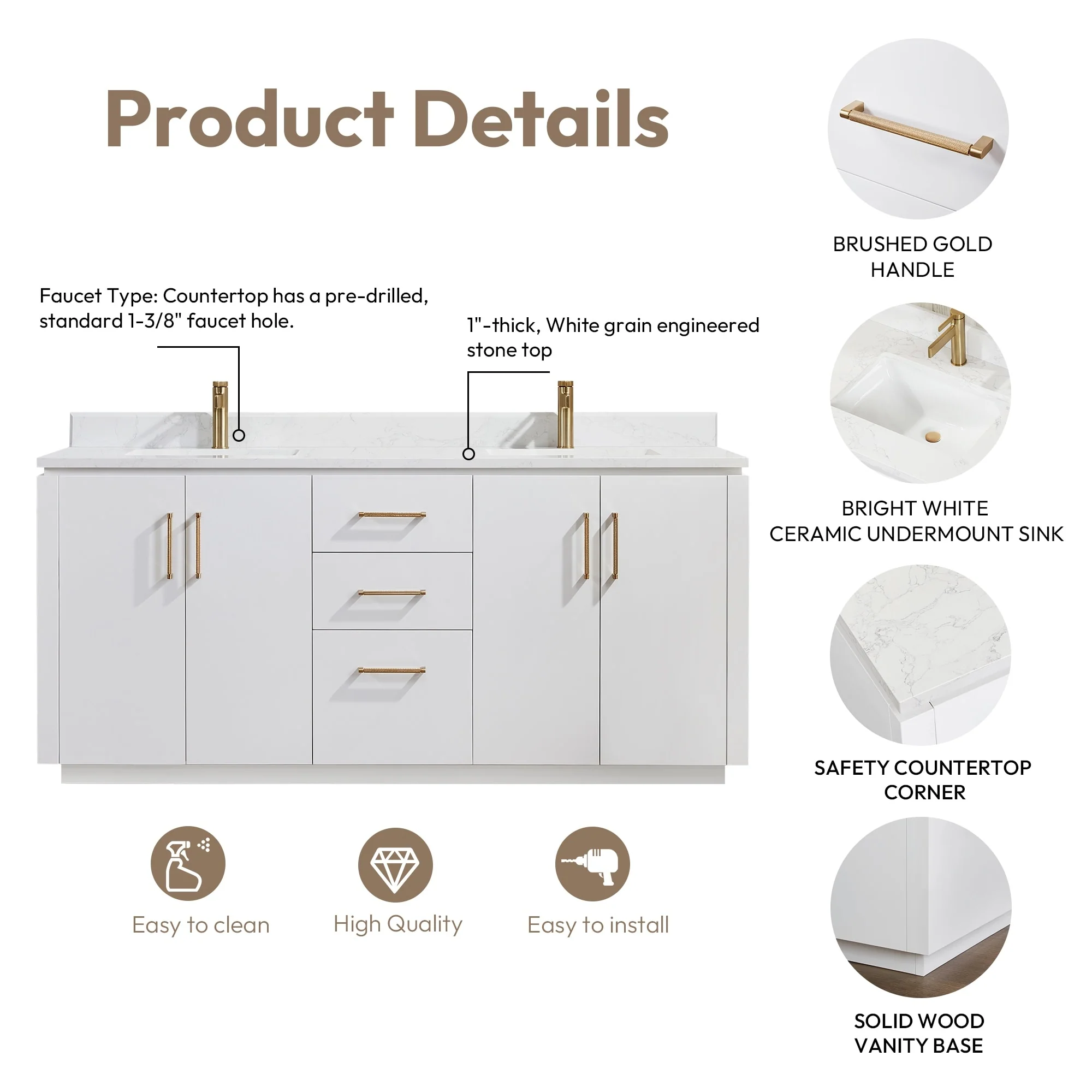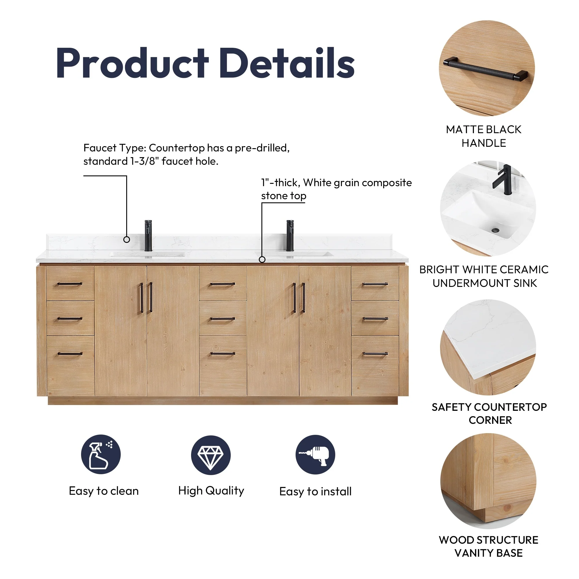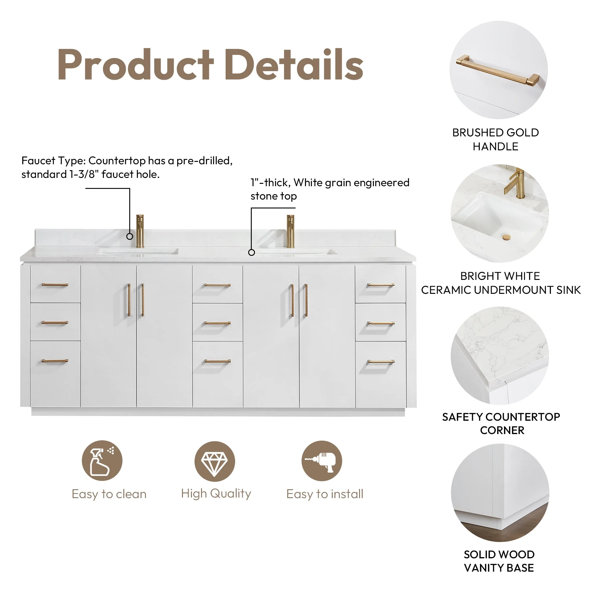 · Modern Top: 1'-thick, White grain composite stone top with backsplash lends a fresh and contemporary look. With a high-gloss, anti-fouling coating, the countertop is scratch-resistant, wear-resistant, and easy to clean.
