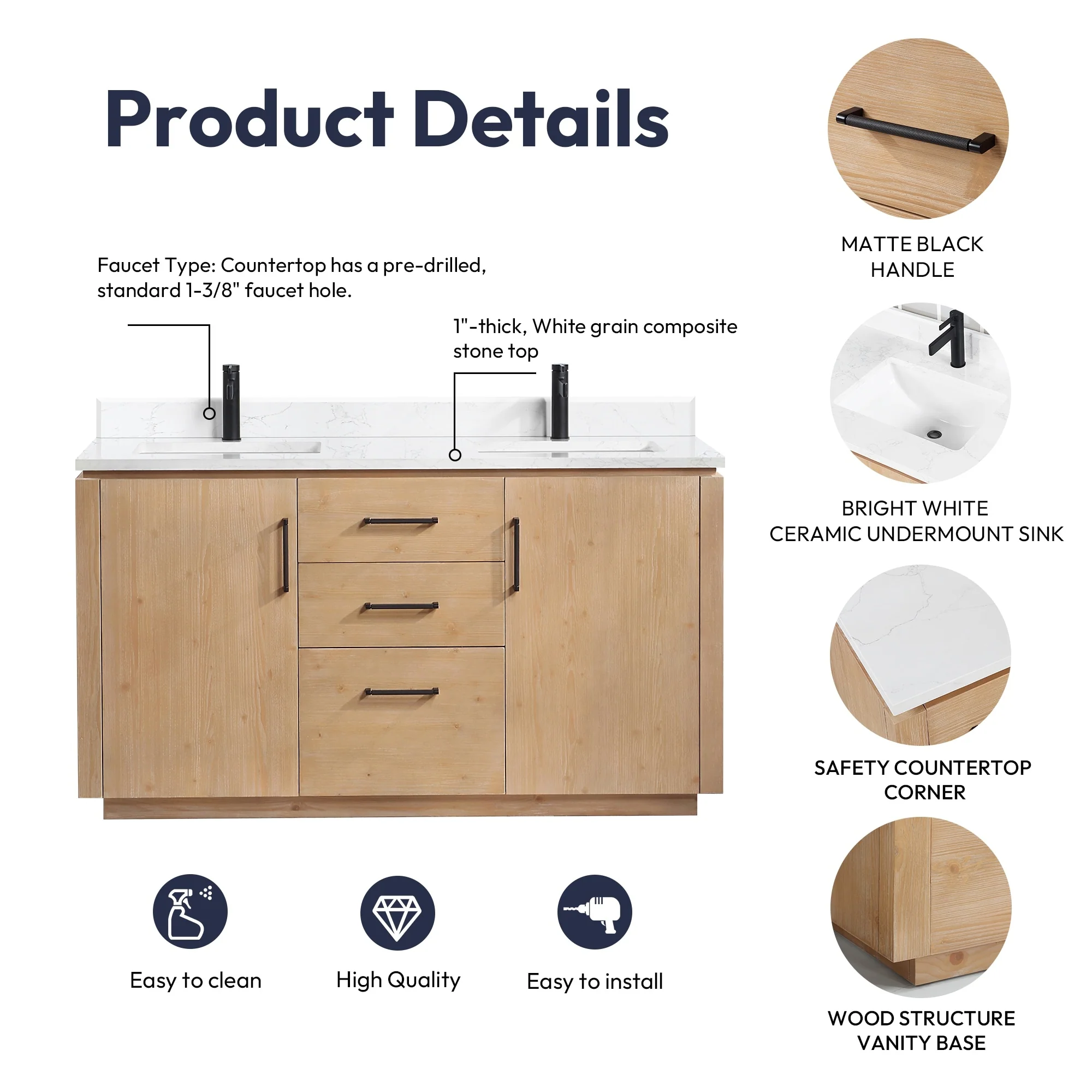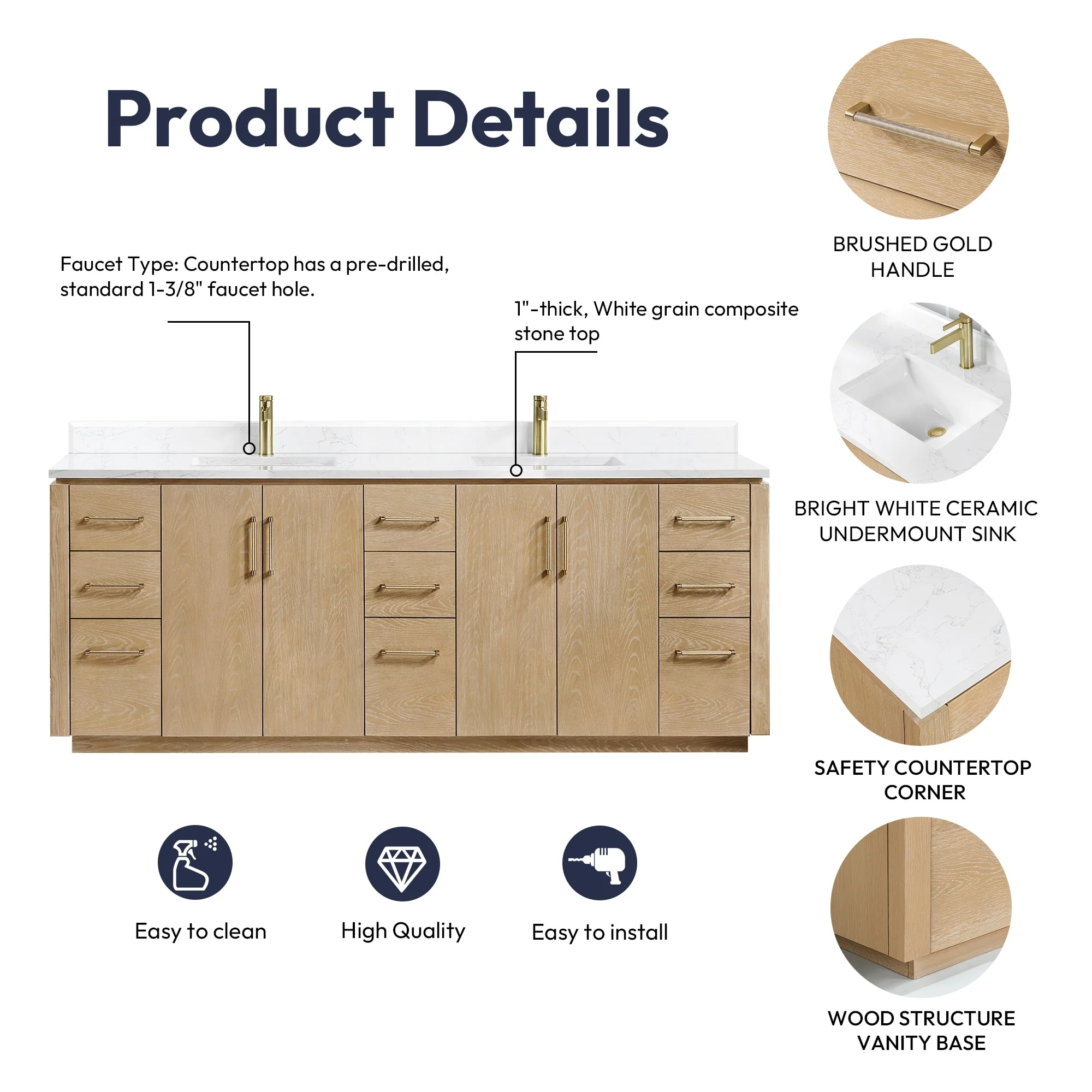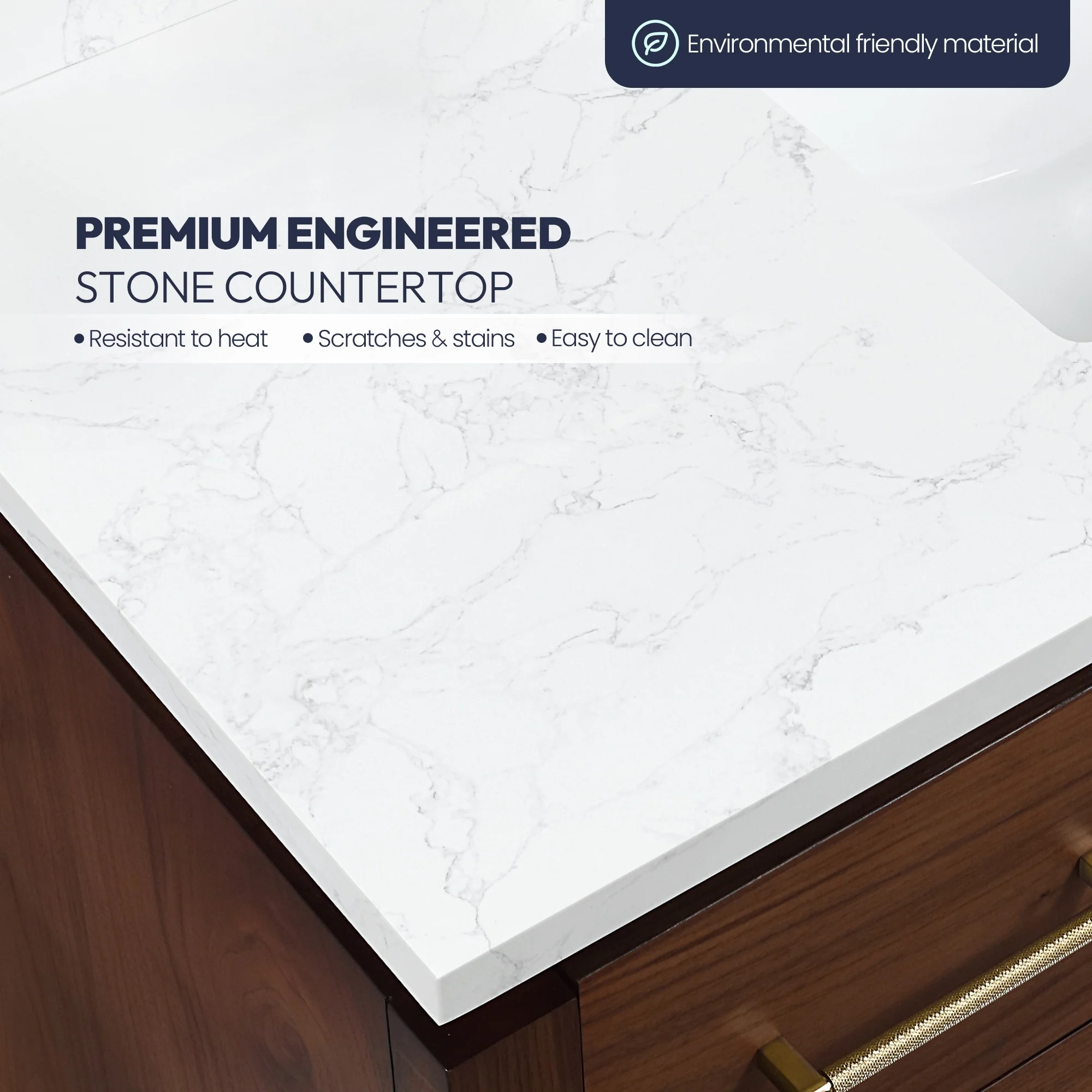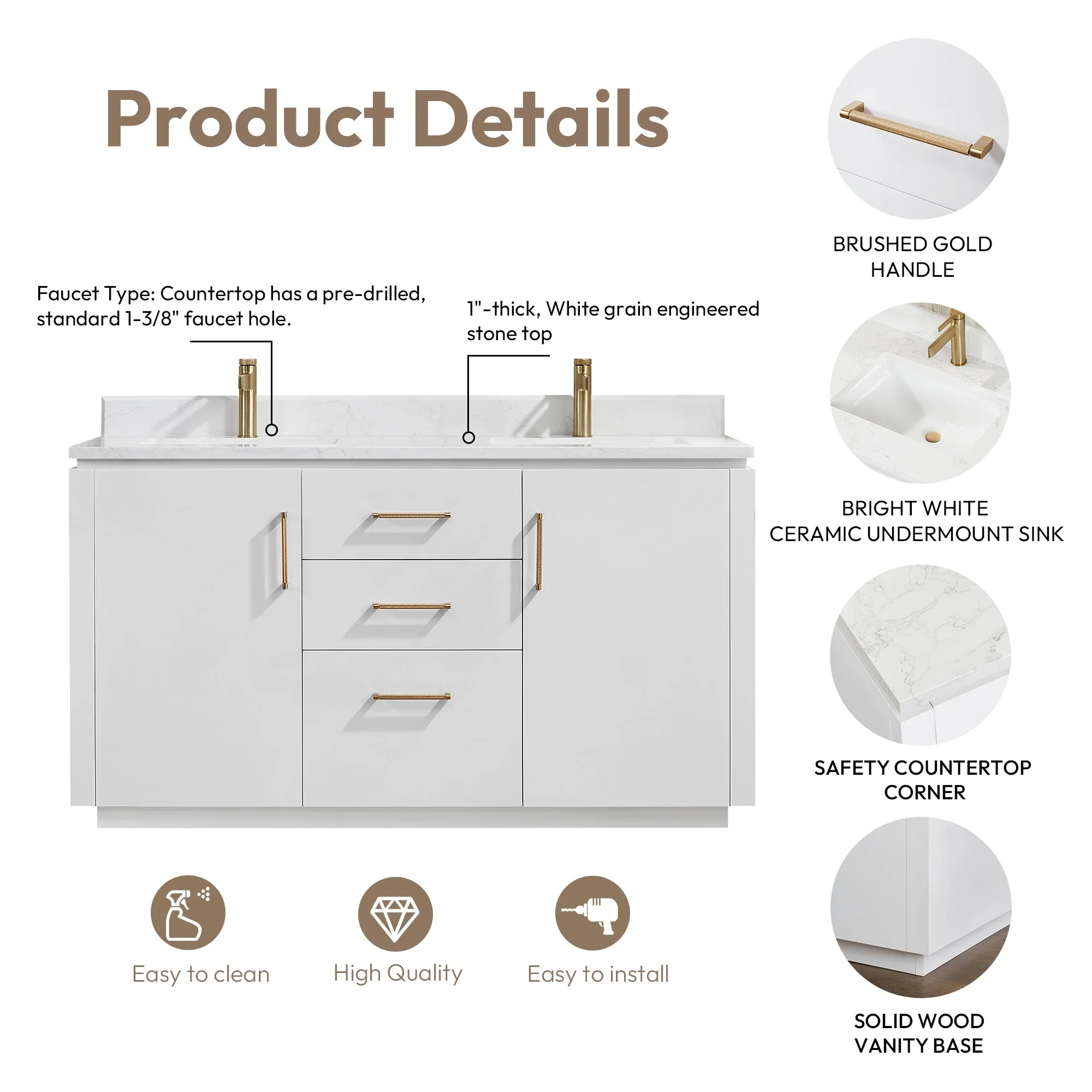 · Modern Top: 1'-thick, White grain composite stone top with backsplash lends a fresh and contemporary look. With a high-gloss, anti-fouling coating, the countertop is scratch-resistant, wear-resistant, and easy to clean.