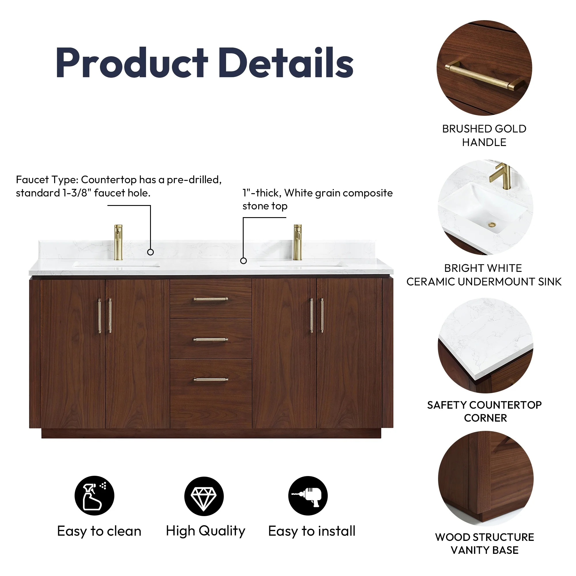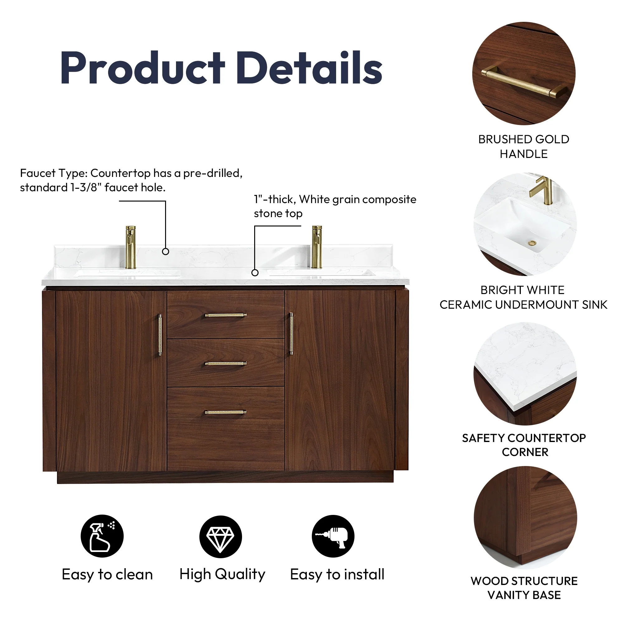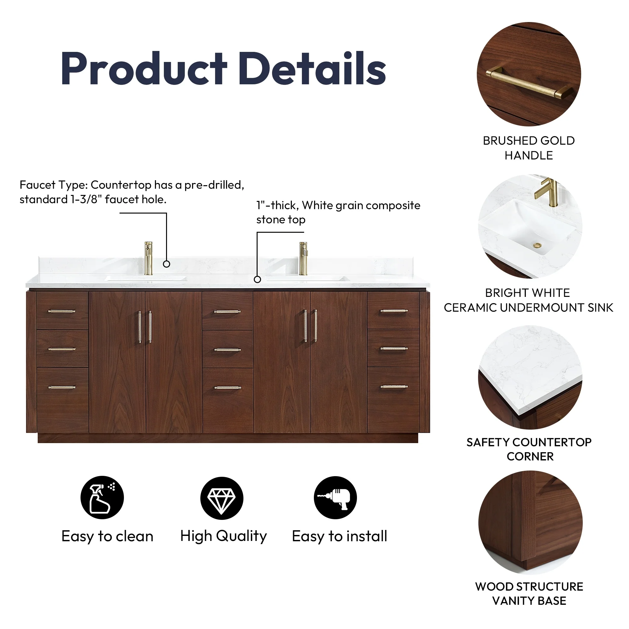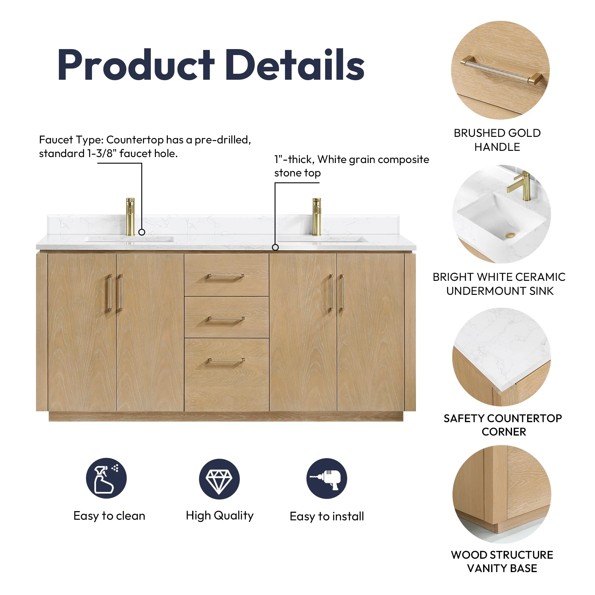 · Modern Top: 1'-thick, White grain composite stone top with backsplash lends a fresh and contemporary look. With a high-gloss, anti-fouling coating, the countertop is scratch-resistant, wear-resistant, and easy to clean.