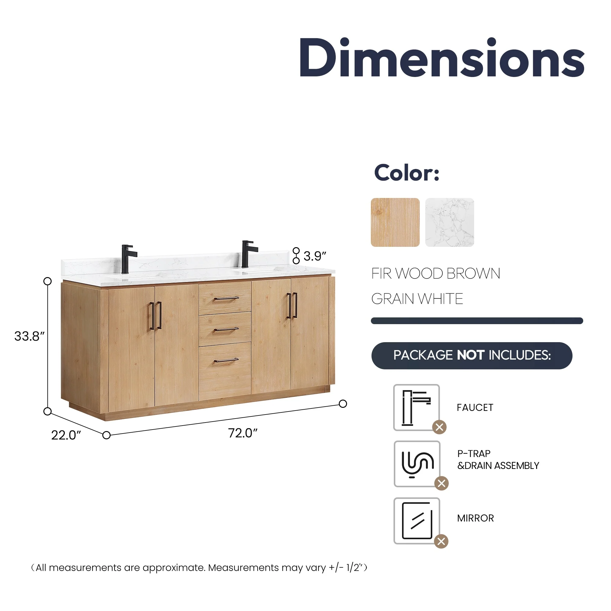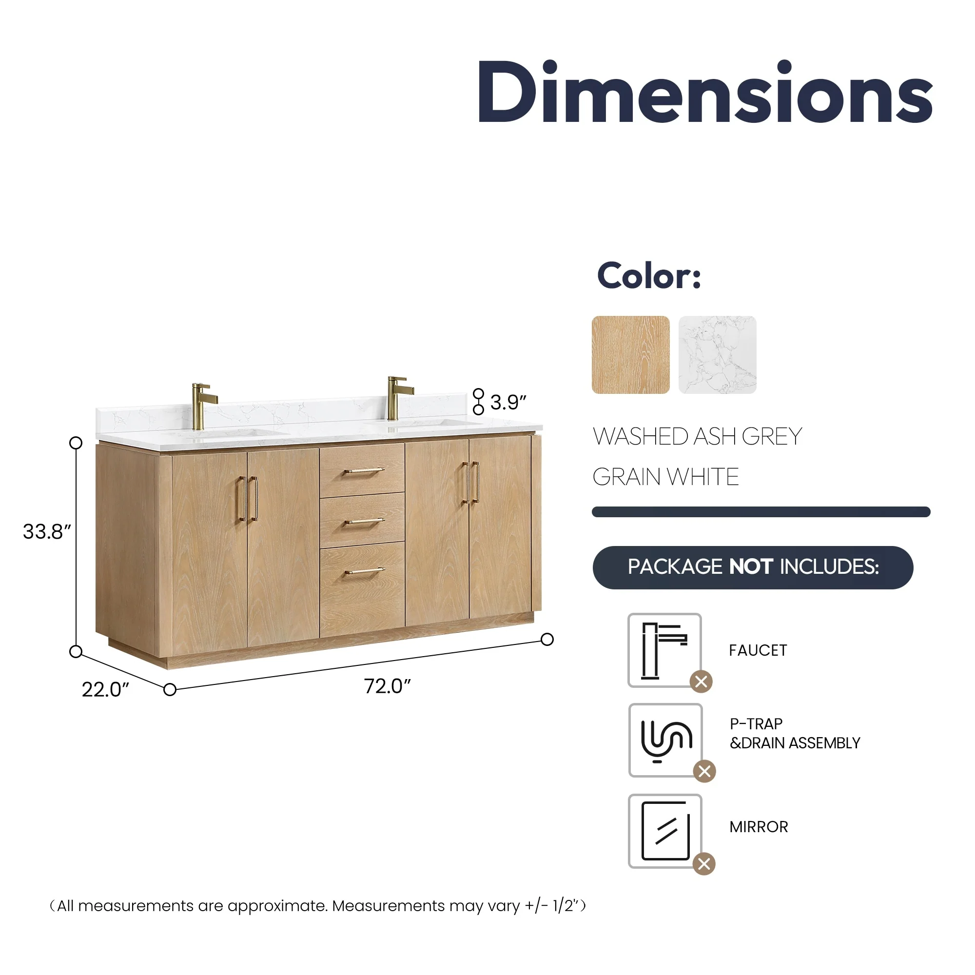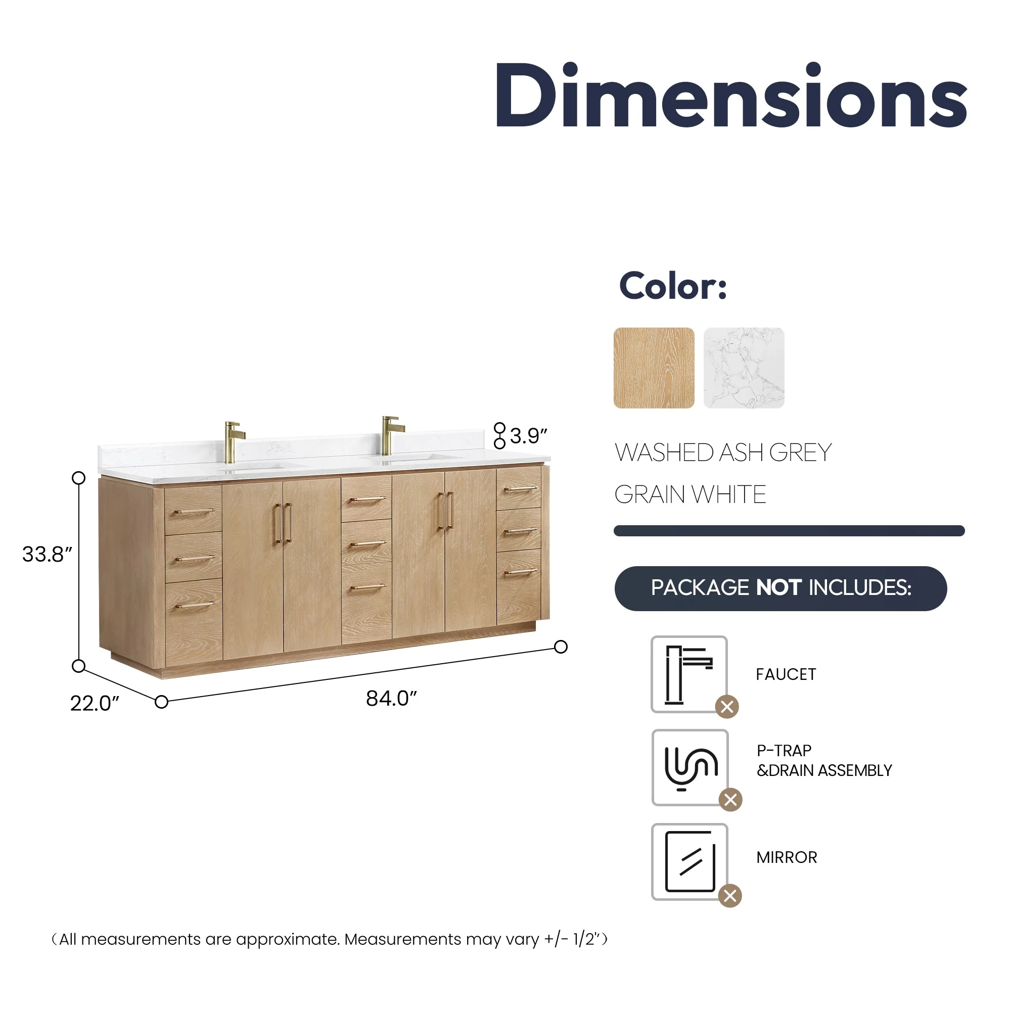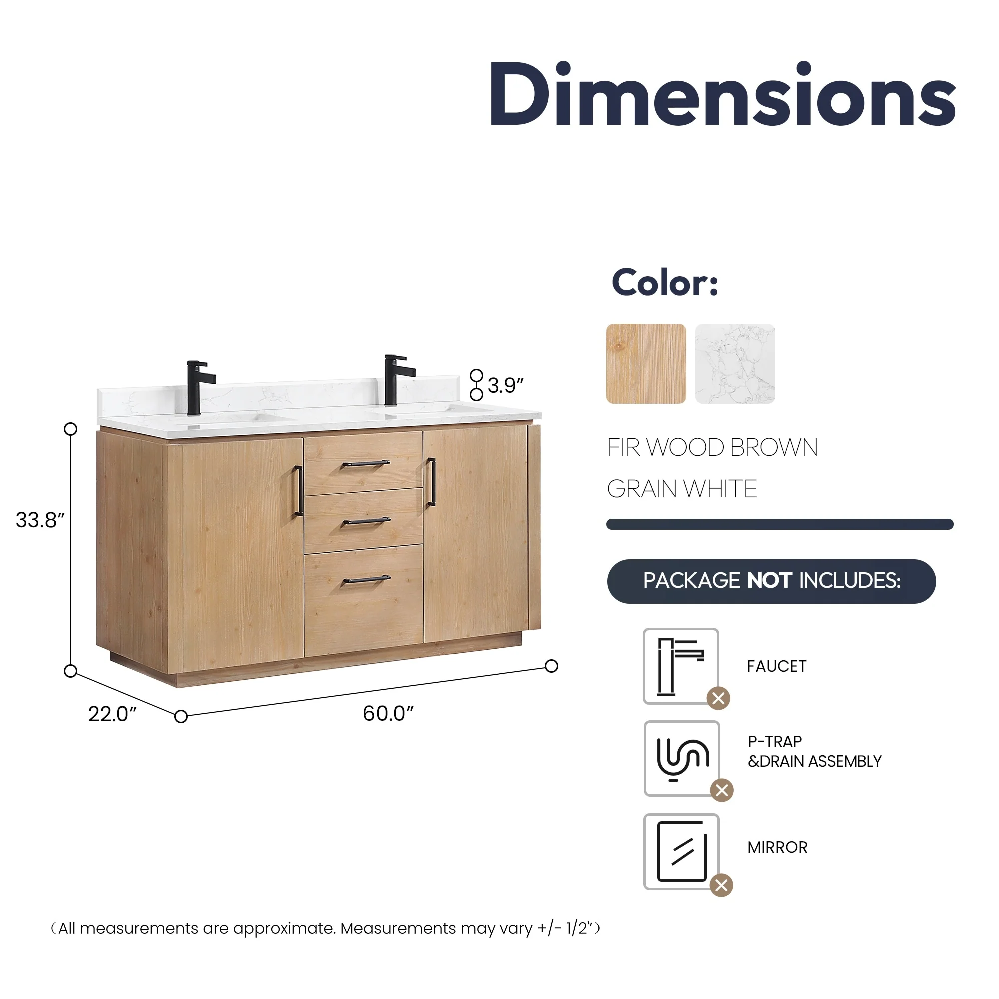 · Accessories: Does not include faucet, drain assembly or P-trap,Storage Cabinet. Comes fully assembled and ready to install in your bathroom.