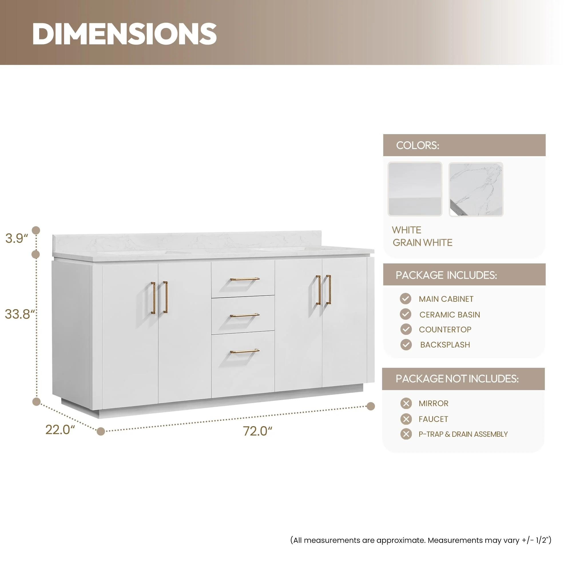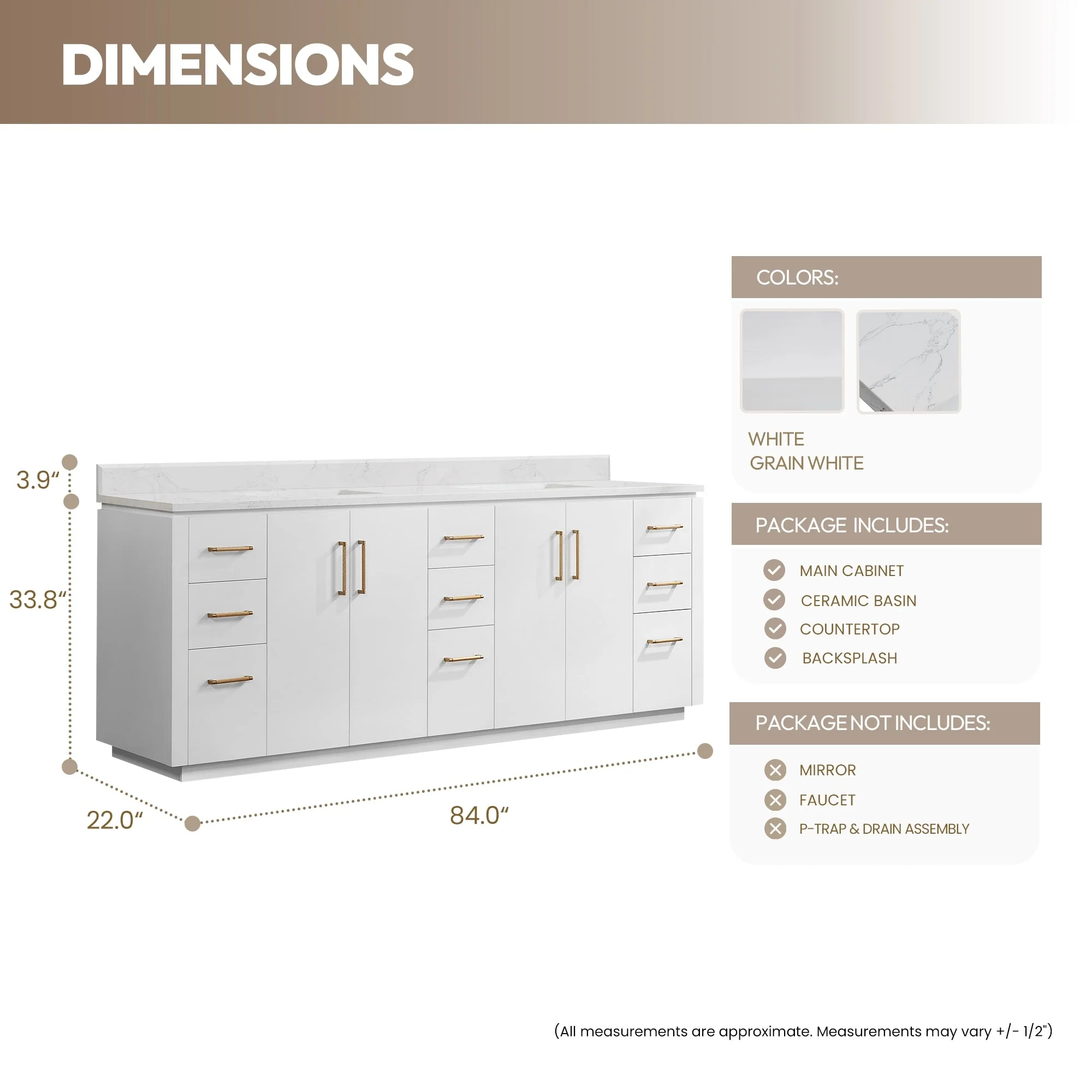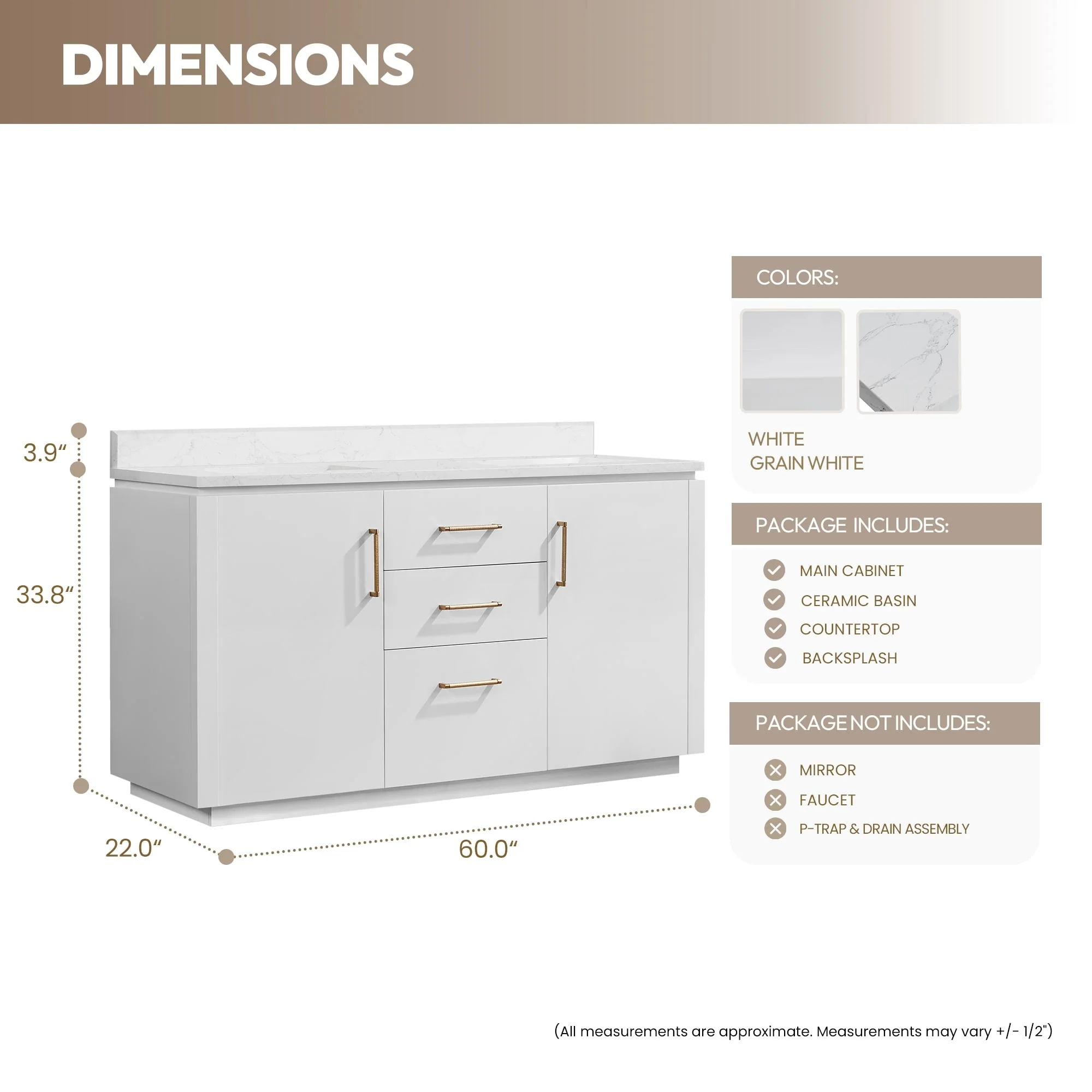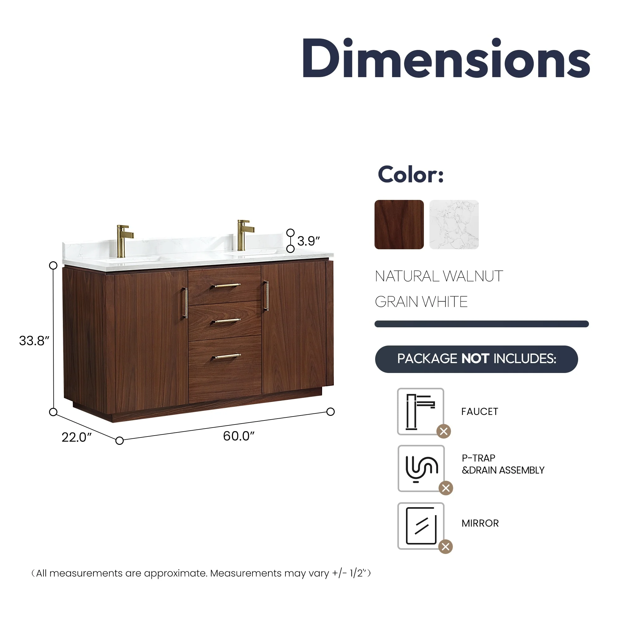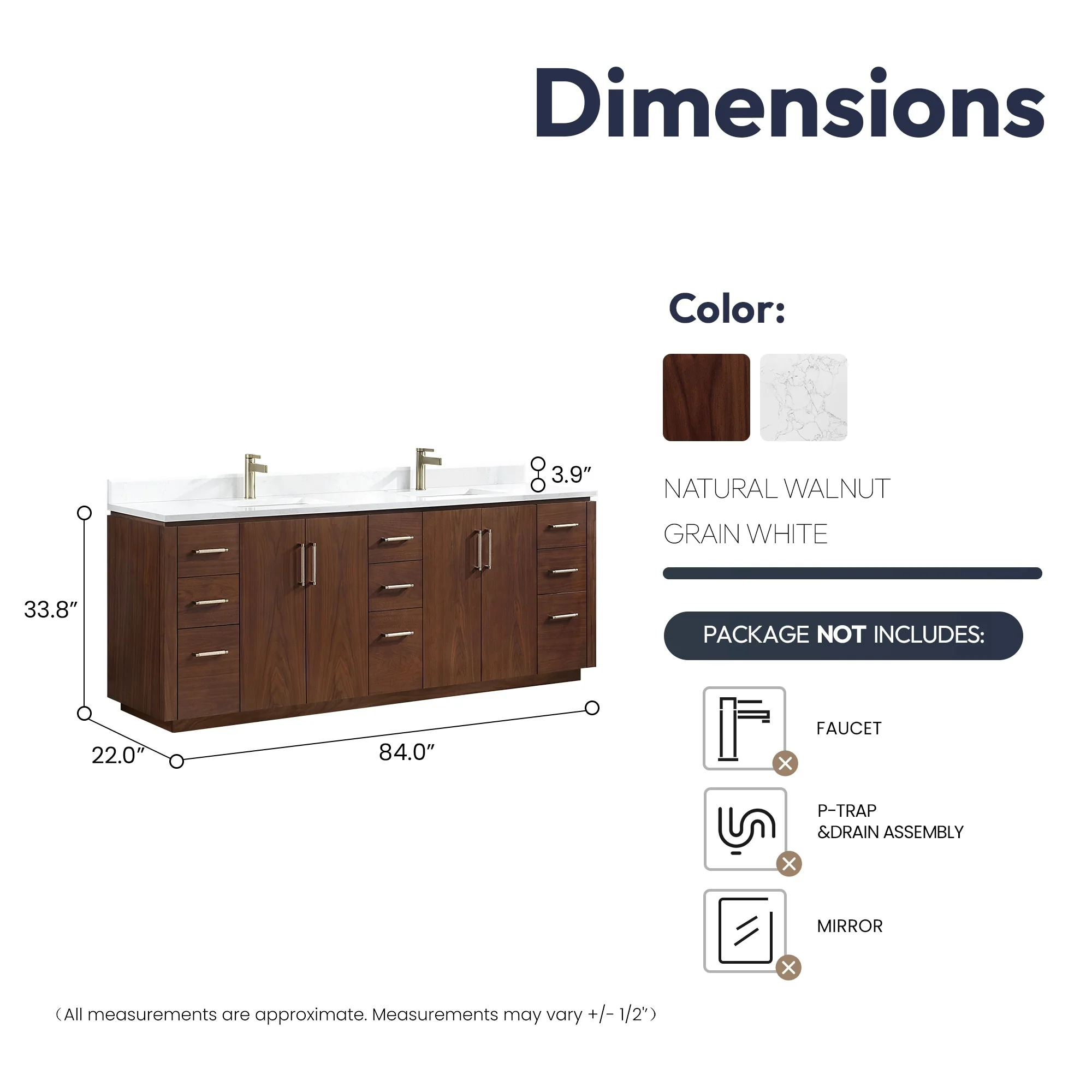 · Accessories: Does not include faucet, drain assembly or P-trap,Storage Cabinet. Comes fully assembled and ready to install in your bathroom.
