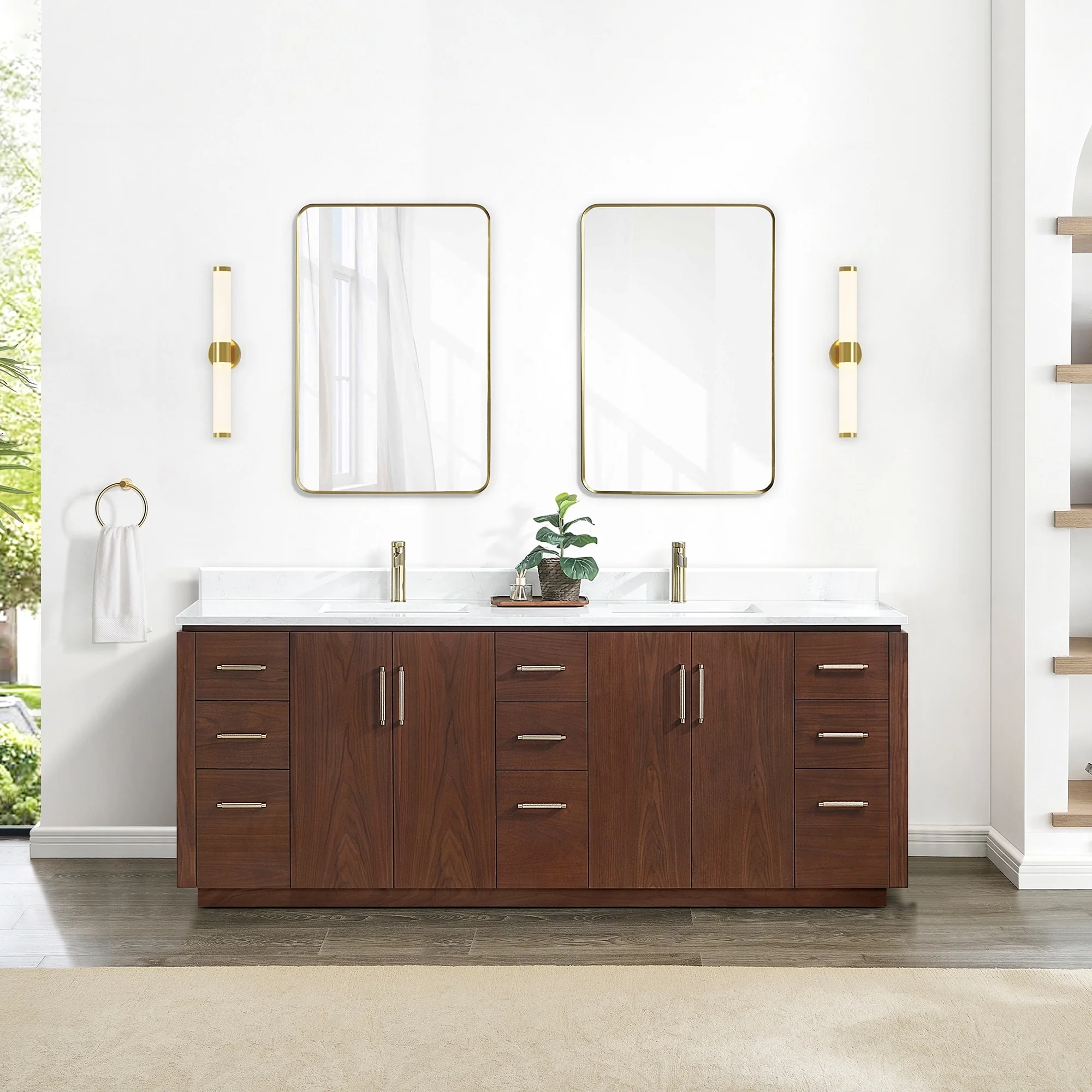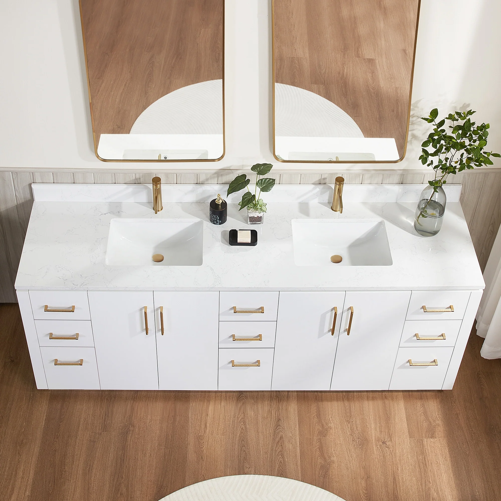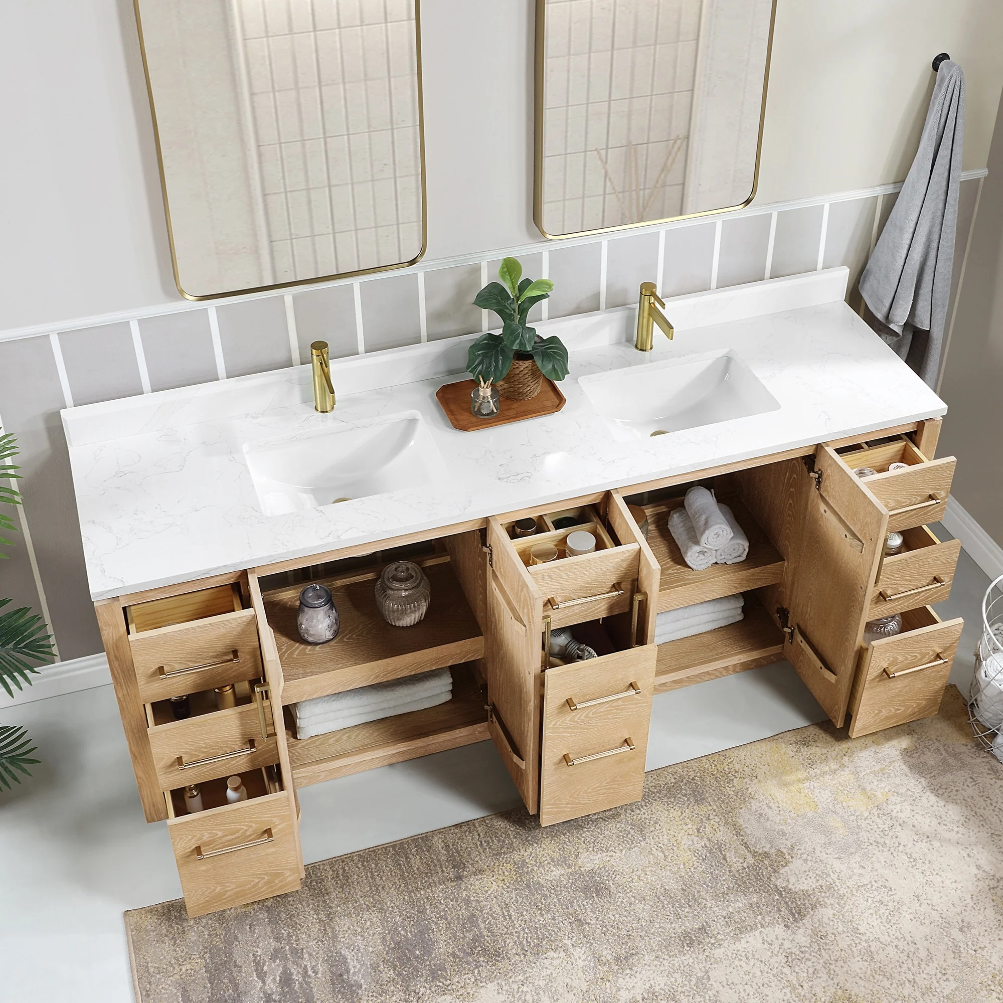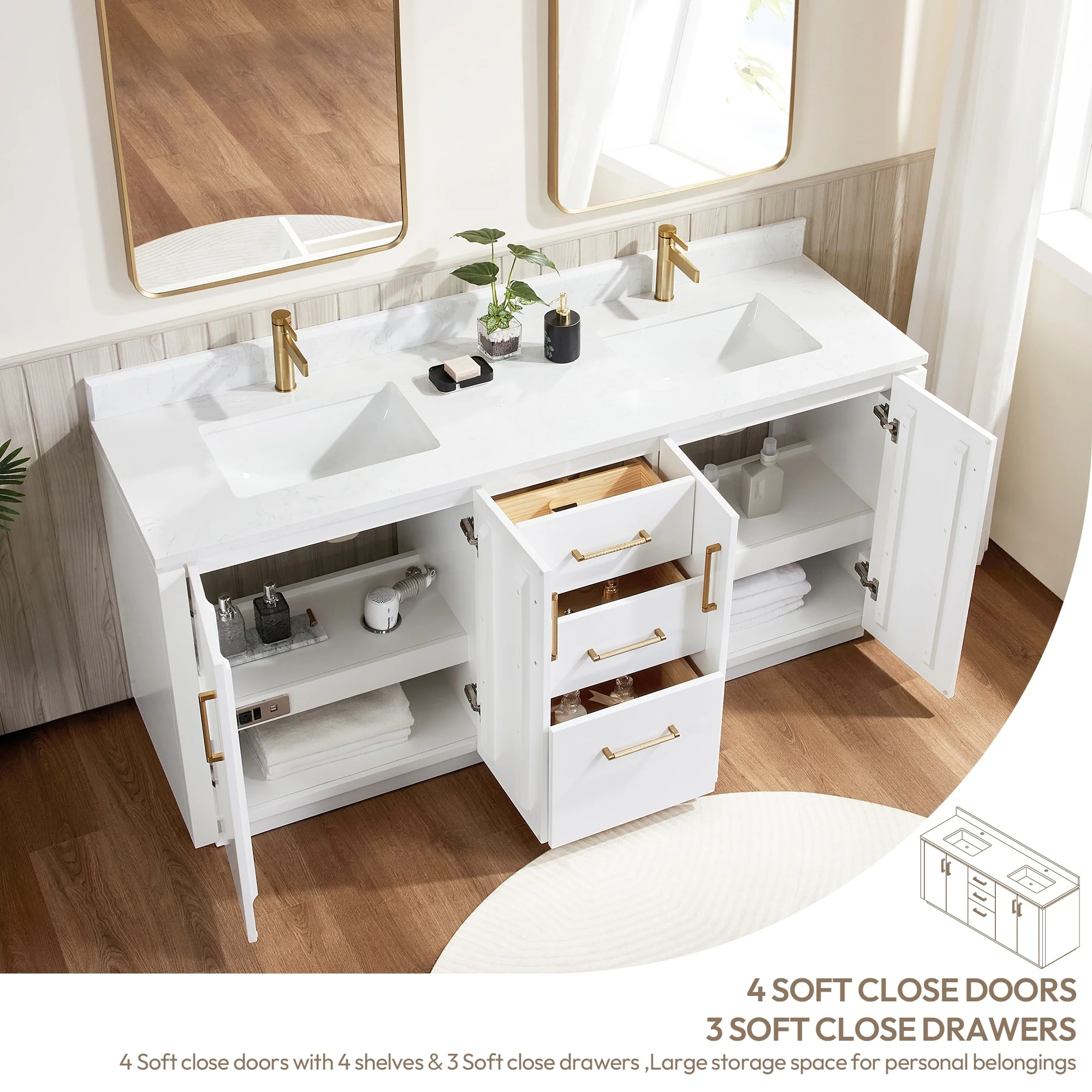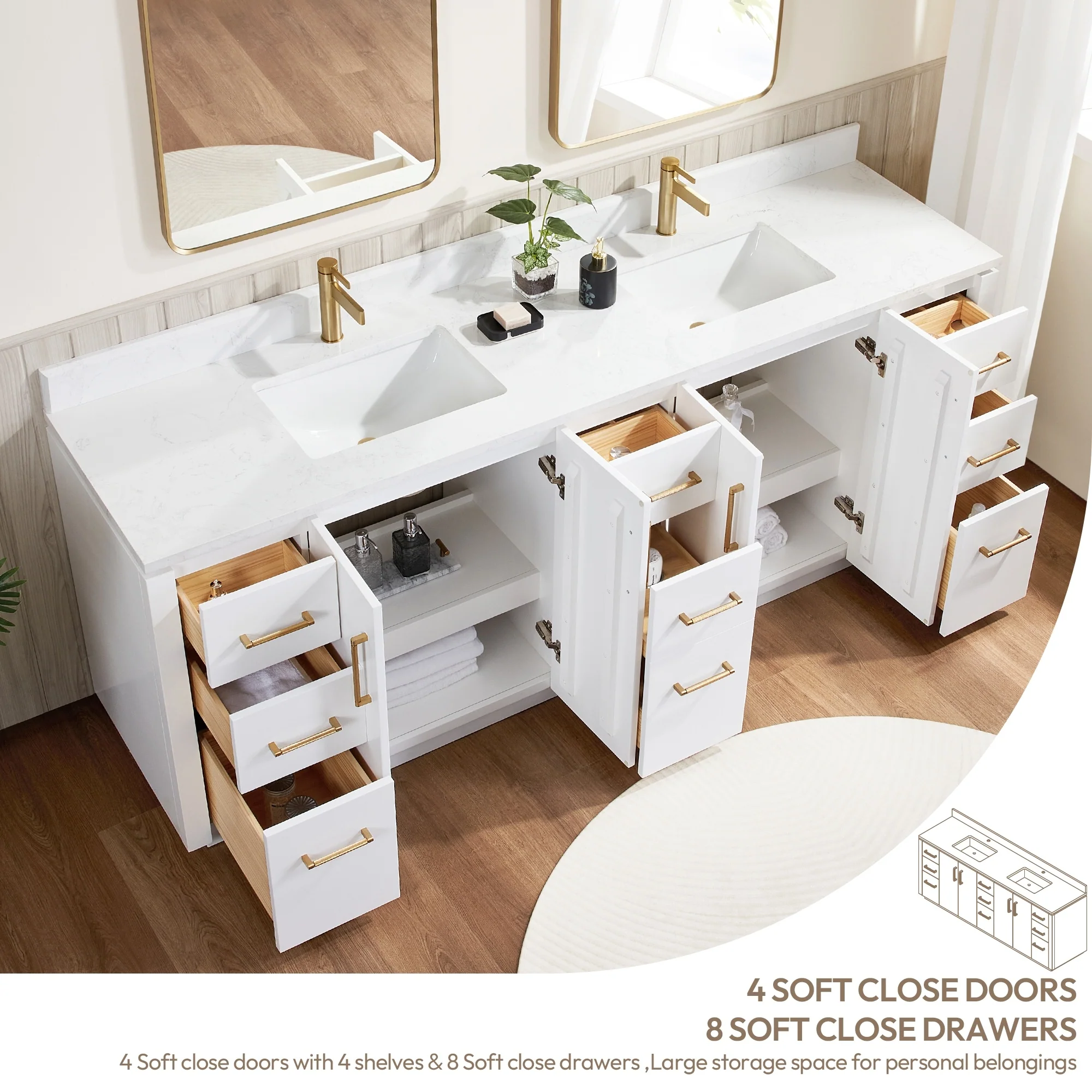 Our exquisite San Series Vanity is expertly crafted from premium hardwood, ensuring exceptional durability and a timeless aesthetic that never goes out of style. The natural grain of the wood adds warmth, texture, and character to your bathroom space, creating a seamless fusion of modern and classic design elements. Soft-closing drawers and cabinets provide you with easy, organized access to all your essentials.