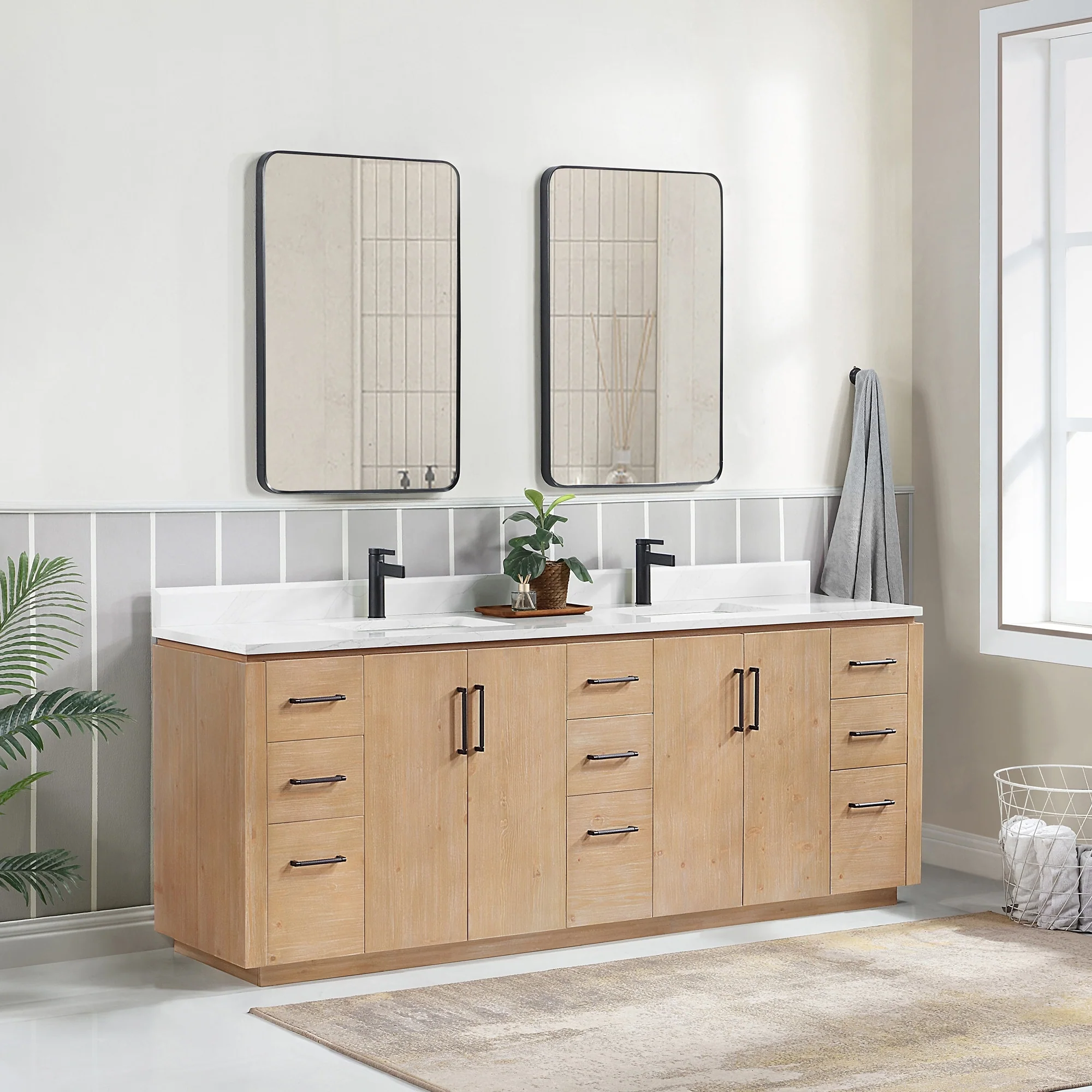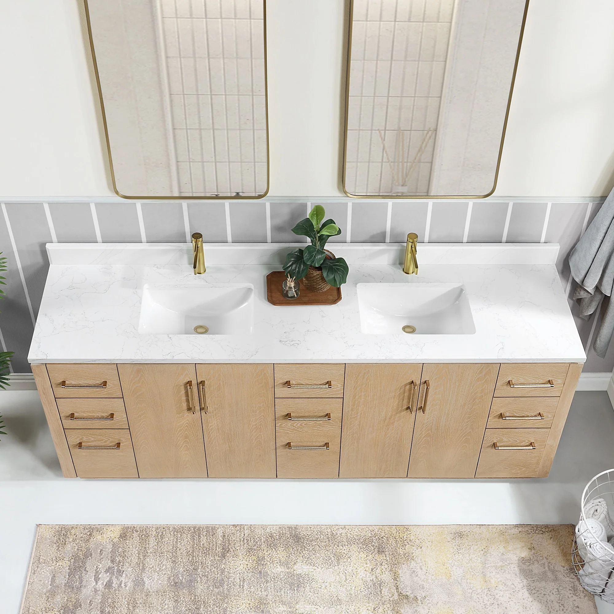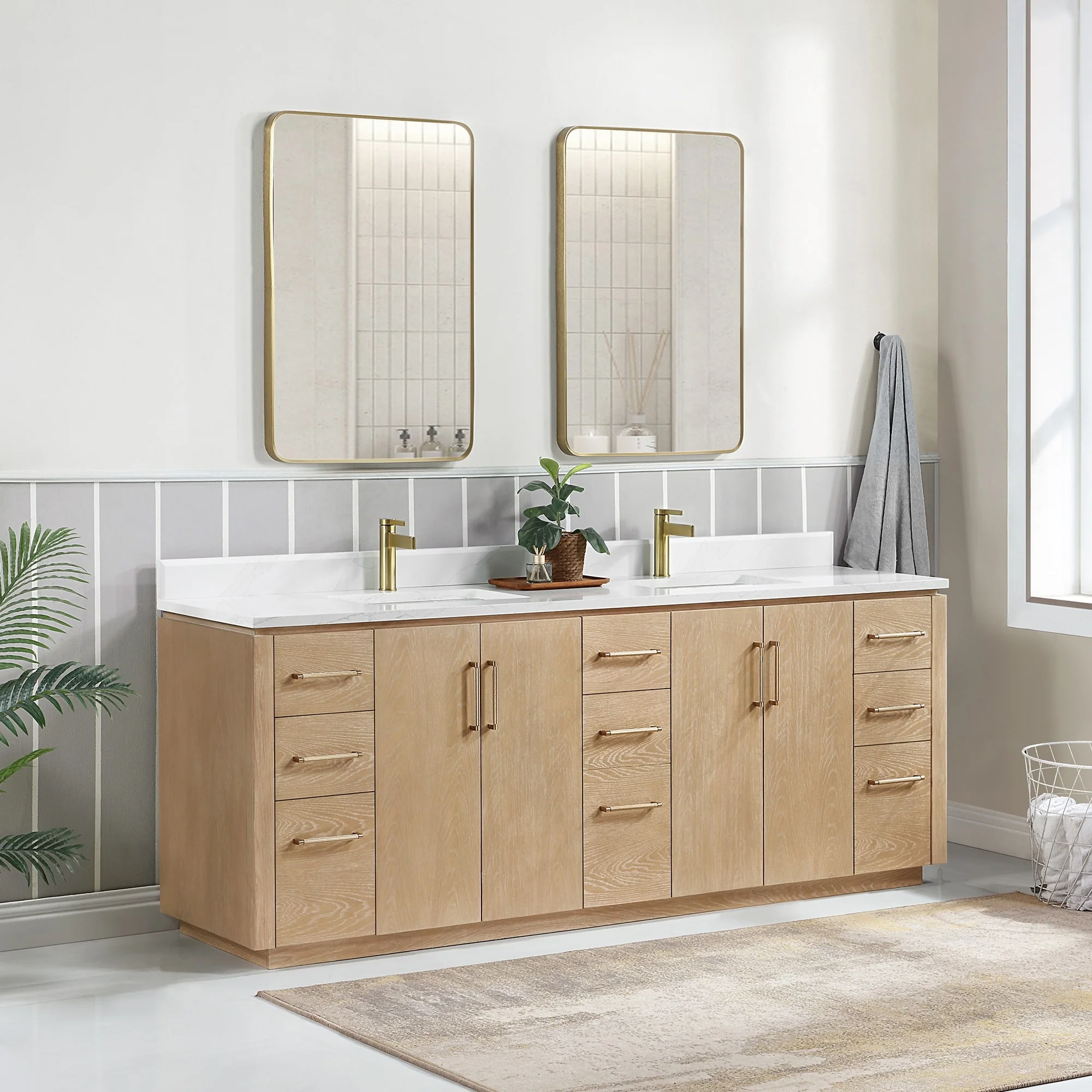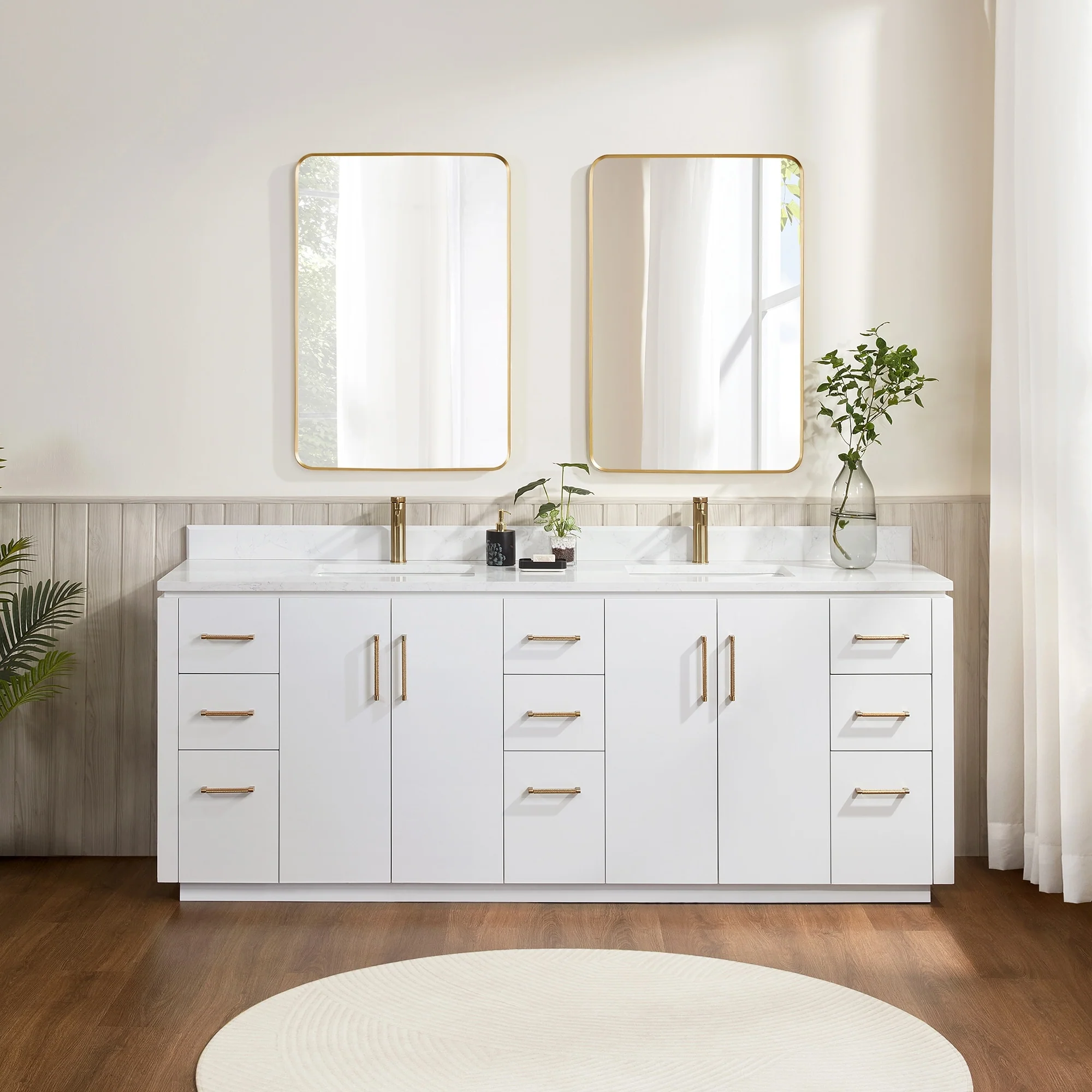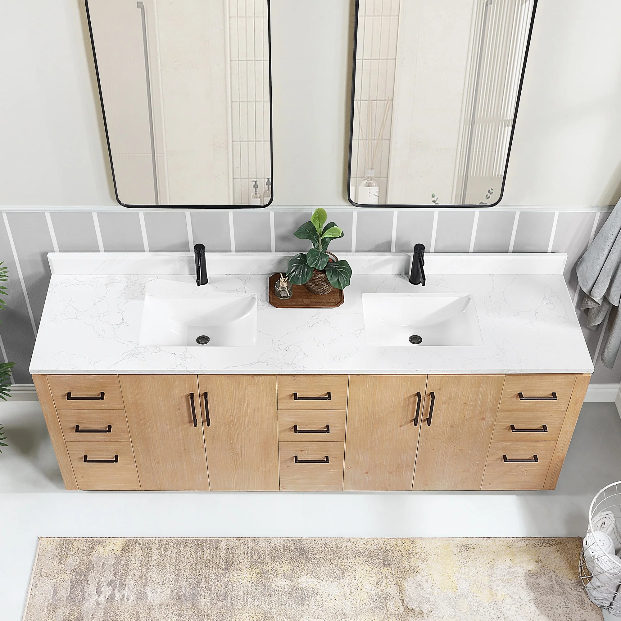 Our exquisite San Series Vanity is expertly crafted from premium hardwood, ensuring exceptional durability and a timeless aesthetic that never goes out of style. The natural grain of the wood adds warmth, texture, and character to your bathroom space, creating a seamless fusion of modern and classic design elements. Soft-closing drawers and cabinets provide you with easy, organized access to all your essentials.