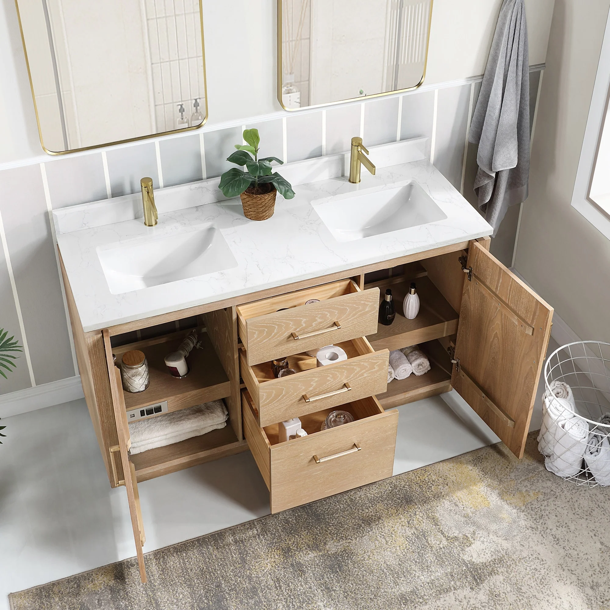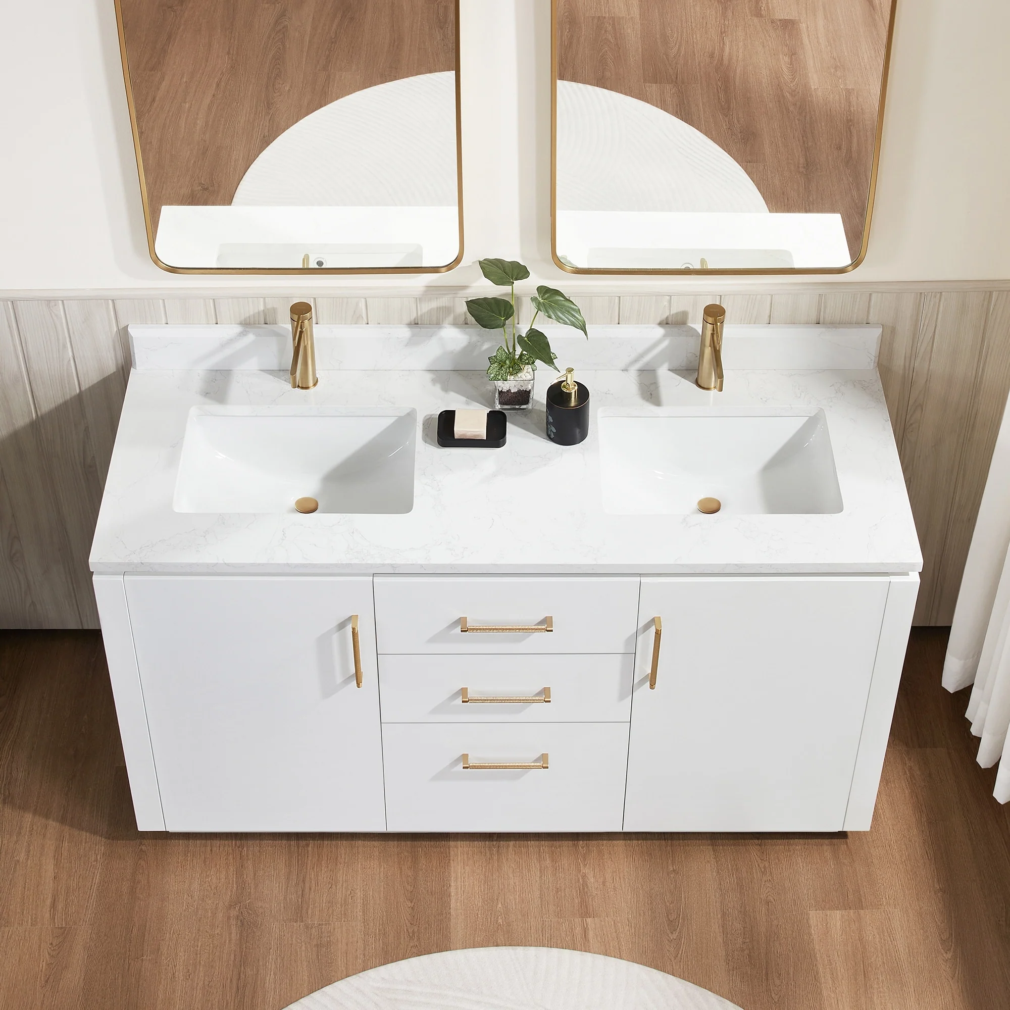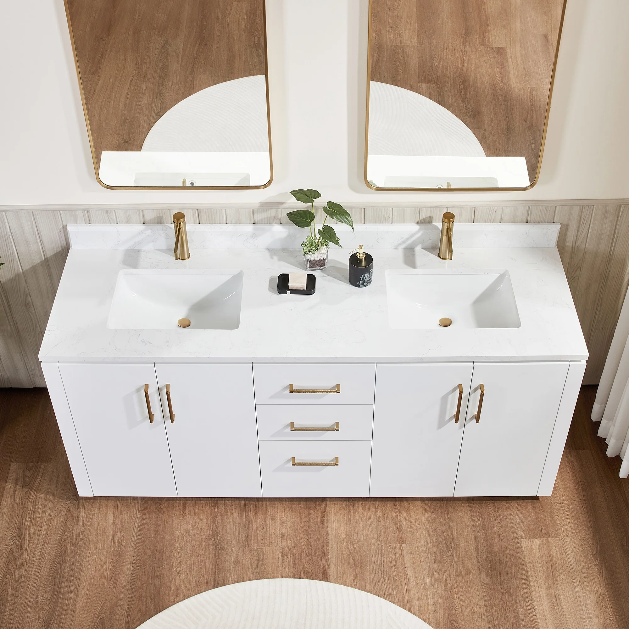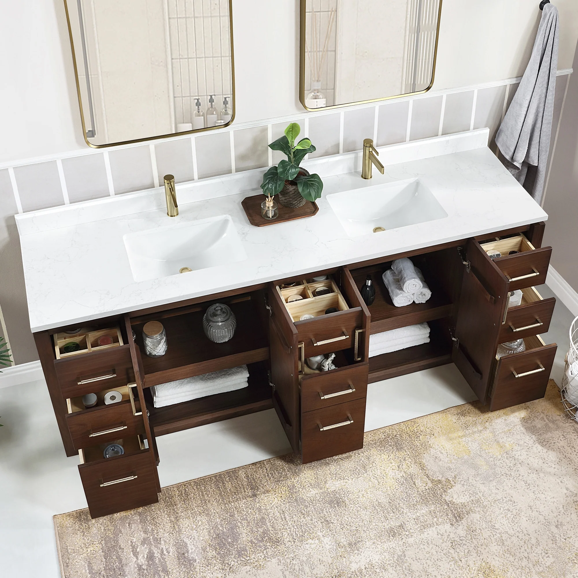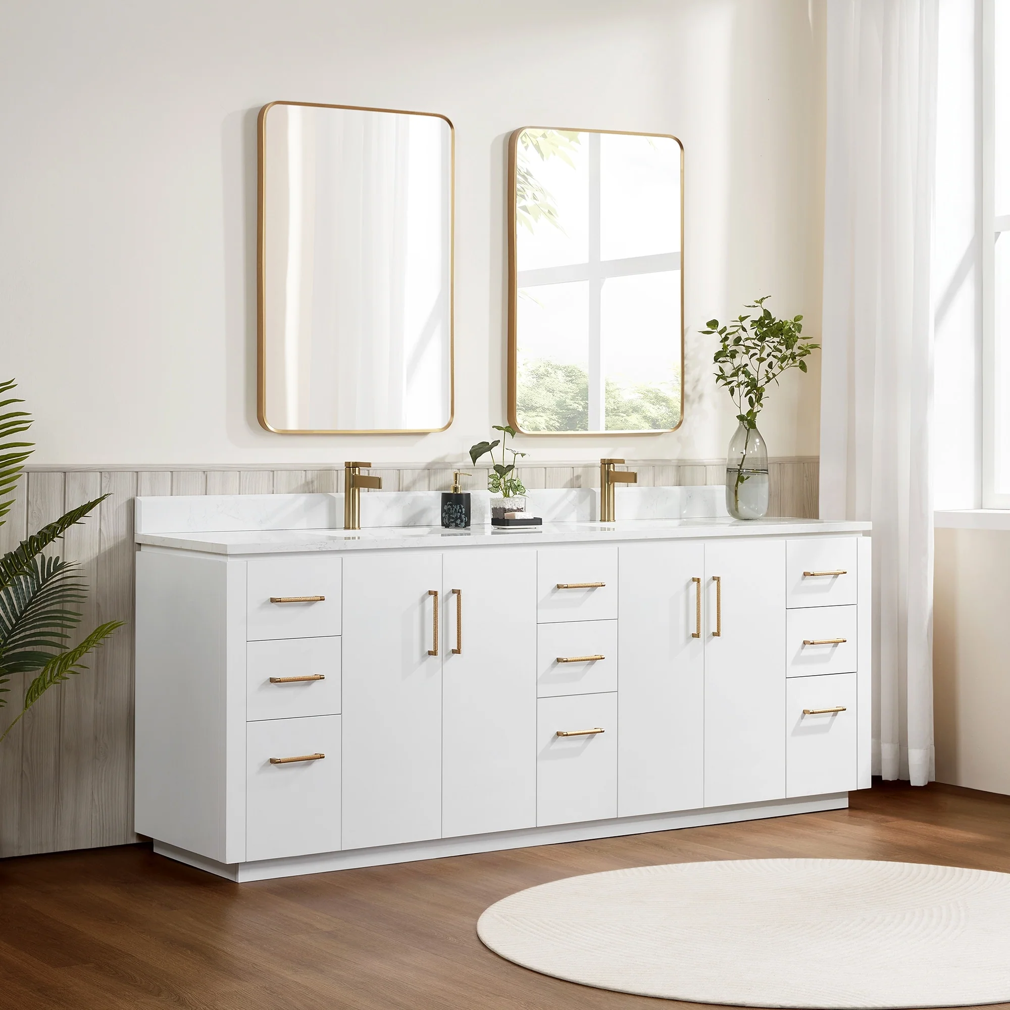 Our exquisite San Series Vanity is expertly crafted from premium hardwood, ensuring exceptional durability and a timeless aesthetic that never goes out of style. The natural grain of the wood adds warmth, texture, and character to your bathroom space, creating a seamless fusion of modern and classic design elements. Soft-closing drawers and cabinets provide you with easy, organized access to all your essentials.