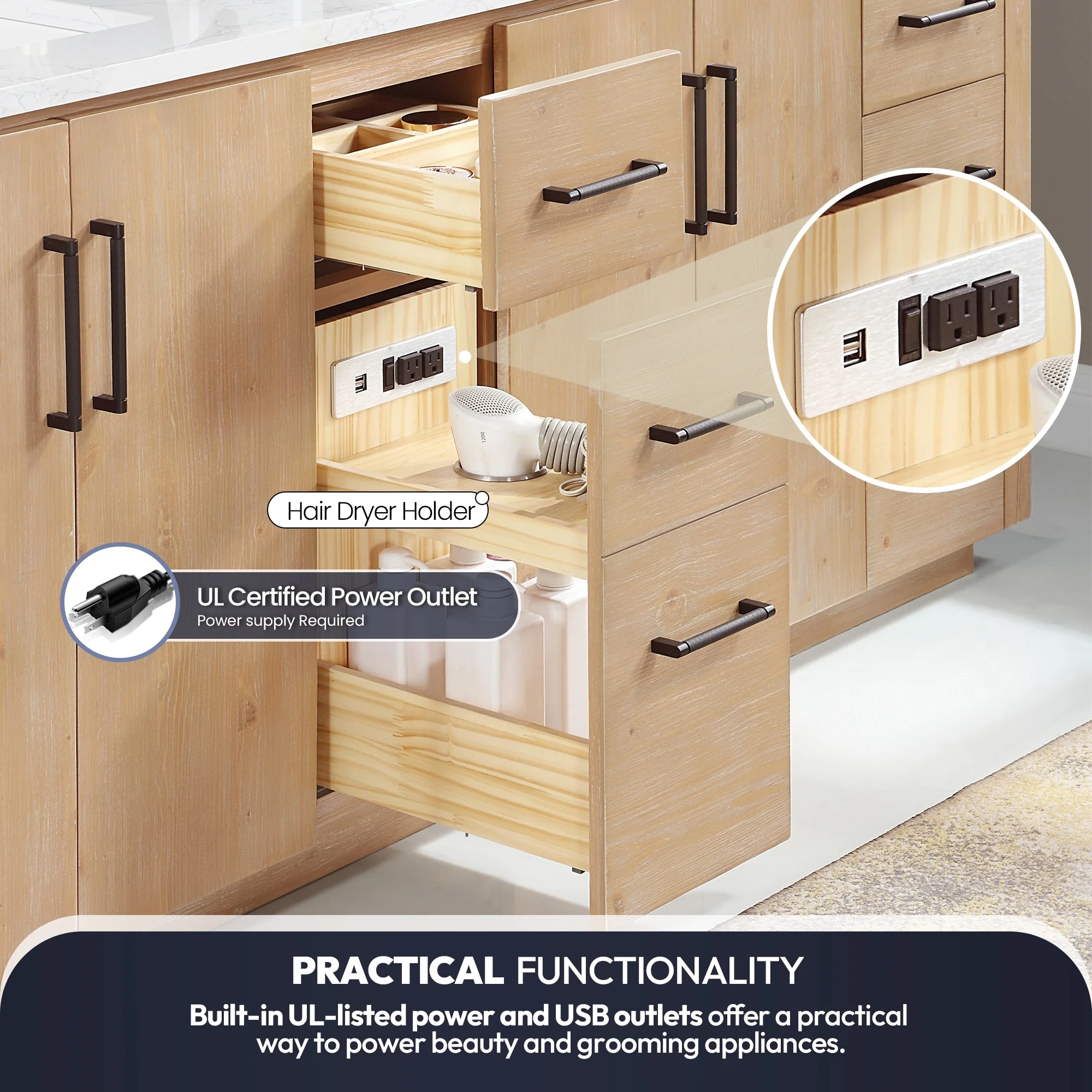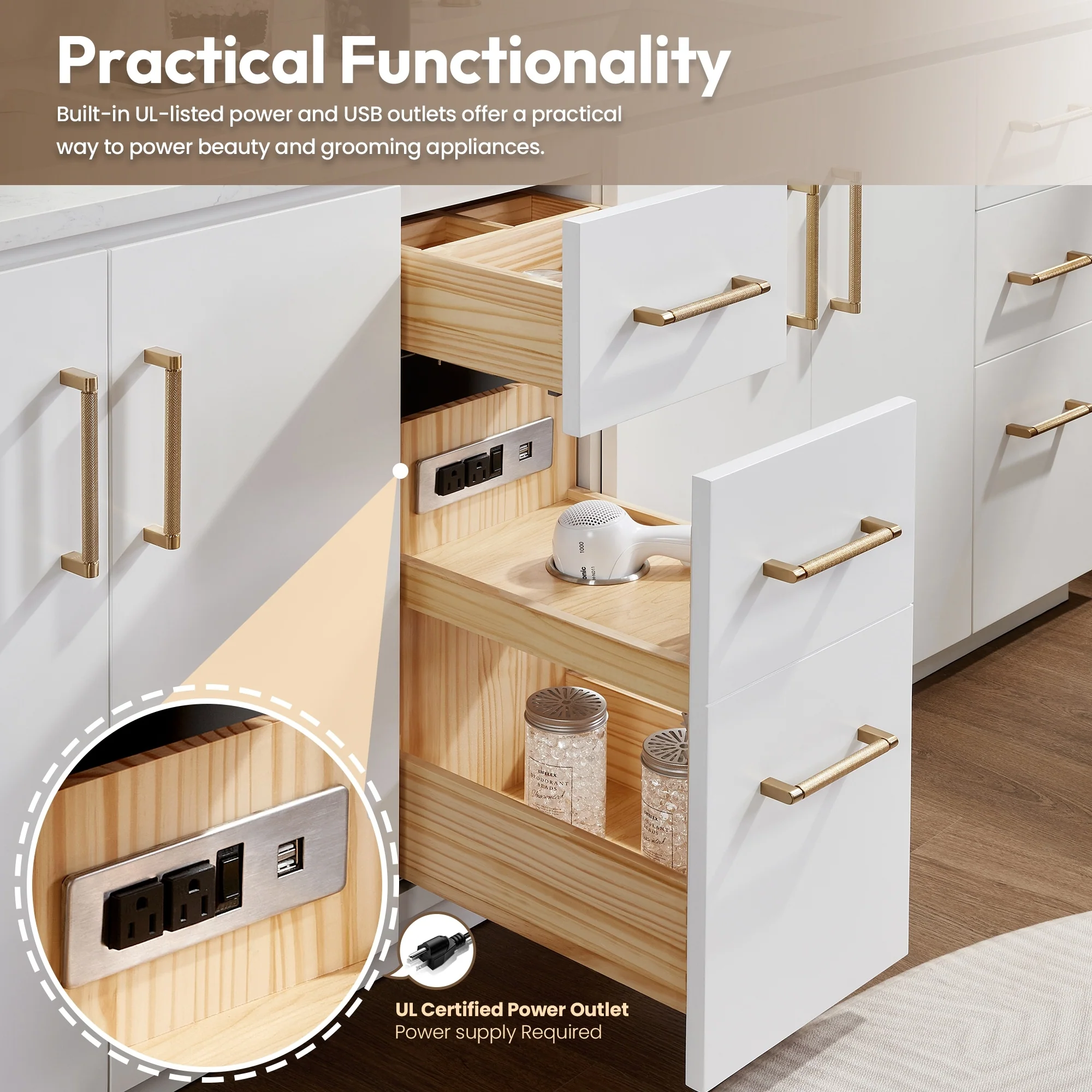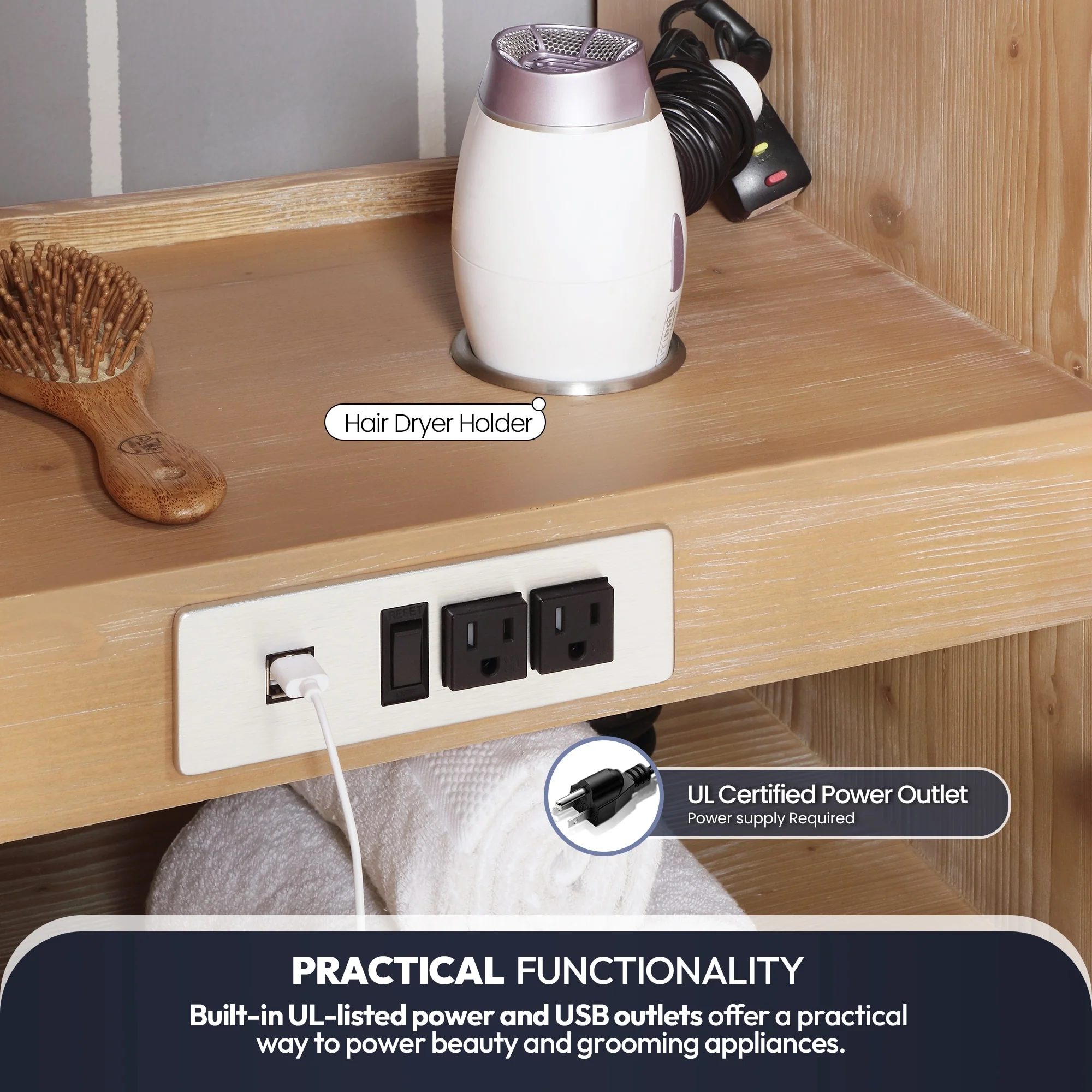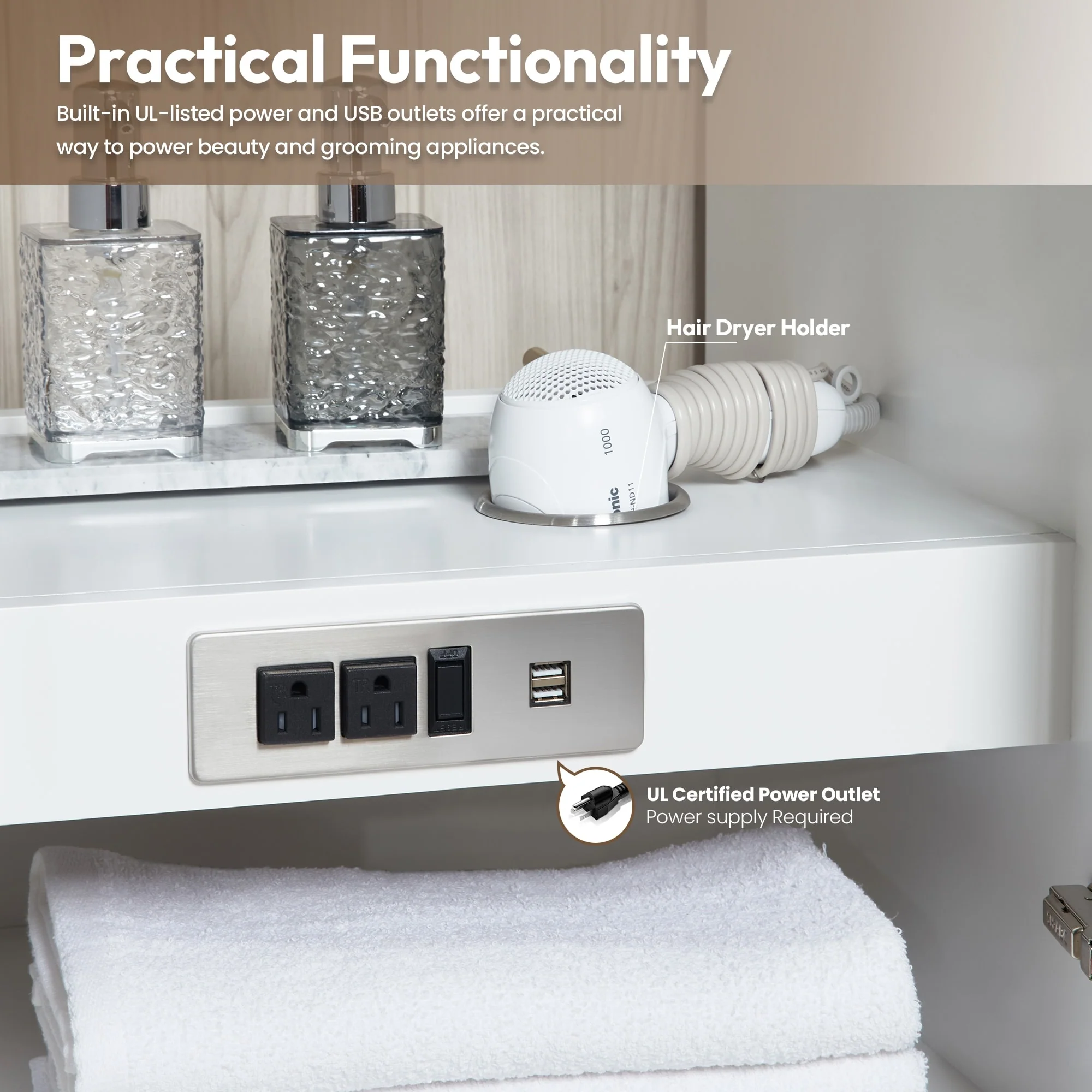 · Practical Functionality: Built-in UL-listed power and USB outlets offer a practical way to power beauty and grooming appliances.Includes convenient hair dryer organizer that keeps your favorite tool within easy reach.