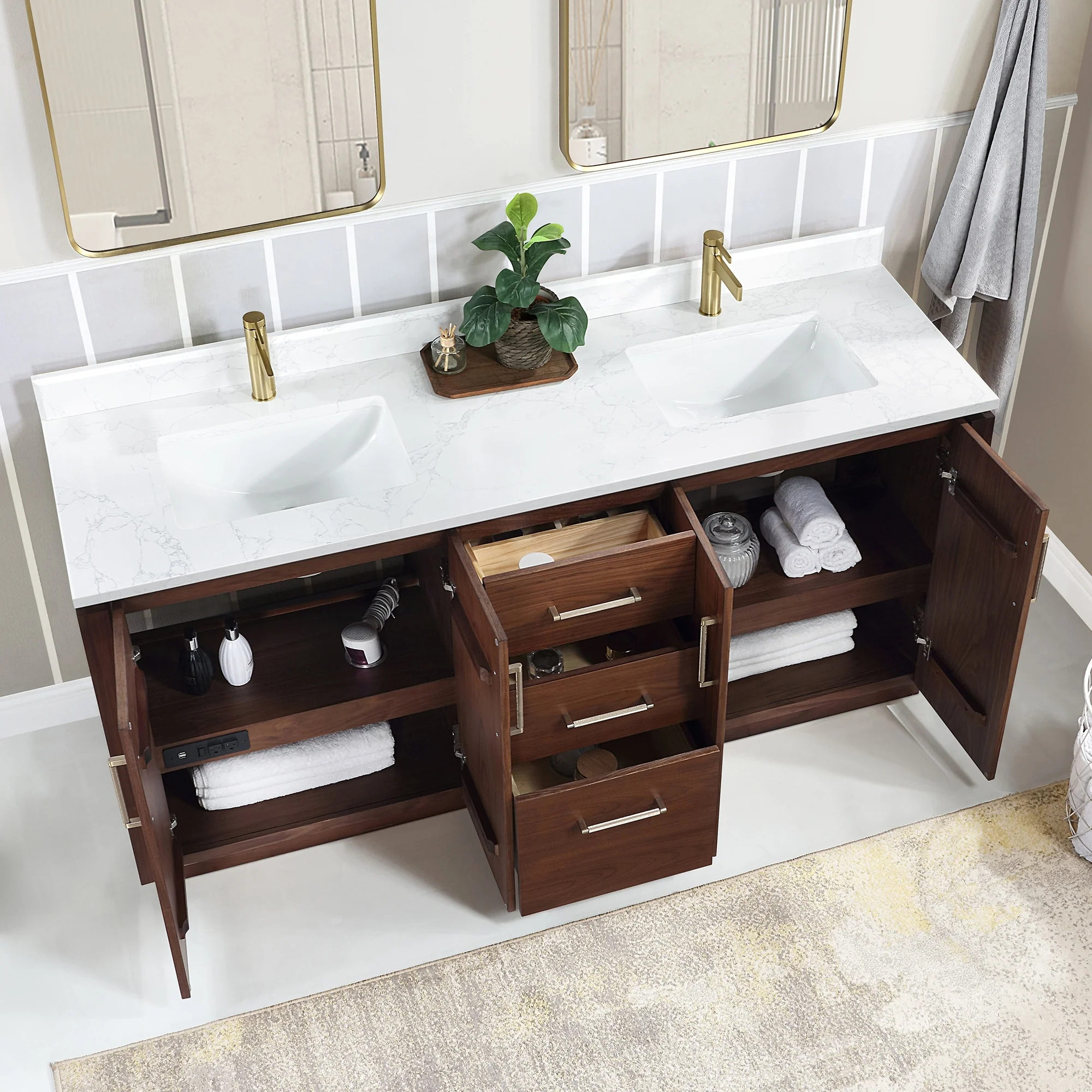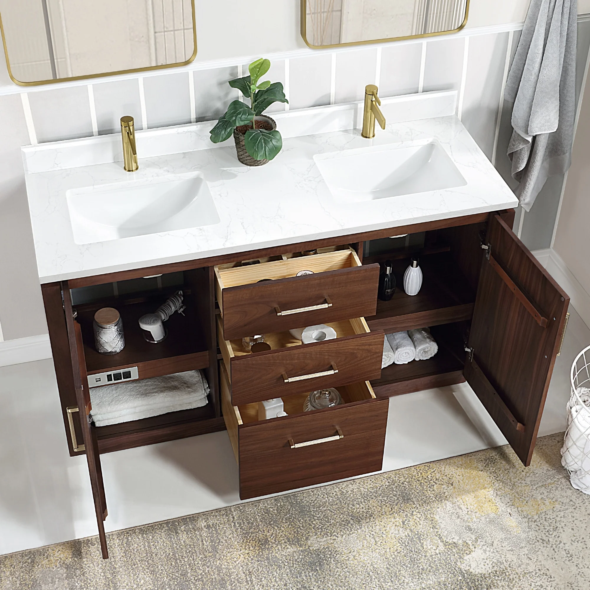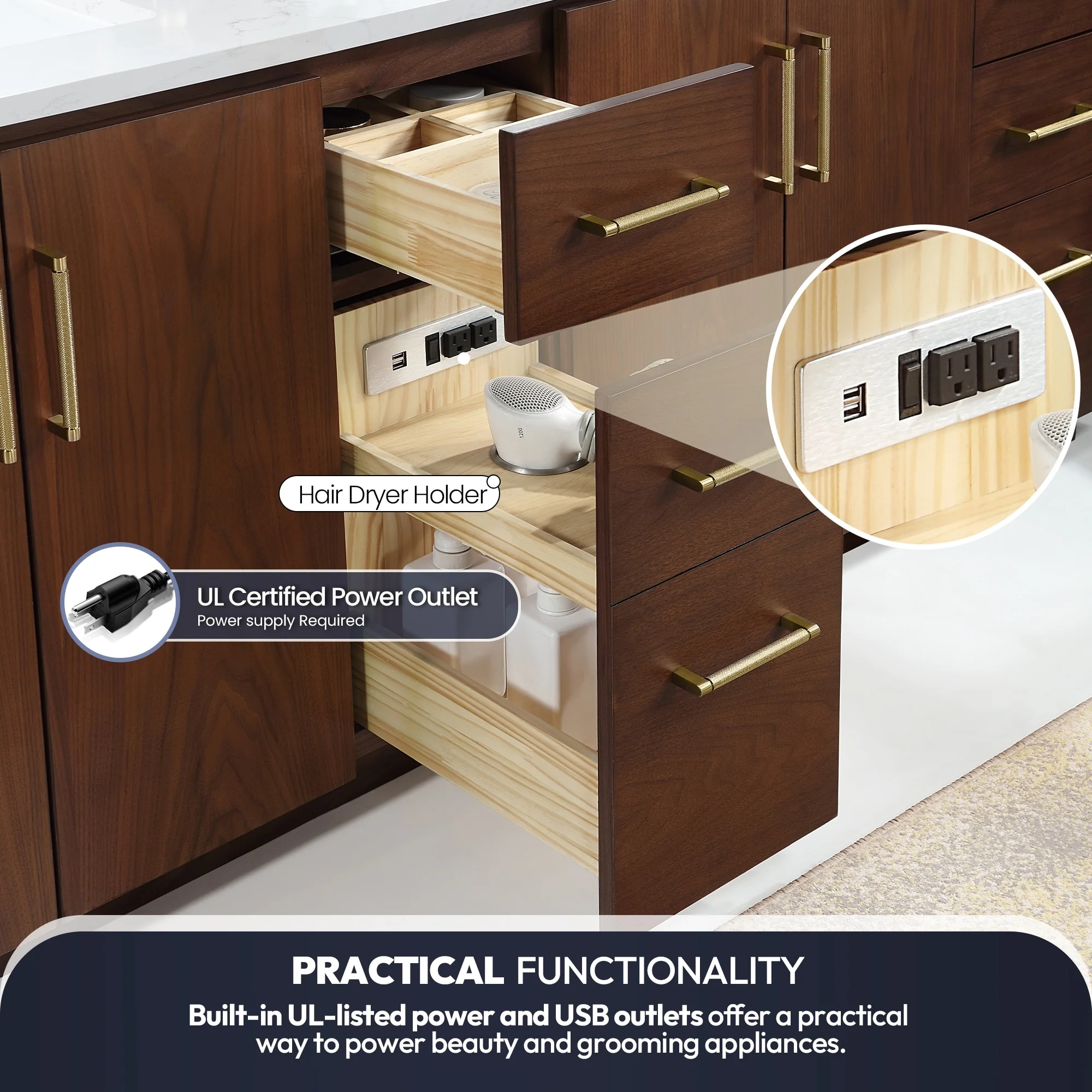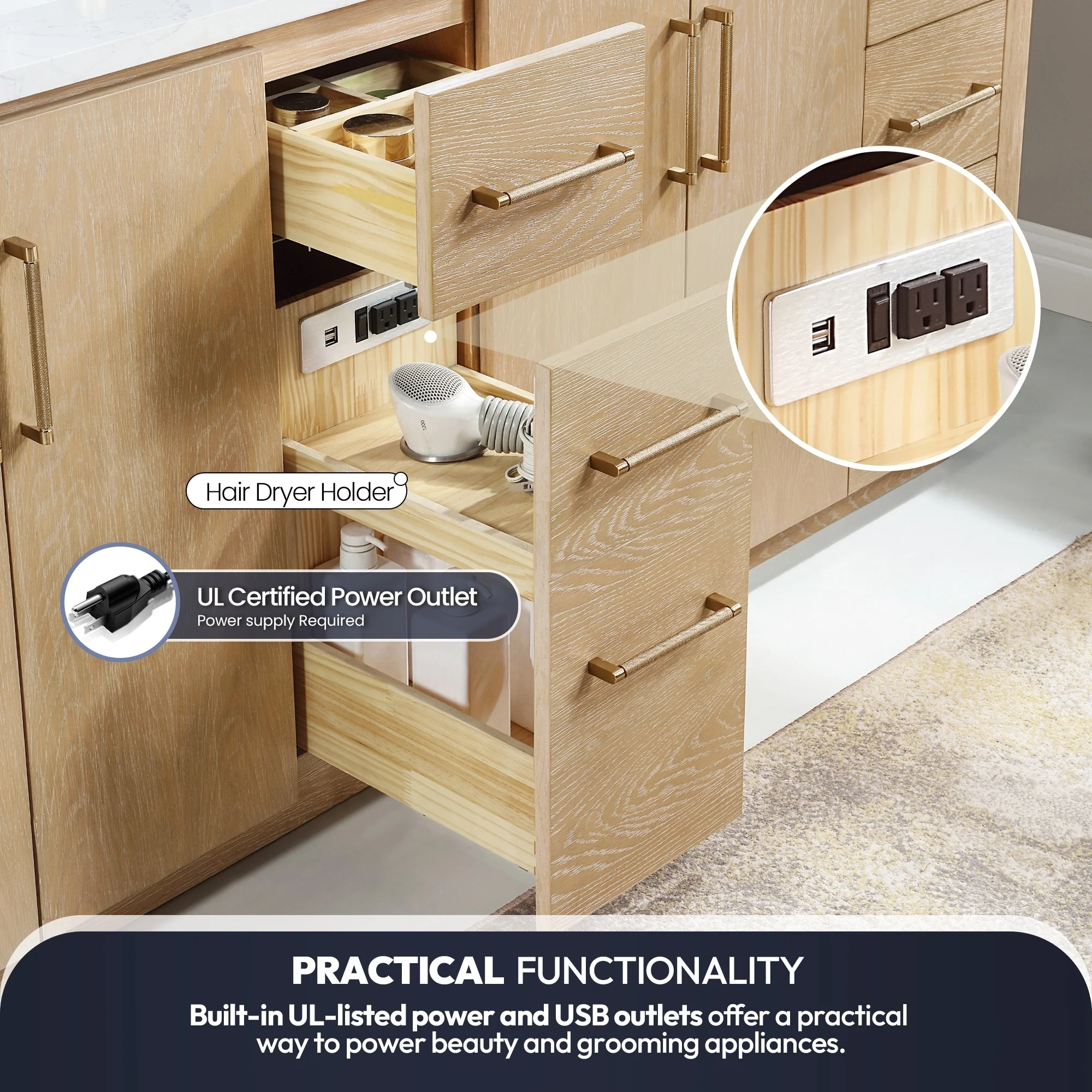 · Practical Functionality: Built-in UL-listed power and USB outlets offer a practical way to power beauty and grooming appliances.Includes convenient hair dryer organizer that keeps your favorite tool within easy reach.