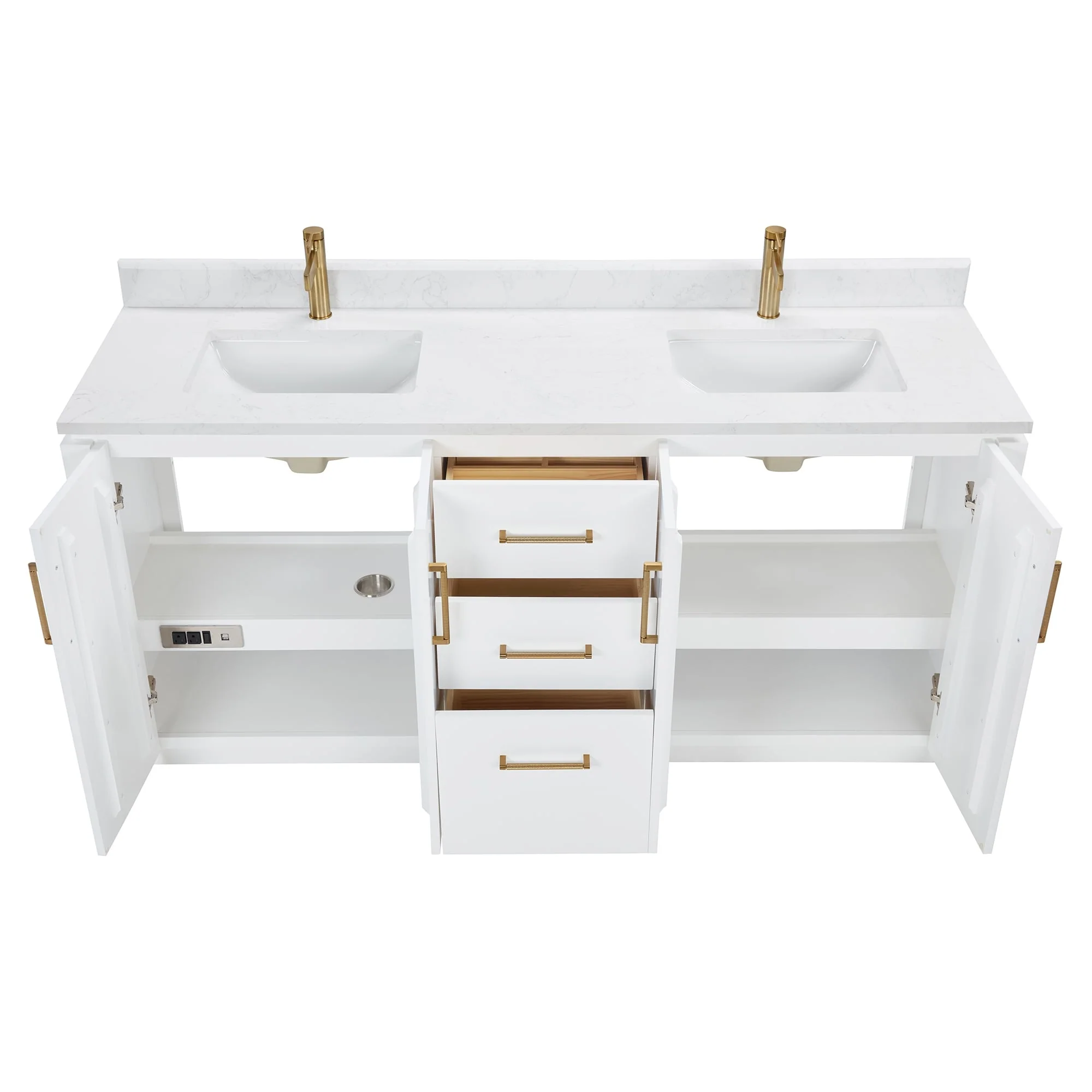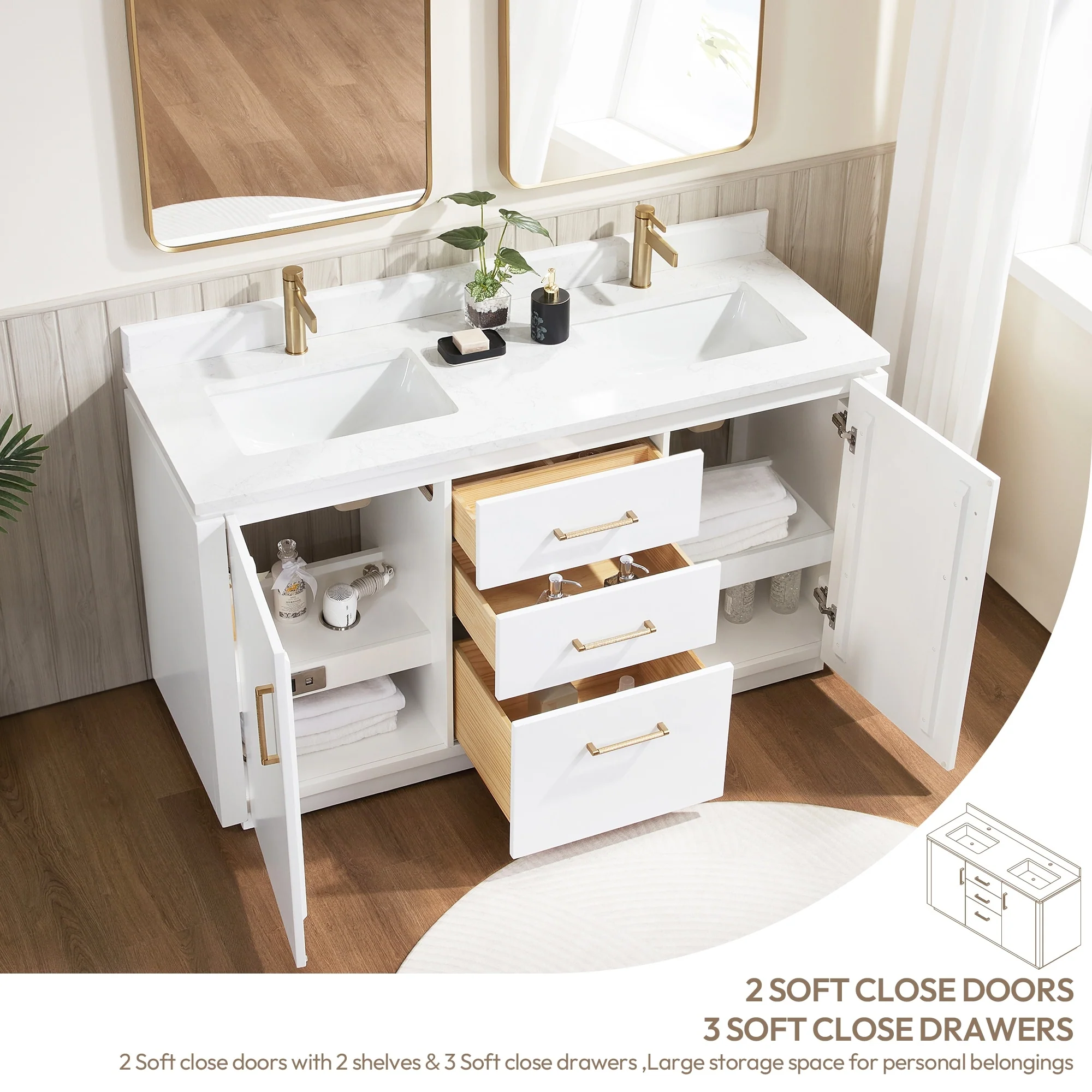 60 inch - Two soft-closing doors and three sturdy, soft-closing dovetail drawers.