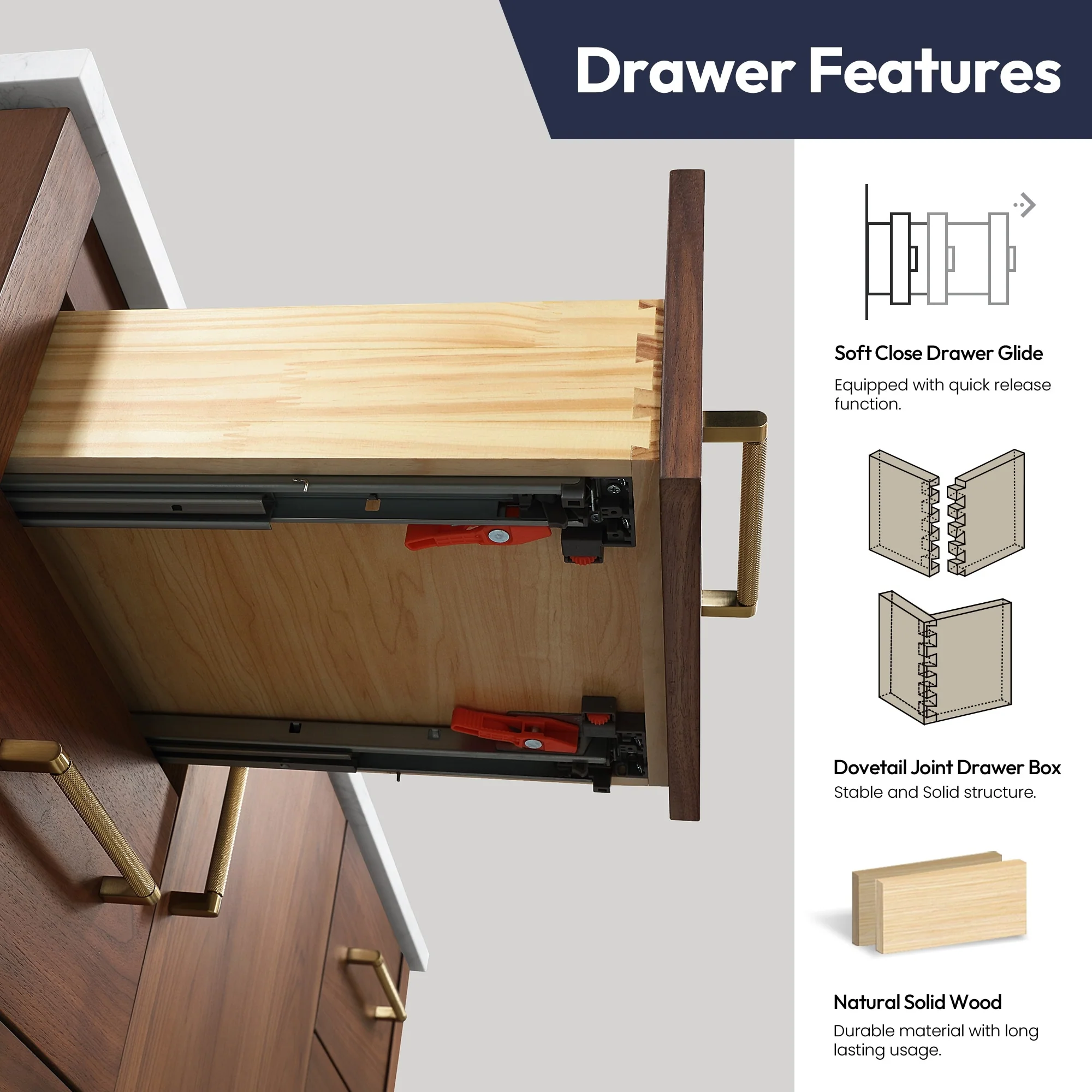 72 inch - Four soft-closing doors and three sturdy, soft-closing dovetail drawers