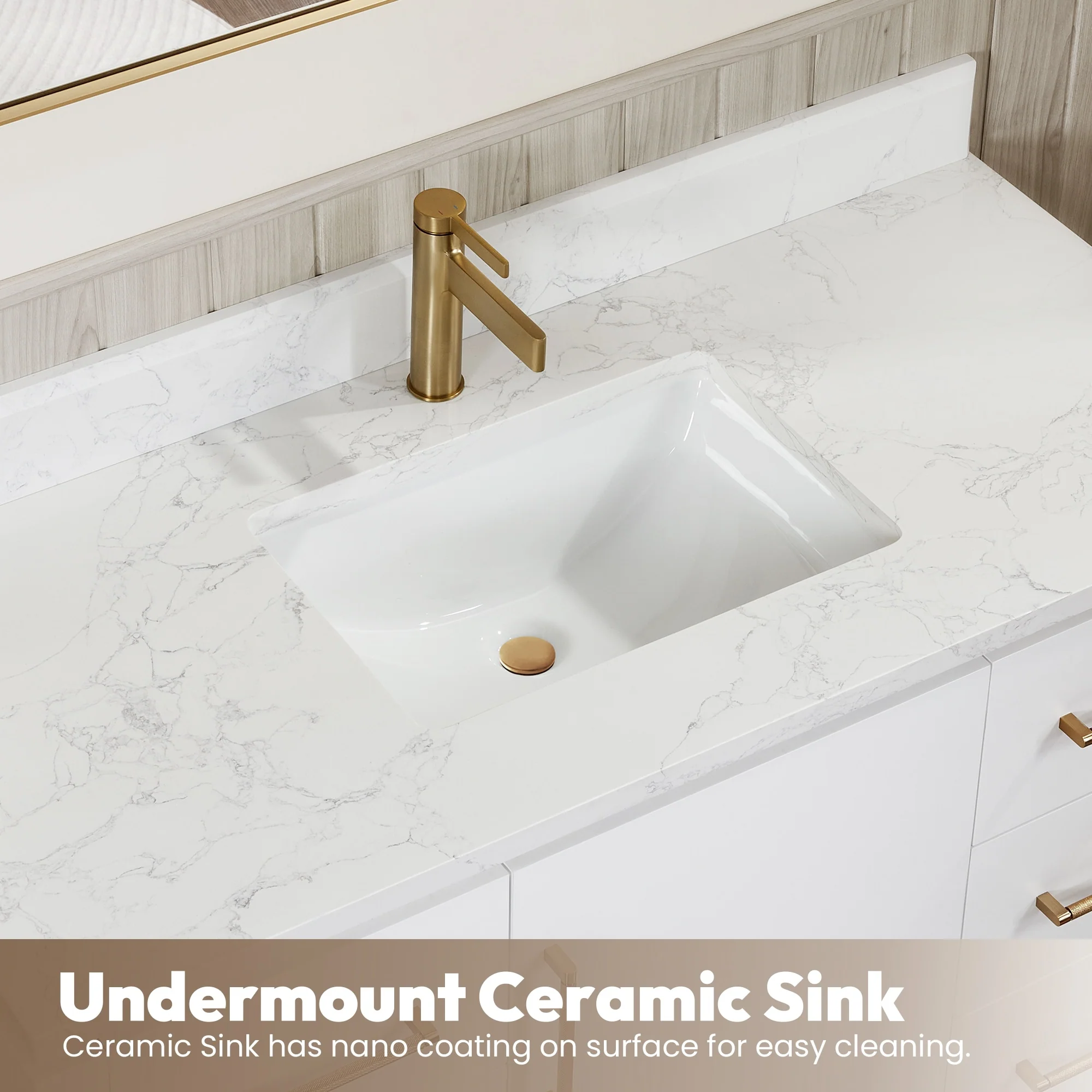 · Nano-Coated Basin: Bright white Nano anti-fouling coating ceramic undermount sink with overflow blends seamlessly with the stone vanity top.